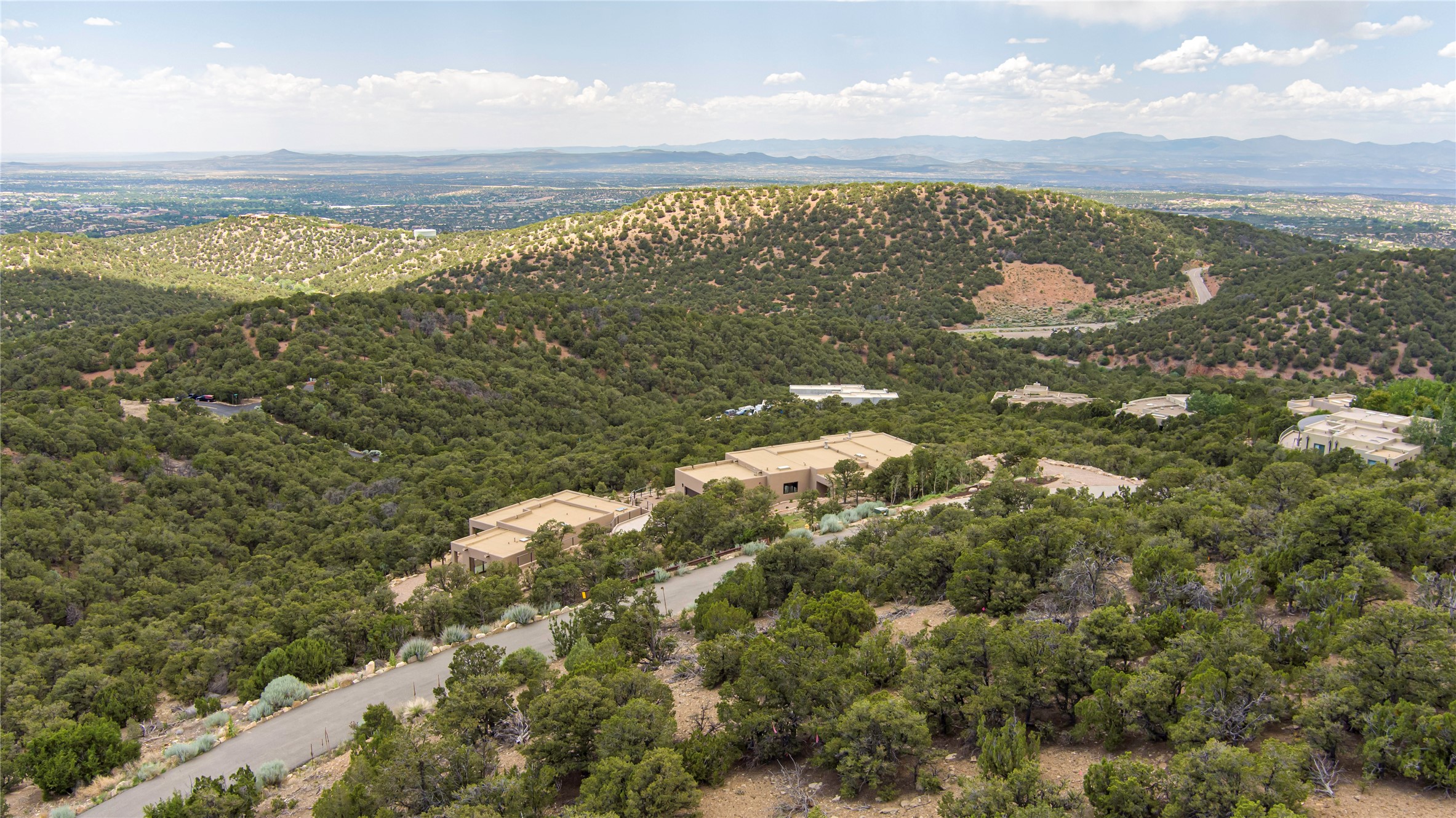 Mountain Living with Breathtaking Views! Discover the perfect blend of luxury and nature in the highly sought-after gated High Summit subdivision. This exceptional property features two contemporary, independent homes perched on a sprawling 2.8 acre lot, offering unparalleled views and tranquility. Prime Location: Just minutes from Santa Fe Plaza, Ski Santa Fe, and scenic hiking and biking trails right outside your door. Main House: 2,461 sq. ft. 2 bedrooms, 2 full baths, an office, and an attached 2-car garage. Guest House: 1,564 sq. ft.2 bedrooms, 2 full baths. Both homes are thoughtfully designed on a single level with no interior steps, offering effortless accessibility. The open-concept layouts boast high-end finishes, including marble and travertine bathrooms, solid wood floors, 8-foot walnut doors, Pella windows, and radiant heating throughout. Each home also features spacious walk-in closets, ductless AC, and expansive covered patios, perfect for outdoor dining or entertaining while soaking in the stunning sunsets. The newly added heated-paved driveway ensures convenience year-round, while the professional landscaping and custom stonework with drip irrigation system enhance the property's natural beauty. Why Choose This Property? Enjoy the serenity of mountain living without sacrificing proximity to Santa Fe's vibrant cultural scene. With world-class restaurants, art galleries, shopping, and entertainment just minutes away, this property offers the ultimate lifestyle for those who cherish both peace and excitement. Don't miss your chance to own this extraordinary retreat!