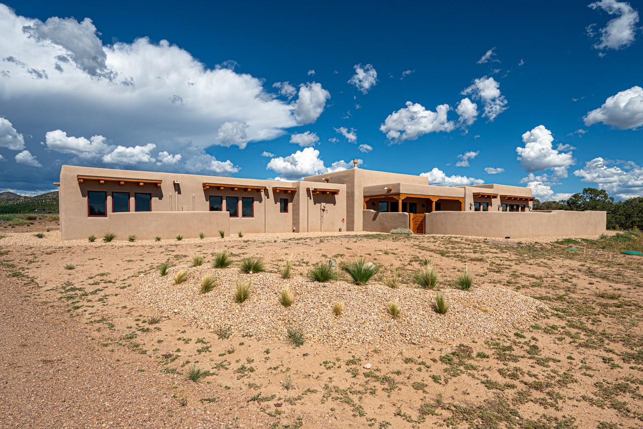 Stunning Adobe contemporary pueblo masterpiece by one of Santa Fe's premier adobe builders, Jeff Fagley of Shaylube Construction. This home has never been lived in, is waiting for the first owner to enjoy. Open plan design with dramatic corbelled beam ceiling and Kiva fireplace in great room, tiled floors and gleaming thick smooth plastered walls throughout complement the classic elements of Santa Fe style. Spacious feel with high ceilings throughout, split 3 bedrooms plus office, large owners suite with private walled portal, 4 bathrooms separate guest suite. Natural gas radiant heat plus 5 mini splits for heating and cooling complementing the radiant in floor heating and passive solar design. A sunny chefs kitchen with butlers pantry and large central island, large formal dining area opening to a wraparound portal for private outside dining and entertainment. A walled courtyard entry with wrap around portal also provides the access to both main home and guest quarters. There is a second privacy walled south courtyard with bricked portals accessed from living room and master suite also excellent for sunset mountain viewing. Roof drainage to 2 cisterns already installed underground catch the rainfall for landscaping. A large 3 car garage for lots of toys or hobbies, plenty of guest parking and lovely views with 7+acres to enjoy. Horses allowed. Enjoy access to local Eldorado area shopping, schools, senior center and library plus only minutes into Santa Fe.