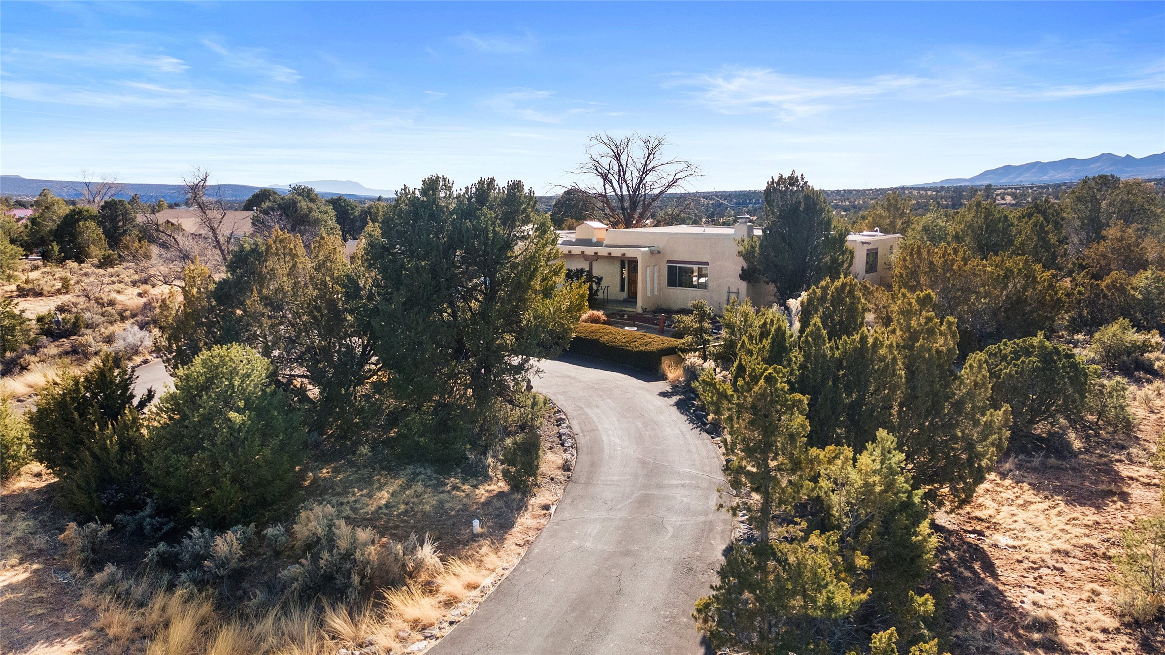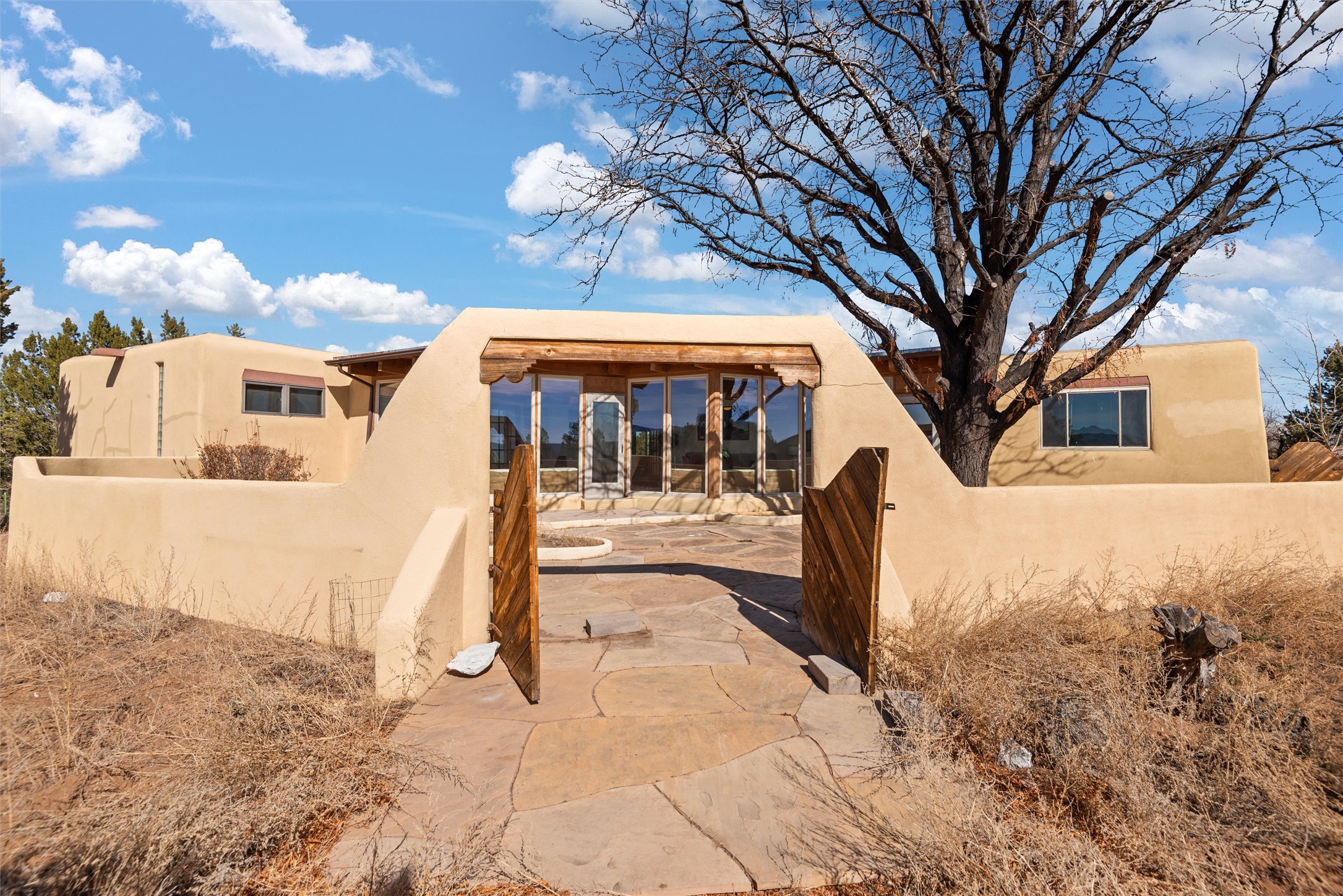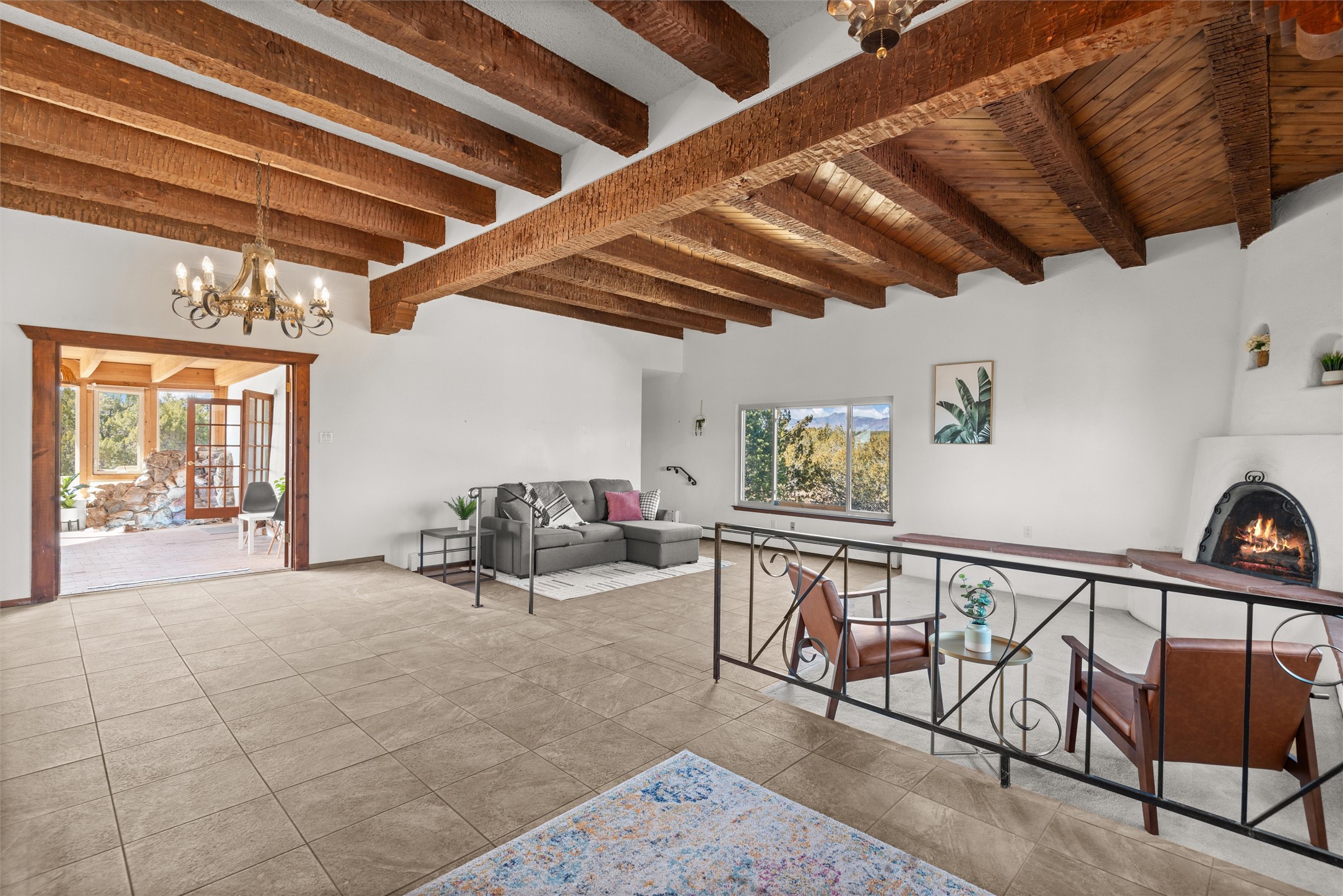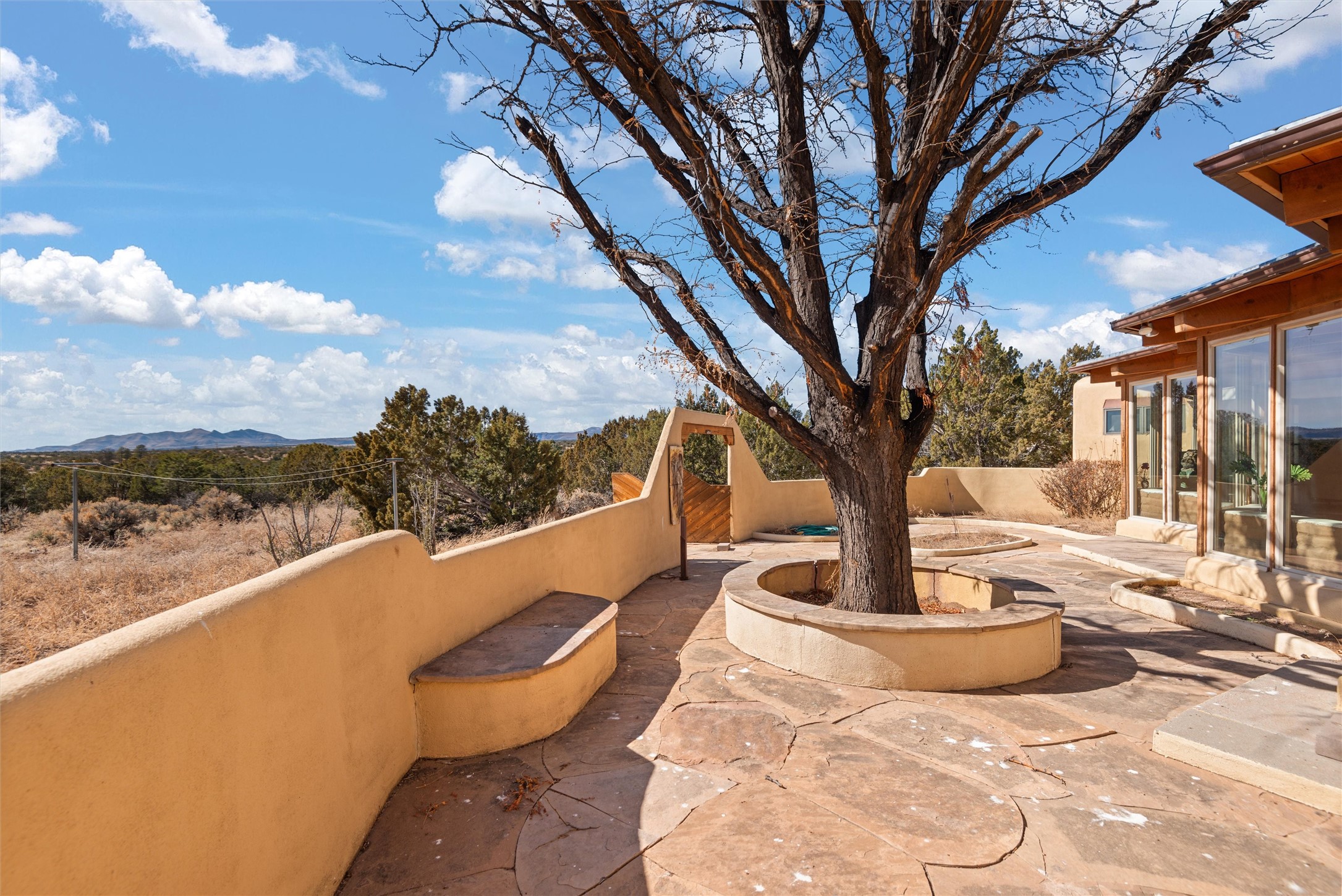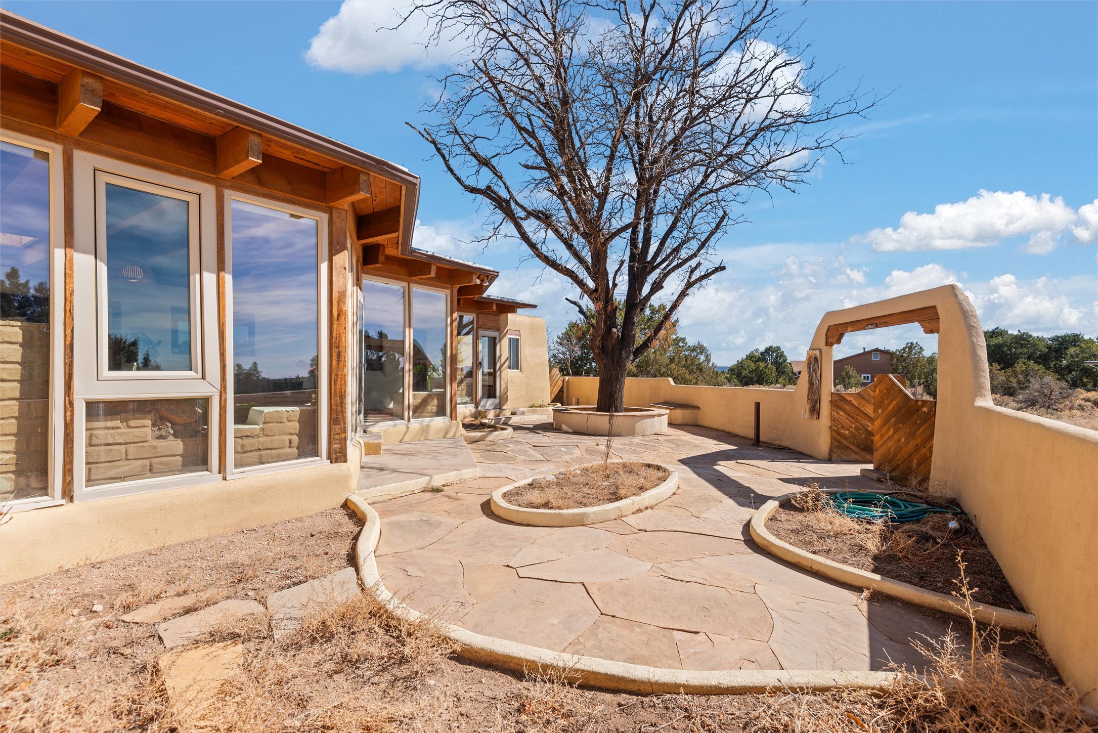 Welcome to 102 La Senda where dreams become reality! As you approach the entrance to your very own private residence you will find a spacious driveway and beautifully landscaped entry area. Take a deep breath you're about to enter into this rare pueblo style home with towering 11' ceilings adorned with natural wood vigas including a kiva hearth built right into this living space area. Above the newer tiled floors the dining area boasts traditional lighting from a candelabrum light fixture. Continuing into the home through the double doors that lead you into a warm passive solar sunroom with seating areas featuring floor to ceiling windows facing the west where you can enjoy the dancing colors of the famed NM sunsets in the evenings. Plenty of potential here with space for indoor plants, hot tub and a small pond in the corner. As you gaze into the sunset in the sunroom you can retreat through double doors again into the master bedroom where you will find a en suite bathroom tiled all around including a fully functioning jetted tub. In this private north side area of the home the privacy is astonishing with the south side bedrooms on the opposite side of the home. Let's work our way around the home towards the other sleeping quarters. This area of the home on the south side has two additional bedrooms and a full bathroom which is beautifully tiled from floor to ceiling. As you head back into the living room you will find a 3/4 guest bathroom to accommodate your visitors. This bathroom also features a full walk-in shower with tiled sink area from floor to ceiling. Let's walk into your kitchen where you can't help but notice these natural hardwood floors throughout. This leads into a separate dining area/living space to make your own. Tucked away in this living area is a washer/dryer closet with storage above in cabinets and shelves. Facing towards the east side of the dining room you will find garage access through a separate locking door. As you walk into the garage watch your step! That is where you will find space here for two cars and plenty of built in cabinets for storage. Working your way around the exterior of the house you will find various landscaping with space for planters to grow your very own vegetables or fruits. The rear side of the home has a flagstone patio walled and gated. Take a look around the larger sized lot encompassing over 2.52 acres of space leading as far west as NM4 and North to Piedra Loop. The very size of this private corner lot is astonishing. So so much potential all around the property inside and out! If a large lot in Los Alamos county is your thing don't hesitate to come by and see how vast 102 La Senda really is! Don't forget this space allows for your Equine as well!