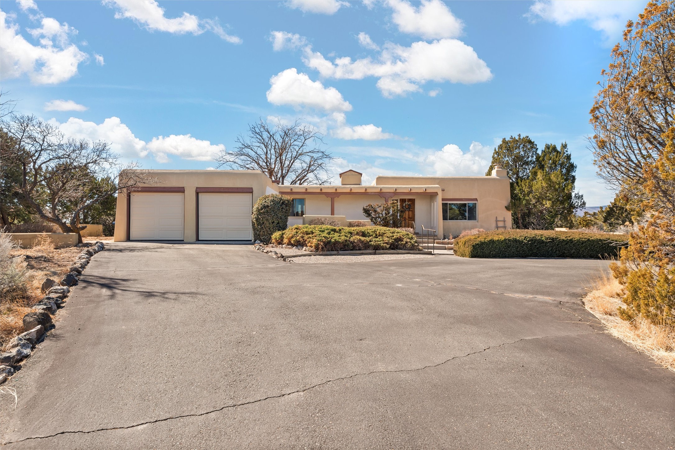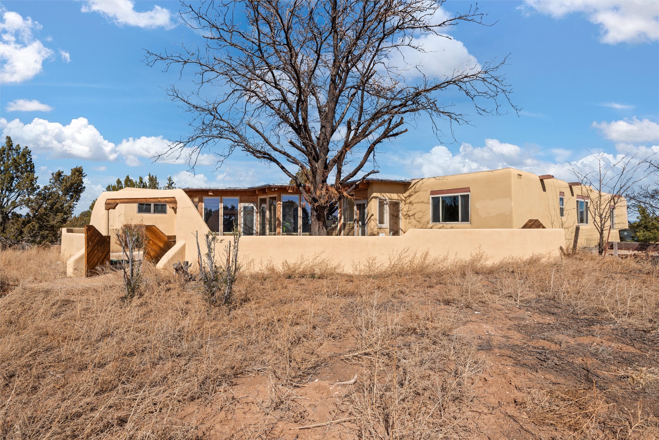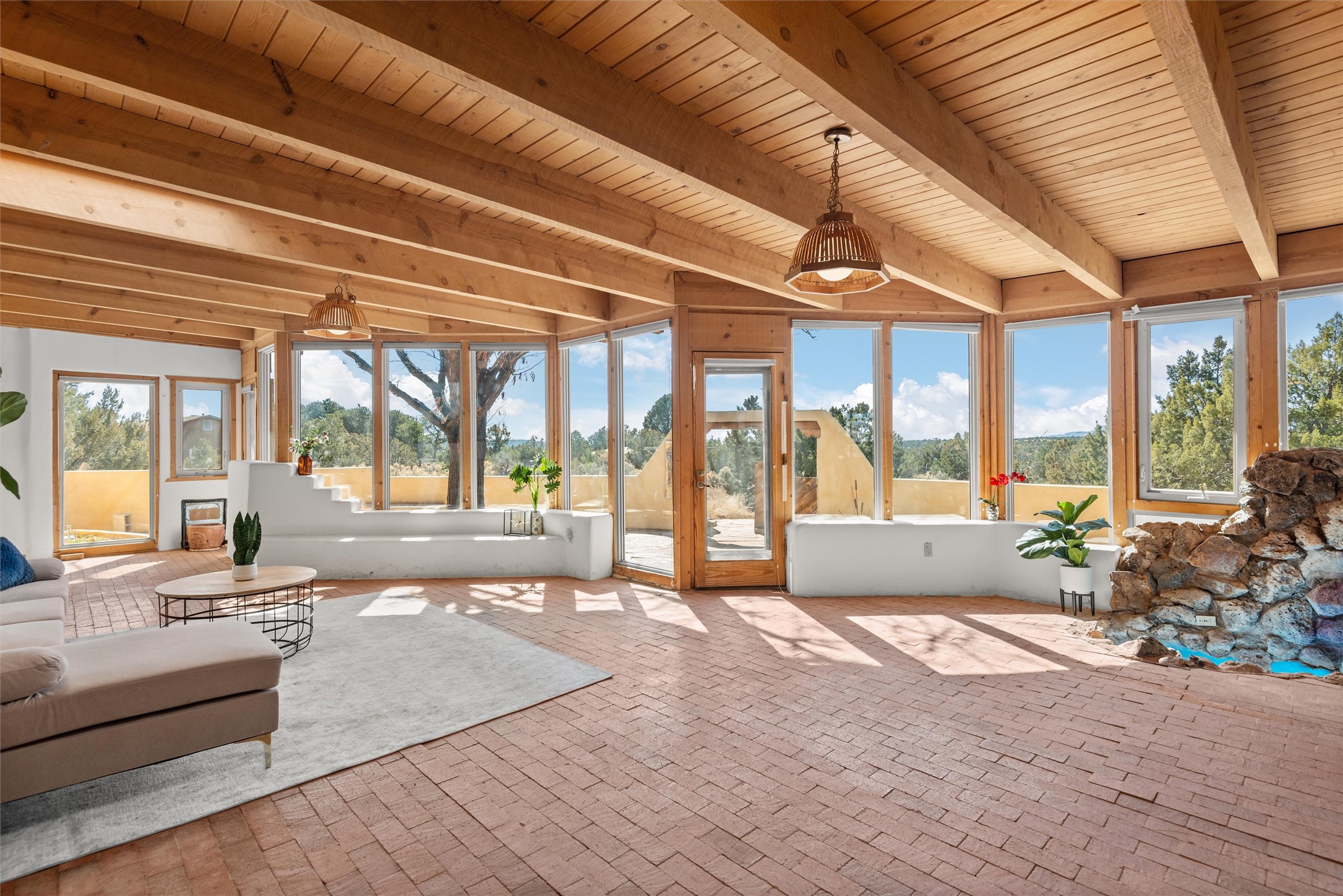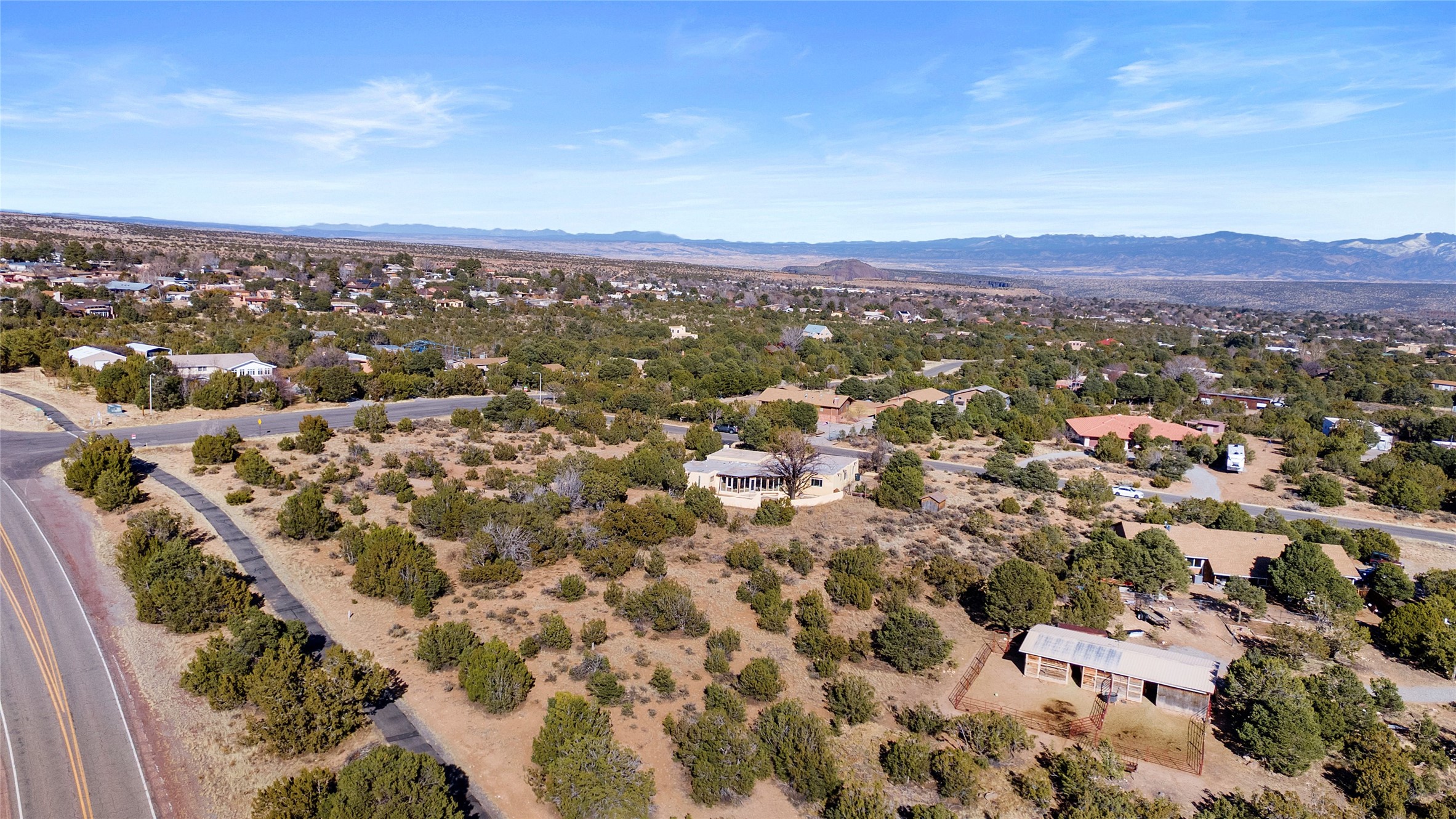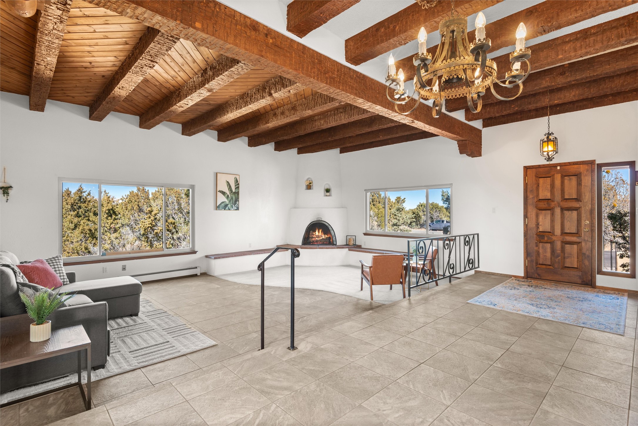Welcome to 102 La Senda where dreams become reality! As you approach the entrance to your very own private residence you will find a spacious driveway and beautifully landscaped entry area. Take a deep breath you're about to enter into this rare pueblo style home with towering 11' ceilings adorned with natural wood vigas including a kiva hearth built right into this living space area. Above the newer tiled floors the dining area boasts traditional lighting from a candelabrum light fixture. Continuing into the home through the double doors that lead you into a warm passive solar sunroom with seating areas featuring floor to ceiling windows facing the west where you can enjoy the dancing colors of the famed NM sunsets in the evenings. Plenty of potential here with space for indoor plants, hot tub and a small pond in the corner. As you gaze into the sunset in the sunroom you can retreat through double doors again into the master bedroom where you will find a en suite bathroom tiled all around including a fully functioning jetted tub. In this private north side area of the home the privacy is astonishing with the south side bedrooms on the opposite side of the home. Let's work our way around the home towards the other sleeping quarters. This area of the home on the south side has two additional bedrooms and a full bathroom which is beautifully tiled from floor to ceiling. As you head back into the living room you will find a 3/4 guest bathroom to accommodate your visitors. This bathroom also features a full walk-in shower with tiled sink area from floor to ceiling. Let's walk into your kitchen where you can't help but notice these natural hardwood floors throughout. This leads into a separate dining area/living space to make your own. Tucked away in this living area is a washer/dryer closet with storage above in cabinets and shelves. Facing towards the east side of the dining room you will find garage access through a separate locking door. As you walk into the garage watch your step! That is where you will find space here for two cars and plenty of built in cabinets for storage. Working your way around the exterior of the house you will find various landscaping with space for planters to grow your very own vegetables or fruits. The rear side of the home has a flagstone patio walled and gated. Take a look around the larger sized lot encompassing over 2.52 acres of space leading as far west as NM4 and North to Piedra Loop. The very size of this private corner lot is astonishing. So so much potential all around the property inside and out! If a large lot in Los Alamos county is your thing don't hesitate to come by and see how vast 102 La Senda really is! Don't forget this space allows for your Equine as well!