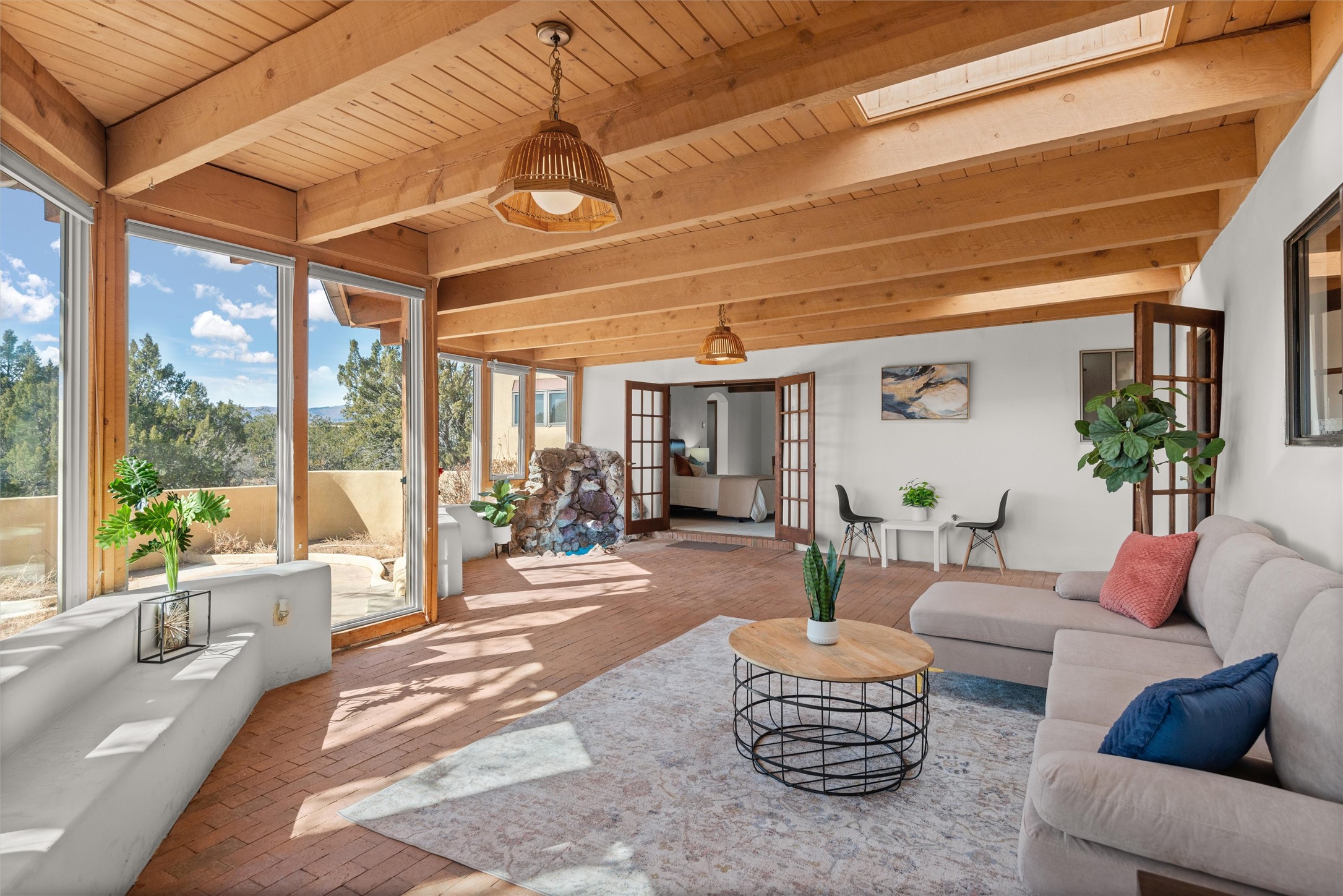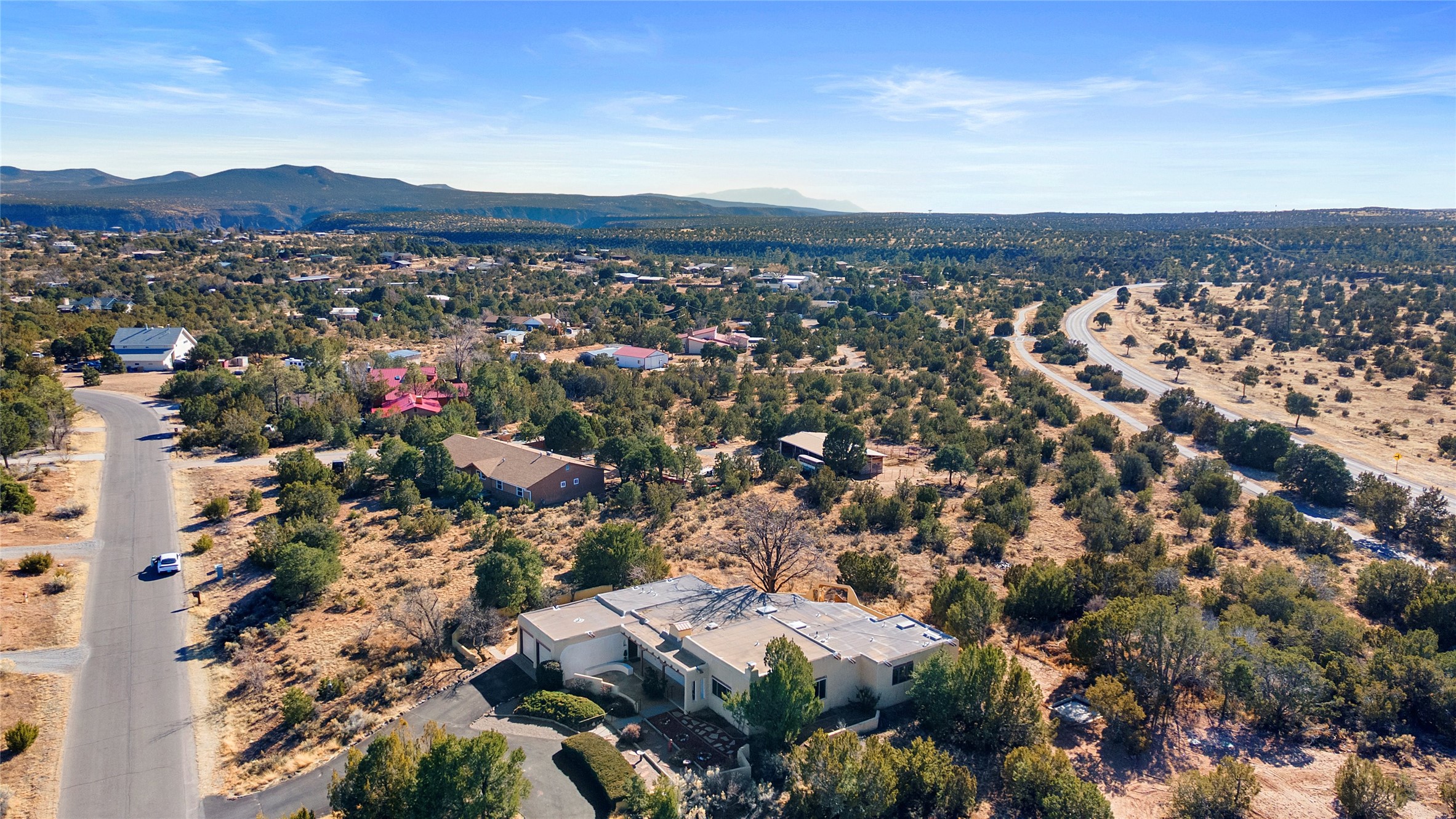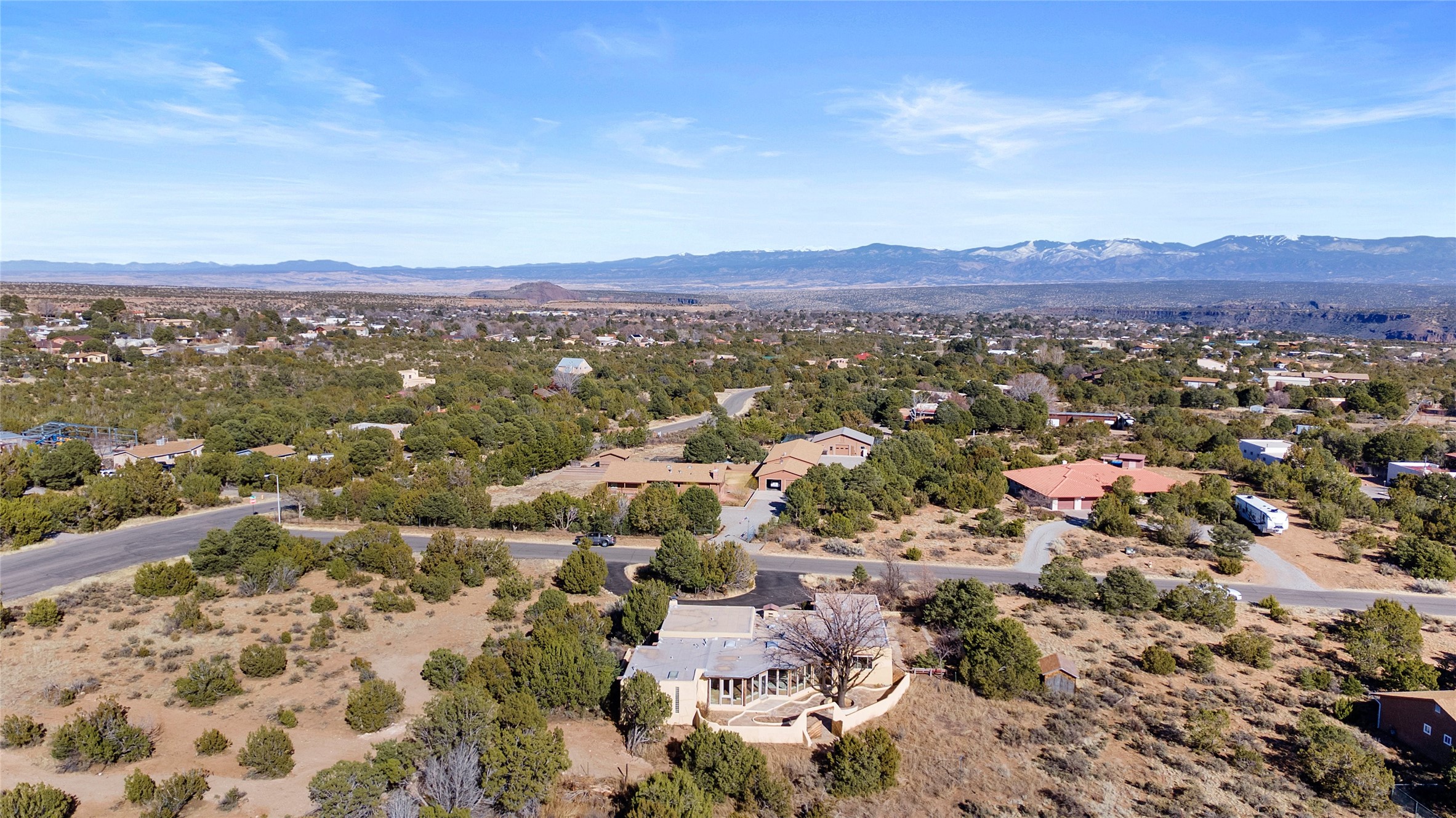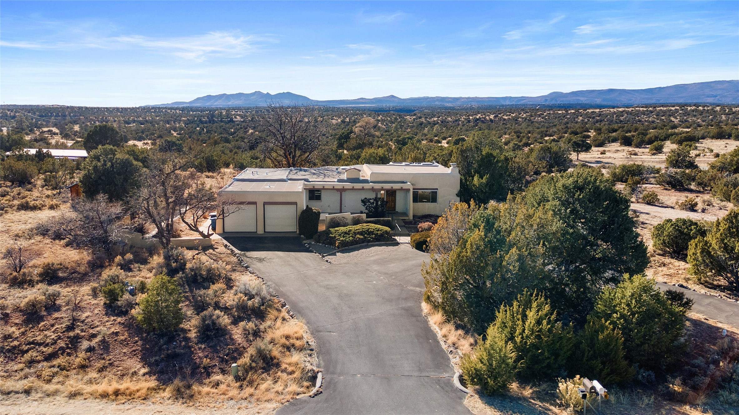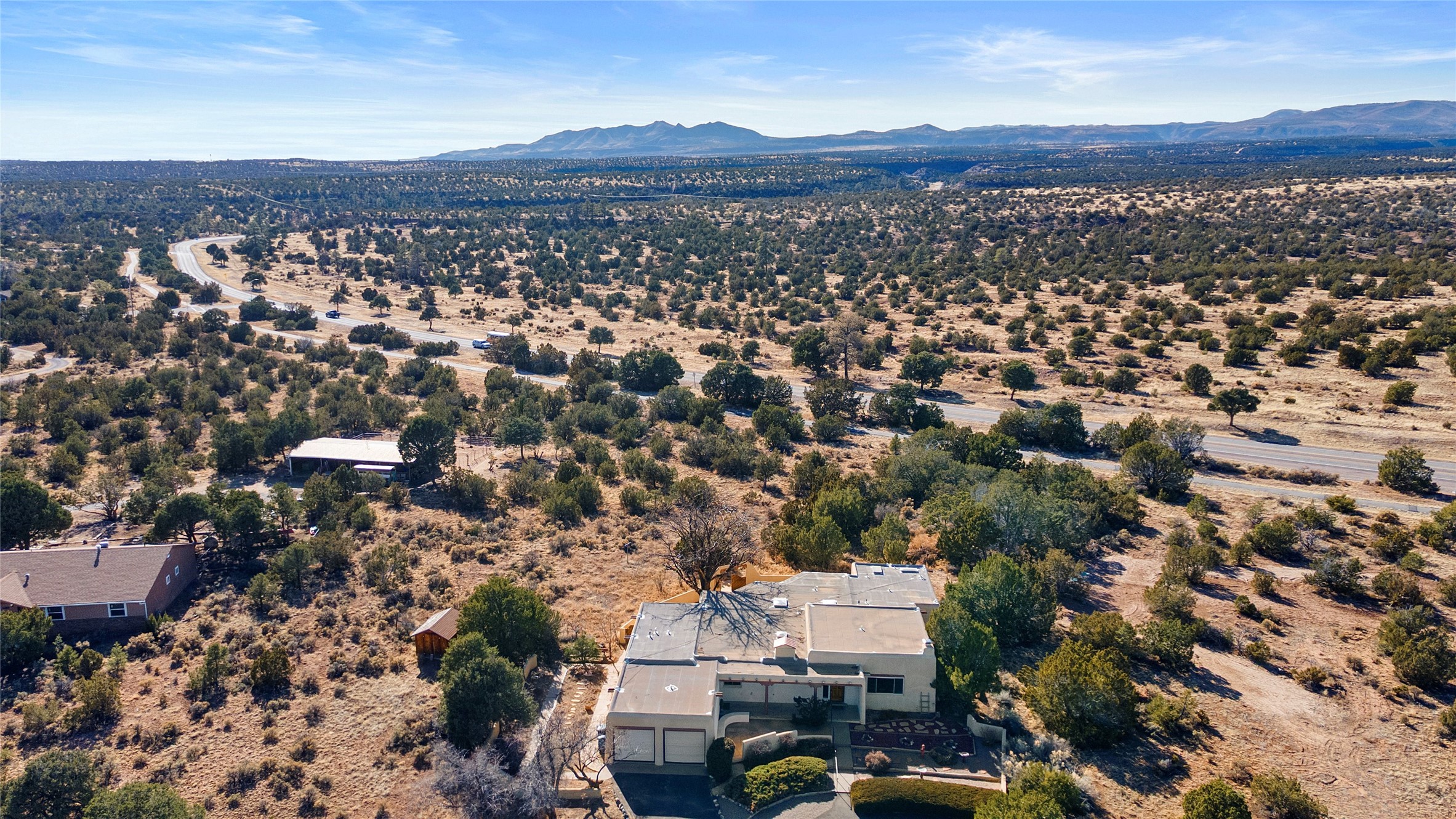 Welcome to 102 La Senda where dreams become reality! As you approach the entrance to your very own private residence you will find a spacious driveway and beautifully landscaped entry area. Take a deep breath you're about to enter into this rare pueblo style home with towering 11' ceilings adorned with natural wood vigas including a kiva hearth built right into this living space area. Above the newer tiled floors the dining area boasts traditional lighting from a candelabrum light fixture. Continuing into the home through the double doors that lead you into a warm passive solar sunroom with seating areas featuring floor to ceiling windows facing the west where you can enjoy the dancing colors of the famed NM sunsets in the evenings. Plenty of potential here with space for indoor plants, hot tub and a small pond in the corner. As you gaze into the sunset in the sunroom you can retreat through double doors again into the master bedroom where you will find a en suite bathroom tiled all around including a fully functioning jetted tub. In this private north side area of the home the privacy is astonishing with the south side bedrooms on the opposite side of the home. Let's work our way around the home towards the other sleeping quarters. This area of the home on the south side has two additional bedrooms and a full bathroom which is beautifully tiled from floor to ceiling. As you head back into the living room you will find a 3/4 guest bathroom to accommodate your visitors. This bathroom also features a full walk-in shower with tiled sink area from floor to ceiling. Let's walk into your kitchen where you can't help but notice these natural hardwood floors throughout. This leads into a separate dining area/living space to make your own. Tucked away in this living area is a washer/dryer closet with storage above in cabinets and shelves. Facing towards the east side of the dining room you will find garage access through a separate locking door. As you walk into the garage watch your step! That is where you will find space here for two cars and plenty of built in cabinets for storage. Working your way around the exterior of the house you will find various landscaping with space for planters to grow your very own vegetables or fruits. The rear side of the home has a flagstone patio walled and gated. Take a look around the larger sized lot encompassing over 2.52 acres of space leading as far west as NM4 and North to Piedra Loop. The very size of this private corner lot is astonishing. So so much potential all around the property inside and out! If a large lot in Los Alamos county is your thing don't hesitate to come by and see how vast 102 La Senda really is! Don't forget this space allows for your Equine as well!