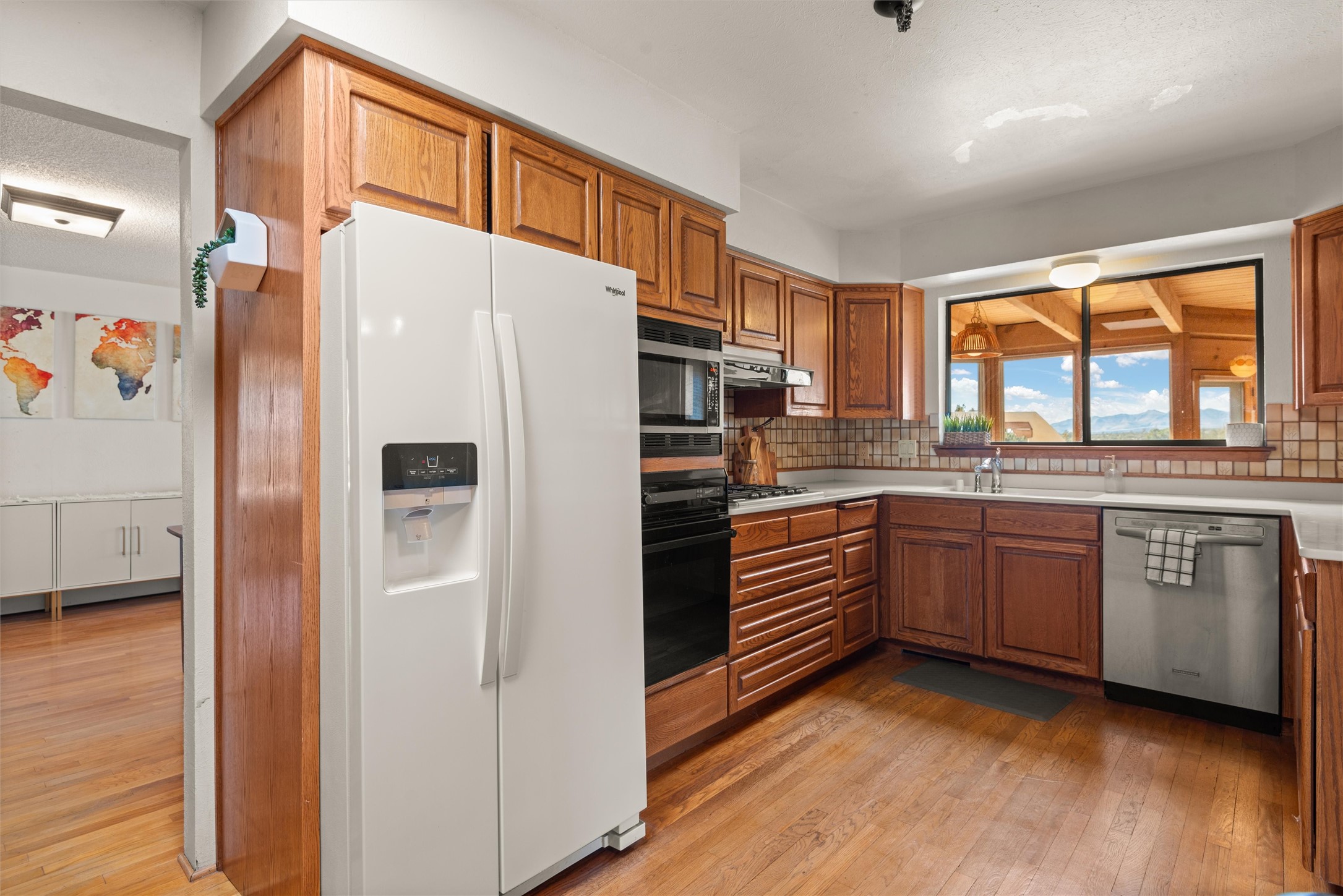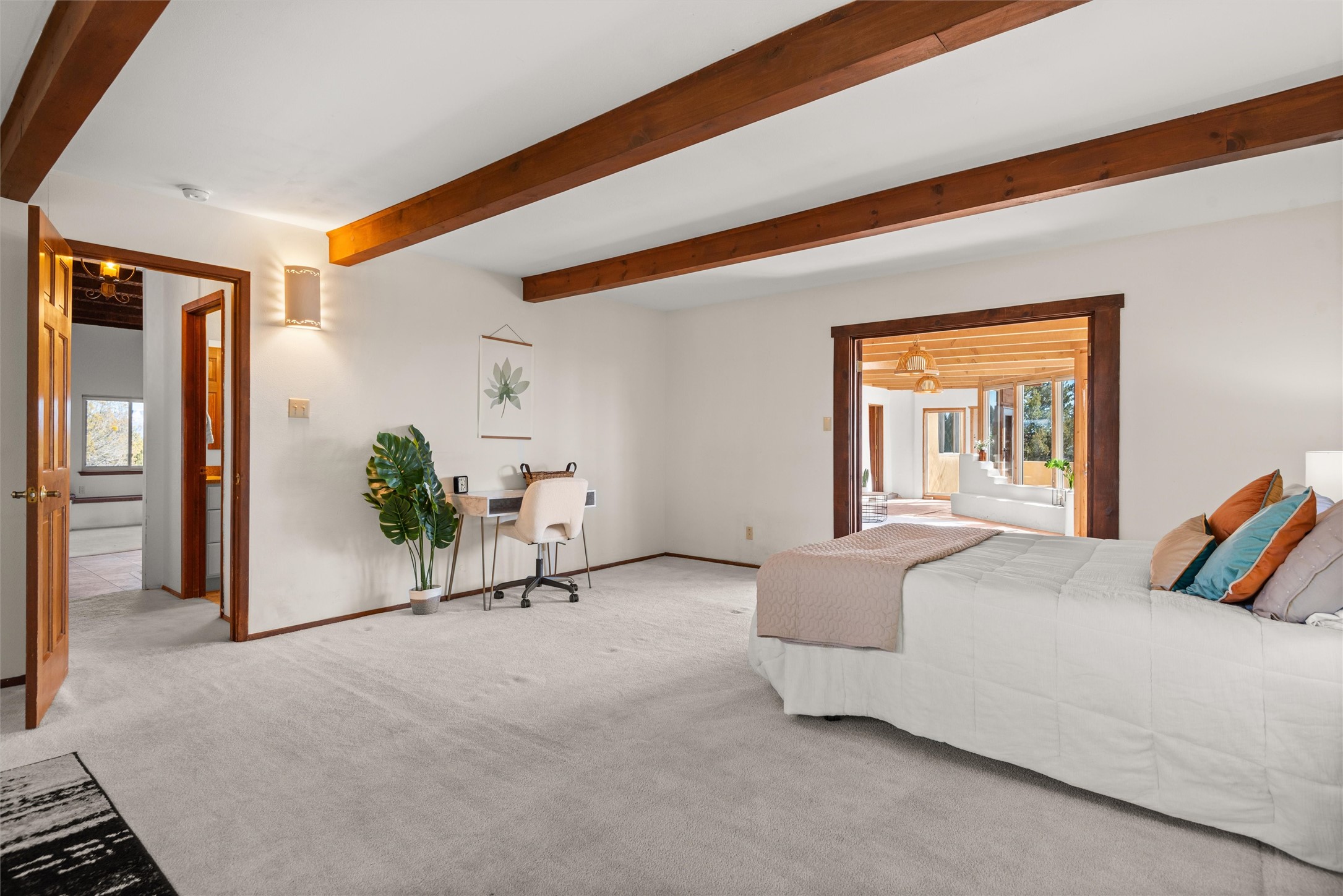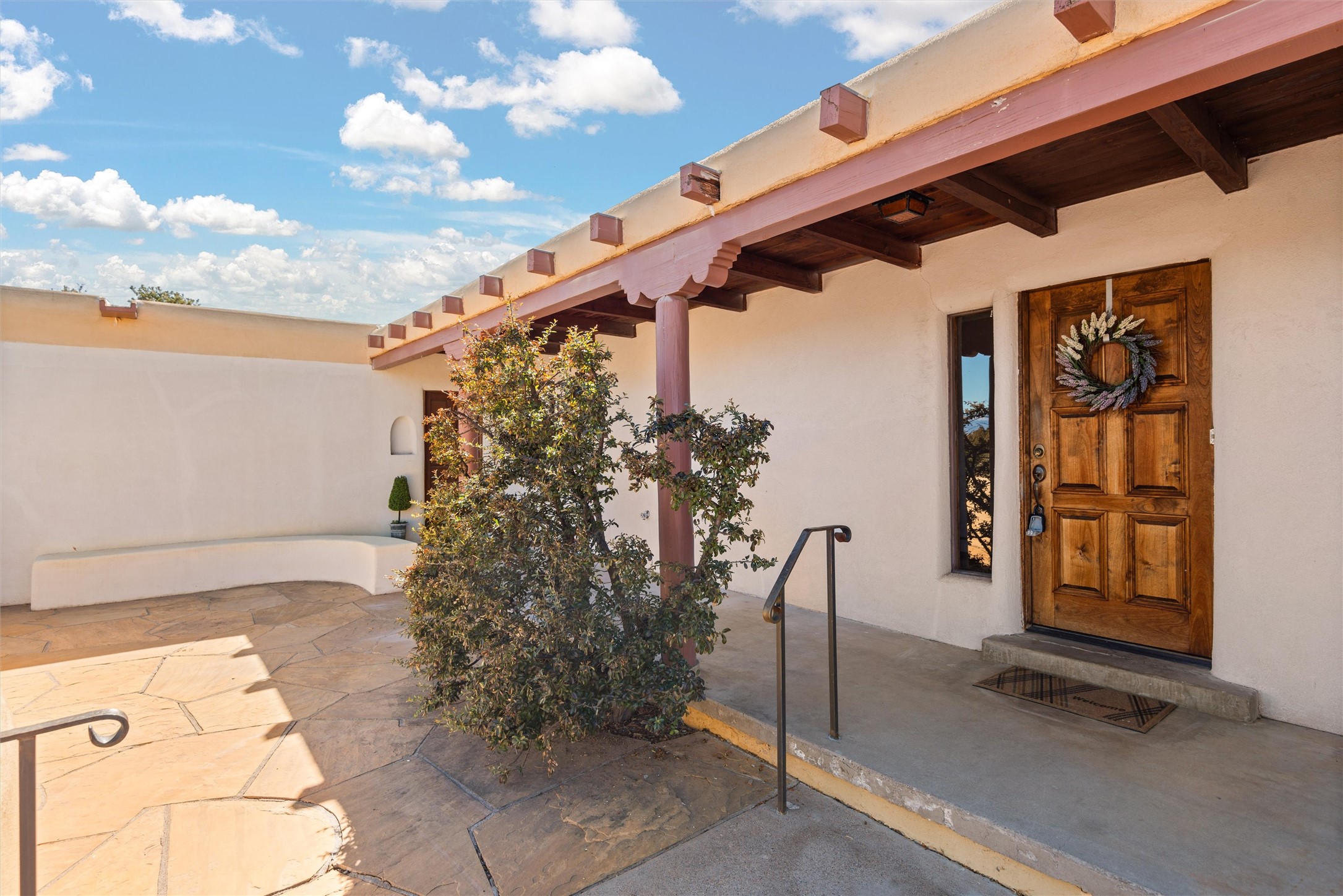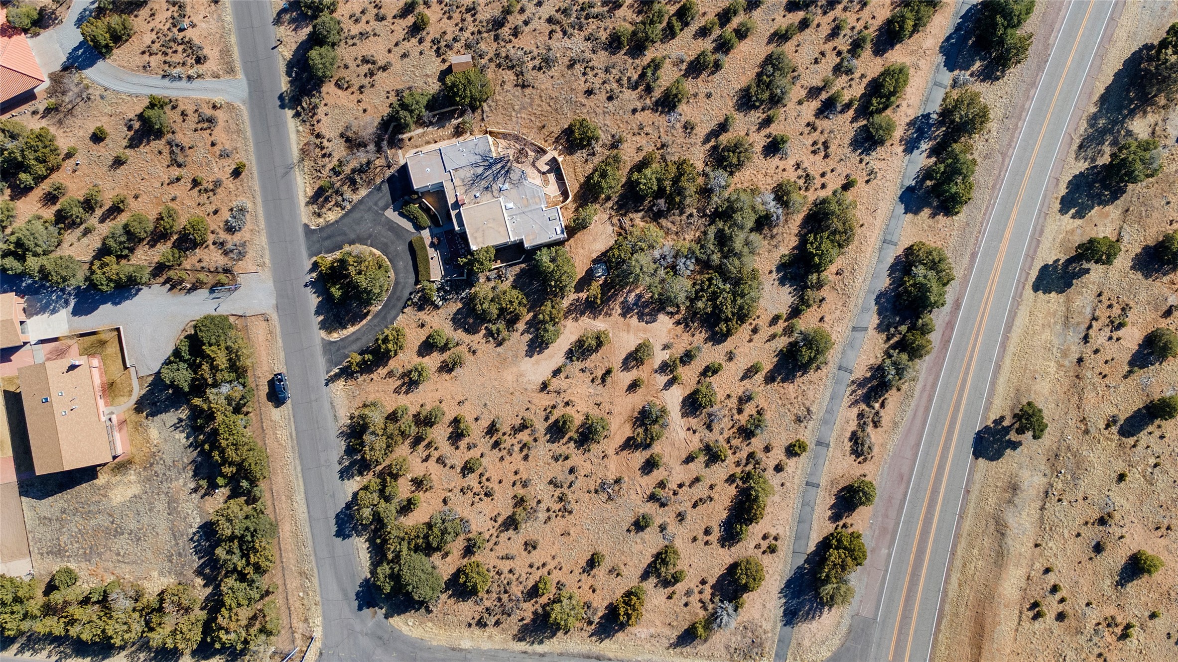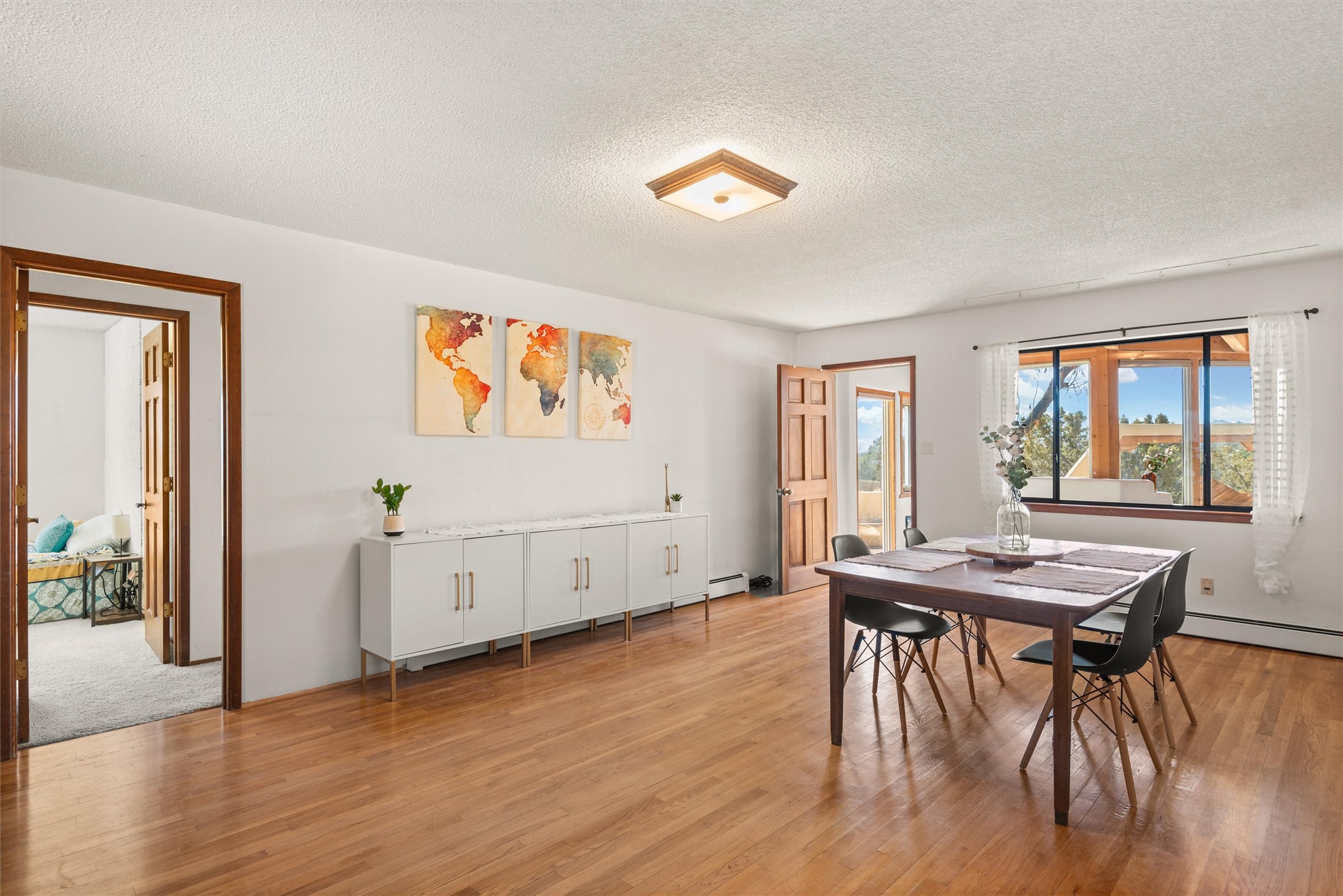 Welcome to 102 La Senda where dreams become reality! As you approach the entrance to your very own private residence you will find a spacious driveway and beautifully landscaped entry area. Take a deep breath you're about to enter into this rare pueblo style home with towering 11' ceilings adorned with natural wood vigas including a kiva hearth built right into this living space area. Above the newer tiled floors the dining area boasts traditional lighting from a candelabrum light fixture. Continuing into the home through the double doors that lead you into a warm passive solar sunroom with seating areas featuring floor to ceiling windows facing the west where you can enjoy the dancing colors of the famed NM sunsets in the evenings. Plenty of potential here with space for indoor plants, hot tub and a small pond in the corner. As you gaze into the sunset in the sunroom you can retreat through double doors again into the master bedroom where you will find a en suite bathroom tiled all around including a fully functioning jetted tub. In this private north side area of the home the privacy is astonishing with the south side bedrooms on the opposite side of the home. Let's work our way around the home towards the other sleeping quarters. This area of the home on the south side has two additional bedrooms and a full bathroom which is beautifully tiled from floor to ceiling. As you head back into the living room you will find a 3/4 guest bathroom to accommodate your visitors. This bathroom also features a full walk-in shower with tiled sink area from floor to ceiling. Let's walk into your kitchen where you can't help but notice these natural hardwood floors throughout. This leads into a separate dining area/living space to make your own. Tucked away in this living area is a washer/dryer closet with storage above in cabinets and shelves. Facing towards the east side of the dining room you will find garage access through a separate locking door. As you walk into the garage watch your step! That is where you will find space here for two cars and plenty of built in cabinets for storage. Working your way around the exterior of the house you will find various landscaping with space for planters to grow your very own vegetables or fruits. The rear side of the home has a flagstone patio walled and gated. Take a look around the larger sized lot encompassing over 2.52 acres of space leading as far west as NM4 and North to Piedra Loop. The very size of this private corner lot is astonishing. So so much potential all around the property inside and out! If a large lot in Los Alamos county is your thing don't hesitate to come by and see how vast 102 La Senda really is! Don't forget this space allows for your Equine as well!