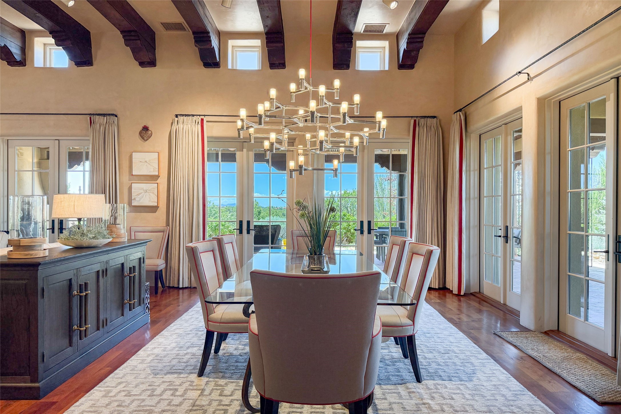 Welcome to 6 Silver Mesa Court, an exceptional property that blends high-end design, thoughtful amenities and layout, and stunning indoor-outdoor living. This elegant home showcases Jemez mountain views, golf course and pond views, and sound system throughout. Highly desirable location with close proximity to the Spa, Racquet & Fitness Center; Driving Range and the Club Hacienda. Step into the inviting front courtyard and enter into the foyer that greets you with a wall-washer skylight. Flow into the great room with 12-foot ceilings, clerestory windows, a stone fireplace, impressive beams, and 6 sets of French doors opening to the wrap around portal. Wind shades around the entire portal make outdoor dining lovely in any weather. Enjoy outdoor entertaining and relax by the fireplace while experiencing incredible views of the Jemez mountain sunsets.This expansive great room combines living and dining spaces and opens to the chef's kitchen complete with a large center island, built-in cutting board, and top-tier appliances including a Viking fridge and gas range. A small office is conveniently located adjacent to the kitchen, along with a laundry/pantry area housing a large wine storage. Tucked behind the kitchen lays a large media/flex room, bedroom with two sets of built-in bunk beds and 3/4 bath. The primary suite is a private sanctuary, complete with its own fireplace and opens to a portal and hot tub. This wing shares a library/study, an office and en-suite guest bedroom. The attached guest casita features a studio layout with a full bath, mini fridge, and private entrance from the interior courtyard. With many guest accommodation options, multiple family rooms, a 360 degree view from the rooftop deck, and a 4 car garage (with a paver driveway) this estate is perfect for large gatherings. Every detail has been curated for comfort, style, and function in this stunning Santa Fe home. A Las Campanas club membership is available for purchase and upon approval.
