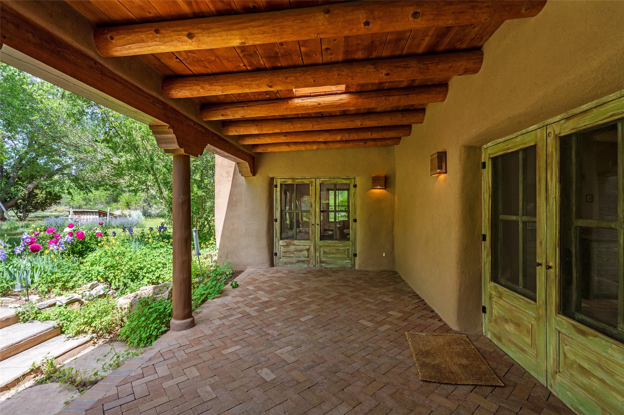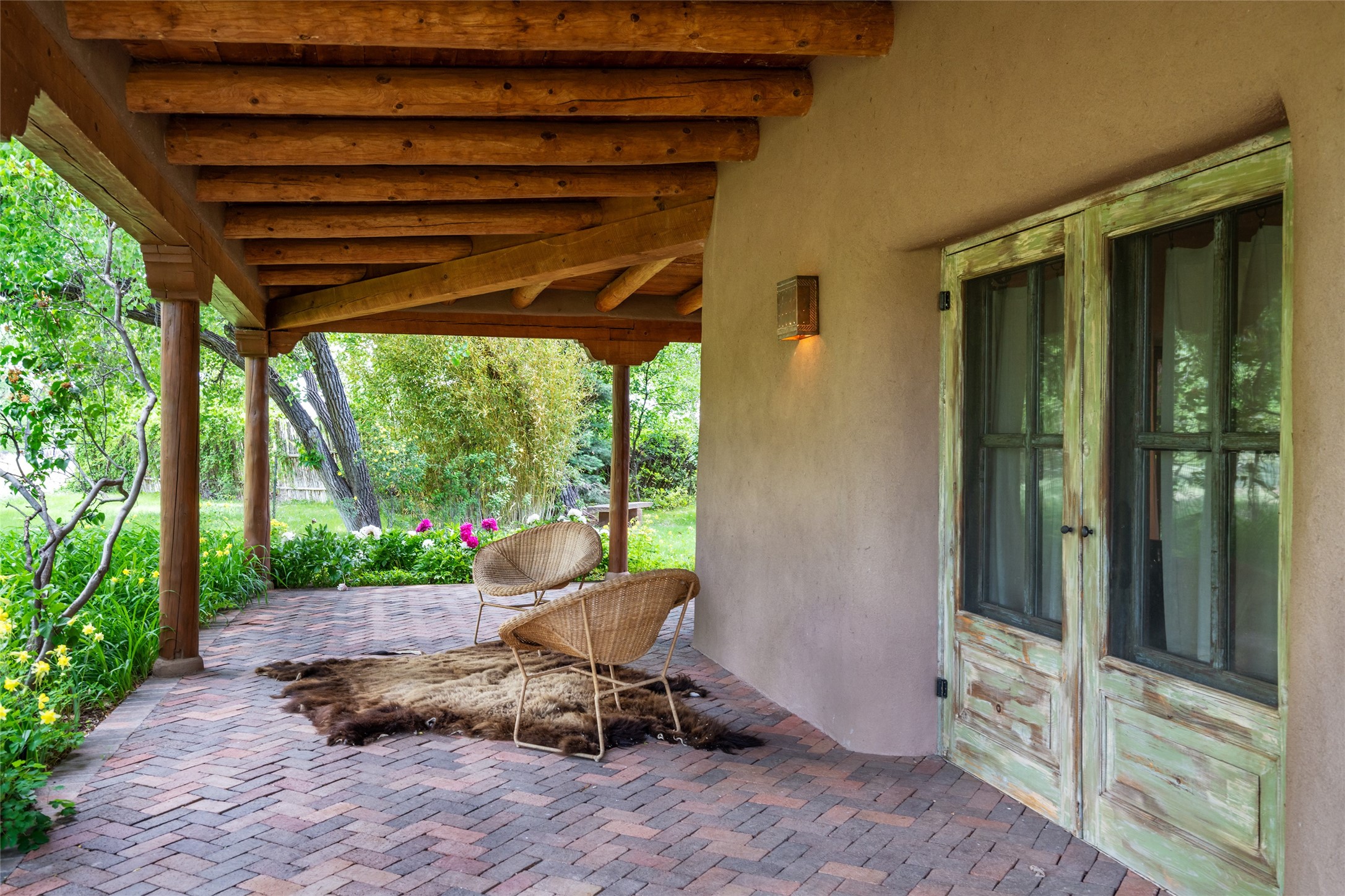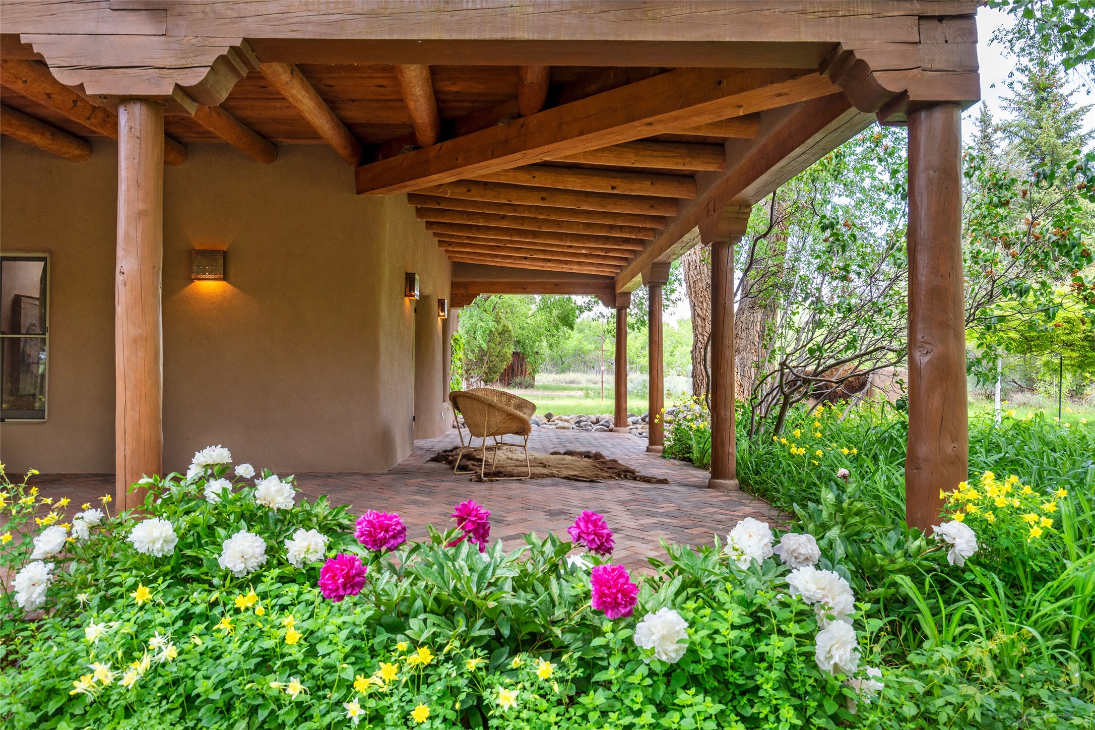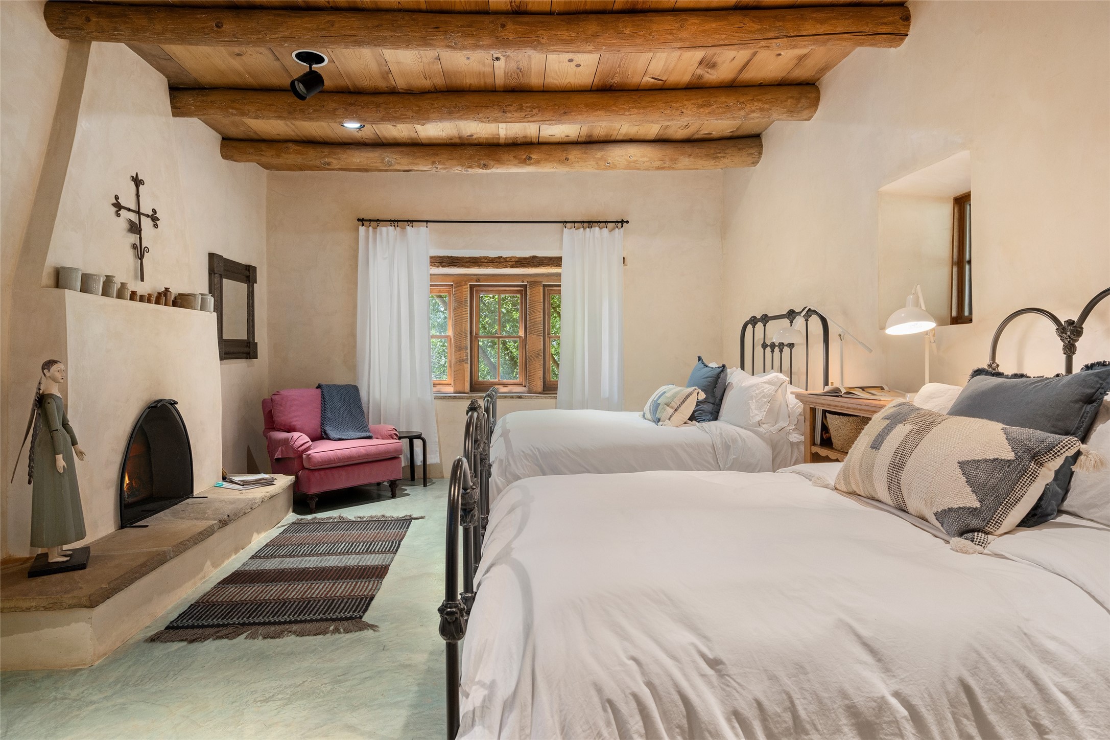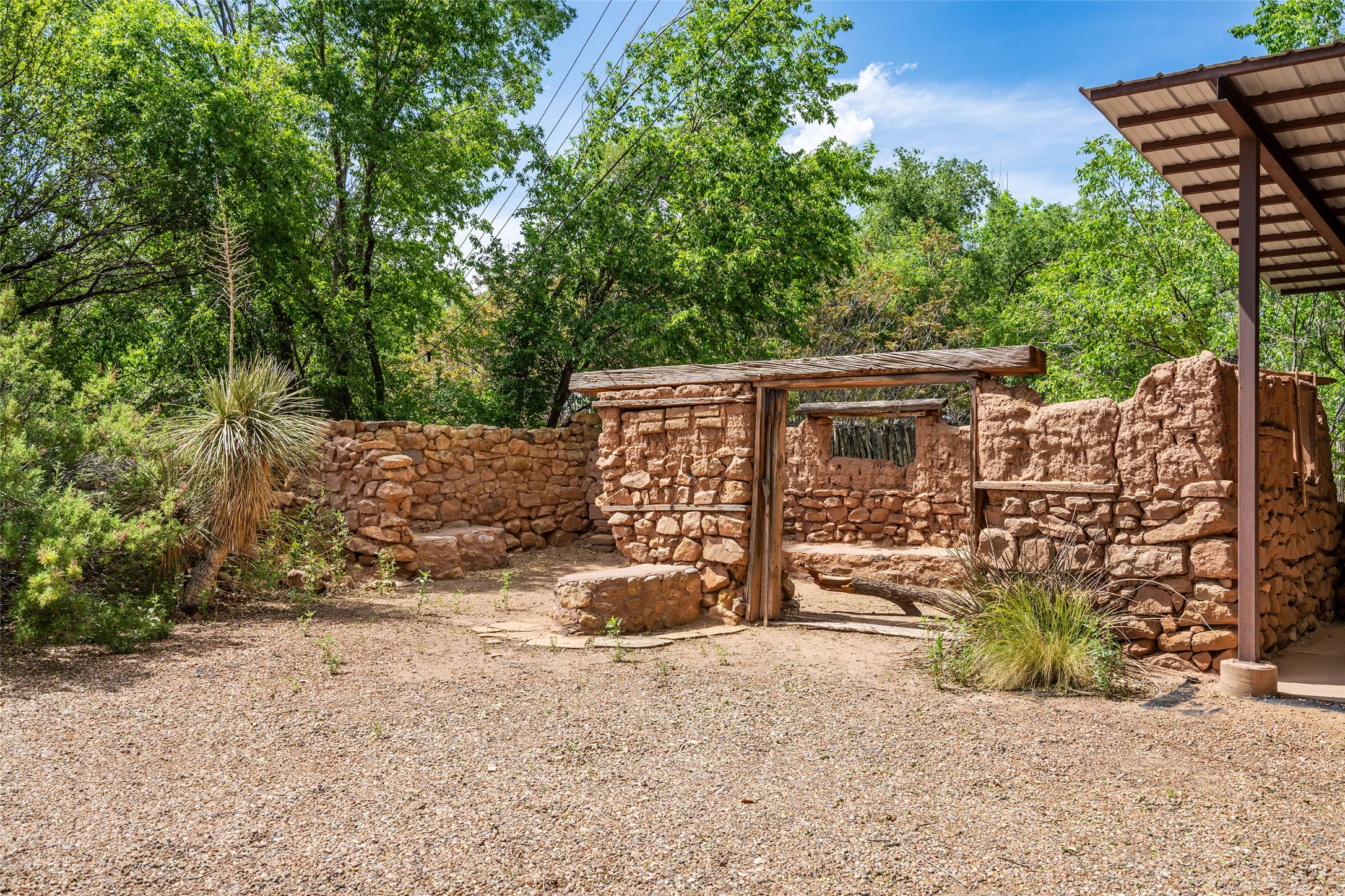 Historic Adobe Oasis on the Galisteo CreekCreate your own paradise along the Galisteo Creek. This stunning 6.39 acre estate offers a compelling blend of historic character, traditional craftsmanship, and natural beauty. A renovated 2 bed, 2 bath double adobe main residence, and a charming 1 bedroom, 1 bath guest quarters create a private compound offering the best of old and new in the heart of one of New Mexico's most storied villages, all a mere 30 minute drive from Santa Fe.The main home features 2 bedrooms and 2.5 baths, showcasing hand-plastered walls, vigas, latillas, deep adobe walls, high ceilings and wood-burning fireplaces that reflect the architectural heritage of the area, enhanced by historic ruins on the property dating back to 1880. Thoughtful renovations and preservation work ensure modern comfort while honoring the property's authenticity.Residents and guests will appreciate the privacy of the split floor plan, with the two bedroom suites separate and serene, each featuring their own cozy fireplace and en suite bath. The large kitchen boasts an equally large butlers pantry. It's a generous amount of space allowing for a multifaceted culinary experience. Set beneath majestic cottonwoods in a park-like setting, surrounded by lush irrigated landscaping, the grounds are verdant with fruit trees and flower gardens. Proximity to the Galisteo Creek enhances the sense of abundance and connection, with expansive portals and shaded outdoor spaces ideal for quiet retreat or entertaining.The separate guest house offers its own living space with a kitchenette and bath, ideal for hosting guests or tenants. It has also been used as an artist studio as the concrete floors allow for being creative. There is a large barn door that opens out to a small porch perfect for a lovely evening dinner. Experience this rare, water-adjacent adobe property in an artistic community full of heritage and natural splendor.