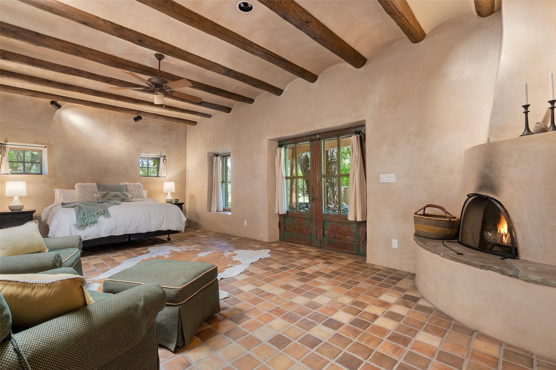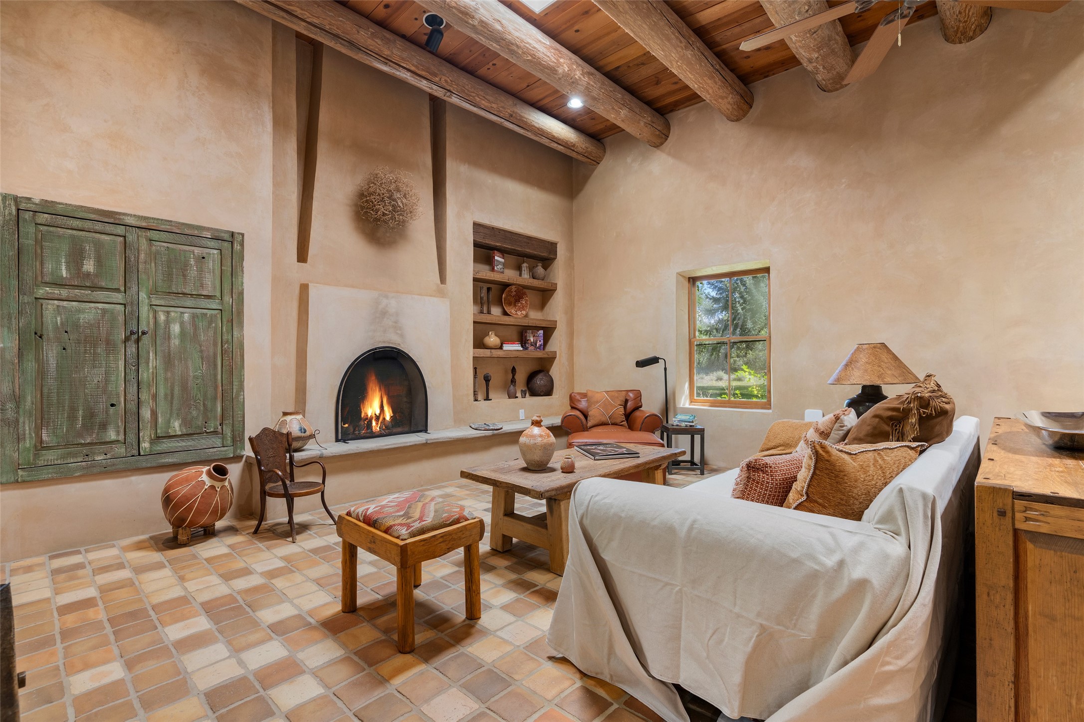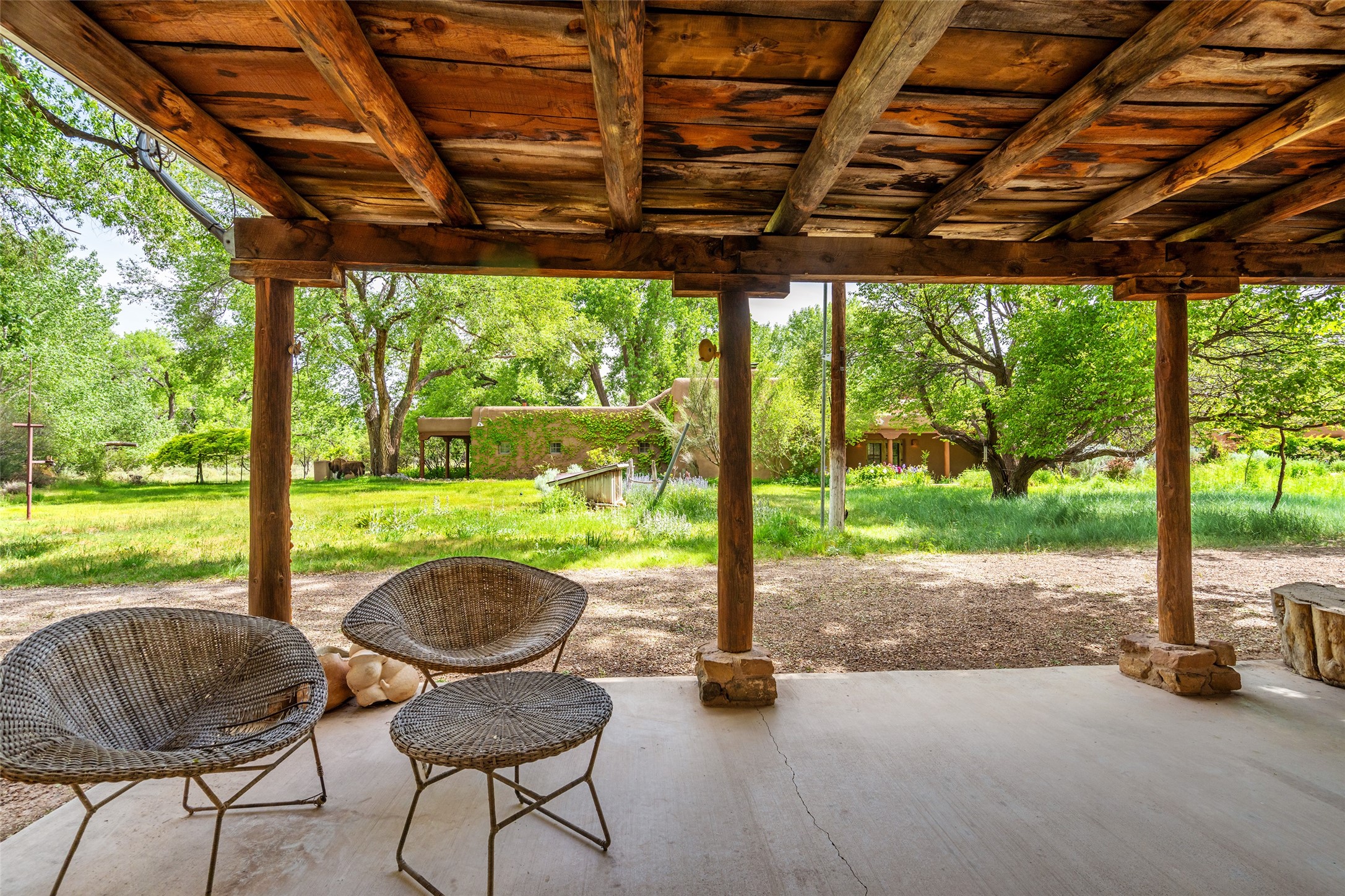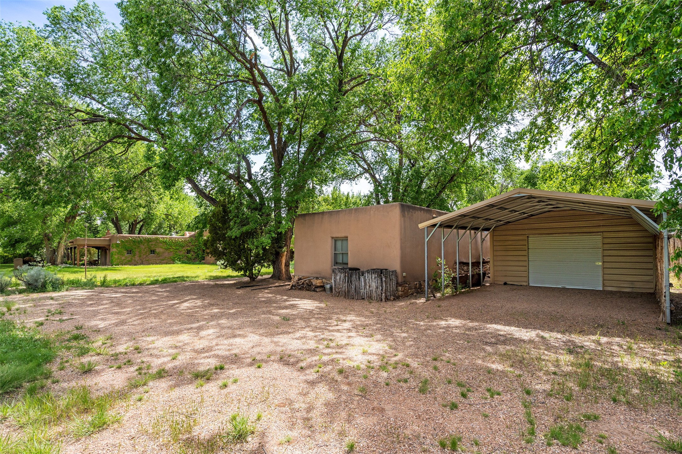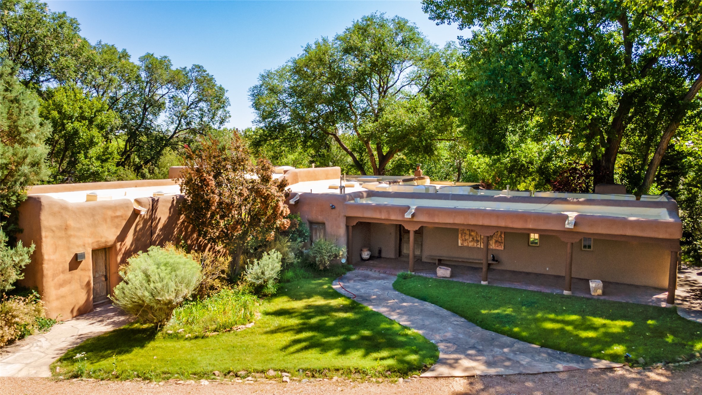 Historic Adobe Oasis on the Galisteo CreekCreate your own paradise along the Galisteo Creek. This stunning 6.39 acre estate offers a compelling blend of historic character, traditional craftsmanship, and natural beauty. A renovated 2 bed, 2 bath double adobe main residence, and a charming 1 bedroom, 1 bath guest quarters create a private compound offering the best of old and new in the heart of one of New Mexico's most storied villages, all a mere 30 minute drive from Santa Fe.The main home features 2 bedrooms and 2.5 baths, showcasing hand-plastered walls, vigas, latillas, deep adobe walls, high ceilings and wood-burning fireplaces that reflect the architectural heritage of the area, enhanced by historic ruins on the property dating back to 1880. Thoughtful renovations and preservation work ensure modern comfort while honoring the property's authenticity.Residents and guests will appreciate the privacy of the split floor plan, with the two bedroom suites separate and serene, each featuring their own cozy fireplace and en suite bath. The large kitchen boasts an equally large butlers pantry. It's a generous amount of space allowing for a multifaceted culinary experience. Set beneath majestic cottonwoods in a park-like setting, surrounded by lush irrigated landscaping, the grounds are verdant with fruit trees and flower gardens. Proximity to the Galisteo Creek enhances the sense of abundance and connection, with expansive portals and shaded outdoor spaces ideal for quiet retreat or entertaining.The separate guest house offers its own living space with a kitchenette and bath, ideal for hosting guests or tenants. It has also been used as an artist studio as the concrete floors allow for being creative. There is a large barn door that opens out to a small porch perfect for a lovely evening dinner. Experience this rare, water-adjacent adobe property in an artistic community full of heritage and natural splendor.
