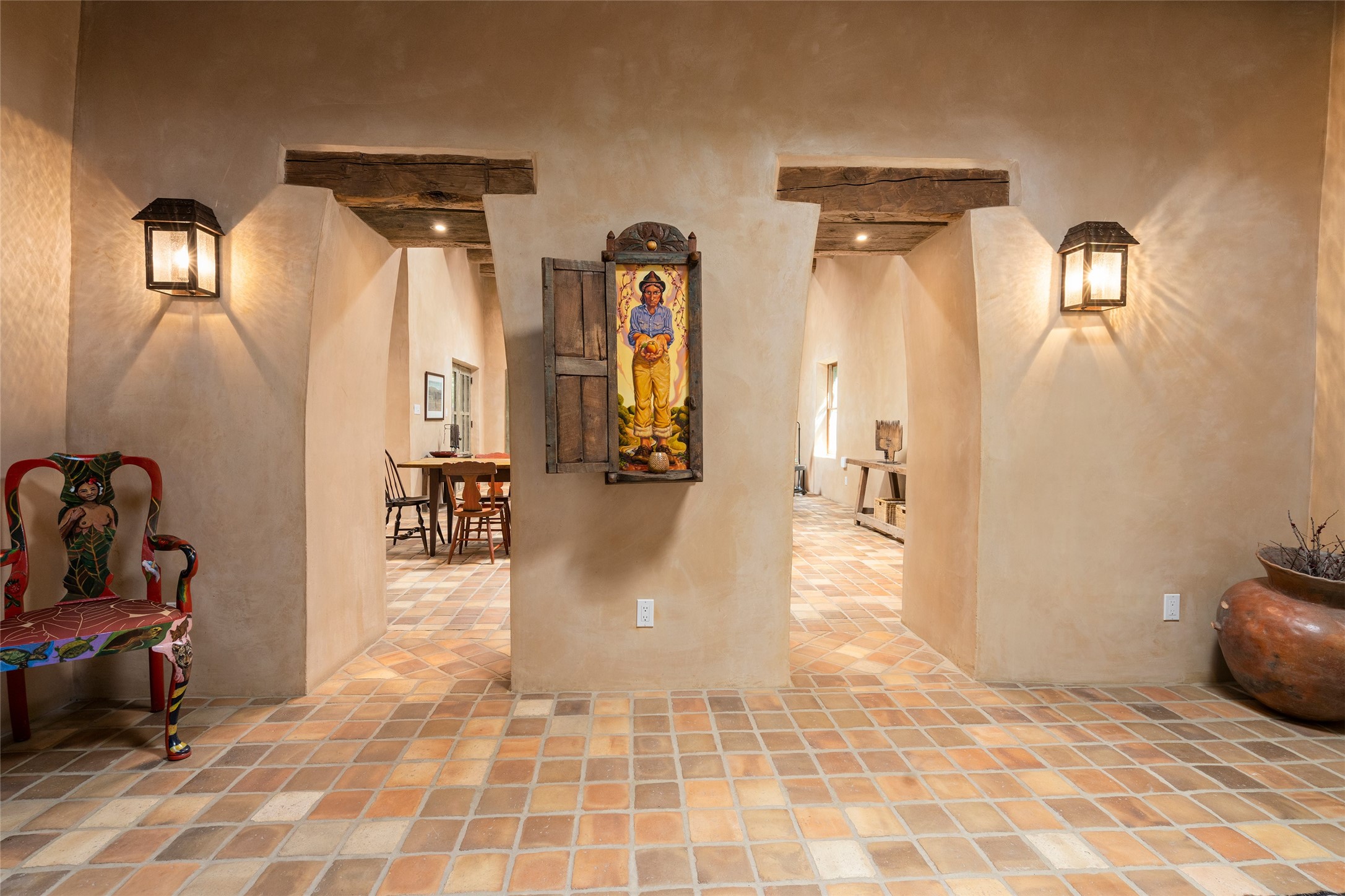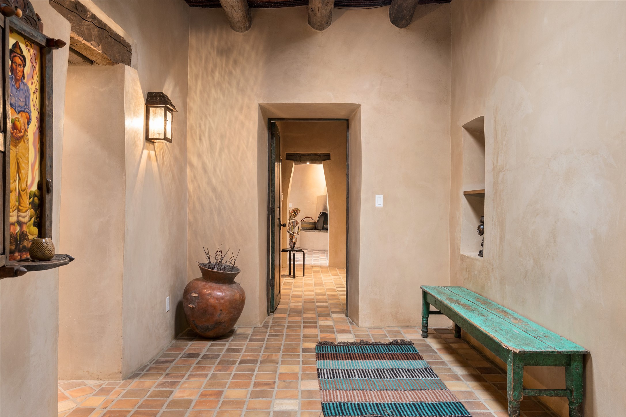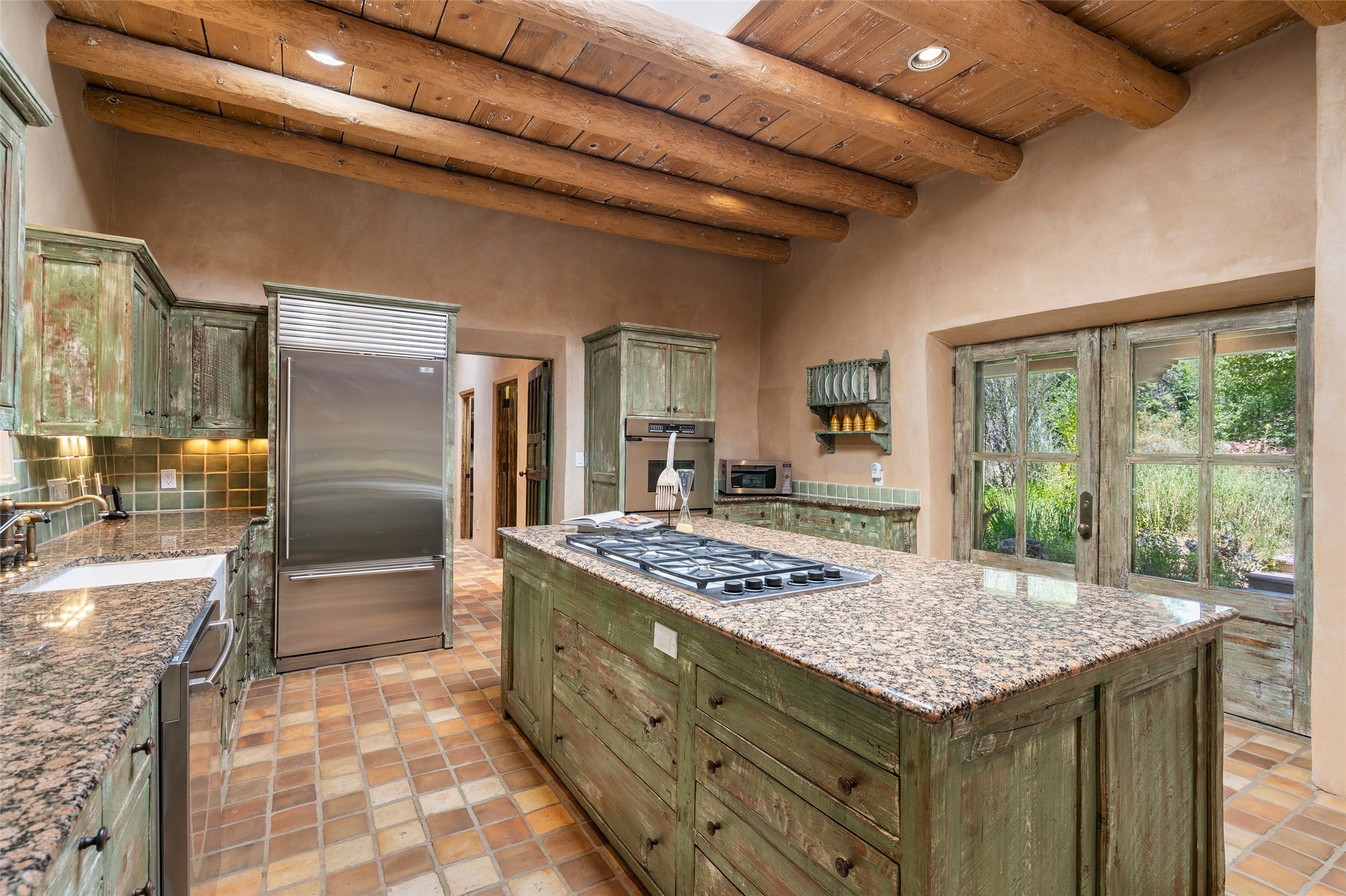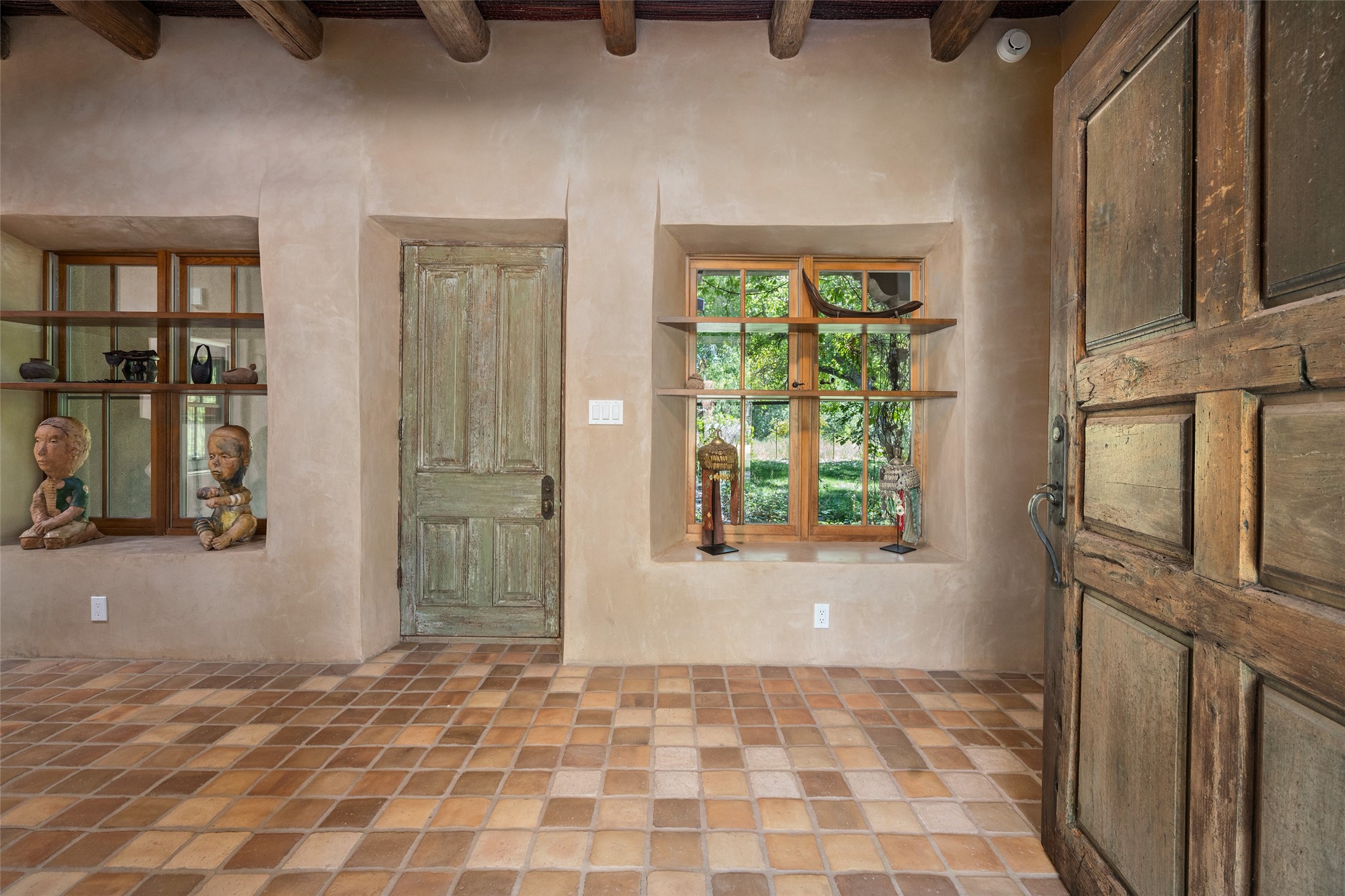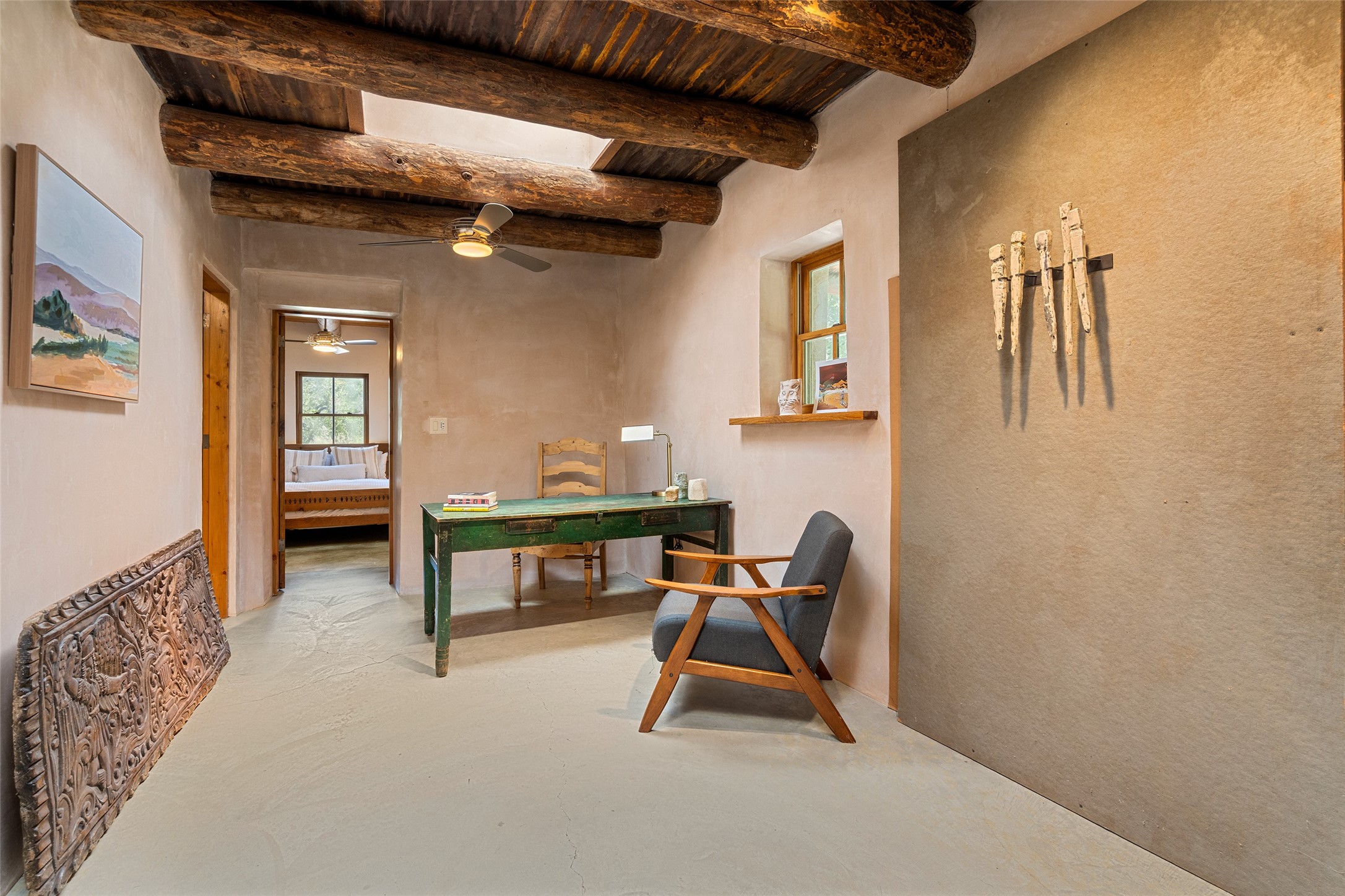 Historic Adobe Oasis on the Galisteo CreekCreate your own paradise along the Galisteo Creek. This stunning 6.39 acre estate offers a compelling blend of historic character, traditional craftsmanship, and natural beauty. A renovated 2 bed, 2 bath double adobe main residence, and a charming 1 bedroom, 1 bath guest quarters create a private compound offering the best of old and new in the heart of one of New Mexico's most storied villages, all a mere 30 minute drive from Santa Fe.The main home features 2 bedrooms and 2.5 baths, showcasing hand-plastered walls, vigas, latillas, deep adobe walls, high ceilings and wood-burning fireplaces that reflect the architectural heritage of the area, enhanced by historic ruins on the property dating back to 1880. Thoughtful renovations and preservation work ensure modern comfort while honoring the property's authenticity.Residents and guests will appreciate the privacy of the split floor plan, with the two bedroom suites separate and serene, each featuring their own cozy fireplace and en suite bath. The large kitchen boasts an equally large butlers pantry. It's a generous amount of space allowing for a multifaceted culinary experience. Set beneath majestic cottonwoods in a park-like setting, surrounded by lush irrigated landscaping, the grounds are verdant with fruit trees and flower gardens. Proximity to the Galisteo Creek enhances the sense of abundance and connection, with expansive portals and shaded outdoor spaces ideal for quiet retreat or entertaining.The separate guest house offers its own living space with a kitchenette and bath, ideal for hosting guests or tenants. It has also been used as an artist studio as the concrete floors allow for being creative. There is a large barn door that opens out to a small porch perfect for a lovely evening dinner. Experience this rare, water-adjacent adobe property in an artistic community full of heritage and natural splendor.