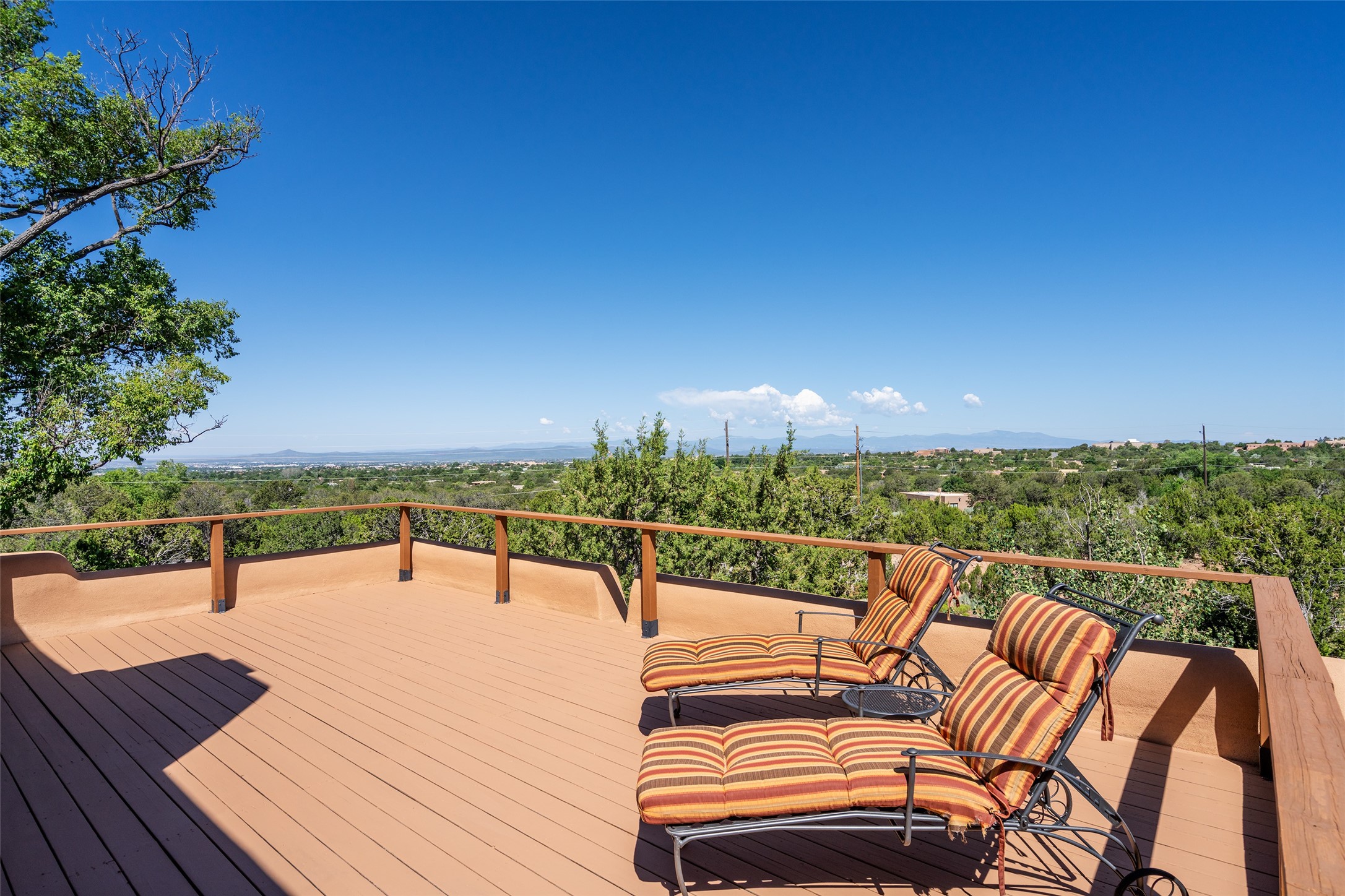 Welcome to 3869 Old Santa Fe Trail, a picturesque estate adjacent to Sun Mountain in the rolling foothills of Santa Fe's most storied corridor. Weaving the romance of historic New Mexico with modern amenities, this property rests on a serene 3 acres just 1.5 miles from Museum Hill and 3 miles from the Santa Fe Plaza.Rooted in Santa Fe's rich architectural heritage, the home exudes authentic charm: hand-carved beams and artisan-crafted finishes pay homage to centuries of tradition. The 3 bedroom, 3 bath, plus flex space, main home has the space for a true entertainer. A gorgeous patio off the dining area and cozy sunken living room with elegantly detailed fireplace will delight any visitor. The primary bedroom suite on the second floor boasts views of Sun Mountain, its own fireplace, a spa-like bathroom, an oxygenation system for a perfectly restful sleep and space to create a comfortable tv area or office with views.Enjoy not only a beautiful main home but space for guests in the one bedroom casita with kiva fireplace. The 968 sqft studio space above the garage is an inspiration! Savor views, a deck and ample room for all the creative endeavors you wish to pursue. There is also a 3/4 bath and kitchenette if you decide you want to create a treehouse guest space. Surrounding the home, 3 acres unfold into a private landscape of pion-dotted tranquility. The land connects to the trailhead for Sun Mountain. Imagine taking your morning hike then ending up with a coffee on your gorgeous patio garden. There are raised beds for growing vegetables and multiple fruit trees on the property, plus a 10,000 gallon cistern for catching rain water for irrigation. Solar panels support a sustainable lifestyle, helping to protect the stunning surroundings.3869 Old Santa Fe Trail is more than a residence, it's an invitation to inhabit legacy, wellness, and peace in one of the Southwest's most coveted settings.