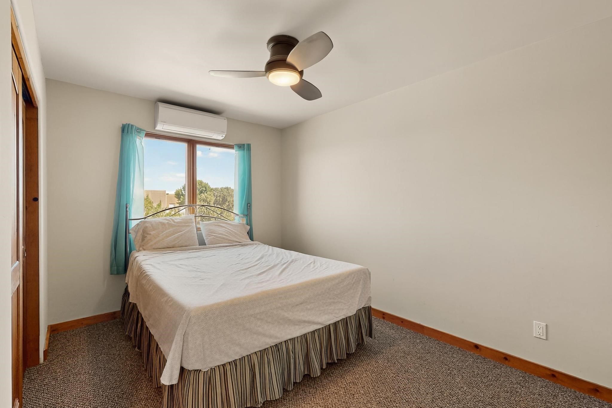 Priced to Sell! Potential multigenerational living. Expansive contemporary pueblo, split bedroom open plan design with high ceilings throughout. The main home includes a formal dining area, spacious great room with kiva fireplace, a large primary suite with kiva fireplace, large walk in closet and spa-like bathroom. Excellent separation from the two guest bedrooms and bath, plus a den/study. The kitchen has been remodeled including an induction range top, custom lighted cabinetry and pantry. The radiant heating is supplemented by 5 mini splits to keep a comfortable temperature summer and winter. There is a large heated storage room/workroom for hobbies and toys plus an oversized 2 car garage. Behind the home sits a detached 478 sq.ft. heated 2 room studio/guest with a 3/4 bathroom for extra guests/office or studio with a separate septic system. A lovely walled garden with a 3rd kiva fireplace for enjoyment plus a large portal for morning or evening outside entertainment. Enjoy the historic railway and rail trail bordering the back of your land. Plenty of guest parking with a paved driveway and easy access to Eldorado amenities, local shopping only minutes into Santa Fe.