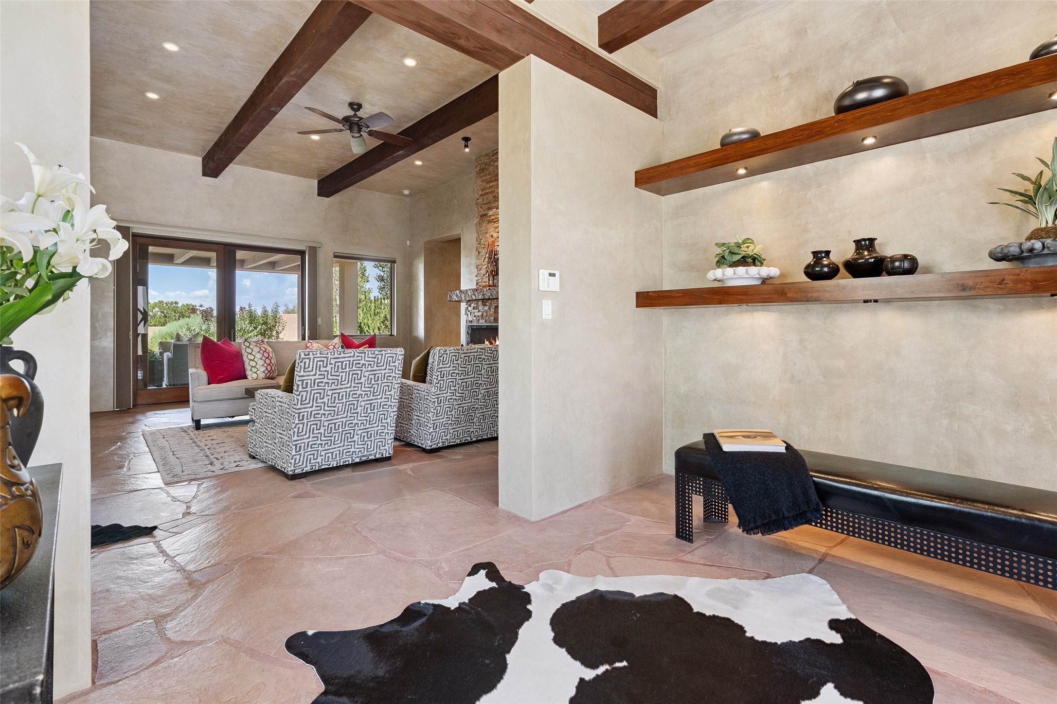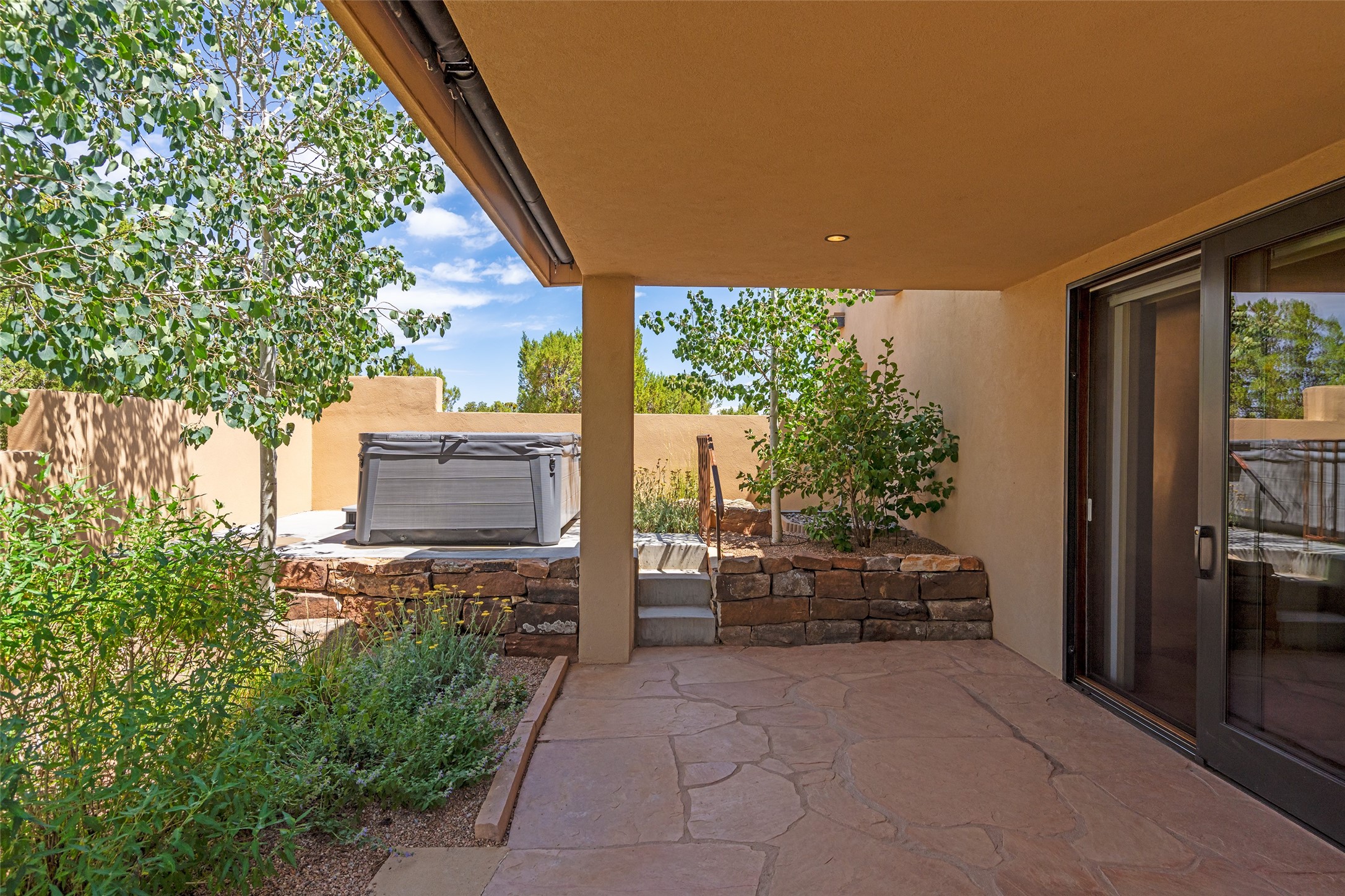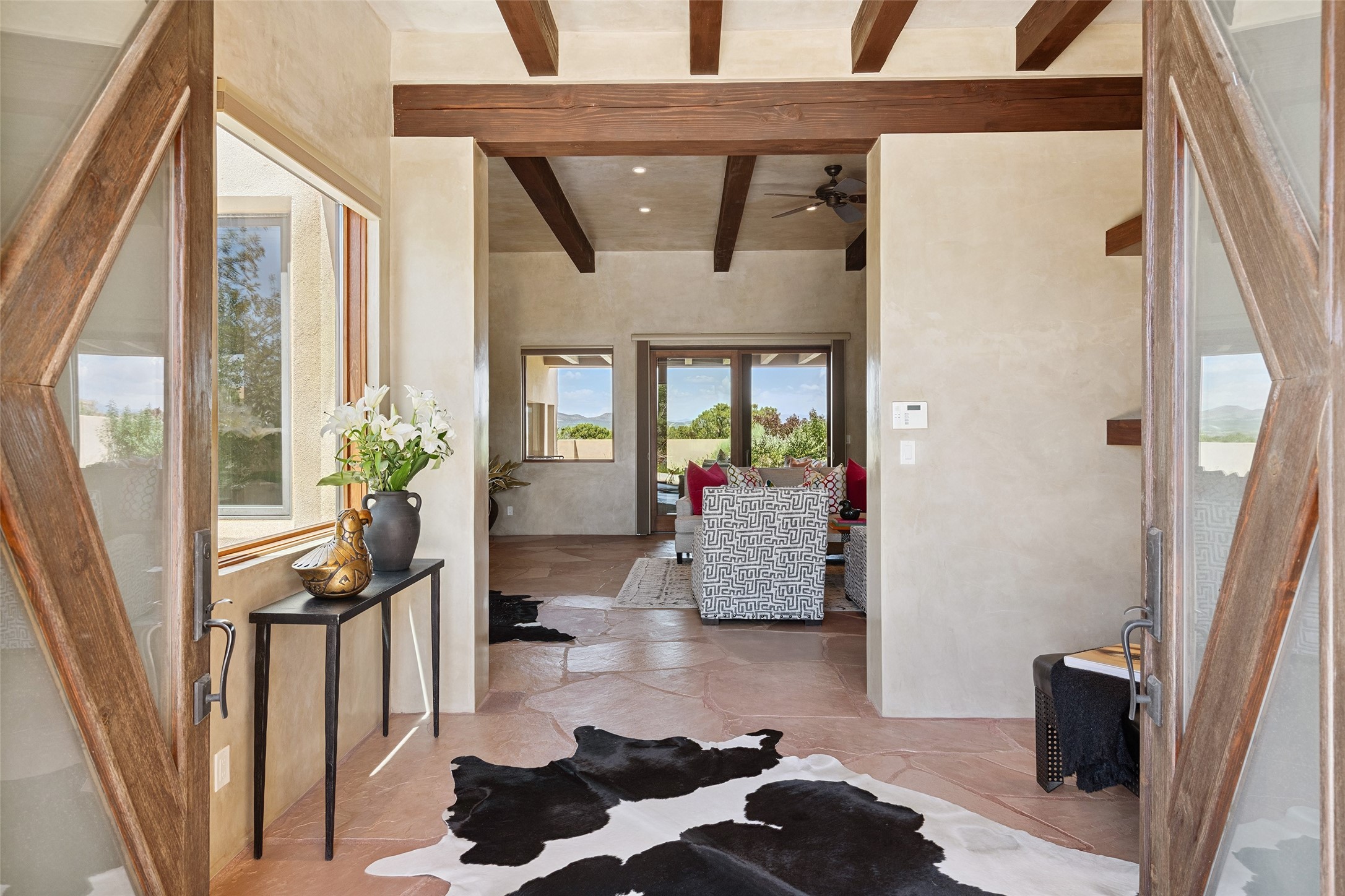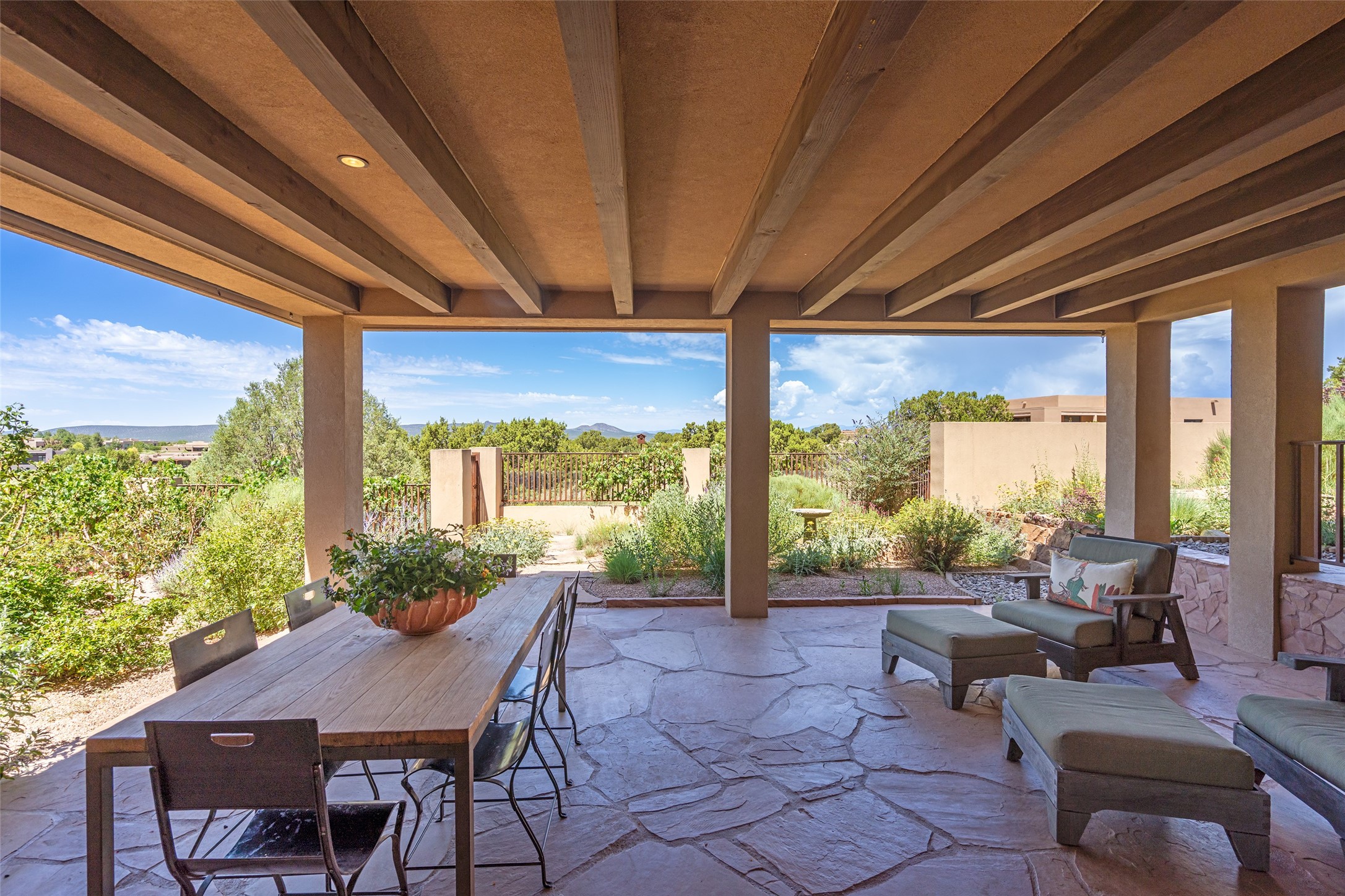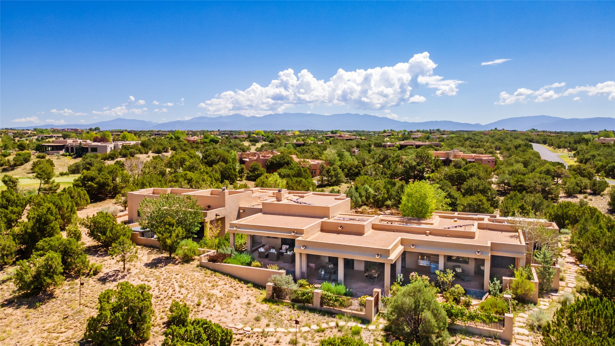THIS STUNNING SANTA FE STYLE LAS CAMPANAS RESIDENCE CAPTURES SWEEPING WESTERN VIEWS OF THE JEMEZ MOUNTAINS AND SUNSET GOLF COURSE. The home's rich topography is felt throughout, blending beautifully with natural flagstone floors, stacked stone fireplaces, wooden beams, smooth plaster walls, and deep covered portals that epitomize indoor-outdoor New Mexico living and allows you to relax into the dazzling landscape. Designed with clean lines for privacy and flow, the thoughtfully tiered floor plan offers a well-separated two-suite guest wing - complete with art hanging system and laundry - opposite the luxurious primary suite. The heart of the home lies in the expansive living spaces and several large portals, perfect for entertaining or quiet reflection, all while enjoying framed views of nature and sky. Ascend past the office to the serene primary suite featuring its own fireplace, private patio with hot tub access, elegant built-ins, large walk-in closet, plenty of storage, and a spa-like bath with deep soaking tub and grand shower. The kitchen is warm, functional, and beautifully integrated within the undulating colorful mountain views. Here you will find a cook's kitchen with Viking appliances, a Wolf induction cooktop, informal gathering space, a walk-in pantry, and seamless access to both front and rear portals. A separate foyer with a wine fridge, powder room, and a flexible office or reading room adds thoughtful utility and charm. Outdoors, the portals extend the living experience with a kitchen, tranquil gardens, water features, even more storage, and complete privacy. Timeless Santa Fe design, executed to perfection.