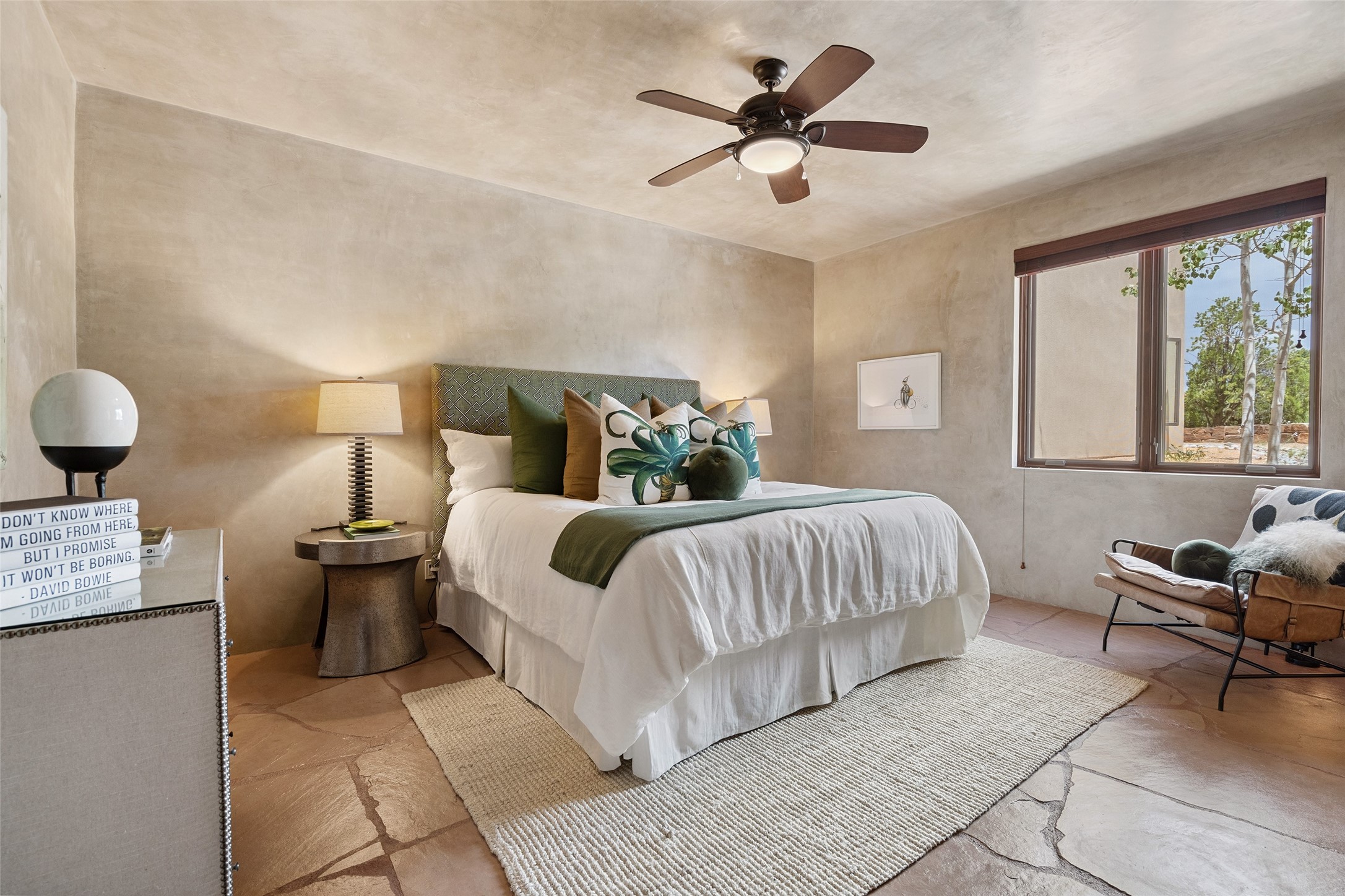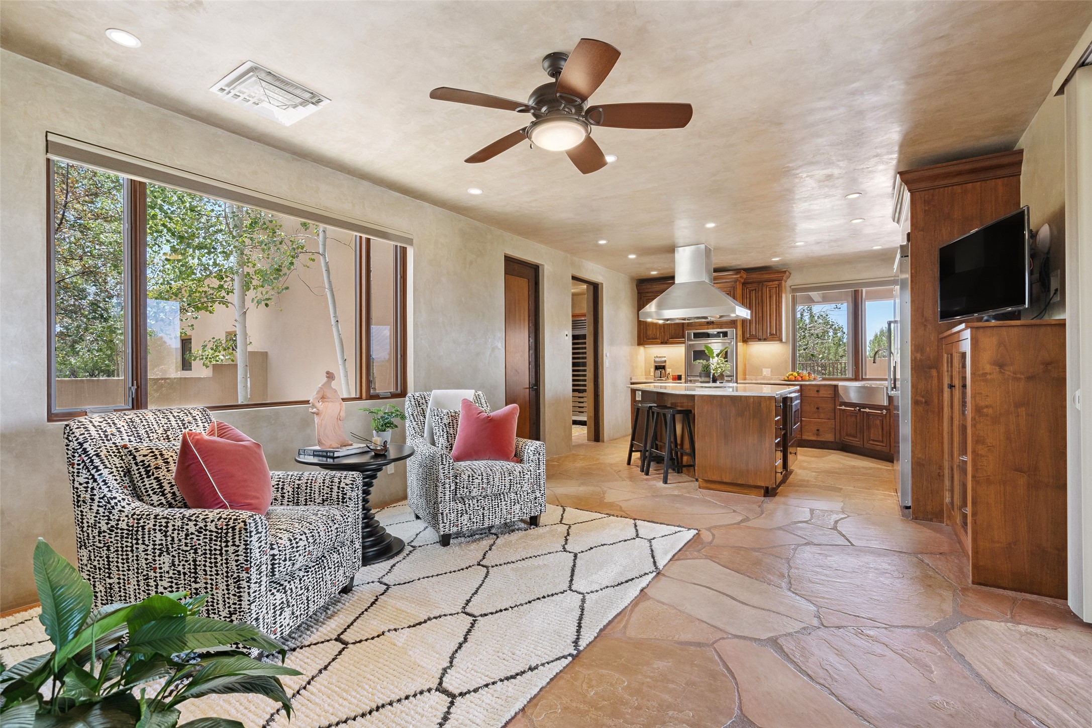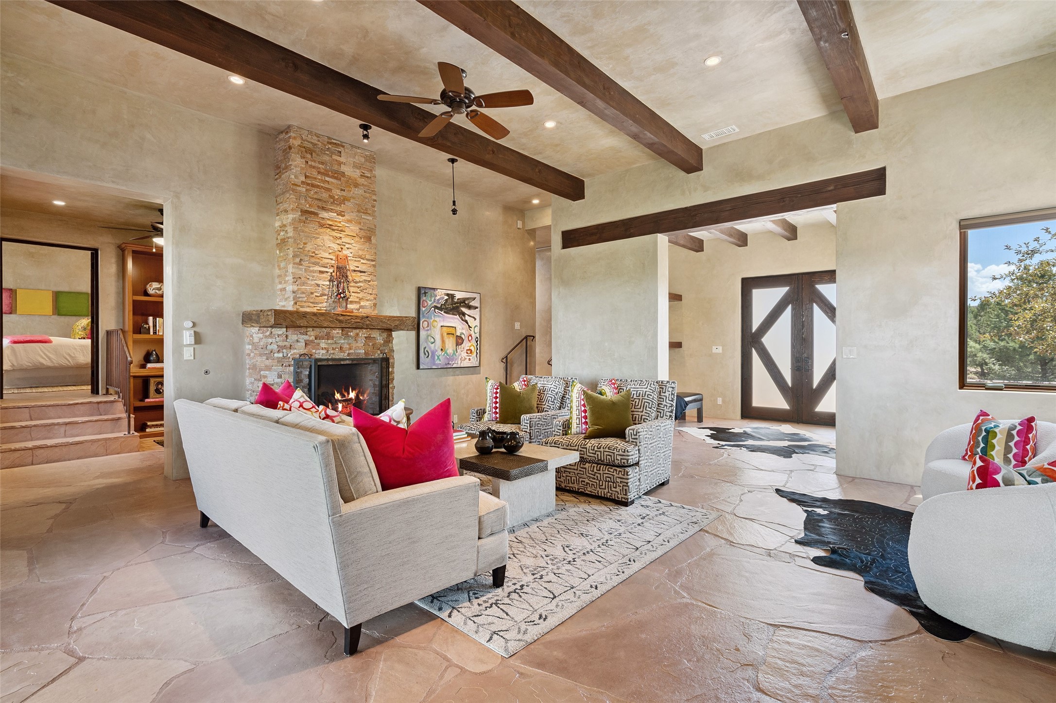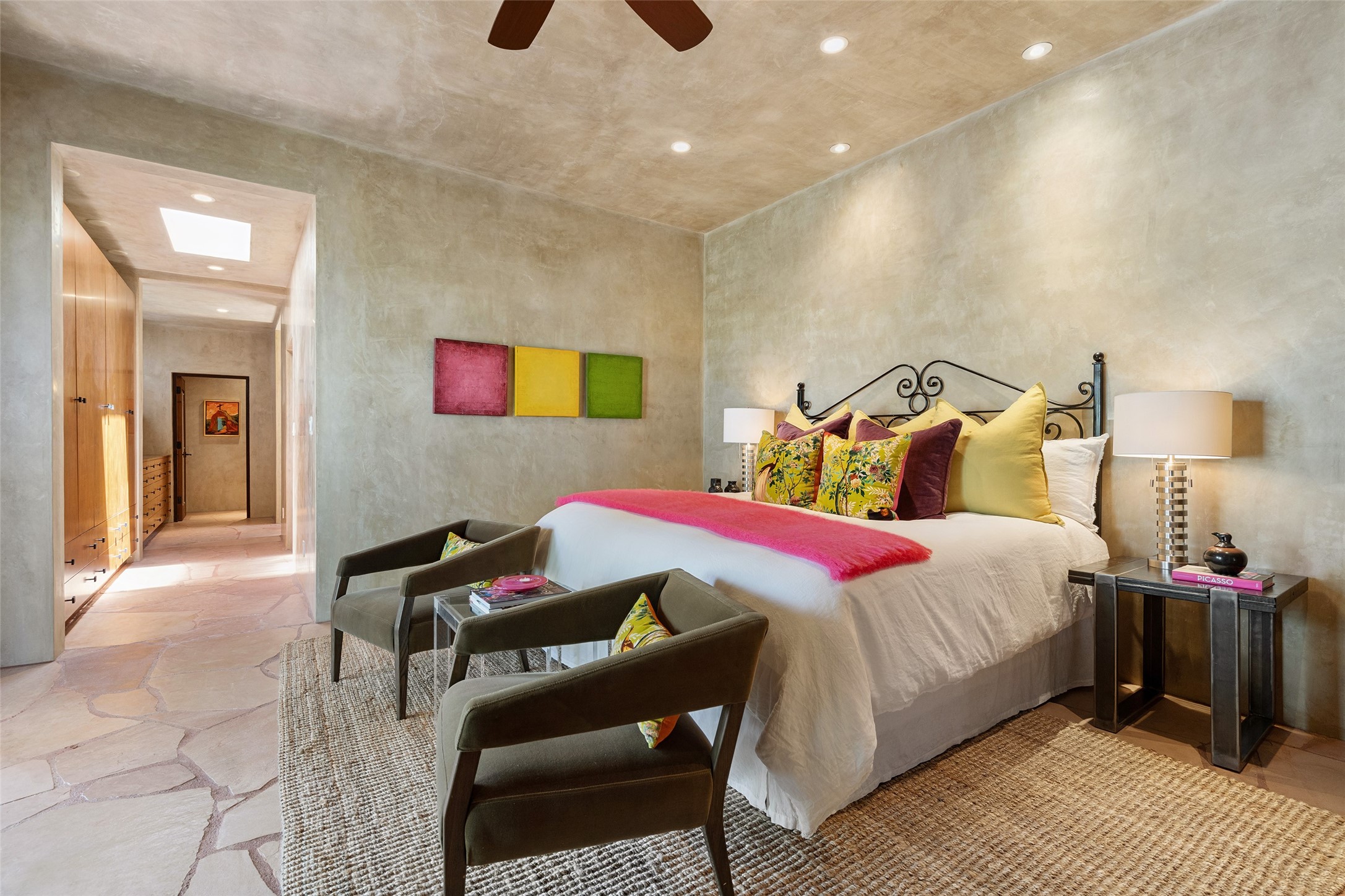 THIS STUNNING SANTA FE STYLE LAS CAMPANAS RESIDENCE CAPTURES SWEEPING WESTERN VIEWS OF THE JEMEZ MOUNTAINS AND SUNSET GOLF COURSE. The home's rich topography is felt throughout, blending beautifully with natural flagstone floors, stacked stone fireplaces, wooden beams, smooth plaster walls, and deep covered portals that epitomize indoor-outdoor New Mexico living and allows you to relax into the dazzling landscape. Designed with clean lines for privacy and flow, the thoughtfully tiered floor plan offers a well-separated two-suite guest wing - complete with art hanging system and laundry - opposite the luxurious primary suite. The heart of the home lies in the expansive living spaces and several large portals, perfect for entertaining or quiet reflection, all while enjoying framed views of nature and sky. Ascend past the office to the serene primary suite featuring its own fireplace, private patio with hot tub access, elegant built-ins, large walk-in closet, plenty of storage, and a spa-like bath with deep soaking tub and grand shower. The kitchen is warm, functional, and beautifully integrated within the undulating colorful mountain views. Here you will find a cook's kitchen with Viking appliances, a Wolf induction cooktop, informal gathering space, a walk-in pantry, and seamless access to both front and rear portals. A separate foyer with a wine fridge, powder room, and a flexible office or reading room adds thoughtful utility and charm. Outdoors, the portals extend the living experience with a kitchen, tranquil gardens, water features, even more storage, and complete privacy. Timeless Santa Fe design, executed to perfection.