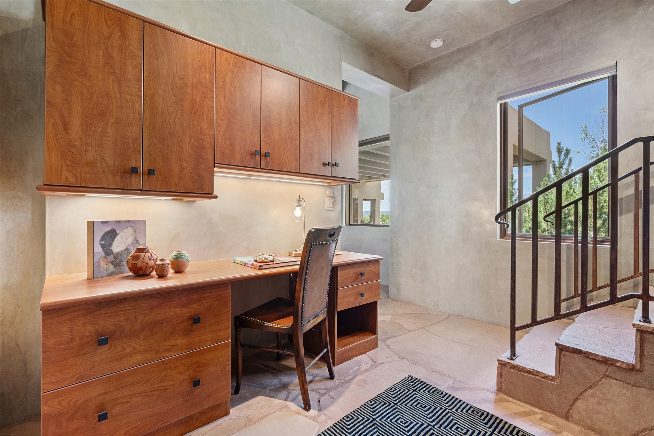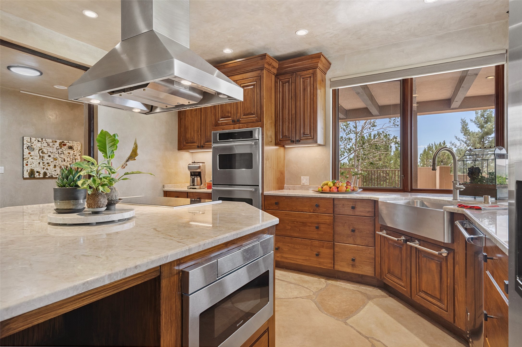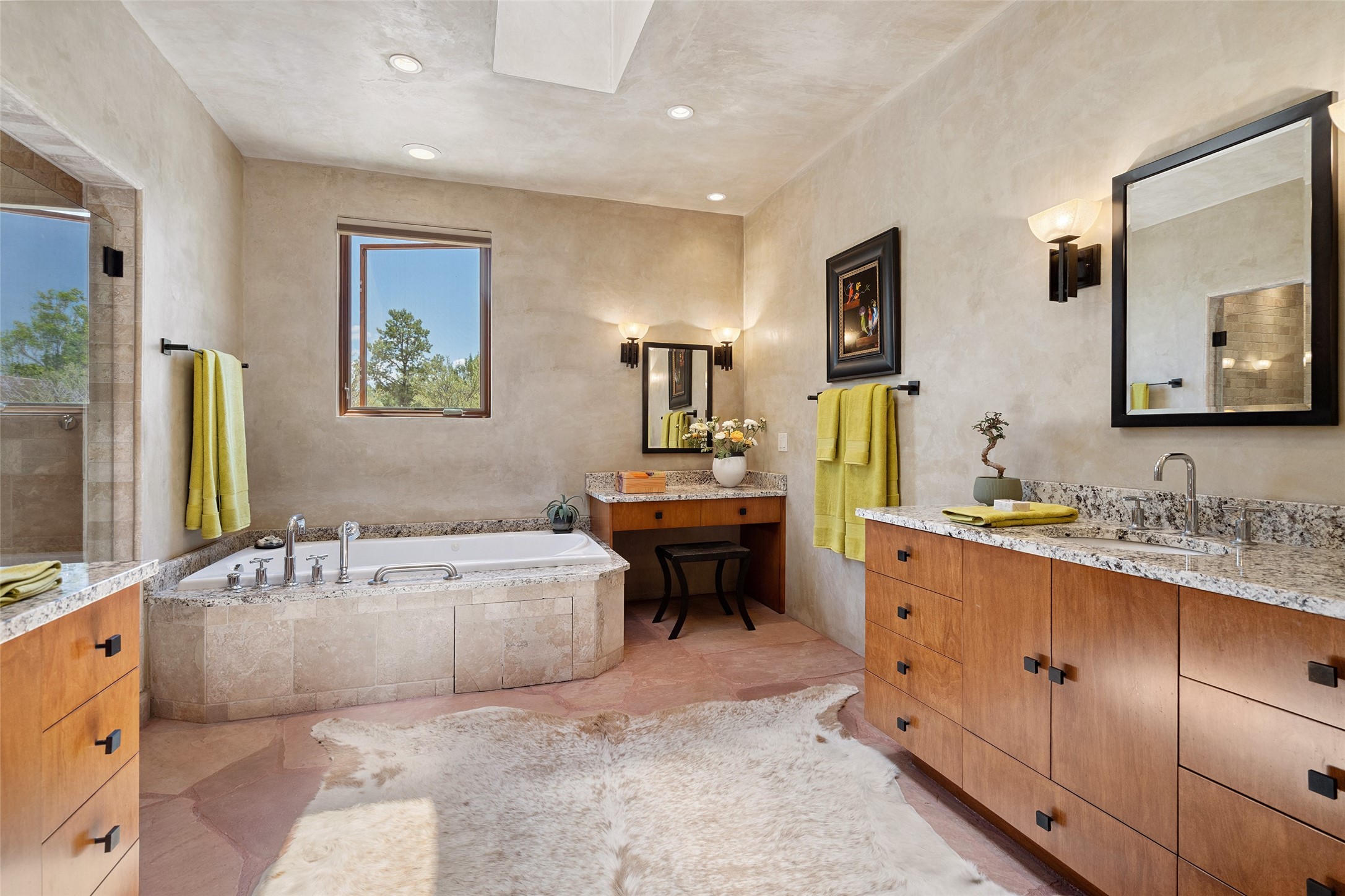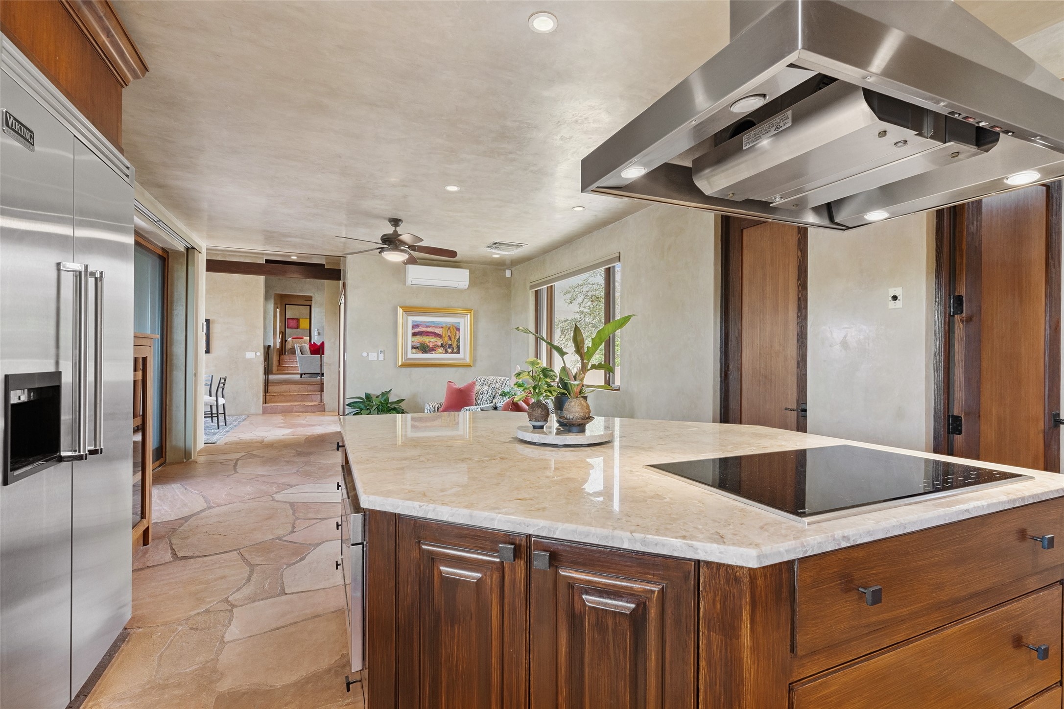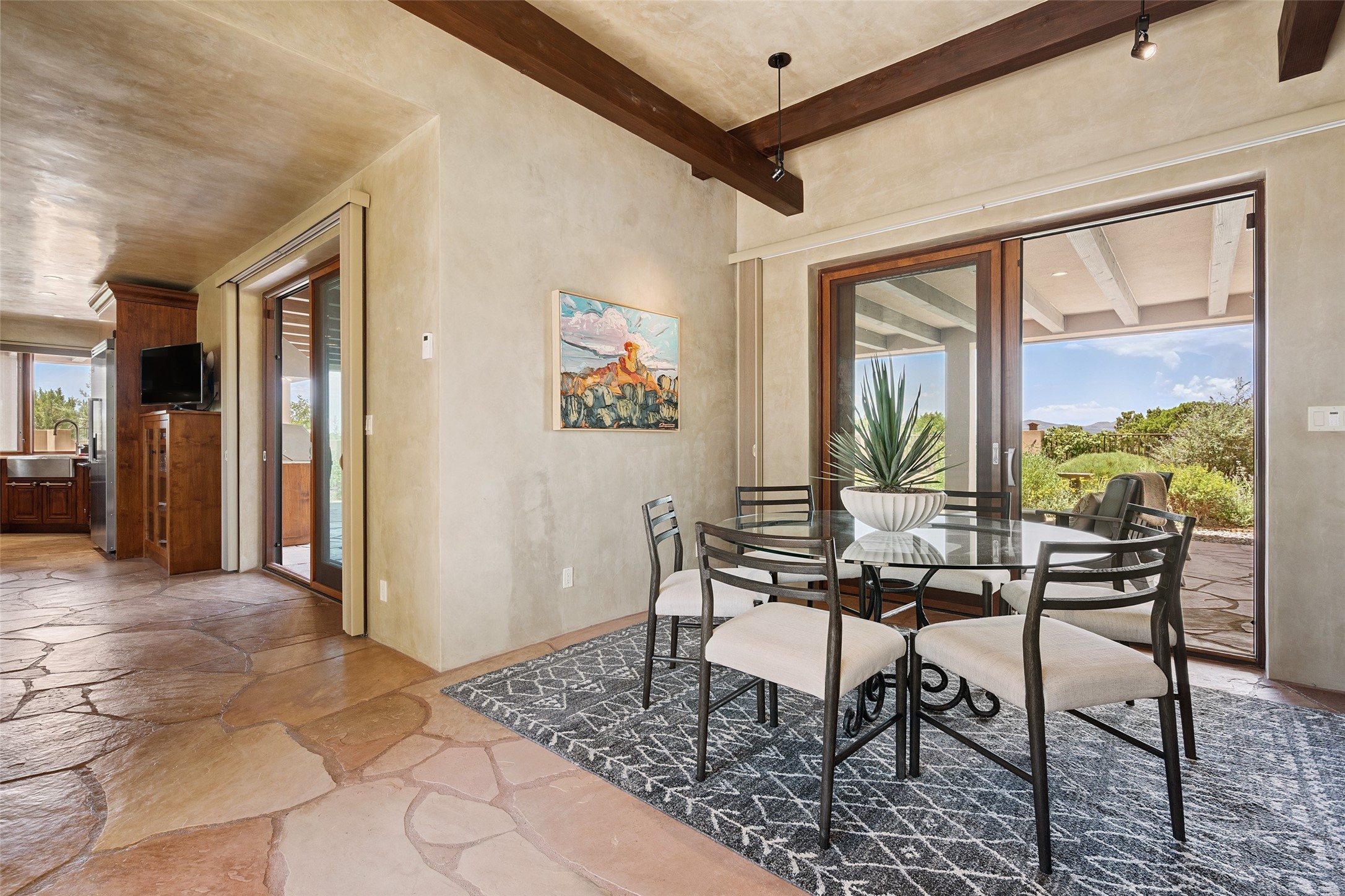 THIS STUNNING SANTA FE STYLE LAS CAMPANAS RESIDENCE CAPTURES SWEEPING WESTERN VIEWS OF THE JEMEZ MOUNTAINS AND SUNSET GOLF COURSE. The home's rich topography is felt throughout, blending beautifully with natural flagstone floors, stacked stone fireplaces, wooden beams, smooth plaster walls, and deep covered portals that epitomize indoor-outdoor New Mexico living and allows you to relax into the dazzling landscape. Designed with clean lines for privacy and flow, the thoughtfully tiered floor plan offers a well-separated two-suite guest wing - complete with art hanging system and laundry - opposite the luxurious primary suite. The heart of the home lies in the expansive living spaces and several large portals, perfect for entertaining or quiet reflection, all while enjoying framed views of nature and sky. Ascend past the office to the serene primary suite featuring its own fireplace, private patio with hot tub access, elegant built-ins, large walk-in closet, plenty of storage, and a spa-like bath with deep soaking tub and grand shower. The kitchen is warm, functional, and beautifully integrated within the undulating colorful mountain views. Here you will find a cook's kitchen with Viking appliances, a Wolf induction cooktop, informal gathering space, a walk-in pantry, and seamless access to both front and rear portals. A separate foyer with a wine fridge, powder room, and a flexible office or reading room adds thoughtful utility and charm. Outdoors, the portals extend the living experience with a kitchen, tranquil gardens, water features, even more storage, and complete privacy. Timeless Santa Fe design, executed to perfection.