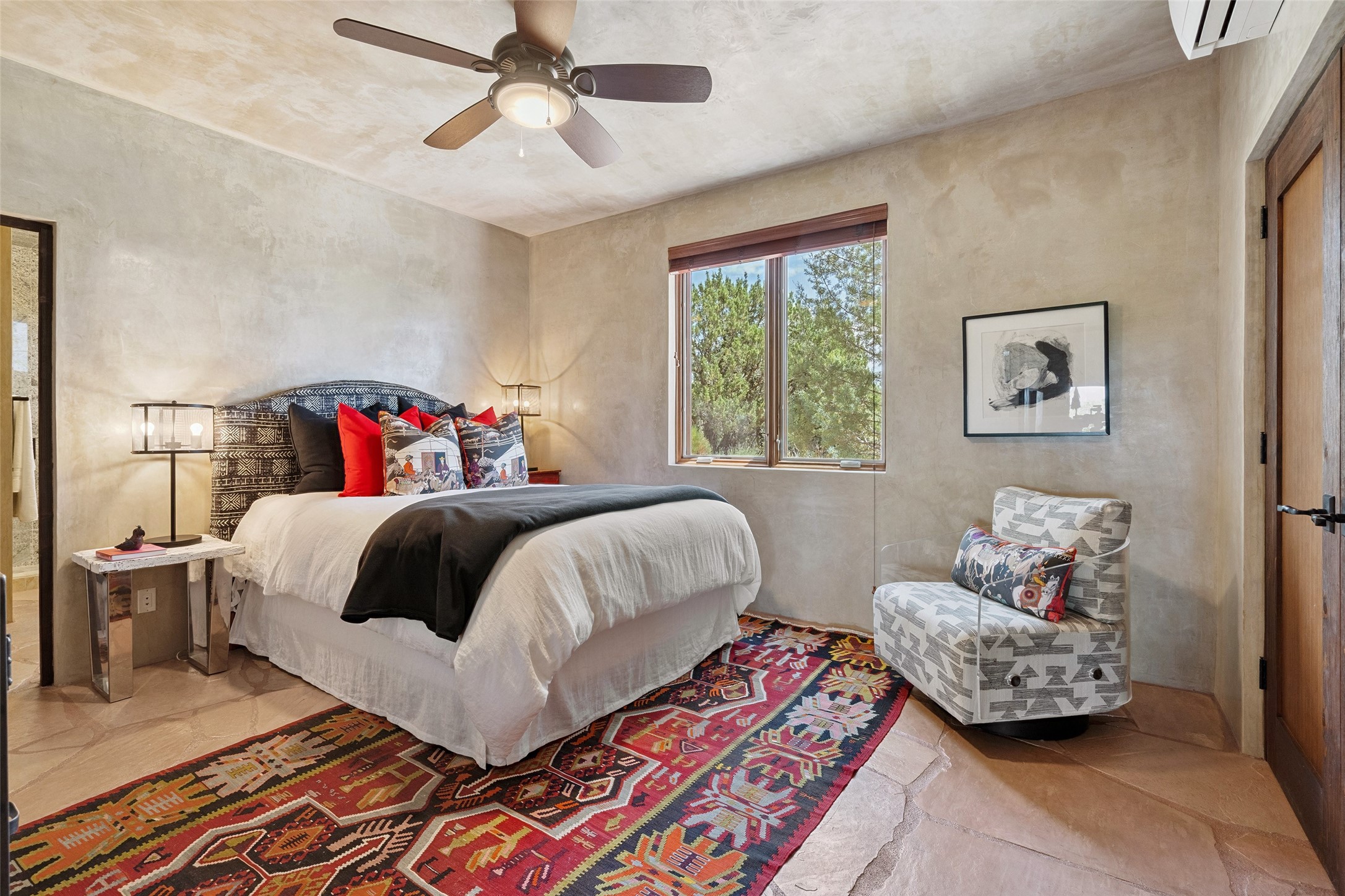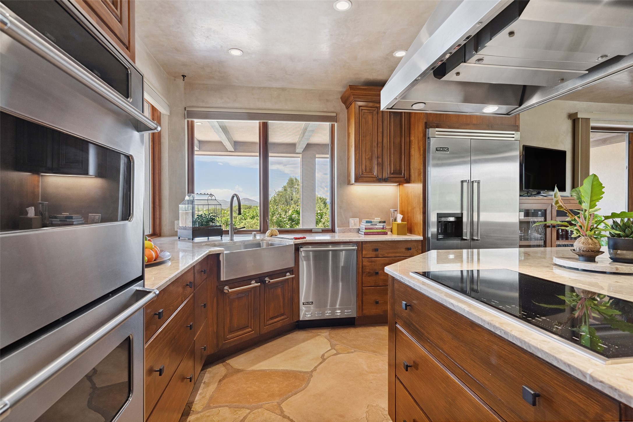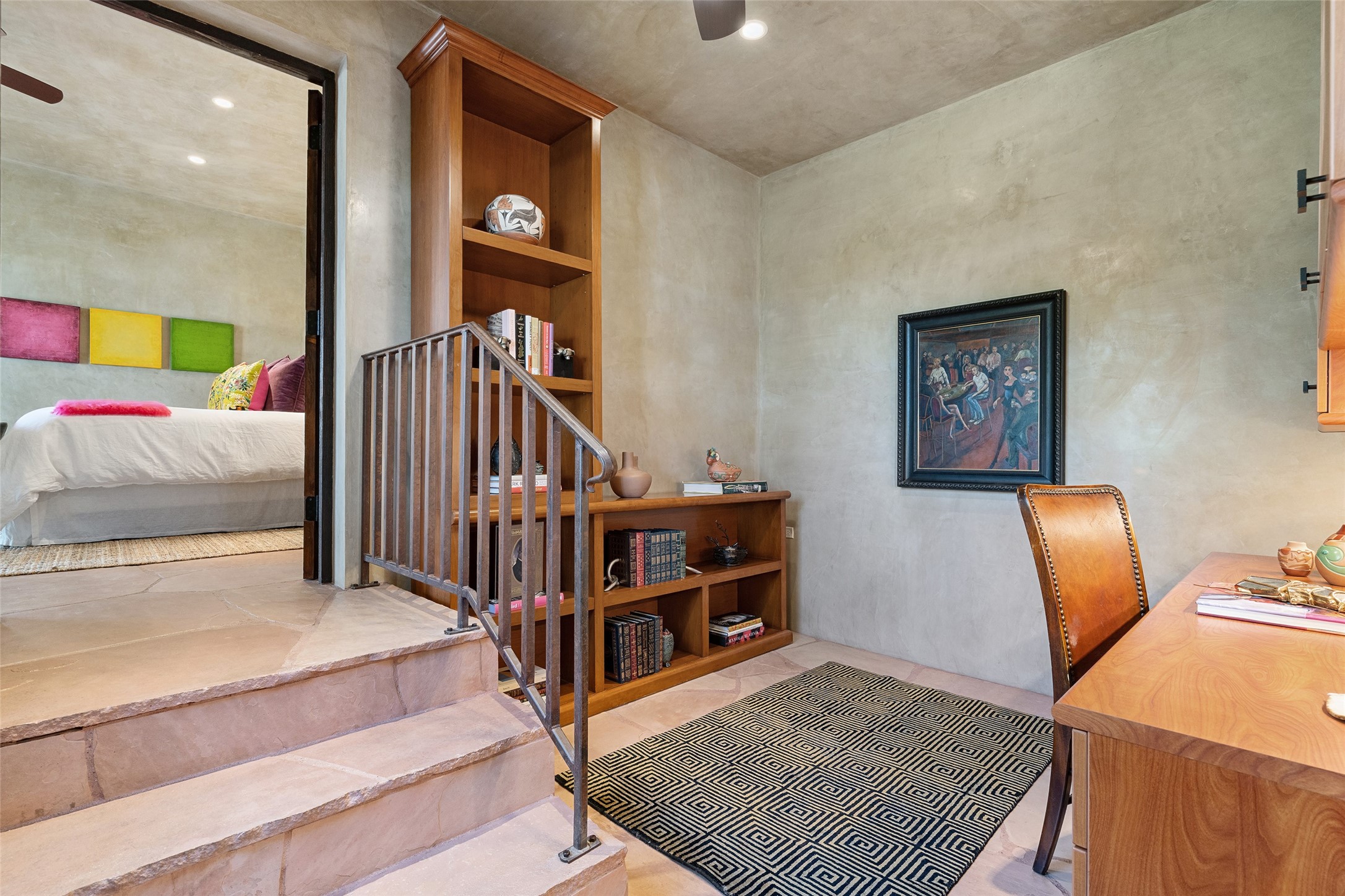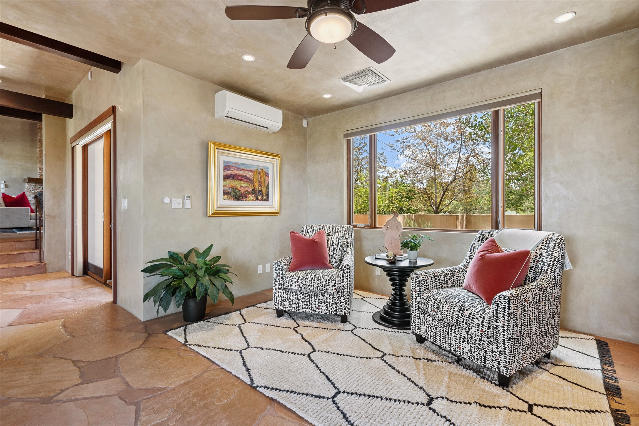 THIS STUNNING SANTA FE STYLE LAS CAMPANAS RESIDENCE CAPTURES SWEEPING WESTERN VIEWS OF THE JEMEZ MOUNTAINS AND SUNSET GOLF COURSE. The home's rich topography is felt throughout, blending beautifully with natural flagstone floors, stacked stone fireplaces, wooden beams, smooth plaster walls, and deep covered portals that epitomize indoor-outdoor New Mexico living and allows you to relax into the dazzling landscape. Designed with clean lines for privacy and flow, the thoughtfully tiered floor plan offers a well-separated two-suite guest wing - complete with art hanging system and laundry - opposite the luxurious primary suite. The heart of the home lies in the expansive living spaces and several large portals, perfect for entertaining or quiet reflection, all while enjoying framed views of nature and sky. Ascend past the office to the serene primary suite featuring its own fireplace, private patio with hot tub access, elegant built-ins, large walk-in closet, plenty of storage, and a spa-like bath with deep soaking tub and grand shower. The kitchen is warm, functional, and beautifully integrated within the undulating colorful mountain views. Here you will find a cook's kitchen with Viking appliances, a Wolf induction cooktop, informal gathering space, a walk-in pantry, and seamless access to both front and rear portals. A separate foyer with a wine fridge, powder room, and a flexible office or reading room adds thoughtful utility and charm. Outdoors, the portals extend the living experience with a kitchen, tranquil gardens, water features, even more storage, and complete privacy. Timeless Santa Fe design, executed to perfection.