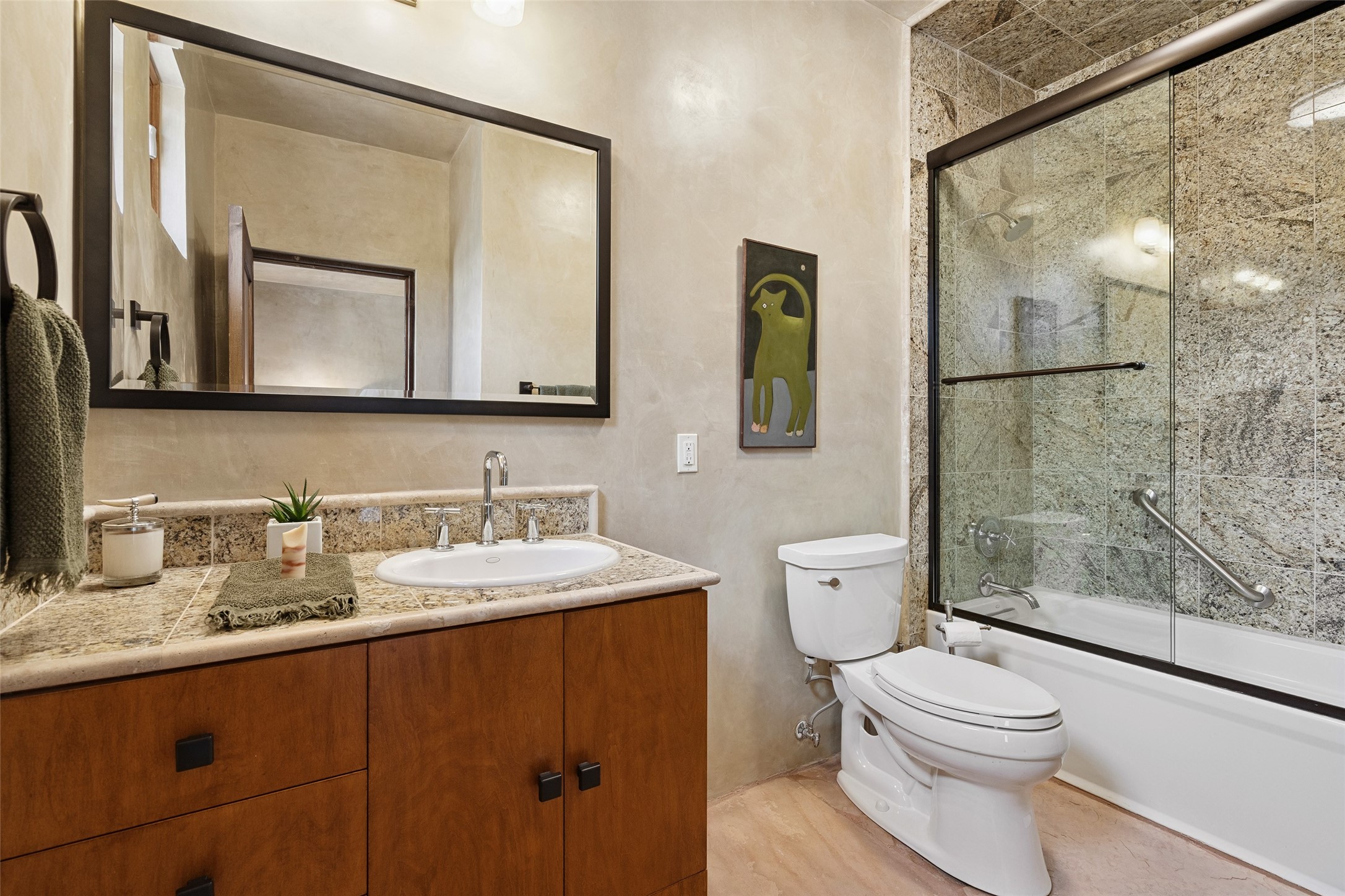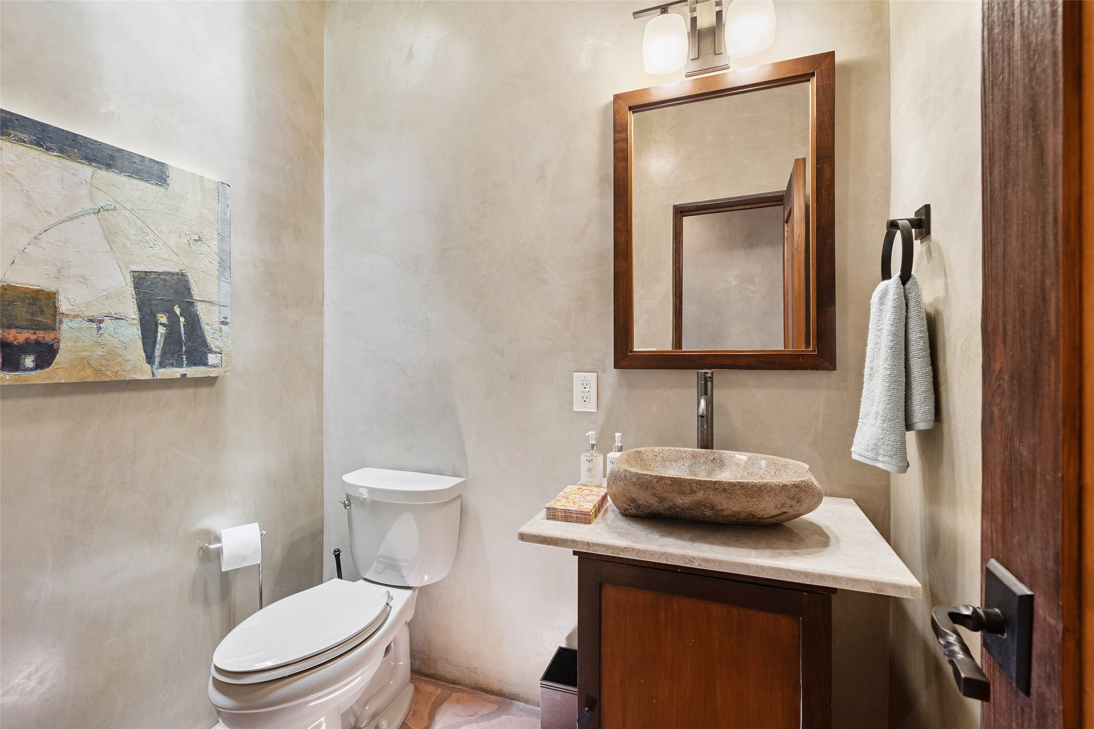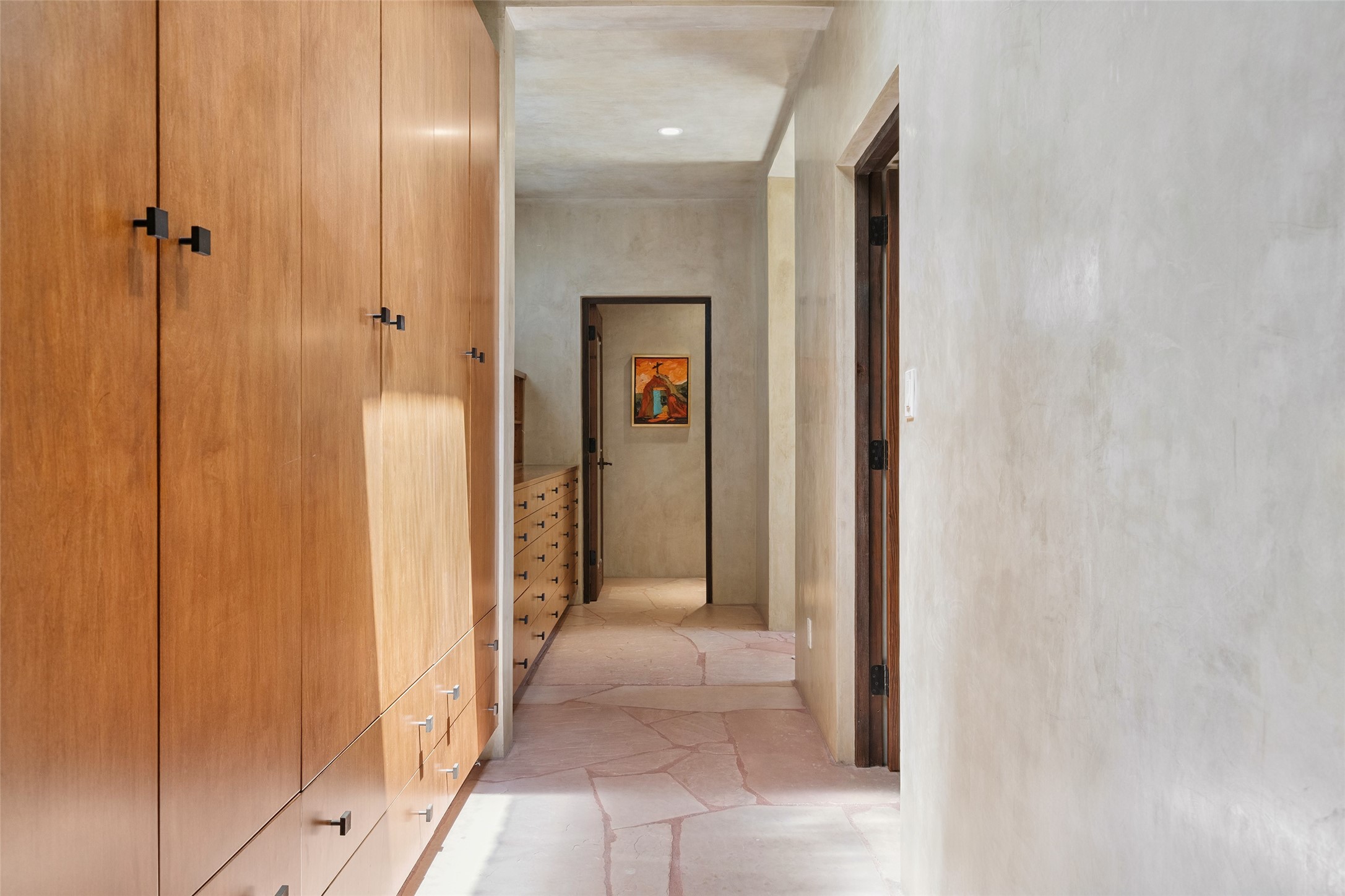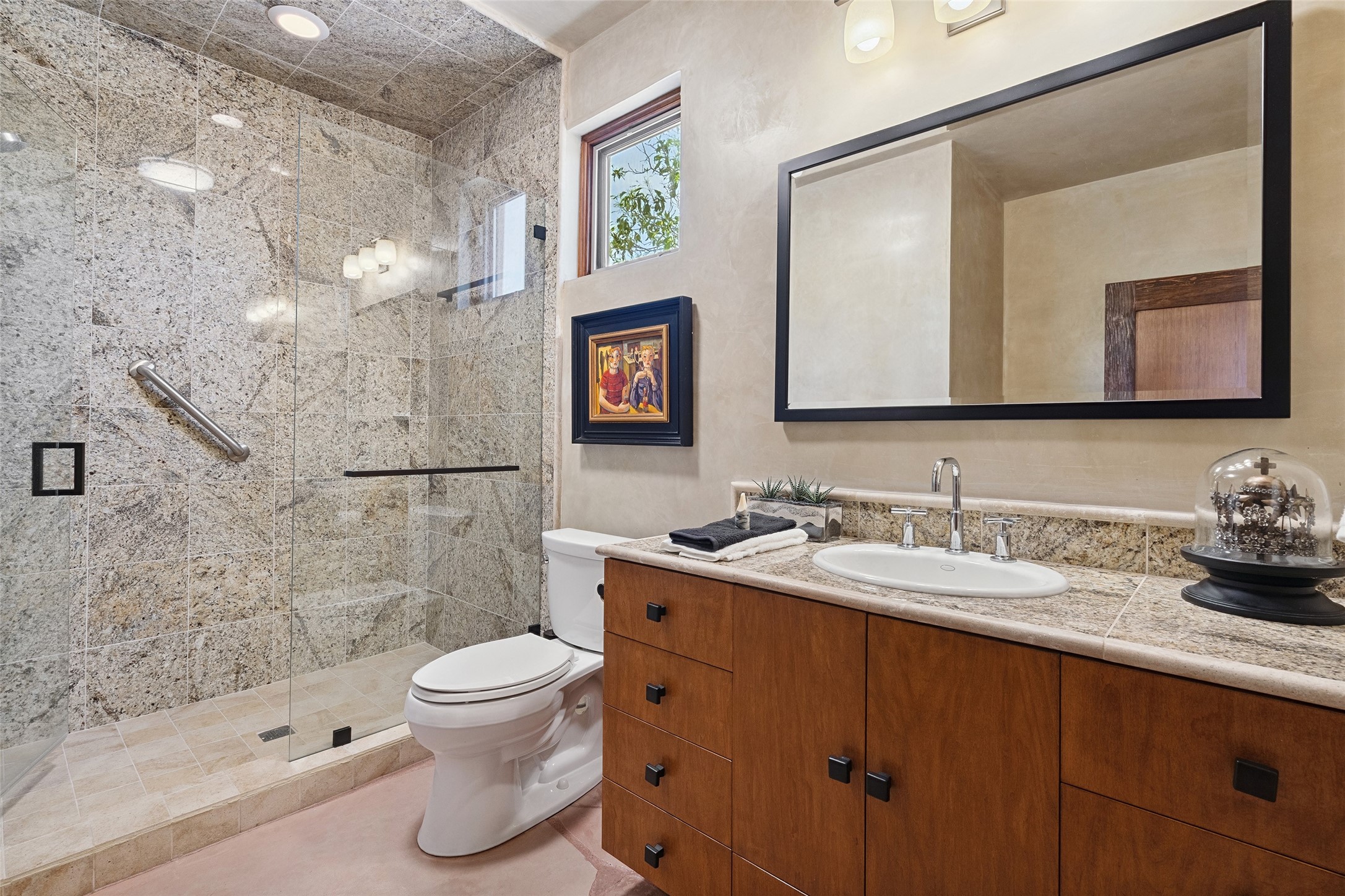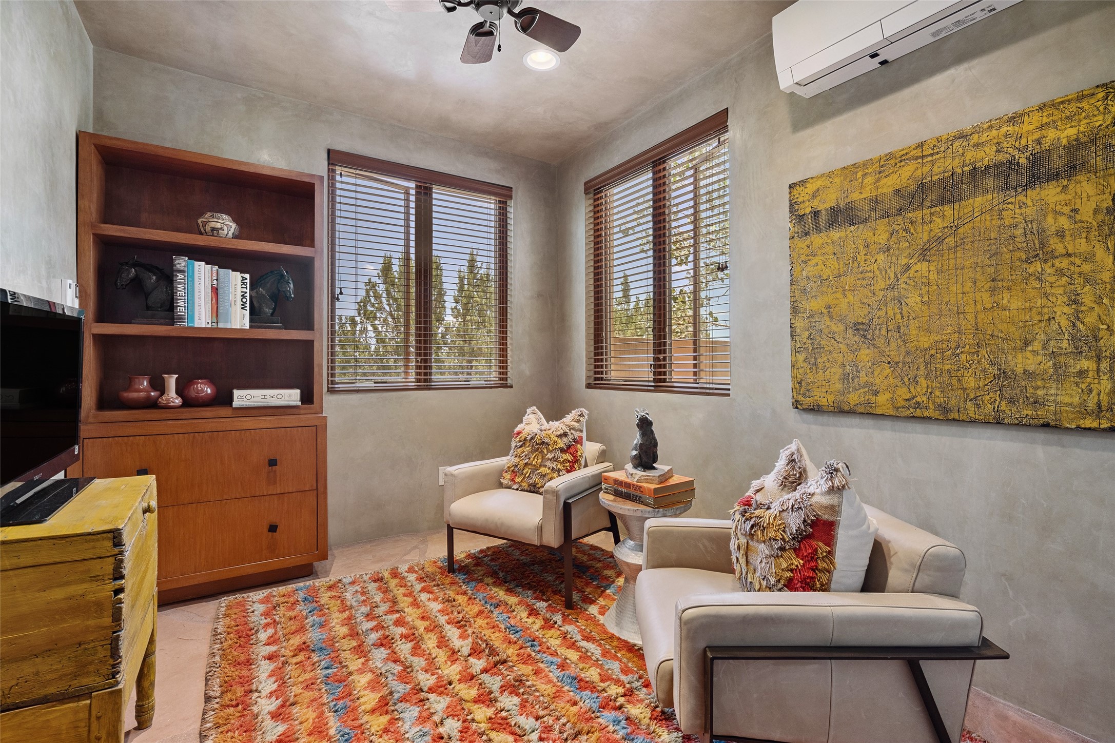 THIS STUNNING SANTA FE STYLE LAS CAMPANAS RESIDENCE CAPTURES SWEEPING WESTERN VIEWS OF THE JEMEZ MOUNTAINS AND SUNSET GOLF COURSE. The home's rich topography is felt throughout, blending beautifully with natural flagstone floors, stacked stone fireplaces, wooden beams, smooth plaster walls, and deep covered portals that epitomize indoor-outdoor New Mexico living and allows you to relax into the dazzling landscape. Designed with clean lines for privacy and flow, the thoughtfully tiered floor plan offers a well-separated two-suite guest wing - complete with art hanging system and laundry - opposite the luxurious primary suite. The heart of the home lies in the expansive living spaces and several large portals, perfect for entertaining or quiet reflection, all while enjoying framed views of nature and sky. Ascend past the office to the serene primary suite featuring its own fireplace, private patio with hot tub access, elegant built-ins, large walk-in closet, plenty of storage, and a spa-like bath with deep soaking tub and grand shower. The kitchen is warm, functional, and beautifully integrated within the undulating colorful mountain views. Here you will find a cook's kitchen with Viking appliances, a Wolf induction cooktop, informal gathering space, a walk-in pantry, and seamless access to both front and rear portals. A separate foyer with a wine fridge, powder room, and a flexible office or reading room adds thoughtful utility and charm. Outdoors, the portals extend the living experience with a kitchen, tranquil gardens, water features, even more storage, and complete privacy. Timeless Santa Fe design, executed to perfection.