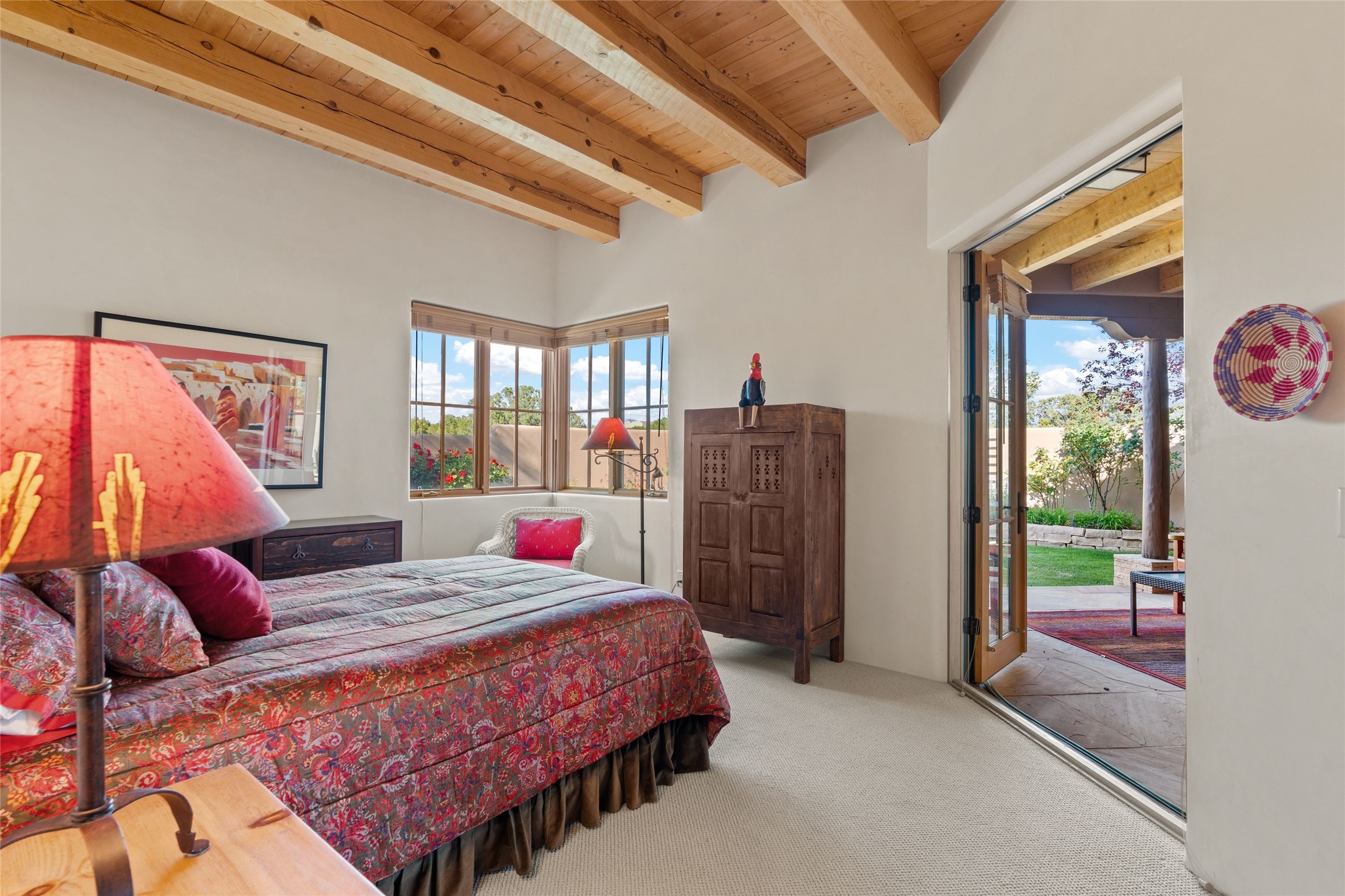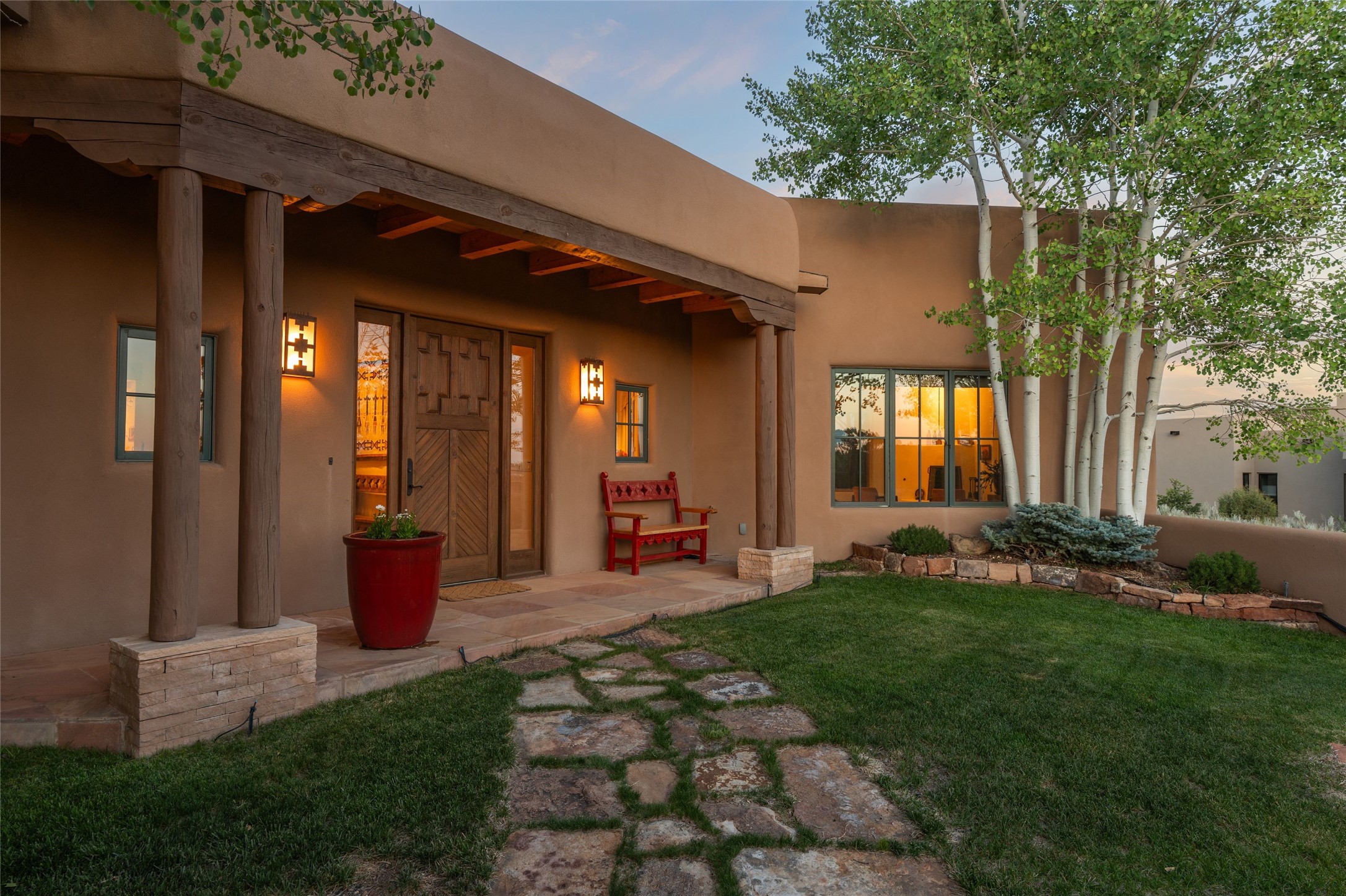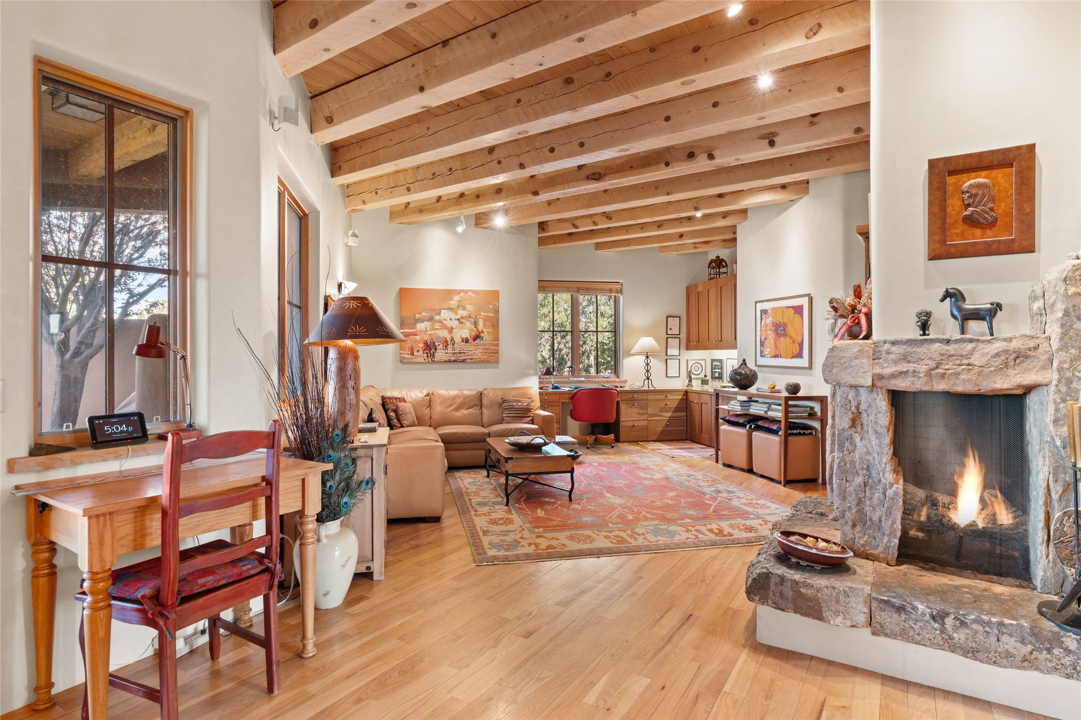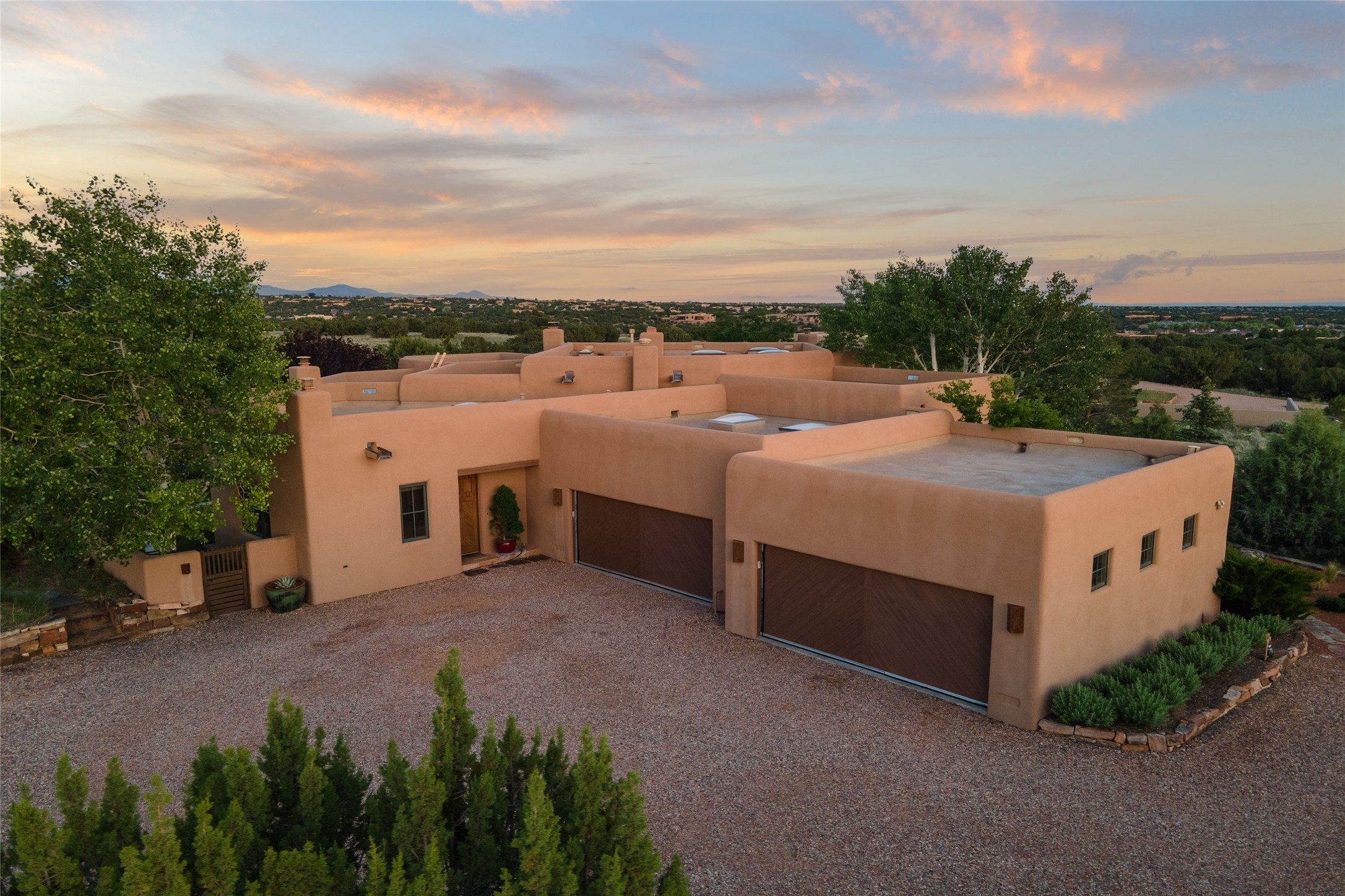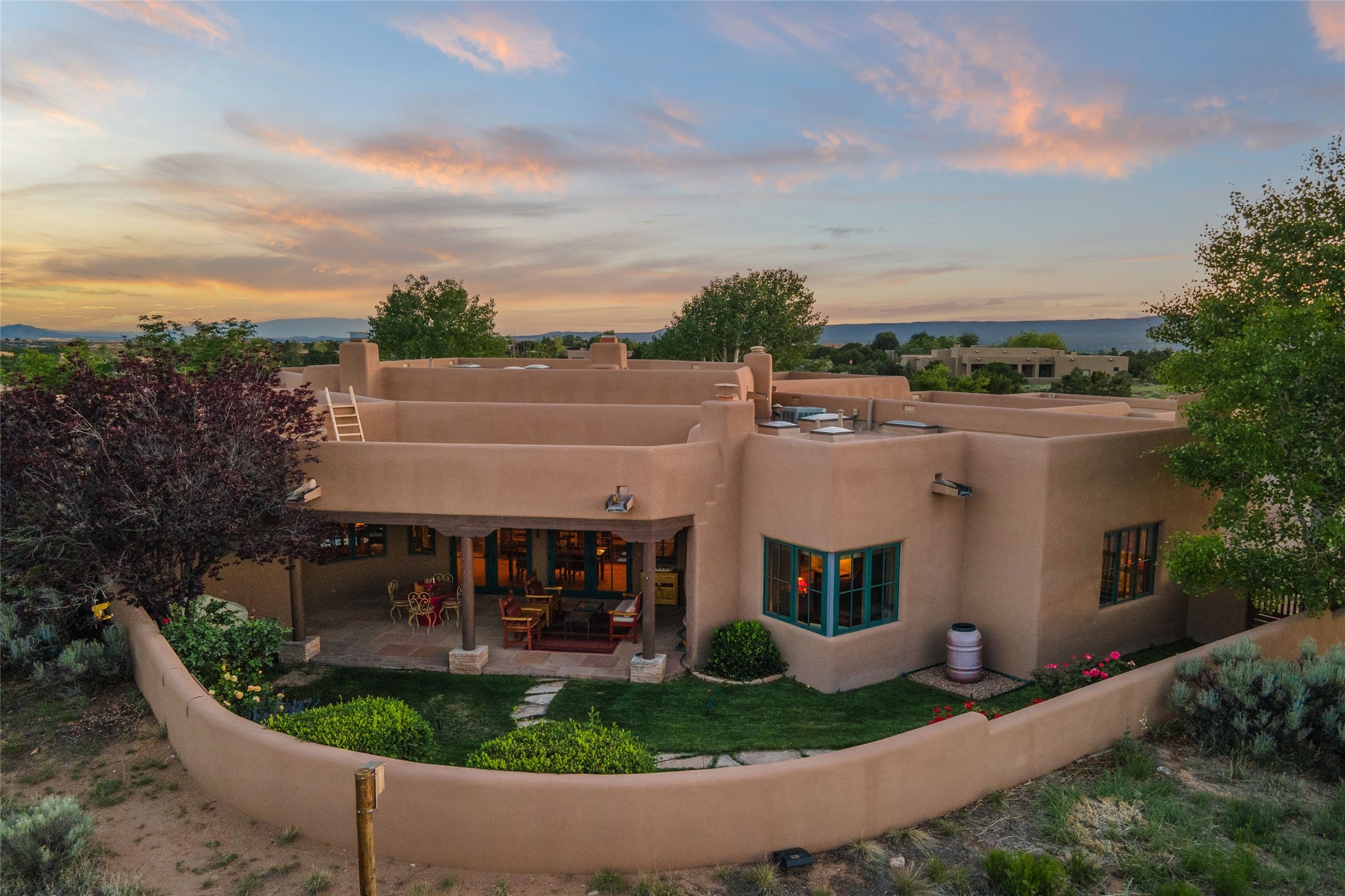 This Soft Contemporary 4-Bedroom / 3.5 Bath, Single-story home with No Steps built by locally-renowned Builder Kim Unger offers a Jemez & Sangre de Cristo View in gated Las Campanas. The Living Room has enough space for a Grand Piano & enjoys a Jemez Mountain view. The adjacent Dining Room showcases a stunning Anasazi-style fireplace & dramatic soaring ceiling. The Kitchen has stainless appliances, a large eating bar for socializing as well as an easy transition to the casual dining area with wet bar for entertaining. The nearby Family Room has a hand-built rock fireplace, TV / Media area & convenient built-in desk. The Main Suite includes a kiva fireplace, retreat area & a walk-in closet worthy of a retail establishment. The Main Bath offers a generously-sized soaking tub, walk-in shower, two-sink vanity & access to a private portal area. Three additional bedrooms provide ample space for friends & family to stay, one with an en-suite bath and another with a microwave, sink, under-counter refrigerator & outside entrance. Two adjoining 2-car garages provide a multitude of choices - Art Studio, Wood Shop, Work-Out area or space for that special collectible car. The spacious outdoor area includes a shaded portal area with wood-burning kiva fireplace, water feature, refreshing green grass lawn area, plus a spacious roof deck with 360-degree Mountain Views. This fabulous single-story home with No Steps checks all the boxes - 4 Bedrooms * Family Room * 3 Baths * 4-Car Garage * Roof Deck with 360-degree mountain views - Call for an appointment Today!