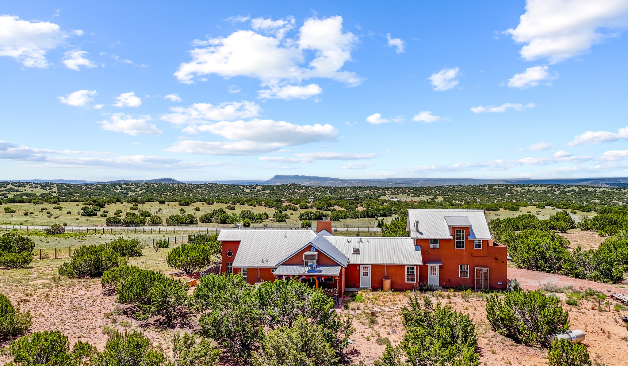 Discover a true work of art, designed and built by the artist who cherished it for 18 years. This private sanctuary sits on 10 acres of serene high-desert landscape just south of Santa Fe. Located off the scenic Turquoise Trail (Hwy 14), the gated property offers commanding views from its high point, showcasing the majestic Sangre de Cristo, Jemez, and Sandia Mountains, as well as Cerro Pelon, the Ortiz Mountains, and the Cerrillos Hills.This move-in ready home masterfully blends a light-filled, soft contemporary feel with the soul of an authentic New Mexican ranch home. The clean, sophisticated design features a pitched metal roof, passive solar principles, and beautiful Saltillo tile floors accented with small decorative tiles.The heart of the home is the great room, boasting vaulted ceilings with exposed beams, and an open concept kitchen, dining, and living area with a fireplace. The kitchen is appointed with stainless appliances and a large island topped with hand-poured concrete countertops.Retreat to the luxurious owner's suite, complete with its own kiva fireplace. The spa-like bathroom is a masterpiece of natural light, featuring stunning floor stones from Brazil, a deep footed tub, a walk-in shower, and hand-poured concrete counters. This private oasis also provides access to a walled patio and an outdoor shower.The second floor reveals a versatile studio, an ideal workspace with durable rubber flooring and a viewing deck that captures spectacular western sunsets over the Jemez and Ortiz Mountains. With views from almost every window and a rainwater catchment system, this 2-bedroom, 2-full-bathroom home is a sophisticated perch offering unmatched solitude and privacy.