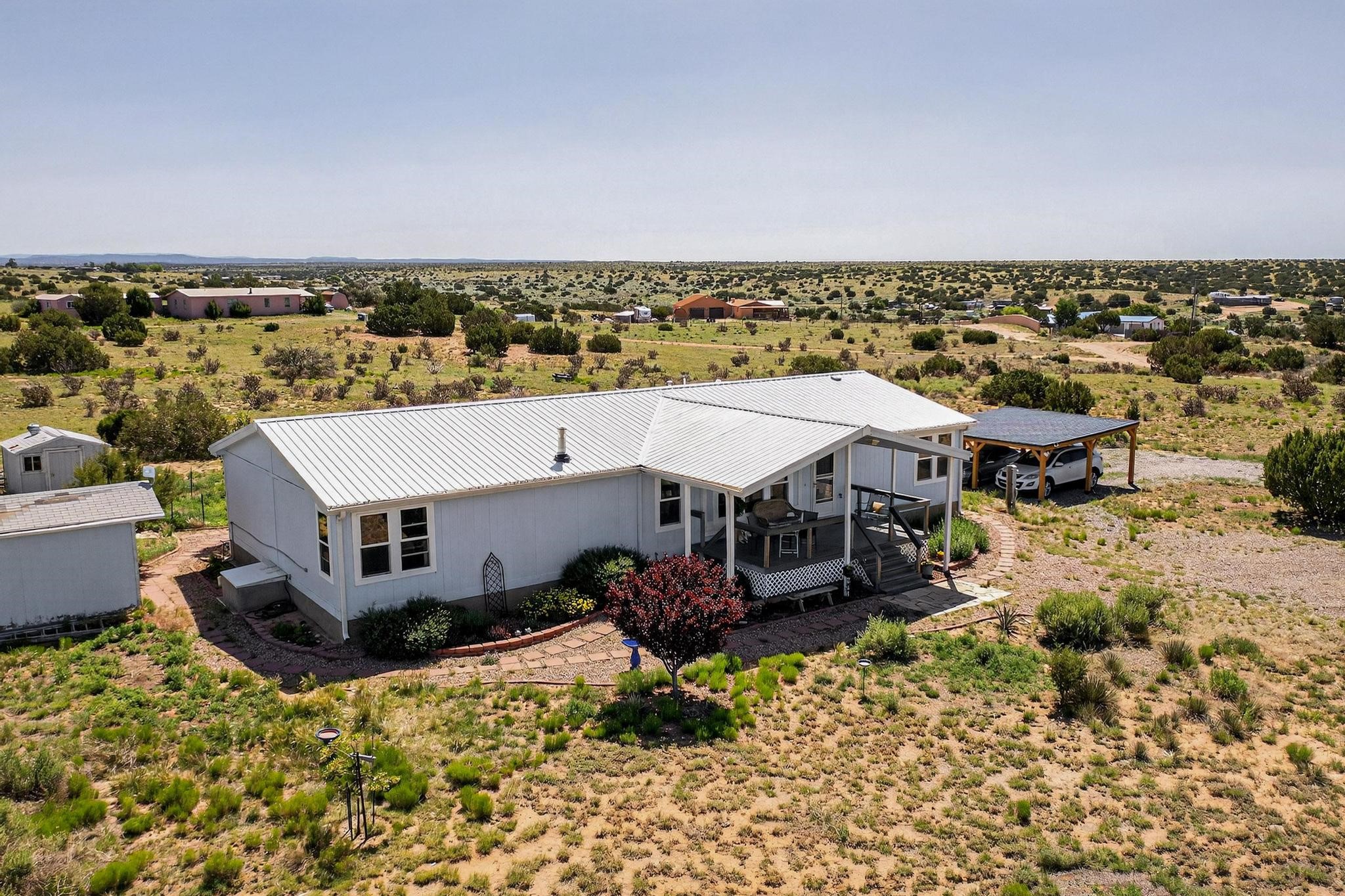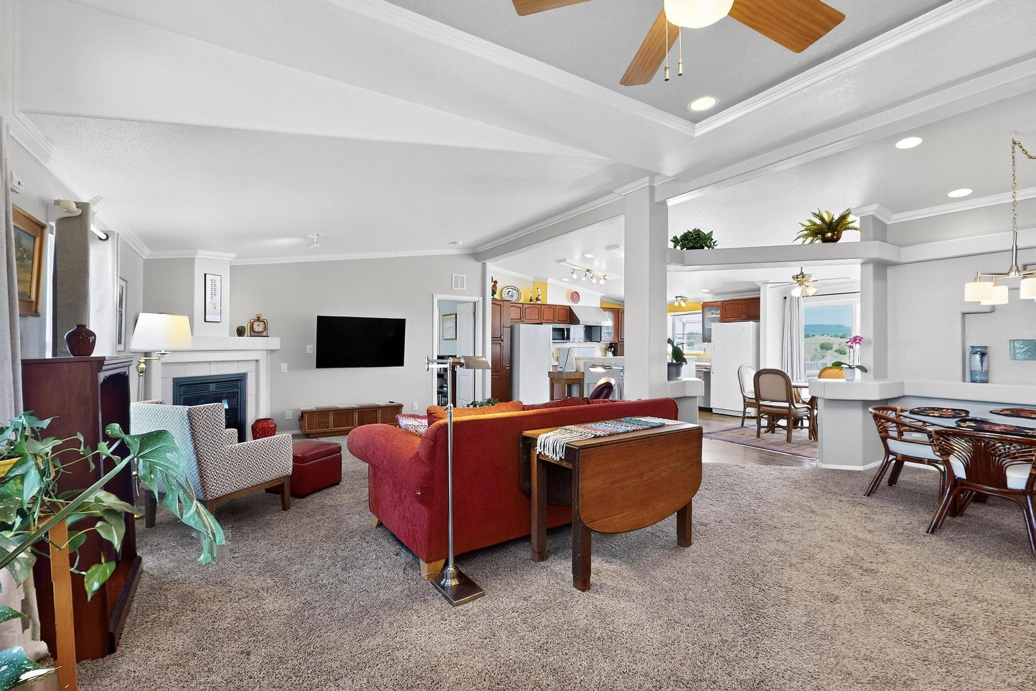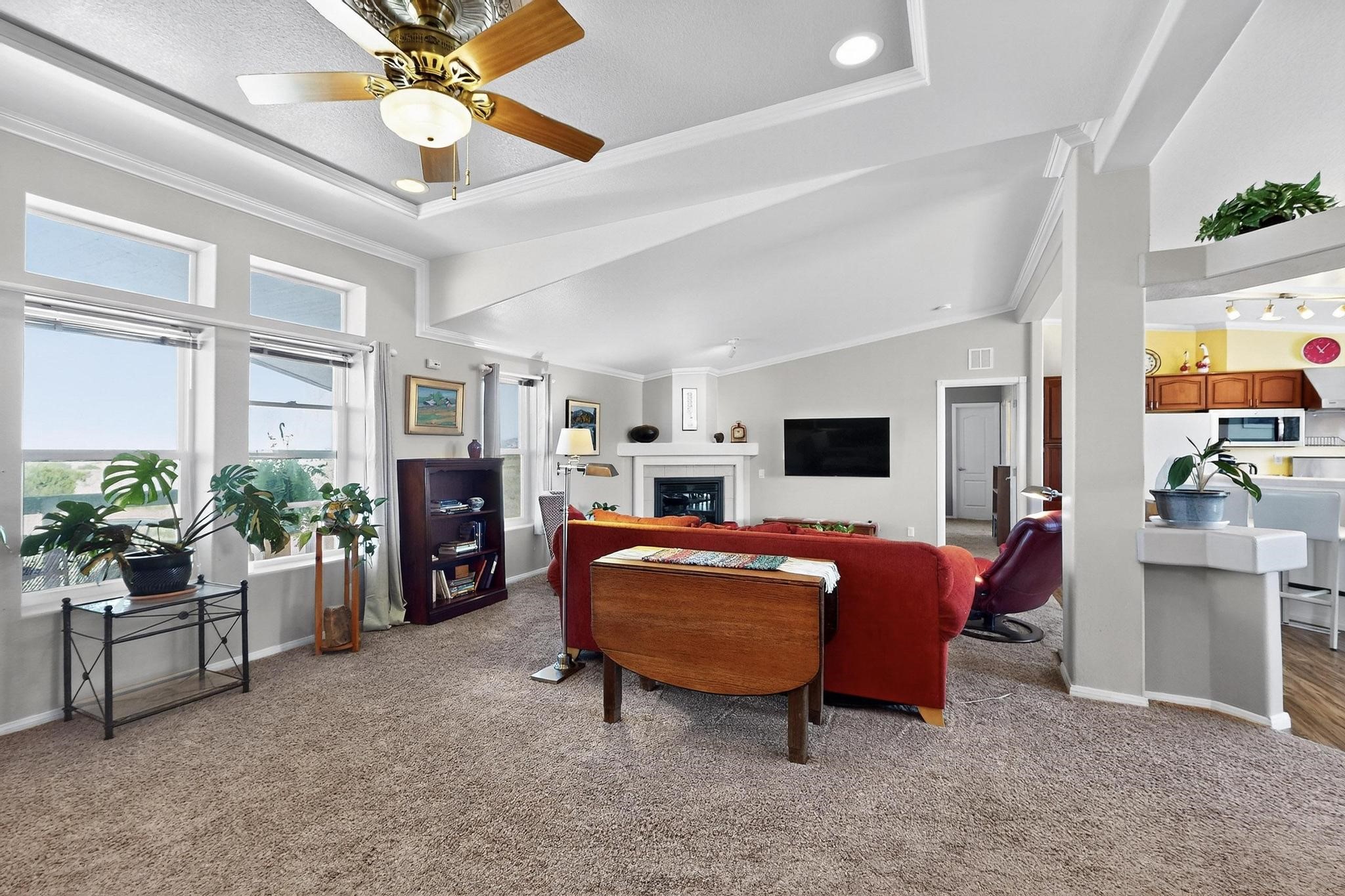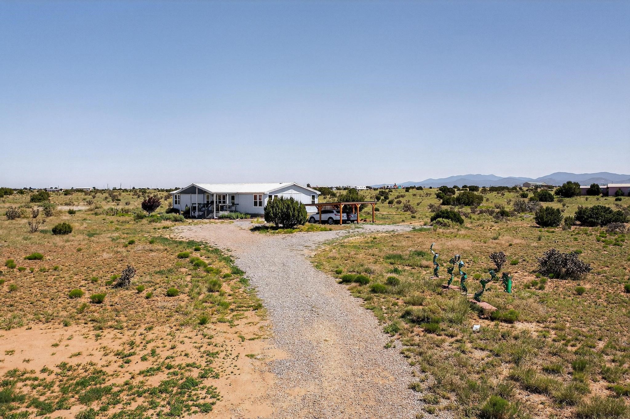 Experience the tranquility of country living on this stunning 6.25-acre property, offering breathtaking views in every direction. This meticulously maintained manufactured home features three bedrooms and two full bathrooms. Enjoy the comfort of central air conditioning, an open floor plan perfect for gatherings, and a cozy gas fireplace. The primary bedroom suite is thoughtfully separated for privacy and includes a luxurious oversized soaking tub and bidet. The kitchen is well-appointed with stainless steel appliances and a bar top, ideal for entertaining. A recently added custom carport provides welcome shade. Schedule an appointment to see this beautiful property today!