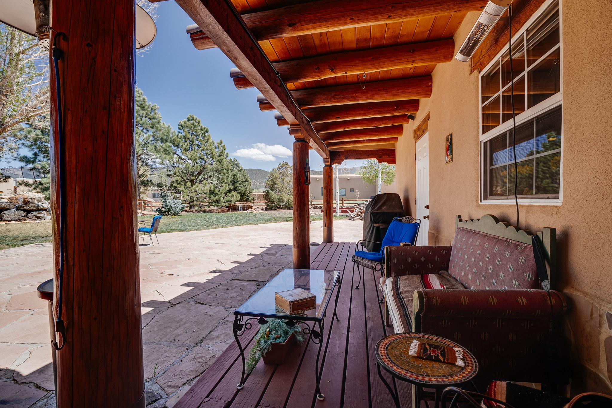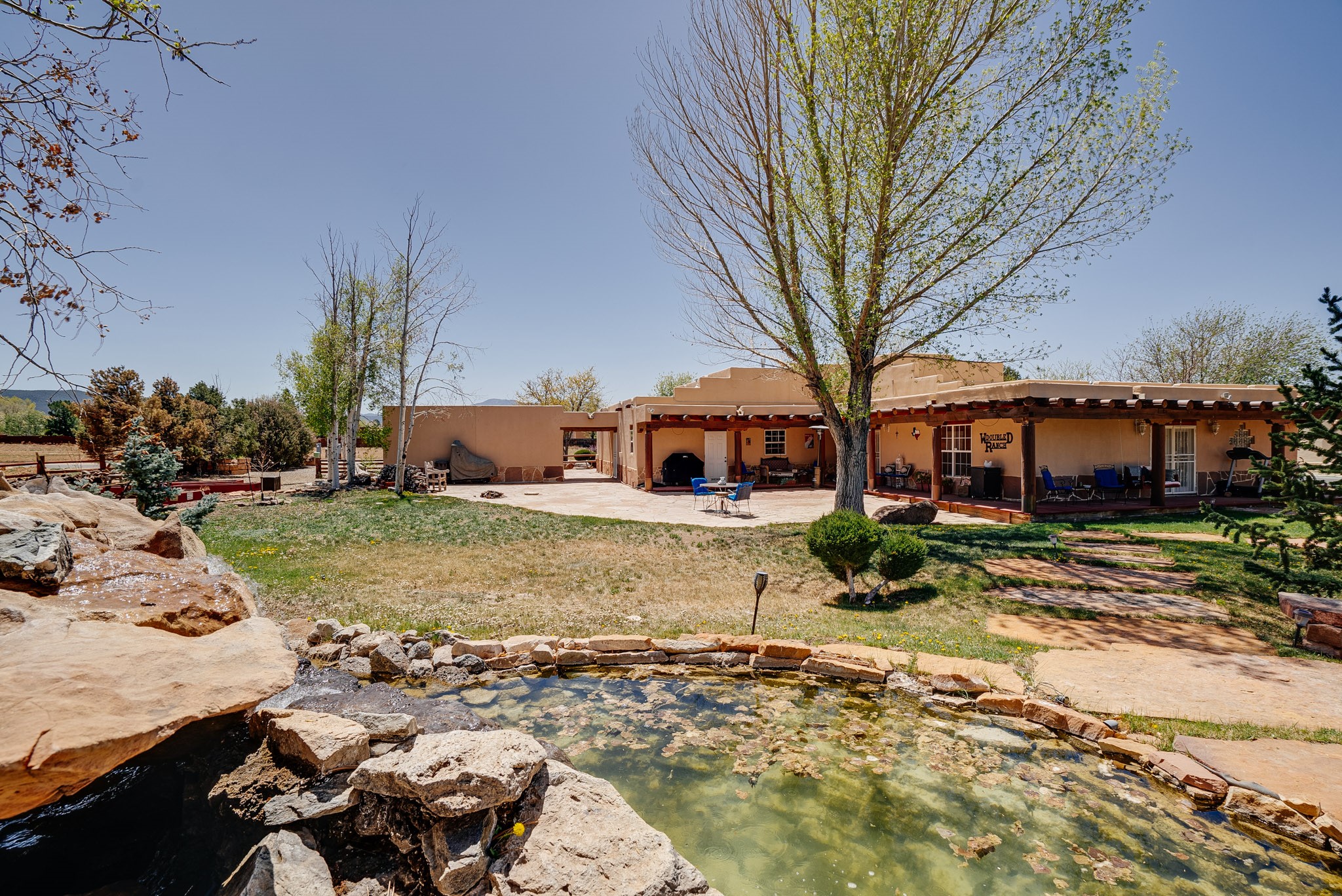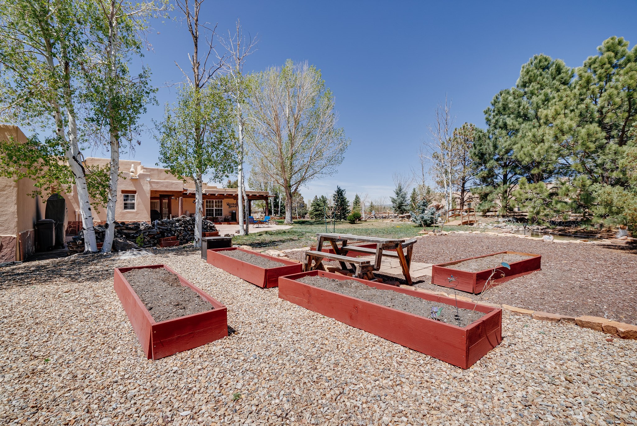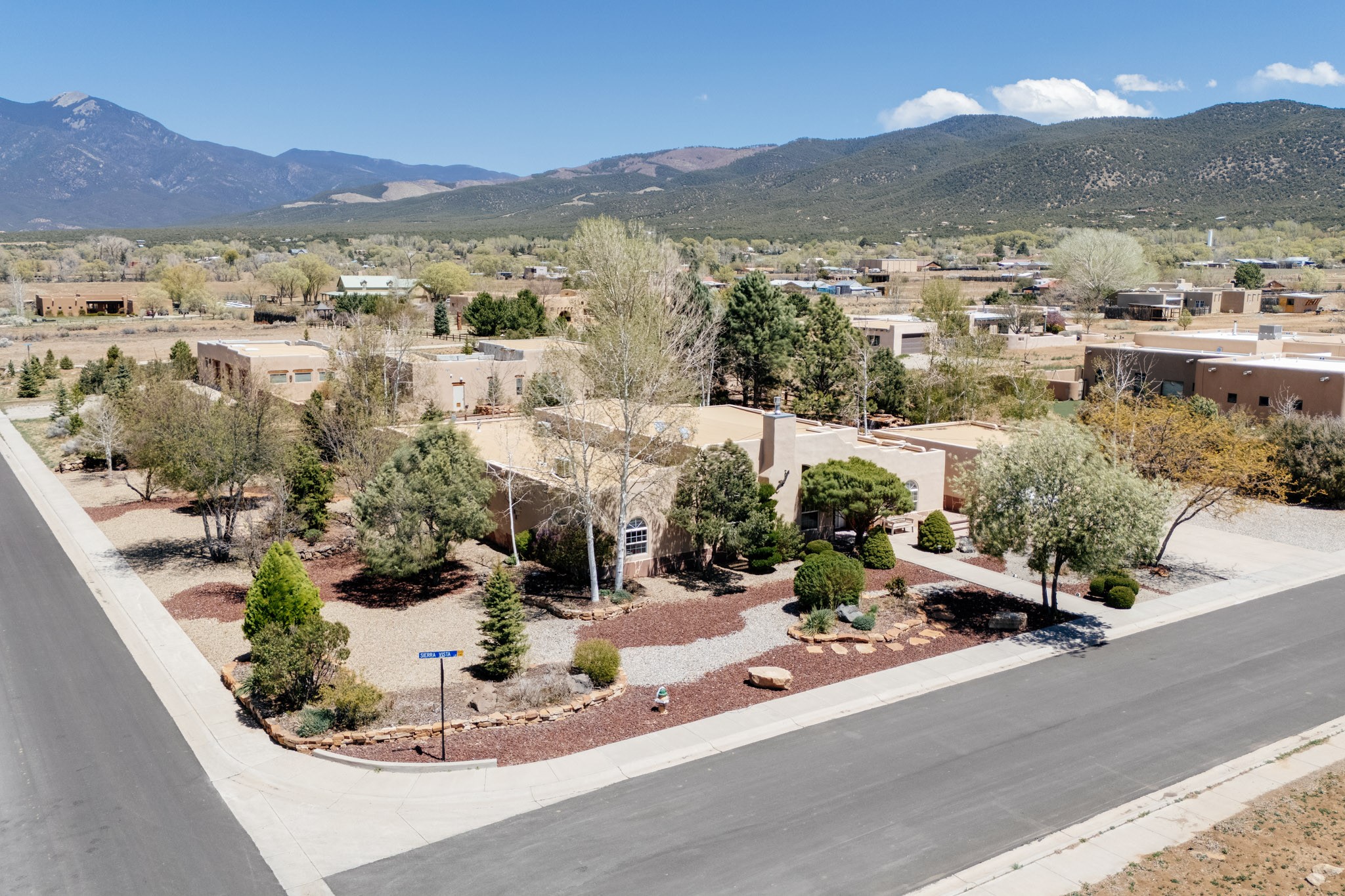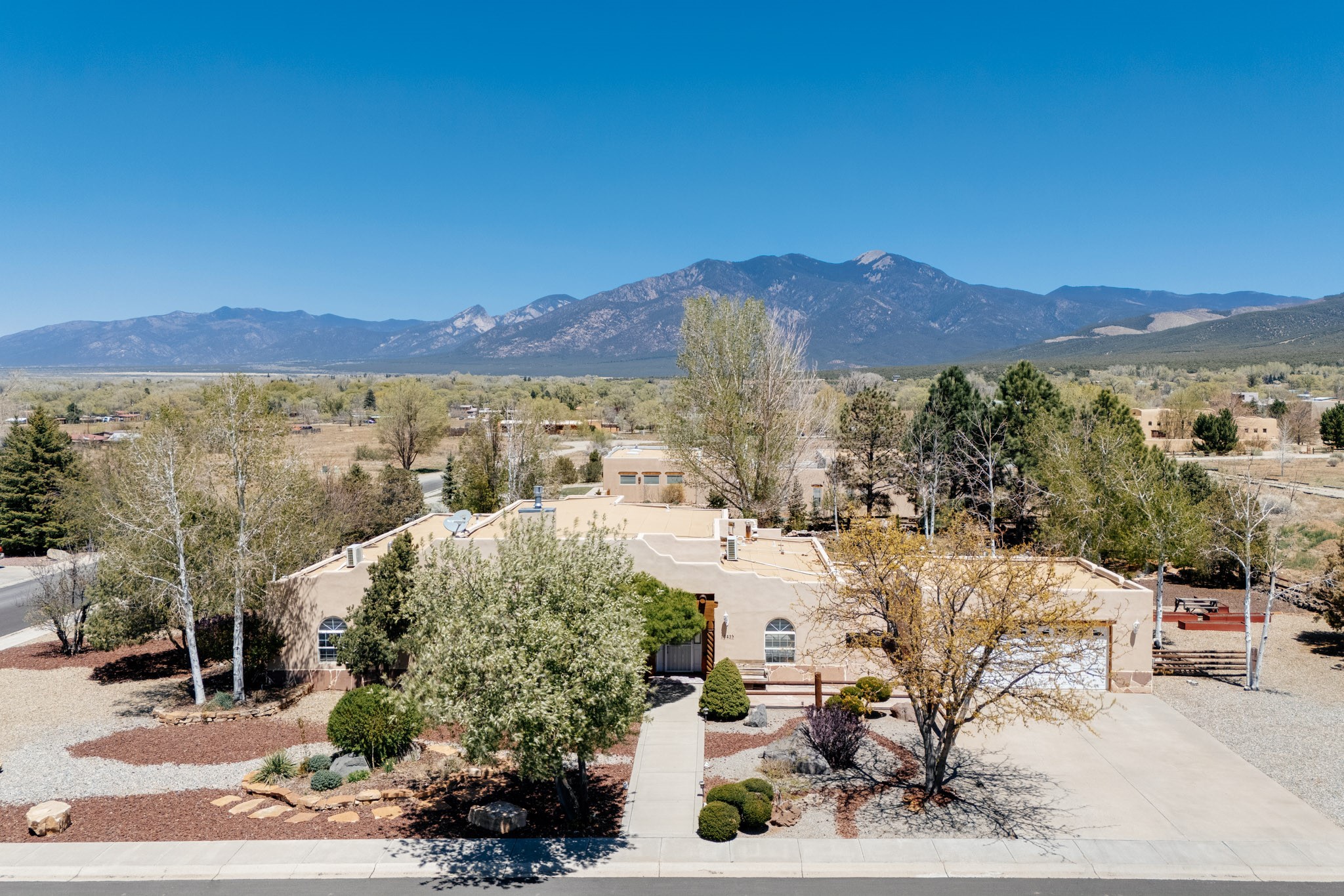 Discover this spacious 4-bedroom, 3-bathroom home offering 3,400 square feet of comfort, style, and Southwestern charm -- all nestled in the desirable Vegas De Taos subdivision. Enjoy the convenience of an in-town location with the tranquility of a secluded .68-acre lot, complete with paved roads, sidewalks, and mature landscaping. This special neighborhood offers so much, including a strong sense of community. The beautifully landscaped property features multiple water features, lush grass, raised garden beds, and a stunning assortment of trees -- including mature conifers, deciduous, and fruit trees. Relax under big blue skies with breathtaking mountain views, and enjoy the easy-care xeriscaping in the front and lush backyard oasis in the rear. Thoughtfully designed rock walls and wooden fences create a variety of distinct, inviting outdoor spaces.The home's grand great room welcomes you with 14' vaulted ceilings, custom woodwork, and radiant floor heating, complemented by efficient split units for year-round comfort. French doors off the dining area open to a spacious covered veranda -- perfect for entertaining or quiet evenings. The kitchen is a dream with stainless steel appliances, a double oven, a smooth-surface cooktop on the island, a 3-basin sink, and an expansive island that seats up to eight. Host family gatherings in the formal dining room or enjoy casual meals around the island.The west wing offers two bright guest bedrooms, a large full bathroom, and a luxurious master suite featuring hickory Pergo flooring, a sitting area or office nook, a whirlpool tub, separate shower, and extra-large walk-in closet. The east wing includes another spacious bedroom, guest bathroom, large pantry, hall closet, and a laundry room leading to the covered breezeway and detached two-car garage.Minutes from downtown Taos, the hospital, and grocery stores, this home offers the perfect blend of convenience, space, and a true homestead feel -- a rare find in Taos!