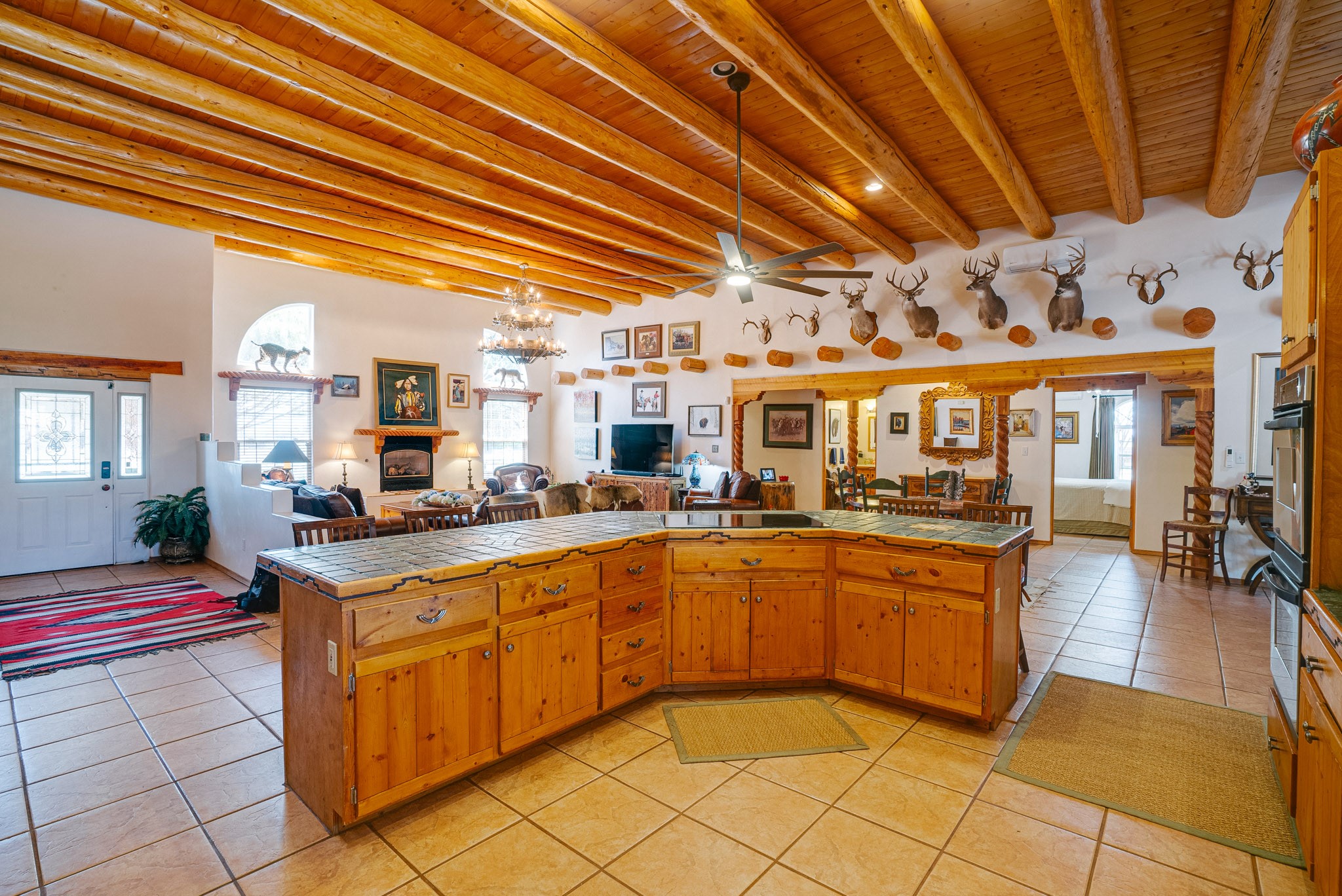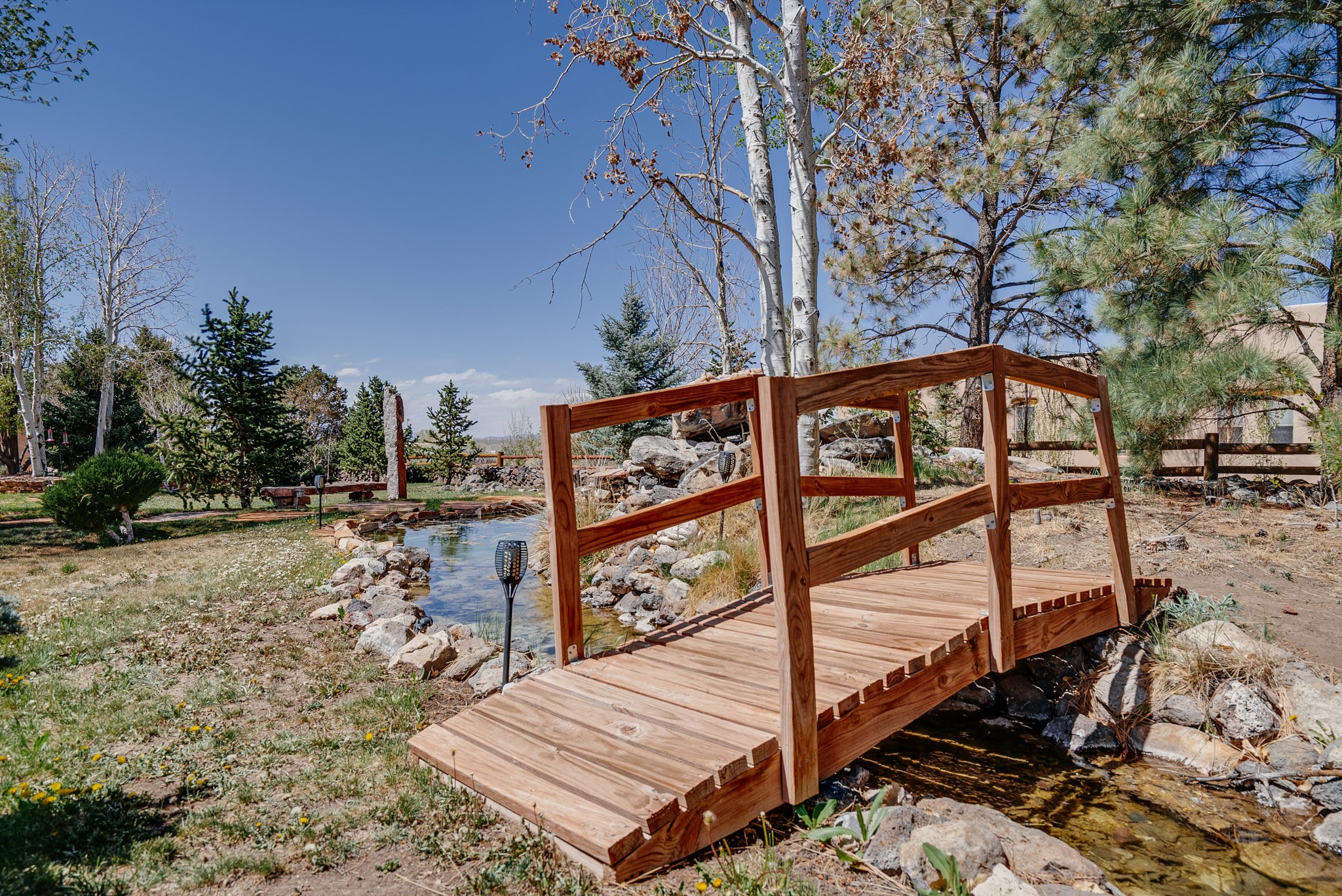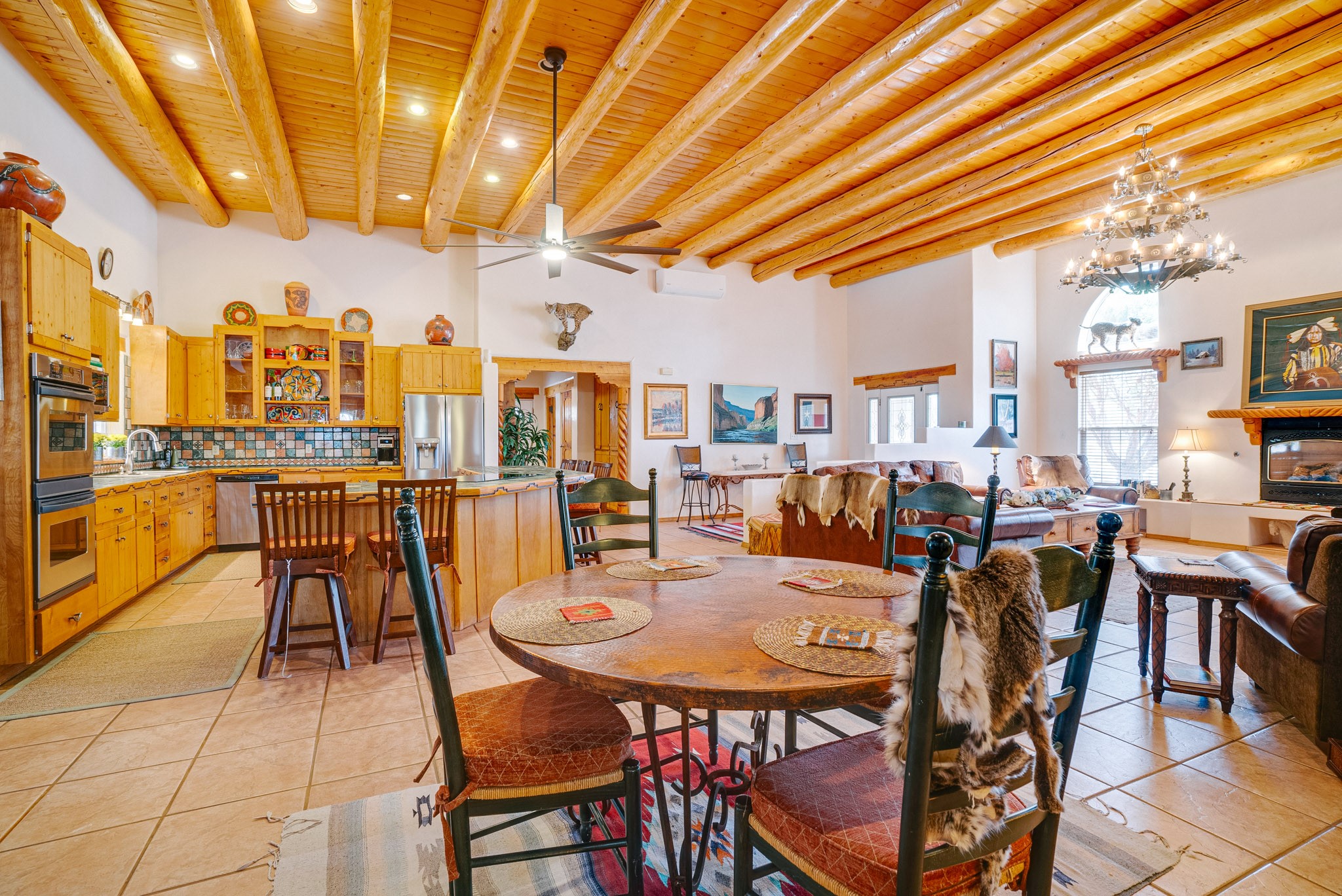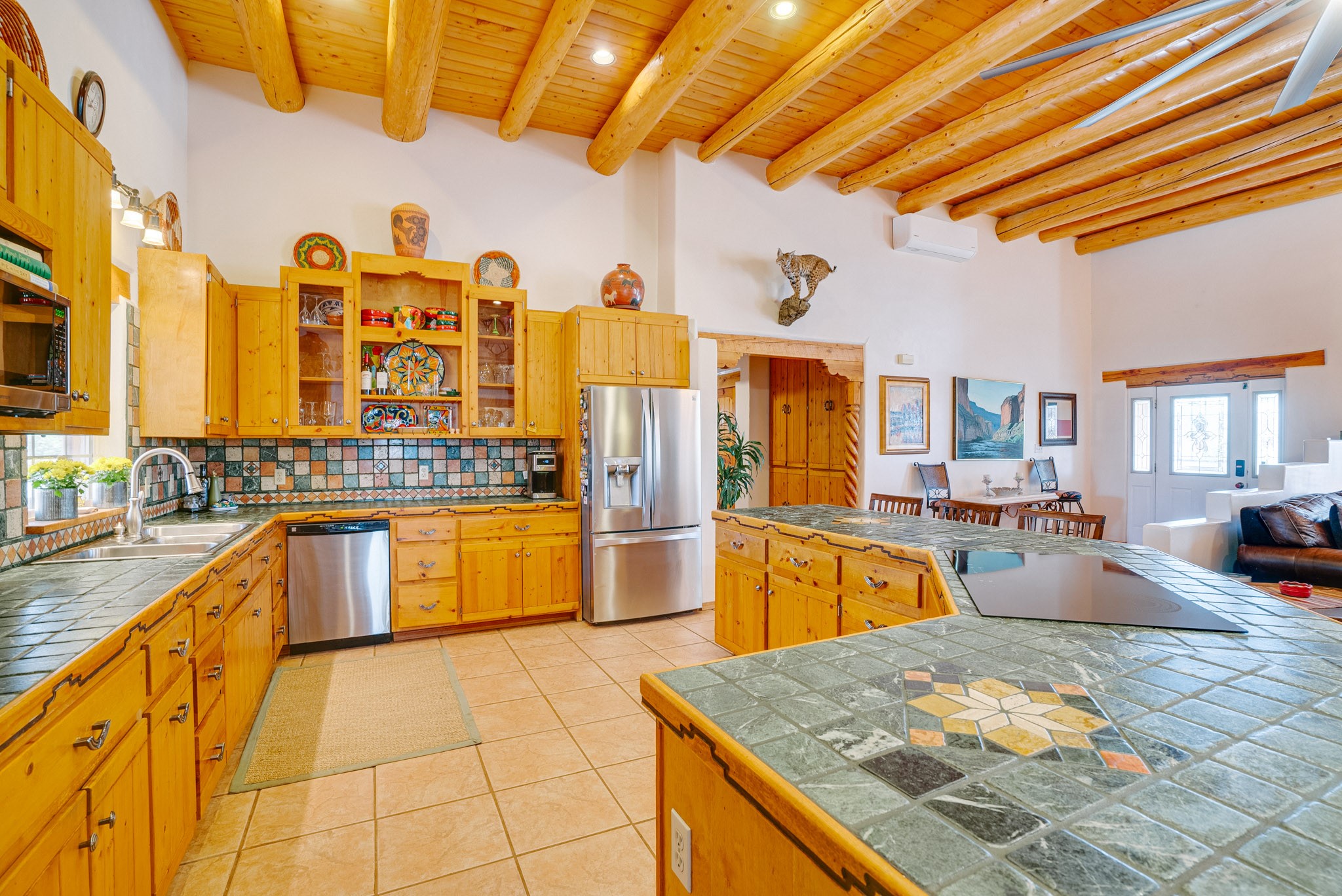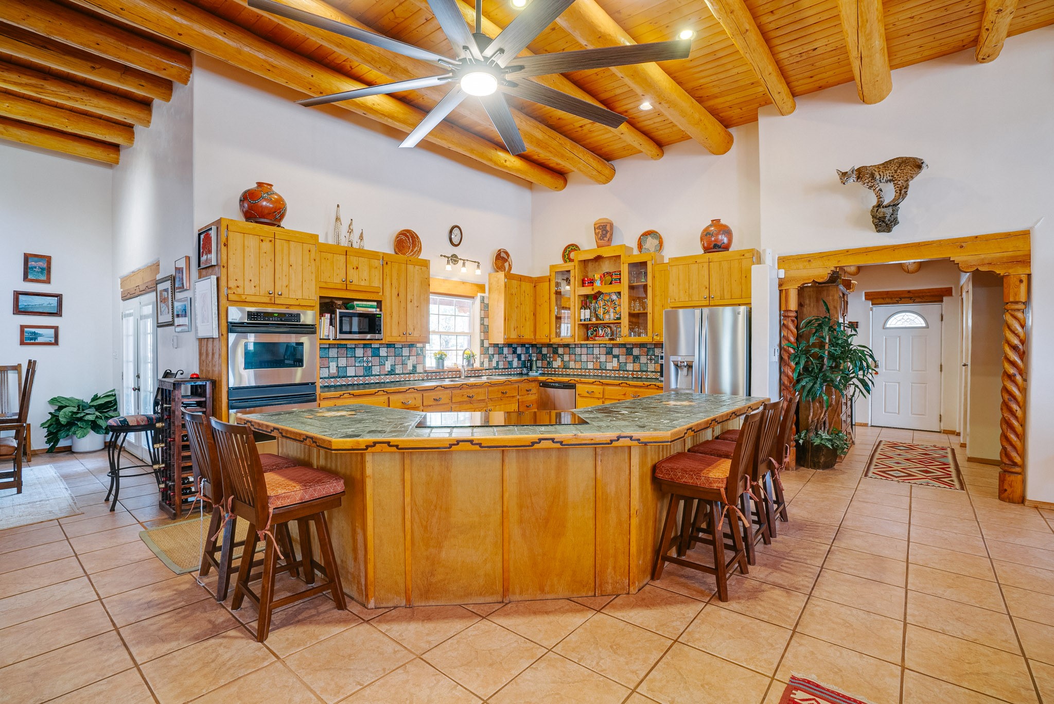 Discover this spacious 4-bedroom, 3-bathroom home offering 3,400 square feet of comfort, style, and Southwestern charm -- all nestled in the desirable Vegas De Taos subdivision. Enjoy the convenience of an in-town location with the tranquility of a secluded .68-acre lot, complete with paved roads, sidewalks, and mature landscaping. This special neighborhood offers so much, including a strong sense of community. The beautifully landscaped property features multiple water features, lush grass, raised garden beds, and a stunning assortment of trees -- including mature conifers, deciduous, and fruit trees. Relax under big blue skies with breathtaking mountain views, and enjoy the easy-care xeriscaping in the front and lush backyard oasis in the rear. Thoughtfully designed rock walls and wooden fences create a variety of distinct, inviting outdoor spaces.The home's grand great room welcomes you with 14' vaulted ceilings, custom woodwork, and radiant floor heating, complemented by efficient split units for year-round comfort. French doors off the dining area open to a spacious covered veranda -- perfect for entertaining or quiet evenings. The kitchen is a dream with stainless steel appliances, a double oven, a smooth-surface cooktop on the island, a 3-basin sink, and an expansive island that seats up to eight. Host family gatherings in the formal dining room or enjoy casual meals around the island.The west wing offers two bright guest bedrooms, a large full bathroom, and a luxurious master suite featuring hickory Pergo flooring, a sitting area or office nook, a whirlpool tub, separate shower, and extra-large walk-in closet. The east wing includes another spacious bedroom, guest bathroom, large pantry, hall closet, and a laundry room leading to the covered breezeway and detached two-car garage.Minutes from downtown Taos, the hospital, and grocery stores, this home offers the perfect blend of convenience, space, and a true homestead feel -- a rare find in Taos!