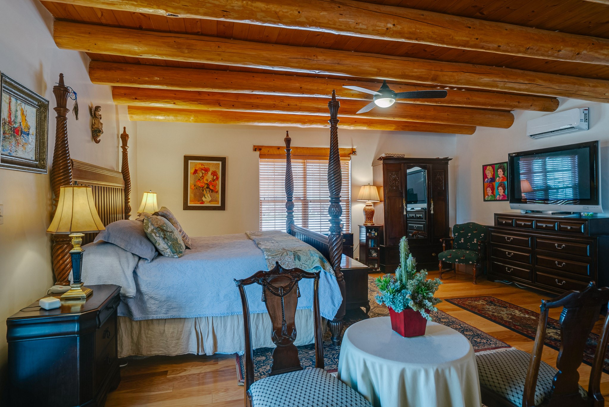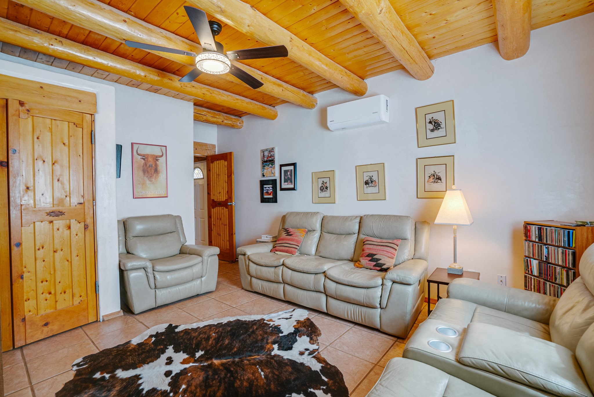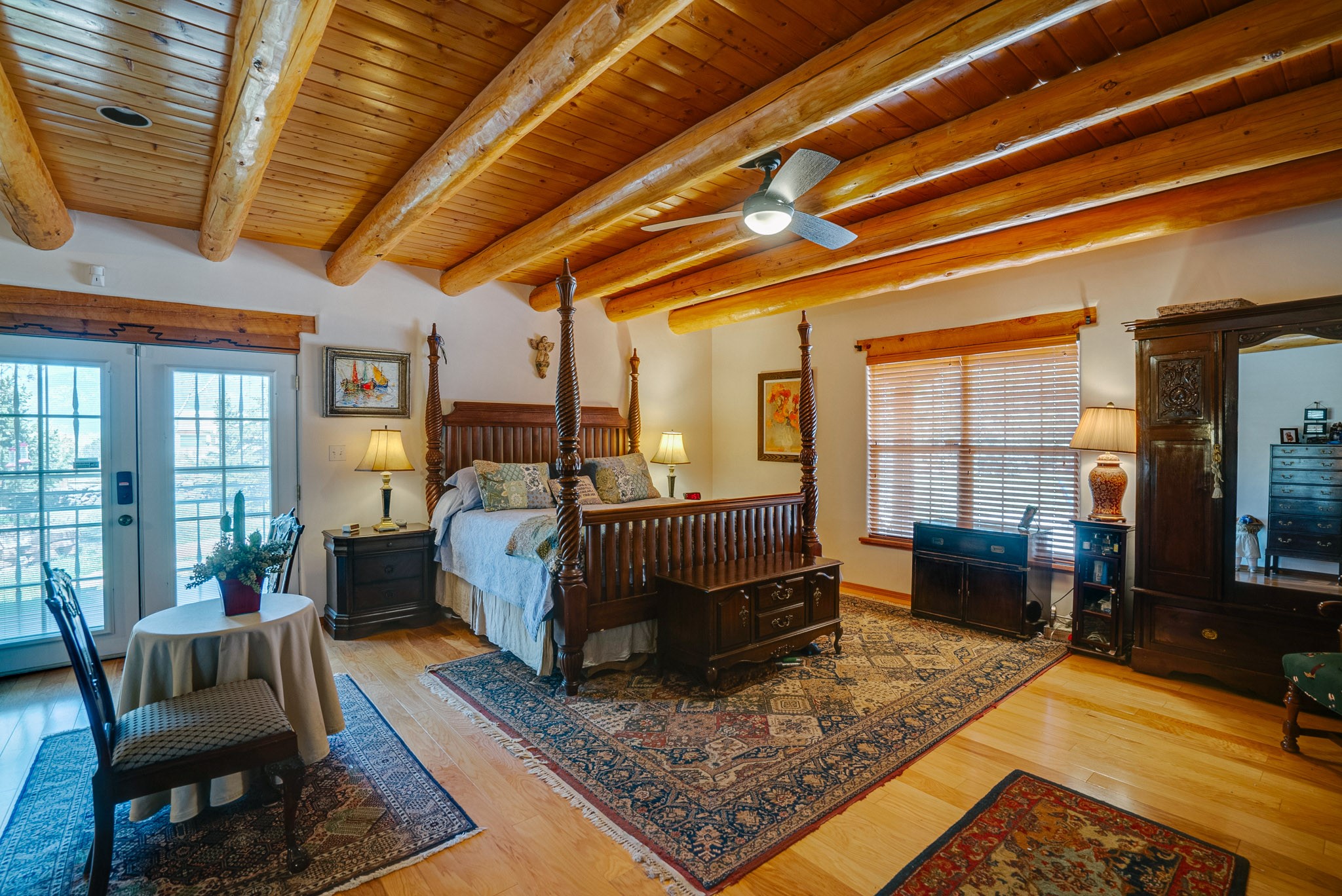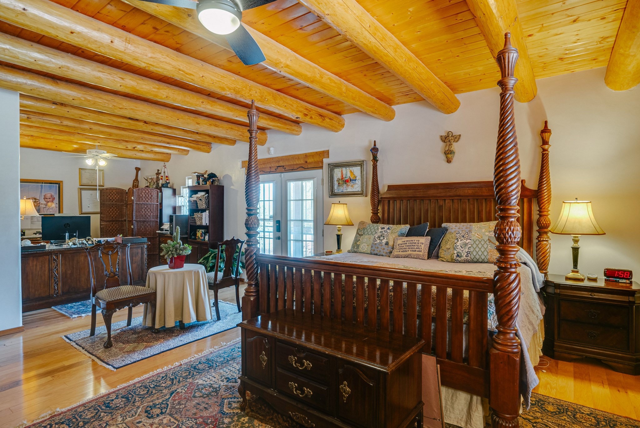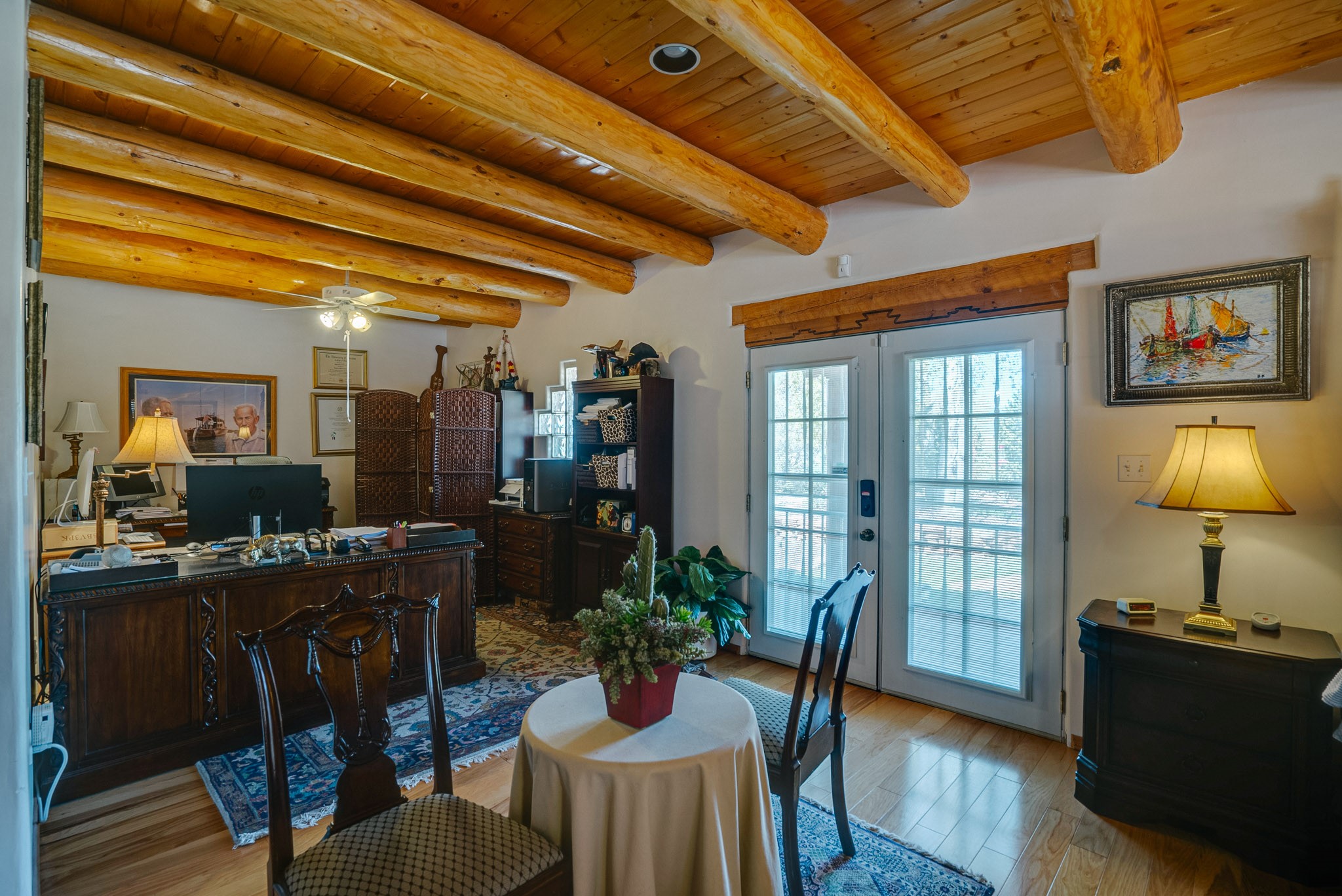Discover this spacious 4-bedroom, 3-bathroom home offering 3,400 square feet of comfort, style, and Southwestern charm -- all nestled in the desirable Vegas De Taos subdivision. Enjoy the convenience of an in-town location with the tranquility of a secluded .68-acre lot, complete with paved roads, sidewalks, and mature landscaping. This special neighborhood offers so much, including a strong sense of community. The beautifully landscaped property features multiple water features, lush grass, raised garden beds, and a stunning assortment of trees -- including mature conifers, deciduous, and fruit trees. Relax under big blue skies with breathtaking mountain views, and enjoy the easy-care xeriscaping in the front and lush backyard oasis in the rear. Thoughtfully designed rock walls and wooden fences create a variety of distinct, inviting outdoor spaces.The home's grand great room welcomes you with 14' vaulted ceilings, custom woodwork, and radiant floor heating, complemented by efficient split units for year-round comfort. French doors off the dining area open to a spacious covered veranda -- perfect for entertaining or quiet evenings. The kitchen is a dream with stainless steel appliances, a double oven, a smooth-surface cooktop on the island, a 3-basin sink, and an expansive island that seats up to eight. Host family gatherings in the formal dining room or enjoy casual meals around the island.The west wing offers two bright guest bedrooms, a large full bathroom, and a luxurious master suite featuring hickory Pergo flooring, a sitting area or office nook, a whirlpool tub, separate shower, and extra-large walk-in closet. The east wing includes another spacious bedroom, guest bathroom, large pantry, hall closet, and a laundry room leading to the covered breezeway and detached two-car garage.Minutes from downtown Taos, the hospital, and grocery stores, this home offers the perfect blend of convenience, space, and a true homestead feel -- a rare find in Taos!