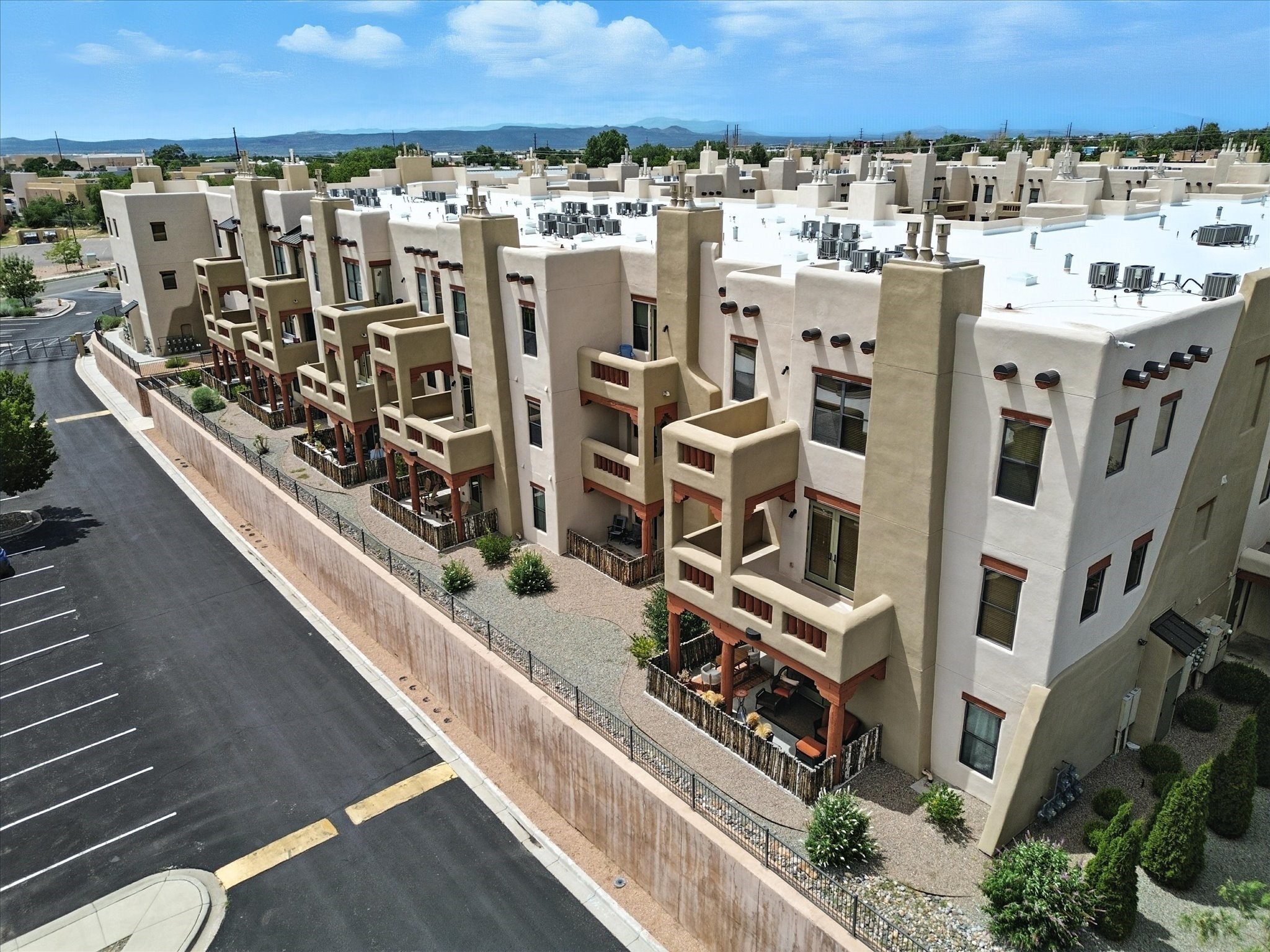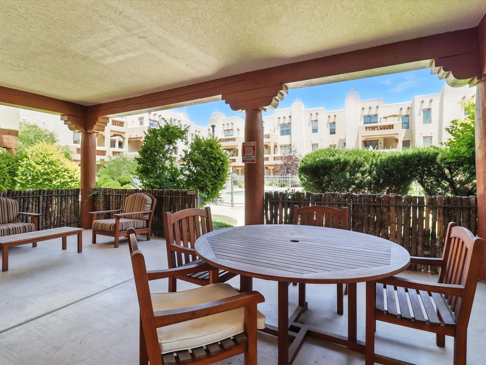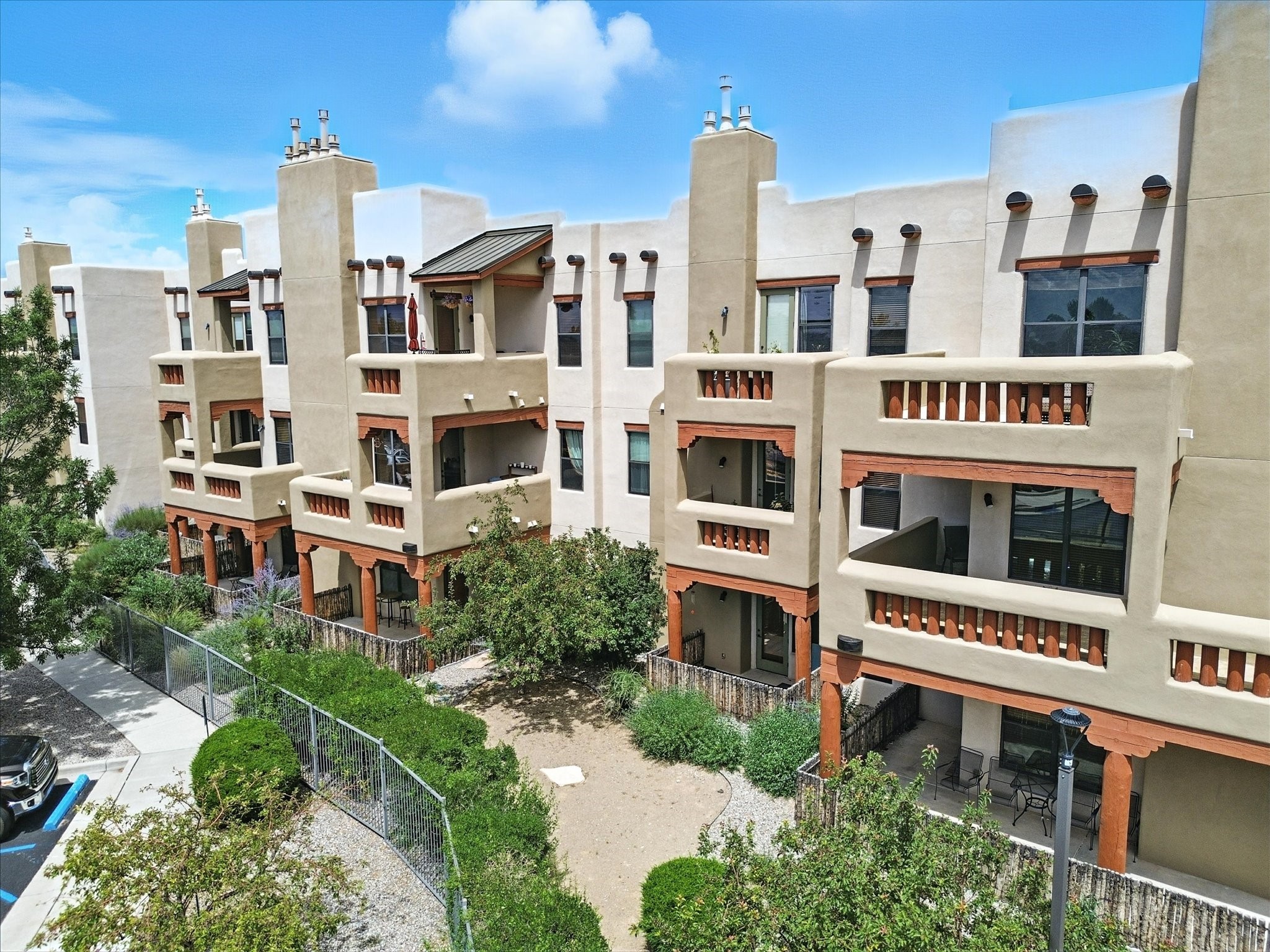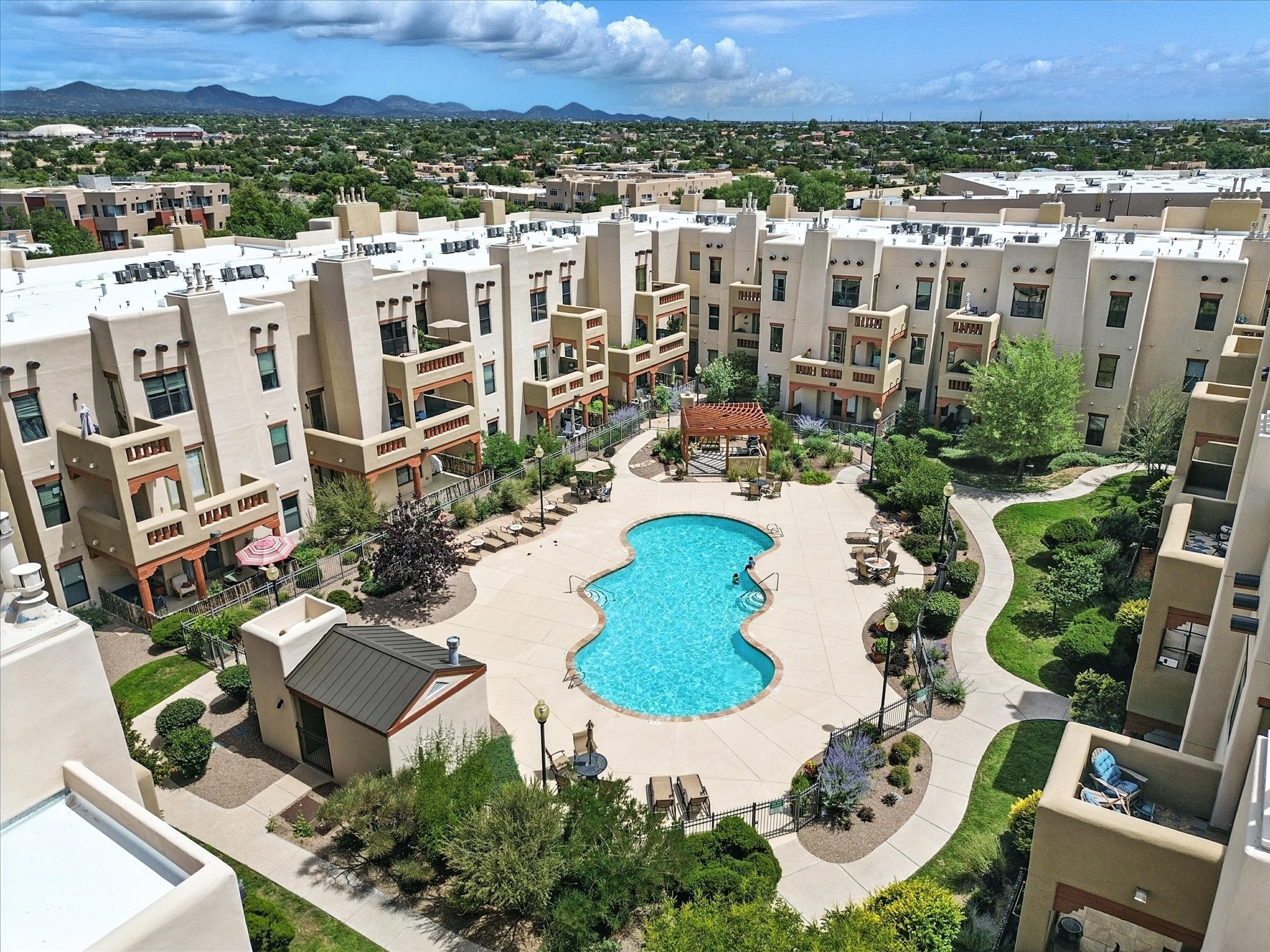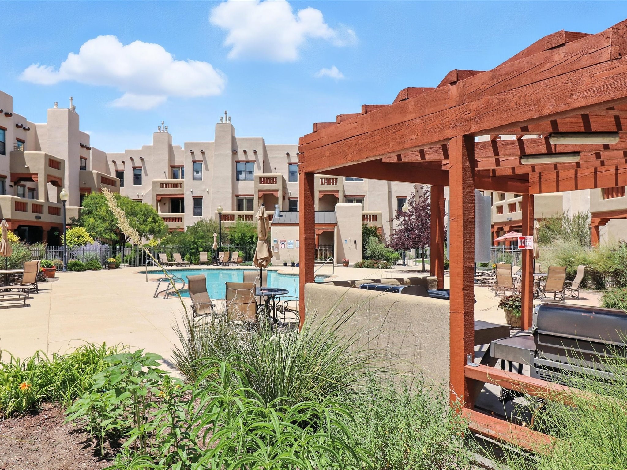 Discover an opportunity to own a ground-level condo in the highly sought-after Alameda compound--an elegant, amenity-rich community in the heart of Santa Fe. This residence captures eastern light and high ceilings that enhance the sense of space, while the cozy kiva gas fireplace adds a touch of Southwestern charm. It has 1 bed & 1 bath, and a covered patio with a private gate offers direct access to parking--ideal for effortless indoor-outdoor living. Kitchen equipped with appliances, an ample cabinet for storage, granite breakfast countertop, a provision for storage room, and a separate laundry room. One of the most desirable locations in the complex, the home enjoys peaceful greenbelt views and a glimpse of the Sangre de Cristo Mountains.The Alameda offers a lifestyle beyond compare with 24-hour controlled access, an outdoor pool, fitness center, two community lounges with kitchens, conference facilities, on-site management, and secure gated parking. Whether you're seeking a primary residence, a secure lock-and-leave getaway, or a smart investment, this turnkey condo is a rare find in a truly extraordinary setting.