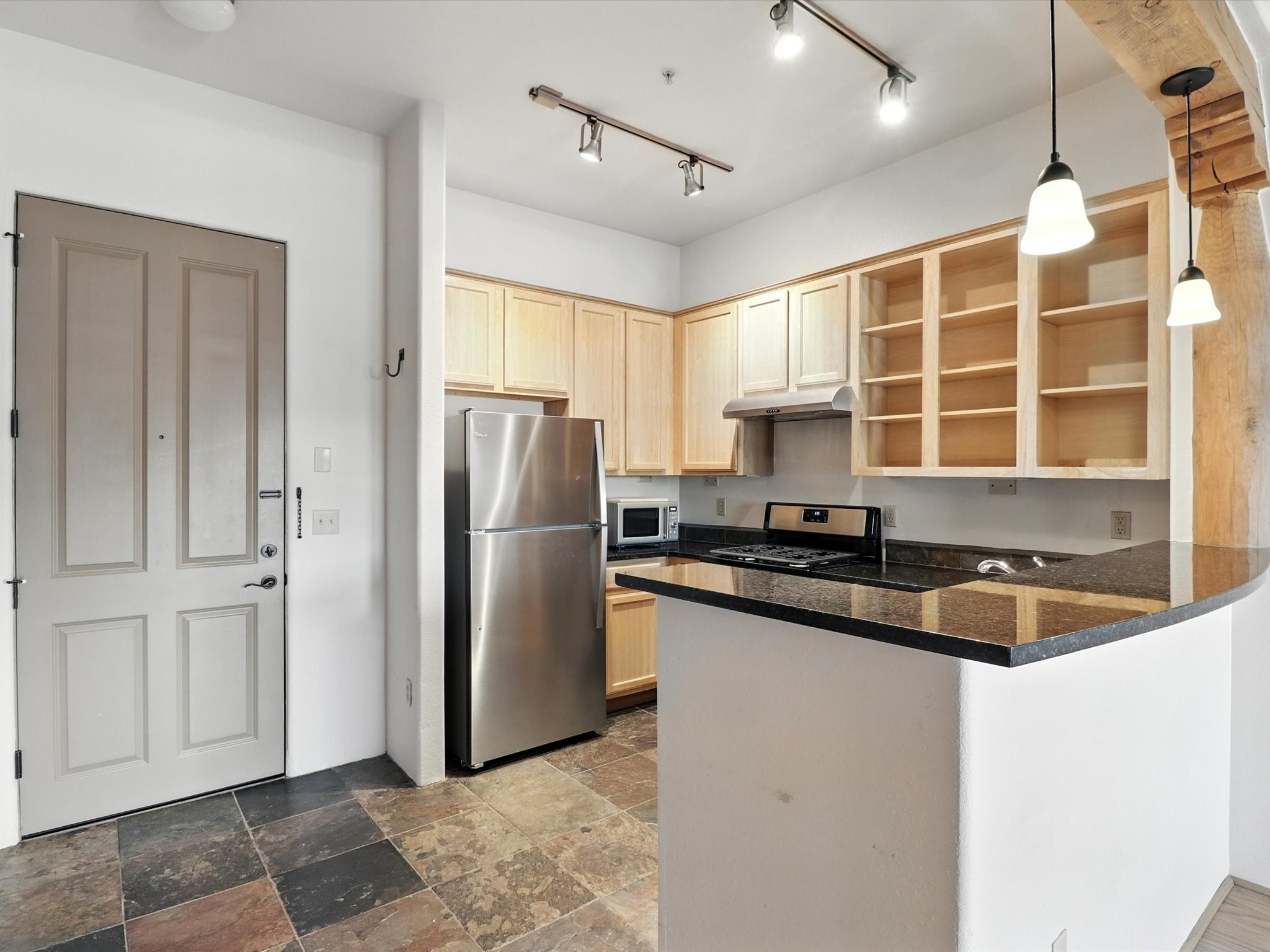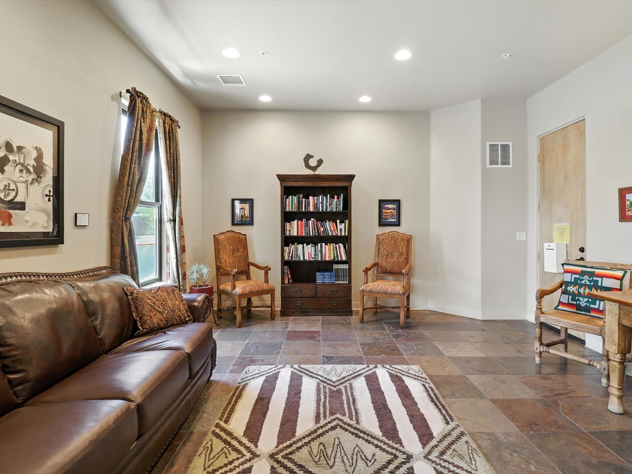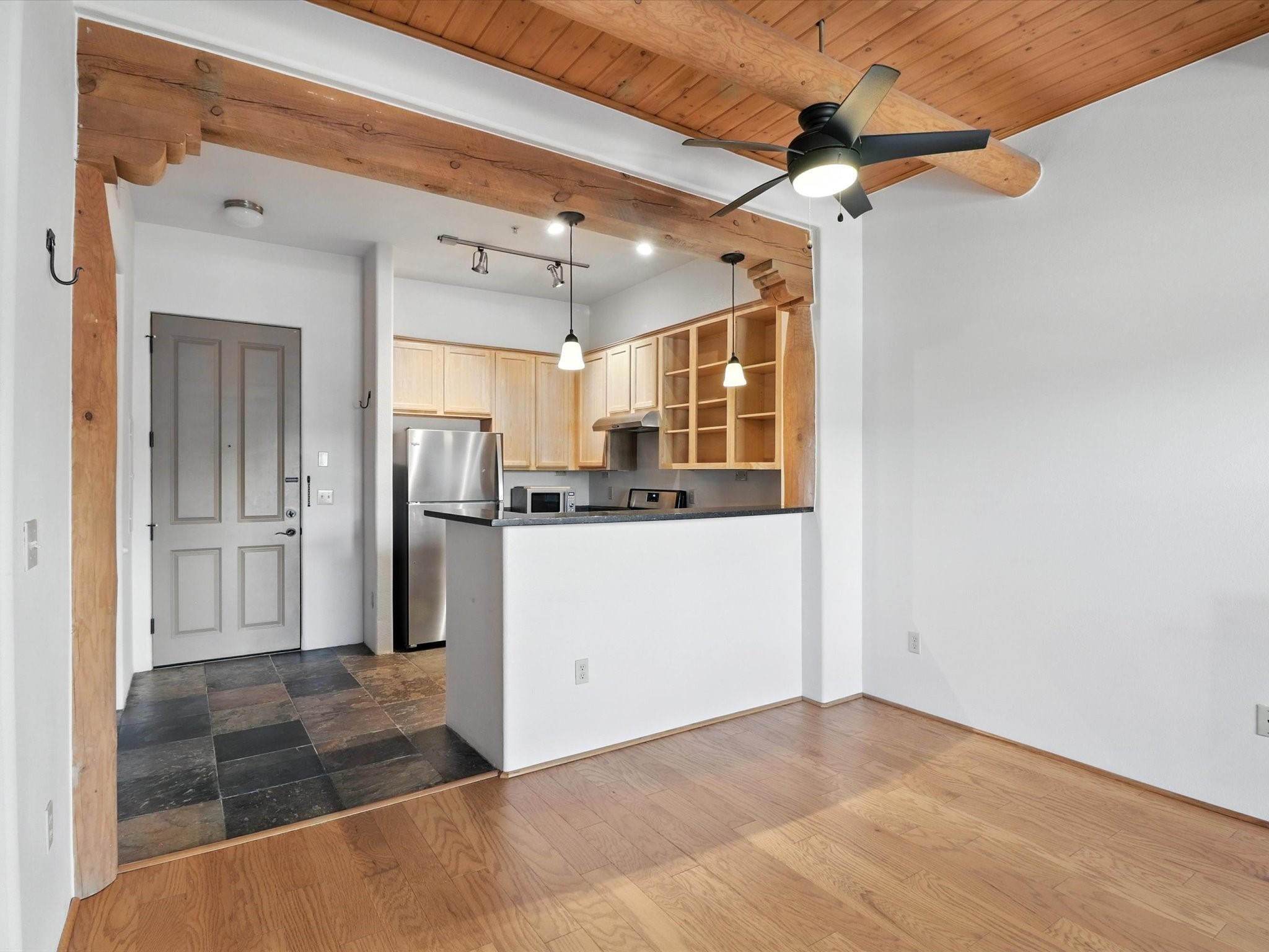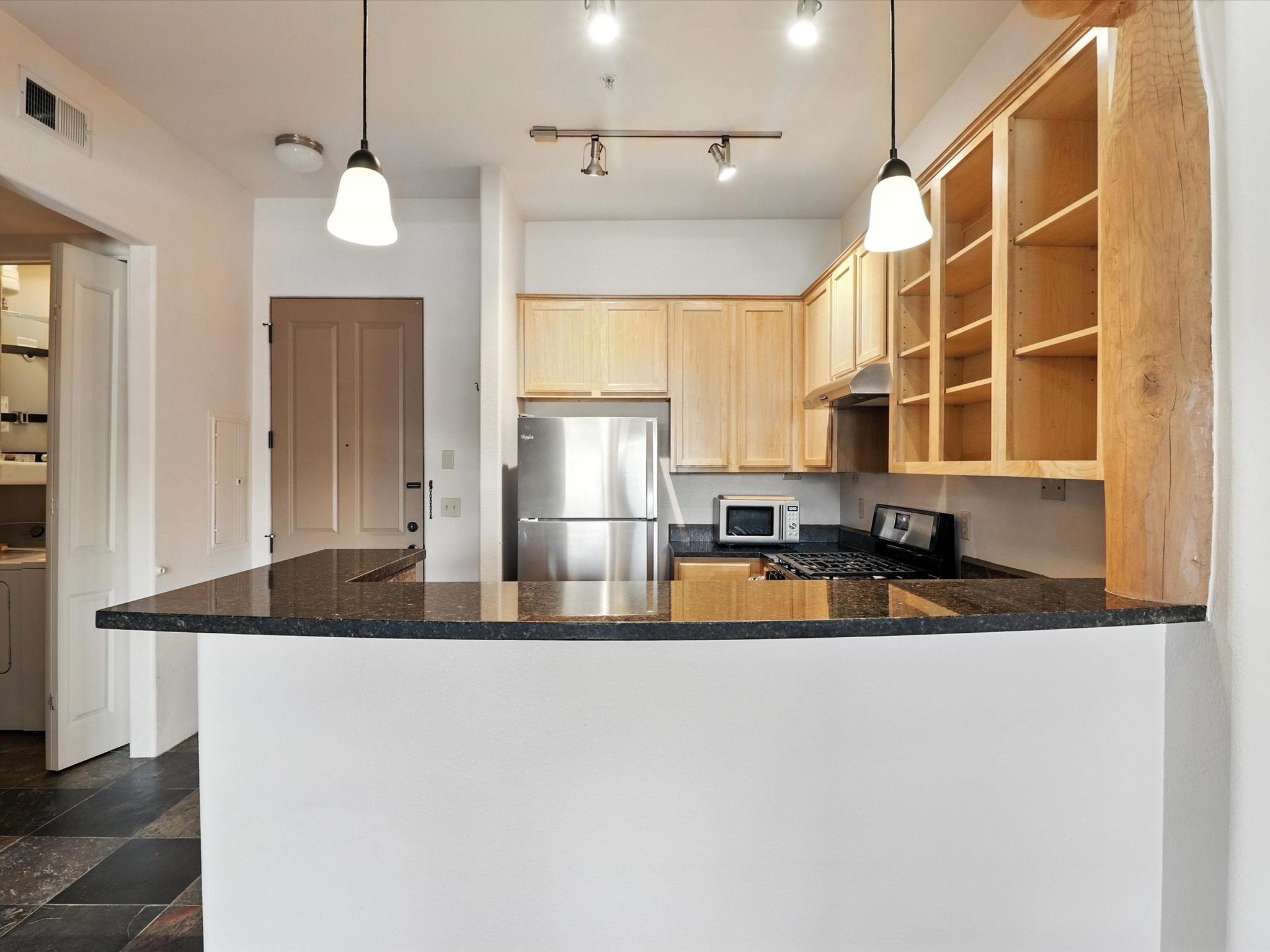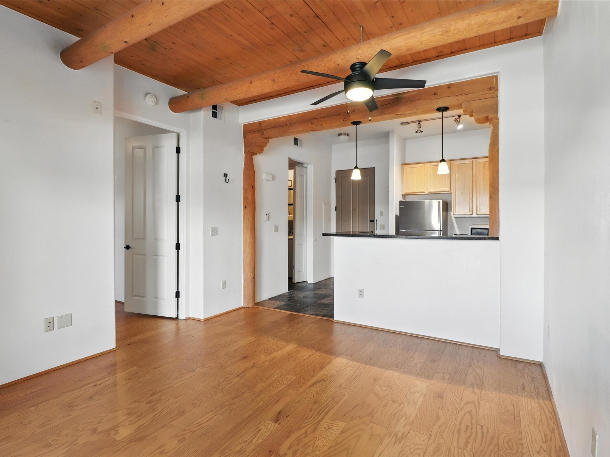 Discover an opportunity to own a ground-level condo in the highly sought-after Alameda compound--an elegant, amenity-rich community in the heart of Santa Fe. This residence captures eastern light and high ceilings that enhance the sense of space, while the cozy kiva gas fireplace adds a touch of Southwestern charm. It has 1 bed & 1 bath, and a covered patio with a private gate offers direct access to parking--ideal for effortless indoor-outdoor living. Kitchen equipped with appliances, an ample cabinet for storage, granite breakfast countertop, a provision for storage room, and a separate laundry room. One of the most desirable locations in the complex, the home enjoys peaceful greenbelt views and a glimpse of the Sangre de Cristo Mountains.The Alameda offers a lifestyle beyond compare with 24-hour controlled access, an outdoor pool, fitness center, two community lounges with kitchens, conference facilities, on-site management, and secure gated parking. Whether you're seeking a primary residence, a secure lock-and-leave getaway, or a smart investment, this turnkey condo is a rare find in a truly extraordinary setting.