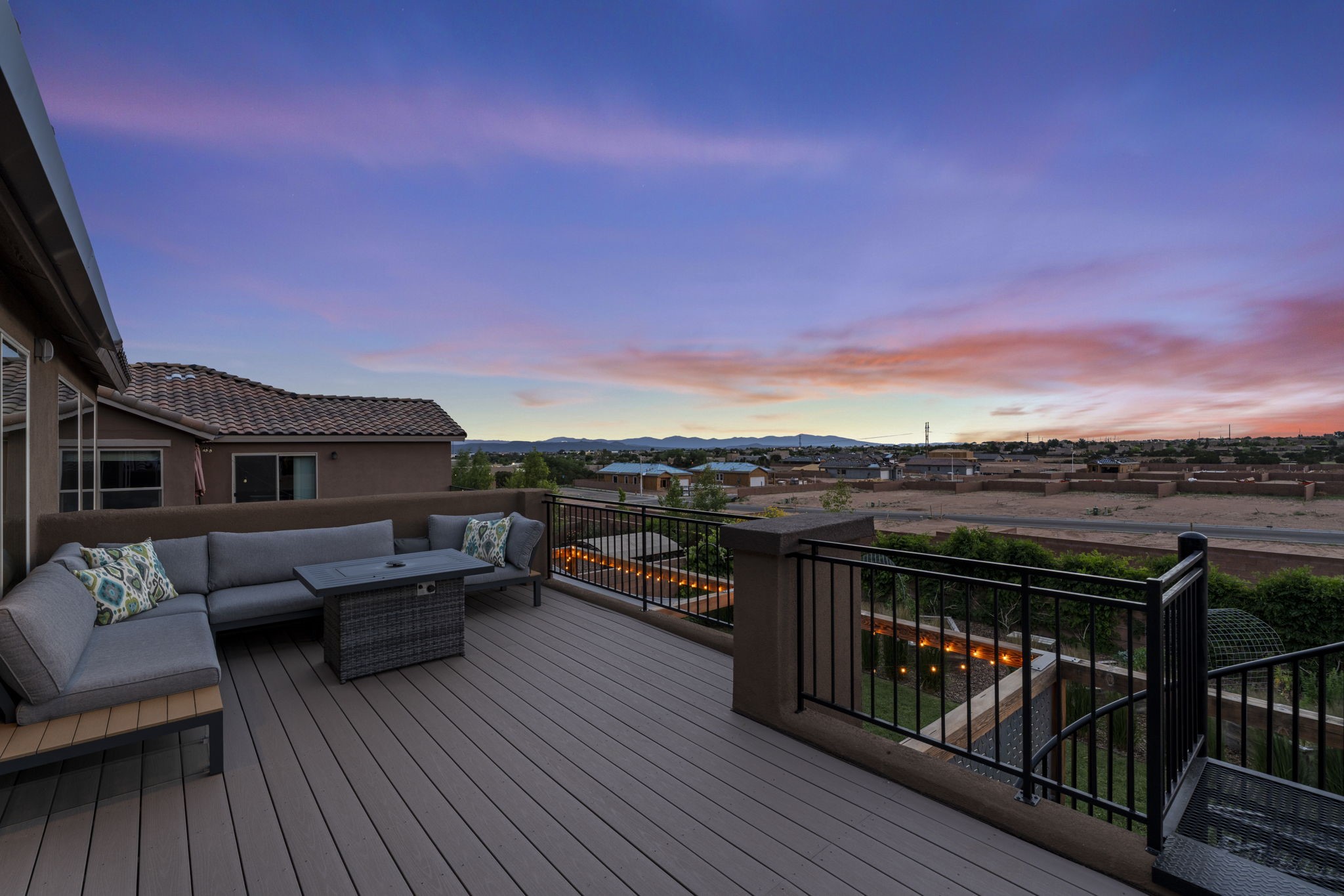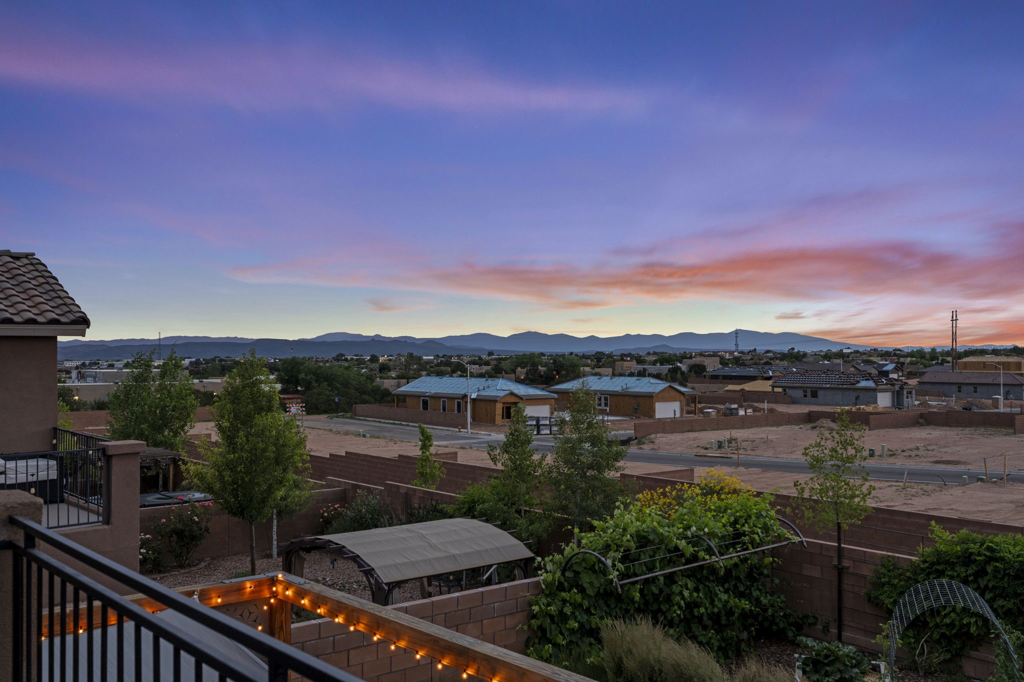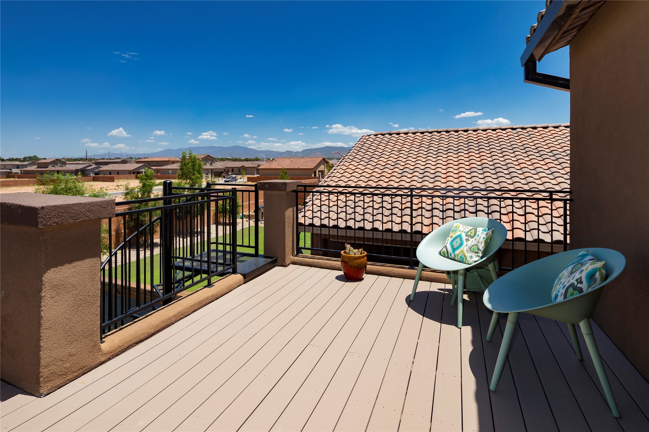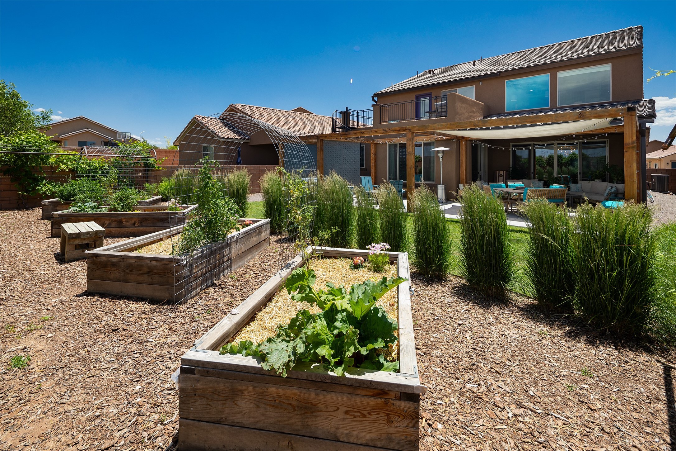 This fine home dazzles under the sure hand of its designer owner. The floorplan is a deft blend of elegance and comfort. Its light, open feel includes defined yet versatile spaces that serve a range of lifestyle needs. On the first floor is a bedroom with ensuite bath. The handsome Cook's Kitchen, with quartz countertops, stainless steel appliances, and adjacent Butler's pantry/office, overlooks the chic living area, with fireplace. The dining room feels at once spacious and intimate. Both living and dining rooms open to the splendid backyard with arching grape vines, a trellised wall of trumpet vines, sprays of ornamental grass, a stretch of turf, raised beds and a newer hot tub. A spiral staircase connects this enchanting oasis with the upper deck, off the Primary Bedroom, with long range views of several mountain ranges. The second story's flexible layout includes a large den or office, a sizable craft room, and two additional bedrooms. Come experience this inviting Las Soleras home, conveniently located close to Presbyterian Hospital, shopping, restaurants and major transportation routes.