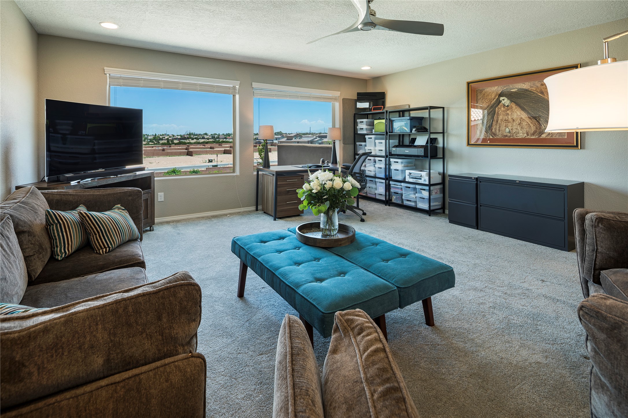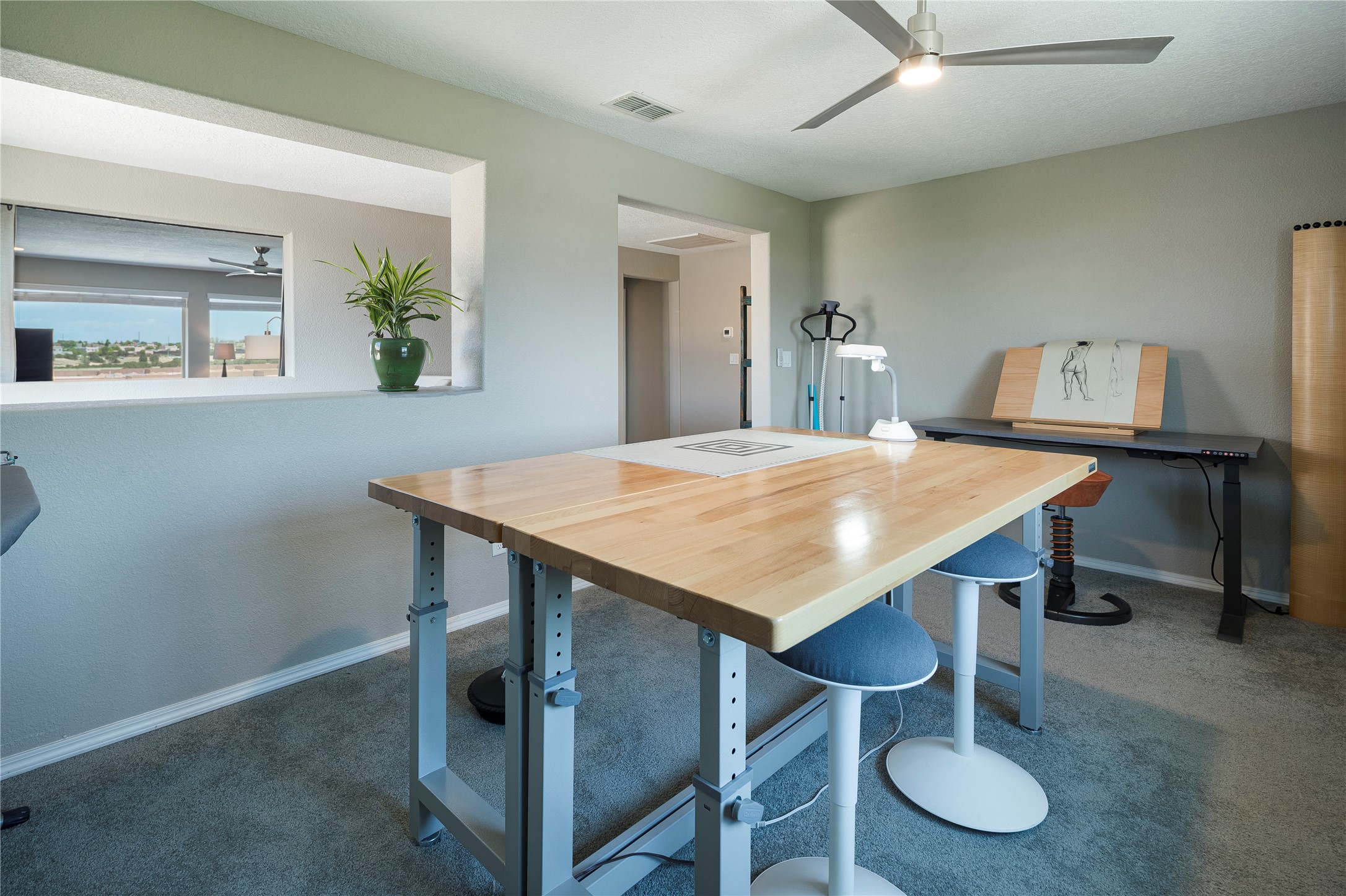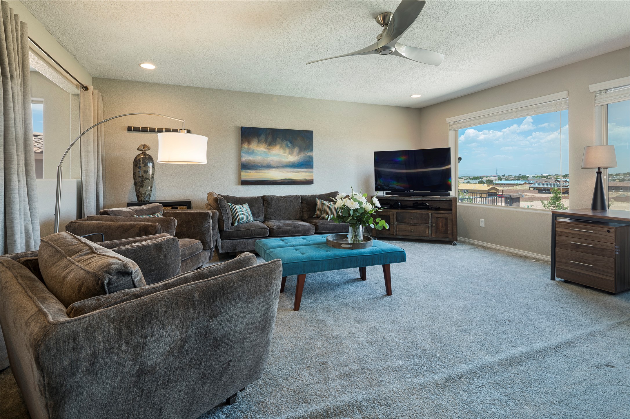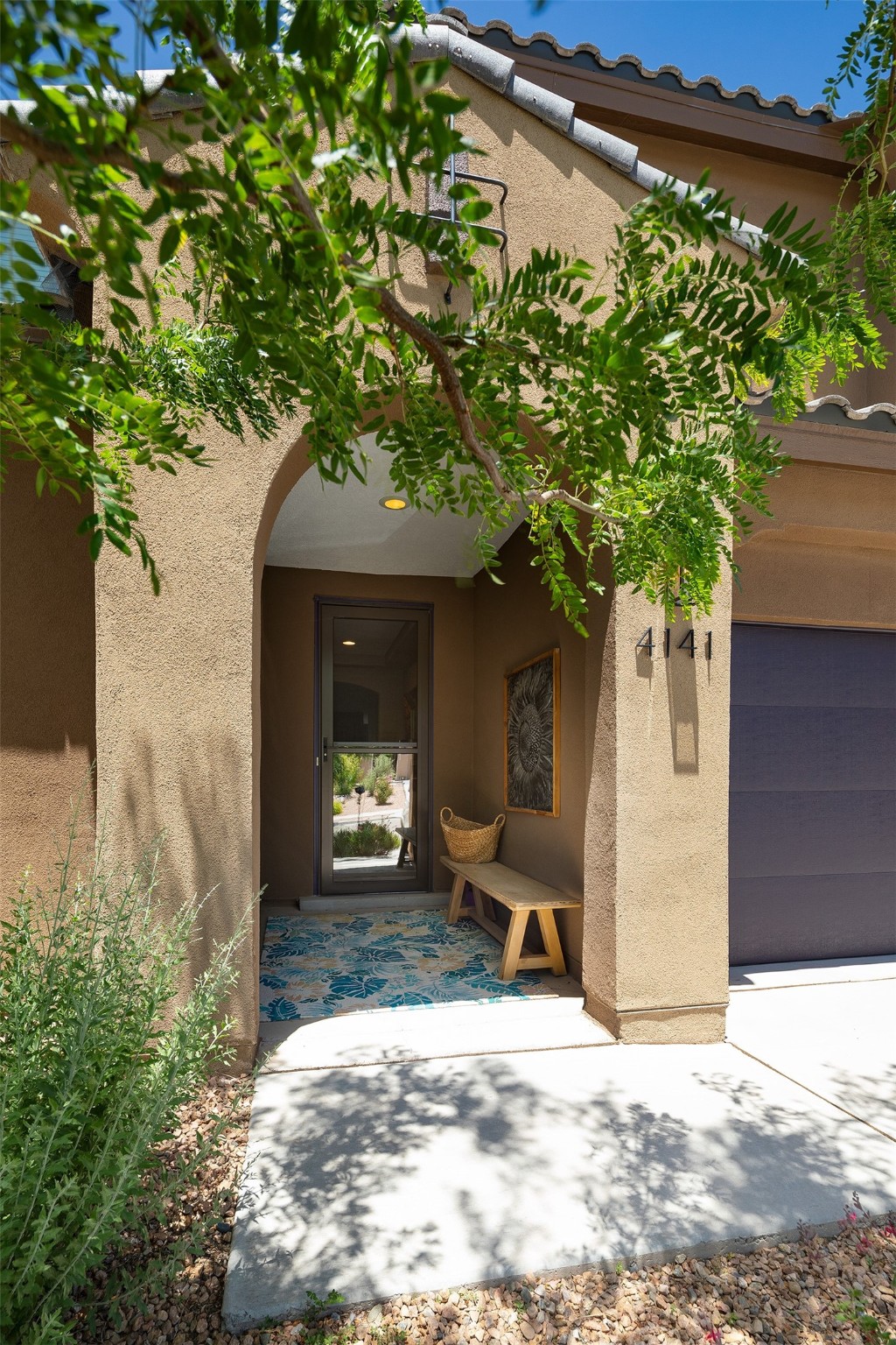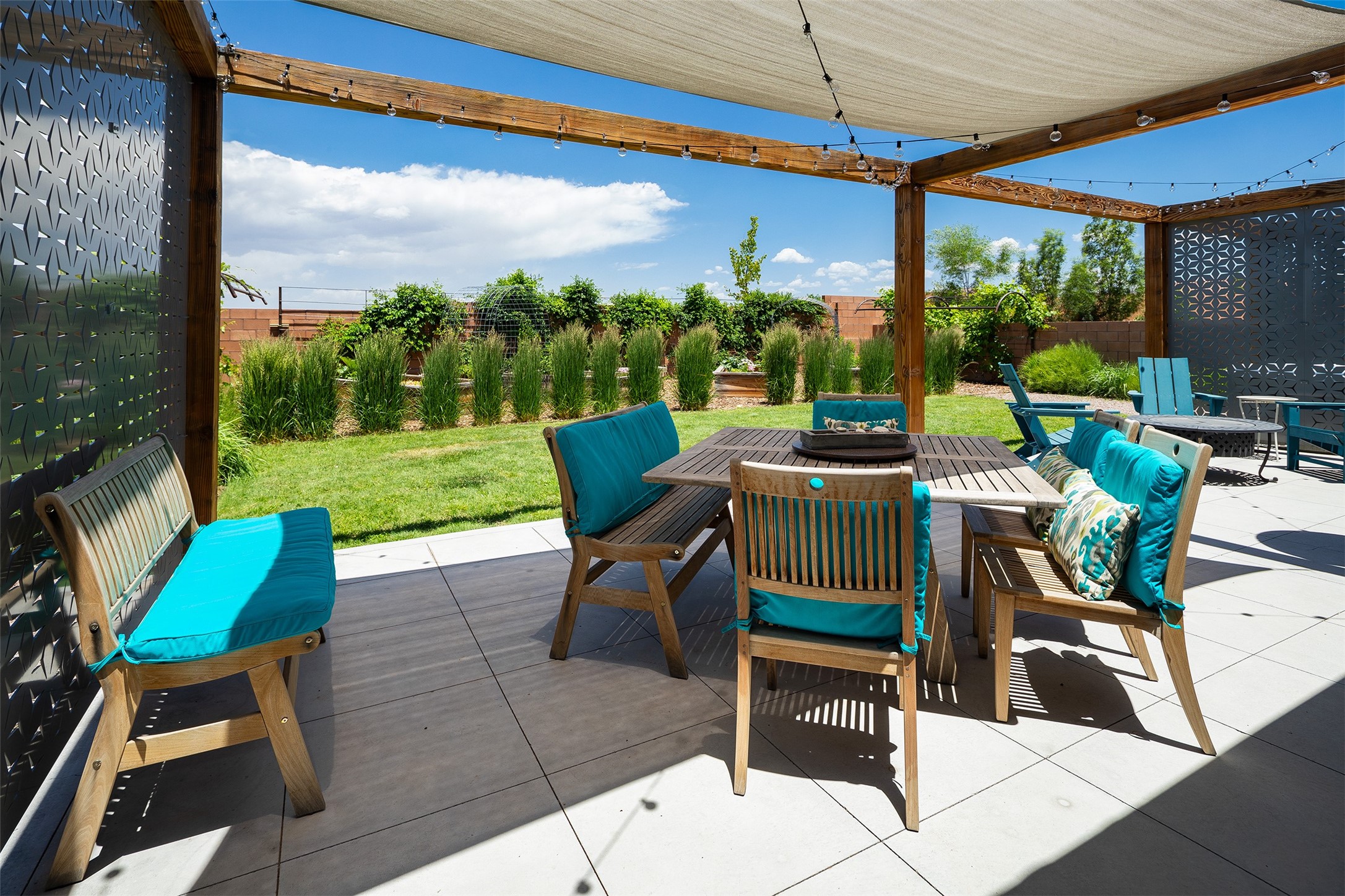 This fine home dazzles under the sure hand of its designer owner. The floorplan is a deft blend of elegance and comfort. Its light, open feel includes defined yet versatile spaces that serve a range of lifestyle needs. On the first floor is a bedroom with ensuite bath. The handsome Cook's Kitchen, with quartz countertops, stainless steel appliances, and adjacent Butler's pantry/office, overlooks the chic living area, with fireplace. The dining room feels at once spacious and intimate. Both living and dining rooms open to the splendid backyard with arching grape vines, a trellised wall of trumpet vines, sprays of ornamental grass, a stretch of turf, raised beds and a newer hot tub. A spiral staircase connects this enchanting oasis with the upper deck, off the Primary Bedroom, with long range views of several mountain ranges. The second story's flexible layout includes a large den or office, a sizable craft room, and two additional bedrooms. Come experience this inviting Las Soleras home, conveniently located close to Presbyterian Hospital, shopping, restaurants and major transportation routes.