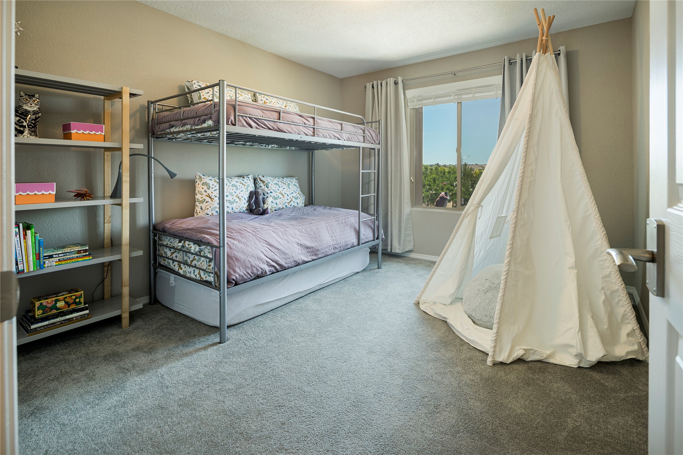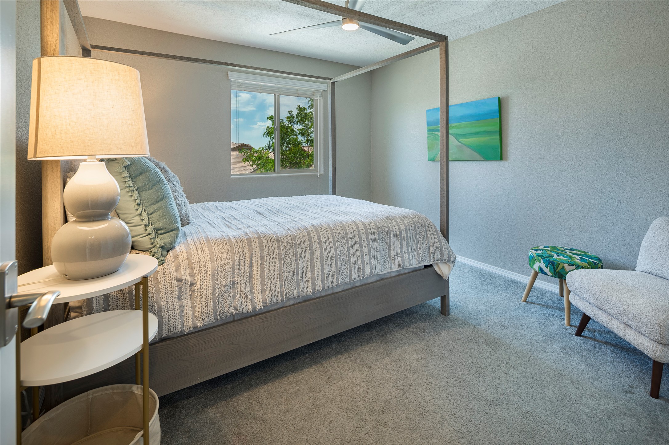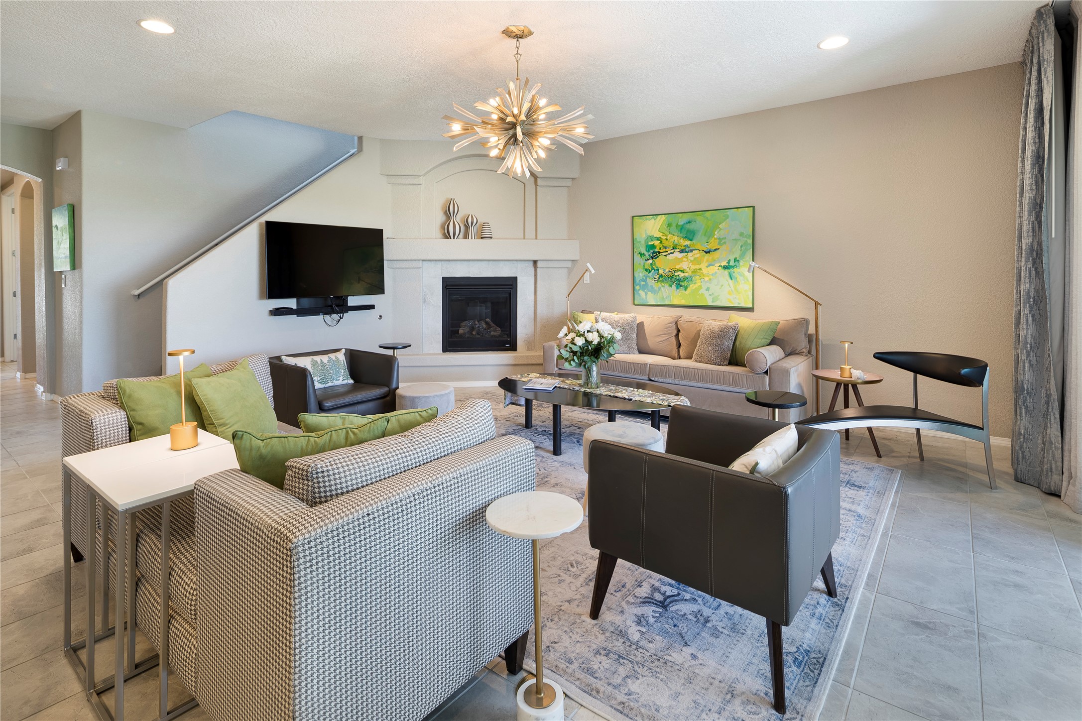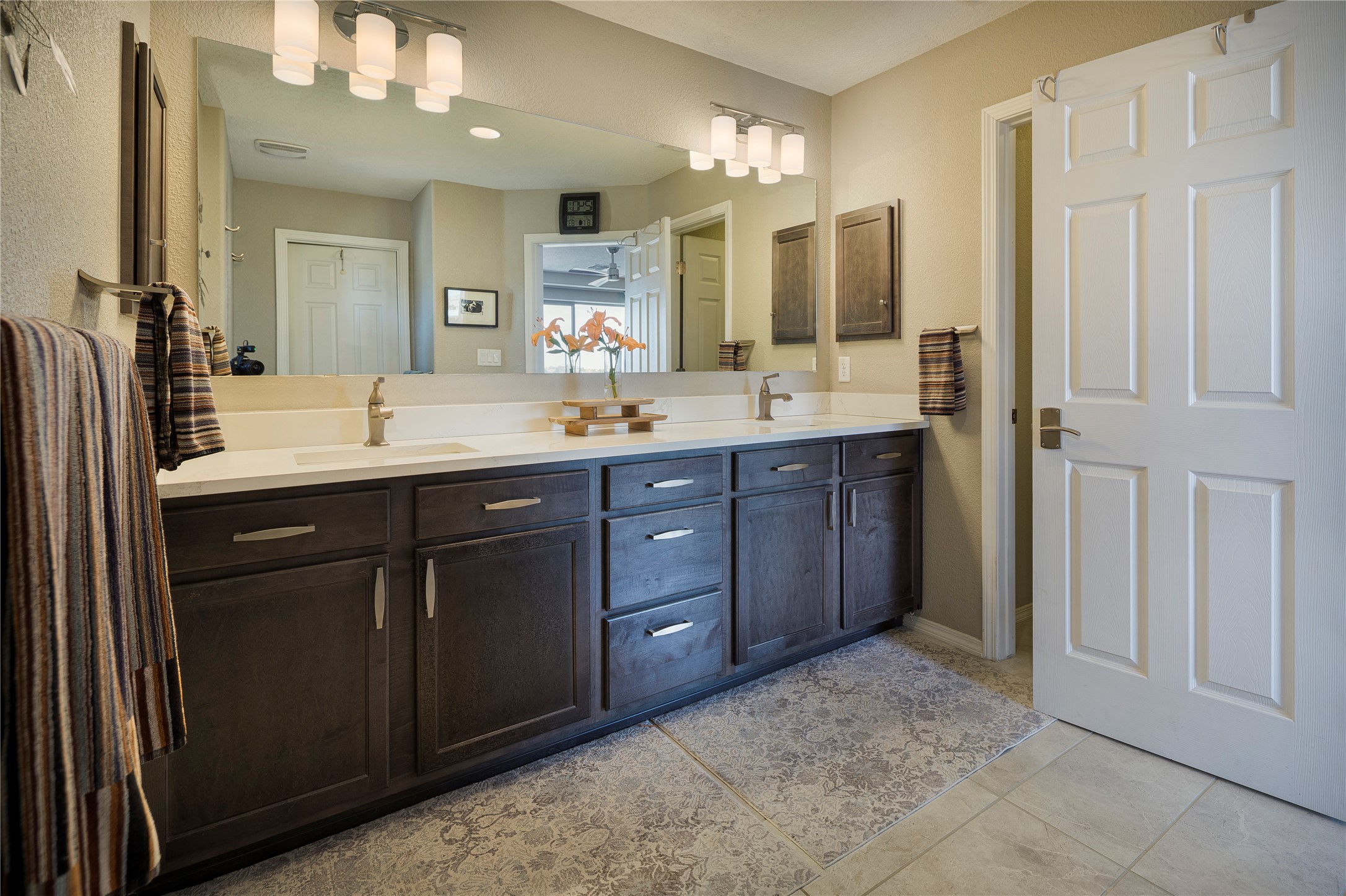 This fine home dazzles under the sure hand of its designer owner. The floorplan is a deft blend of elegance and comfort. Its light, open feel includes defined yet versatile spaces that serve a range of lifestyle needs. On the first floor is a bedroom with ensuite bath. The handsome Cook's Kitchen, with quartz countertops, stainless steel appliances, and adjacent Butler's pantry/office, overlooks the chic living area, with fireplace. The dining room feels at once spacious and intimate. Both living and dining rooms open to the splendid backyard with arching grape vines, a trellised wall of trumpet vines, sprays of ornamental grass, a stretch of turf, raised beds and a newer hot tub. A spiral staircase connects this enchanting oasis with the upper deck, off the Primary Bedroom, with long range views of several mountain ranges. The second story's flexible layout includes a large den or office, a sizable craft room, and two additional bedrooms. Come experience this inviting Las Soleras home, conveniently located close to Presbyterian Hospital, shopping, restaurants and major transportation routes.