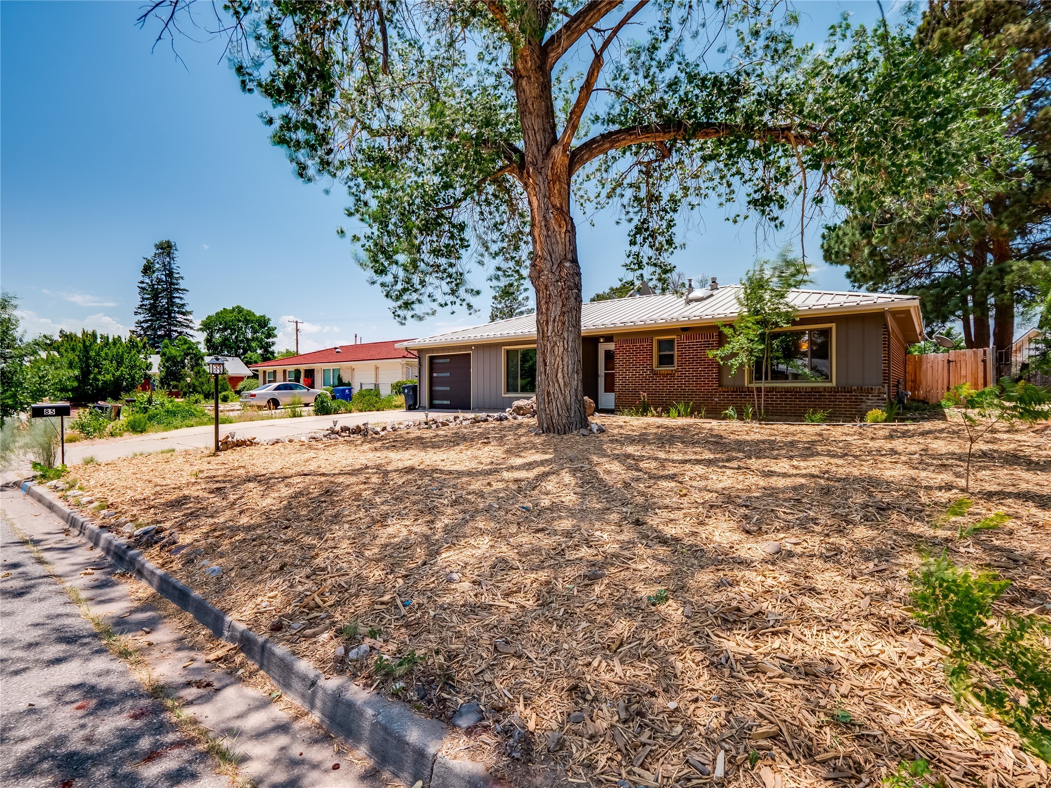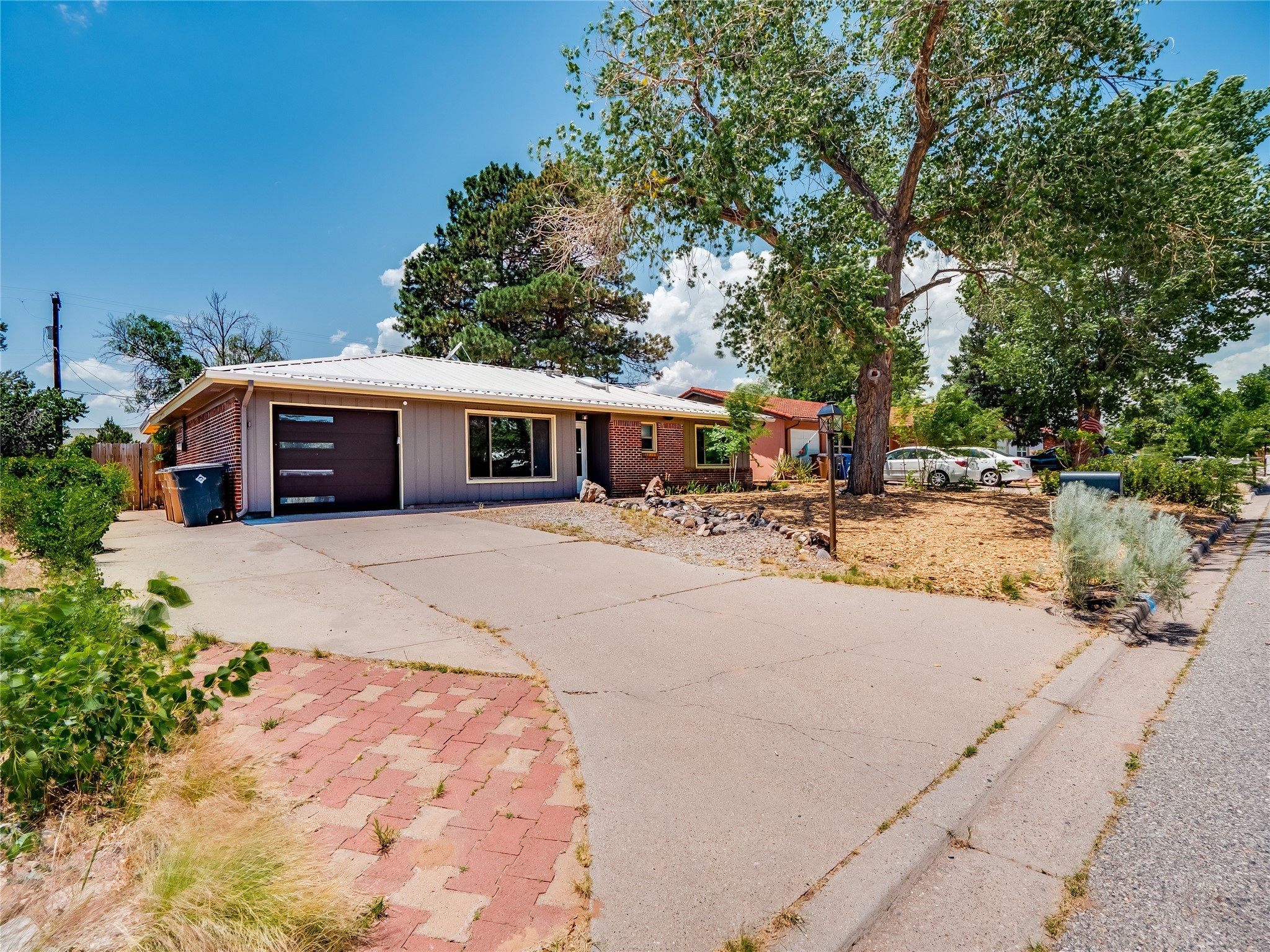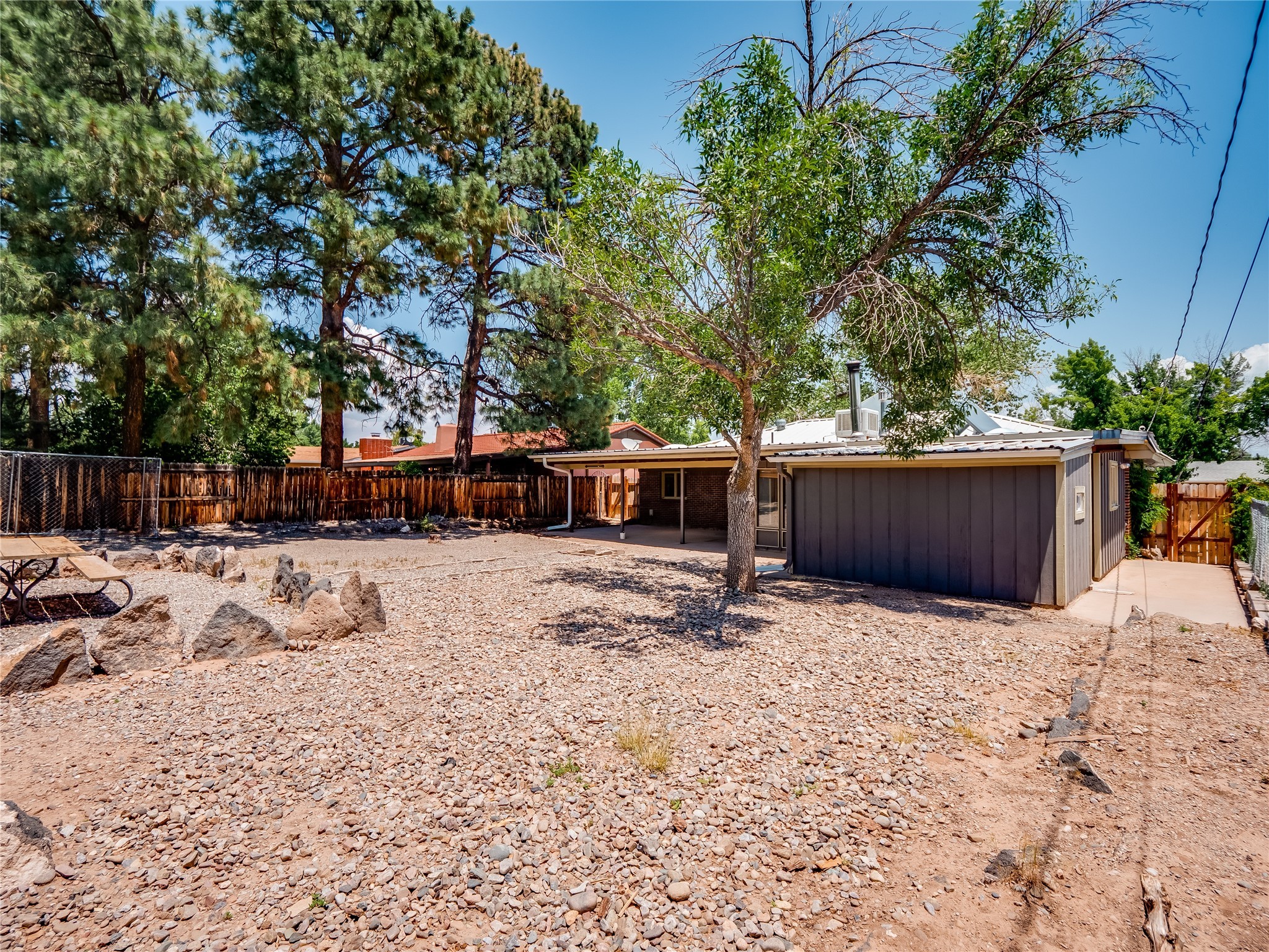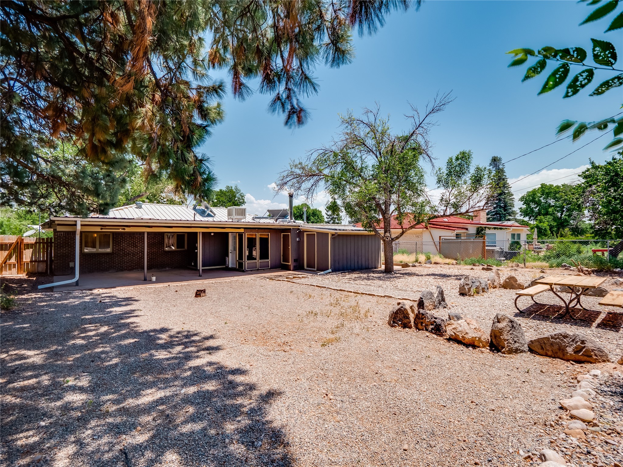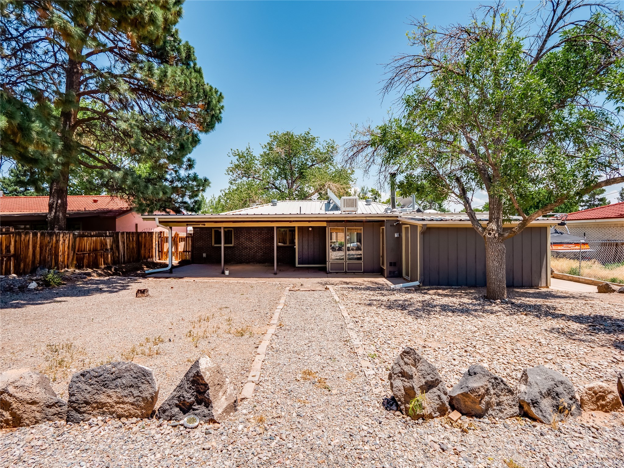 Welcome to this beautifully updated single-story home in White Rock, full of character and charm. Nestled under a mature shade tree, the low-maintenance front yard offers a warm and inviting curb appeal. Step inside through the front entrance and into the open-concept living room featuring laminate wood floors and a large front-facing picture window that fills the space with natural light. The adjoining dining area leads into the galley-style kitchen, which offers an abundance of wood cabinetry, extensive counter space, and stainless steel appliances--ideal for any home chef. A convenient pass-through window opens into the spacious family room, creating great flow for entertaining and daily living. The family room is the heart of the home, boasting a wood-beamed ceiling with a skylight, a beautiful brick accent wall, and a cozy stone wood-burning fireplace. This room also includes access to the backyard and a large covered patio, plus a laundry room discreetly tucked away for added functionality. Down the hallway are two comfortable guest bedrooms, both with plush carpeting and walk-in closets. The nearby guest bathroom includes a single sink vanity, a tiled shower/tub combo, and a skylight that brings in soft natural light. The generous primary en-suite also features carpet flooring, a large walk-in closet, and a stunningly renovated modern bathroom complete with a tiled walk-in shower with ceiling showerhead and sleek single sink vanity--a true private retreat. The expansive backyard is a xeriscaped blank canvas, ready for your dream outdoor entertainment space. A large covered deck provides the perfect shady spot to lounge or host outdoor dinner parties. Two attached storage rooms offer ample space for garden tools and seasonal items. Located near shopping, restaurants, parks, and trails, this home offers a perfect balance of comfort, convenience, and style. Don't miss your chance to tour this wonderful property today!