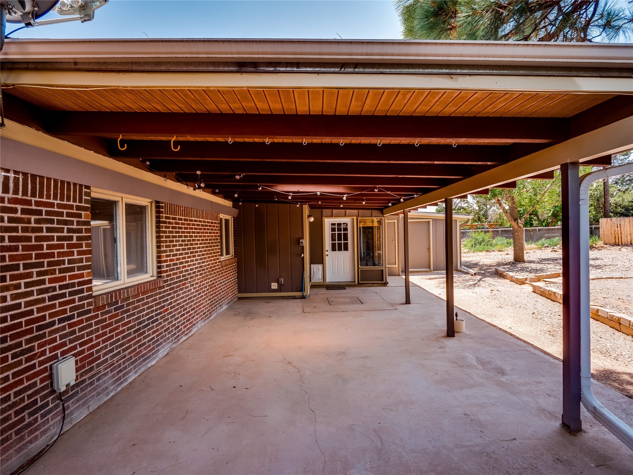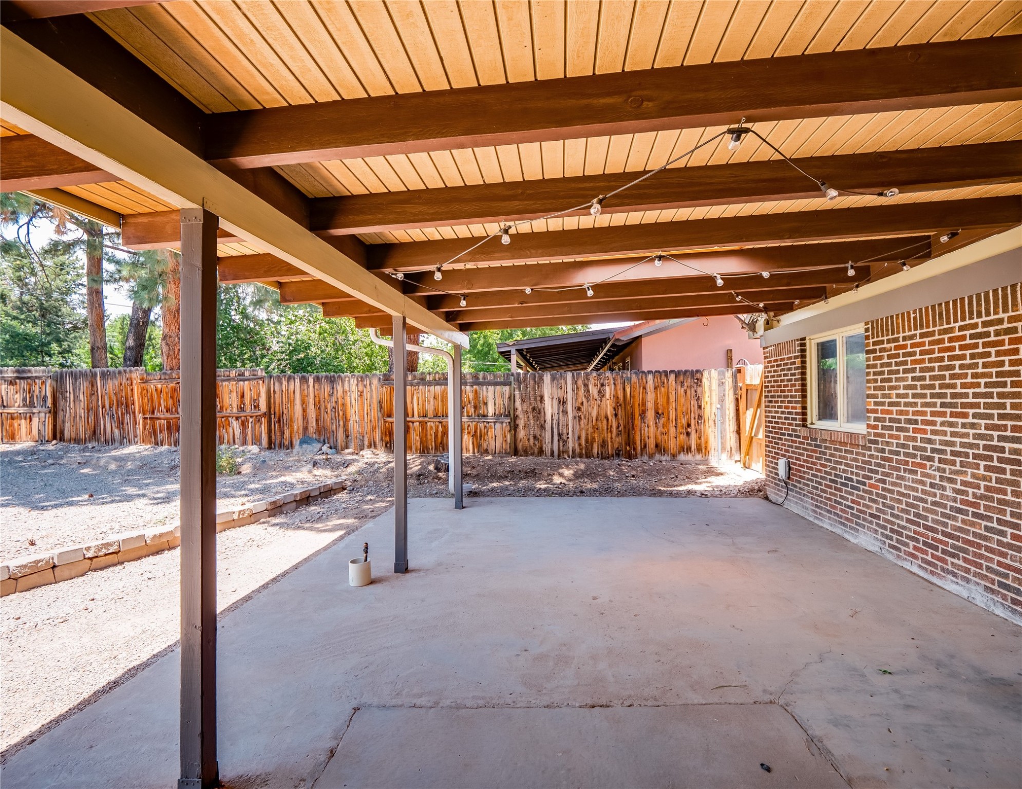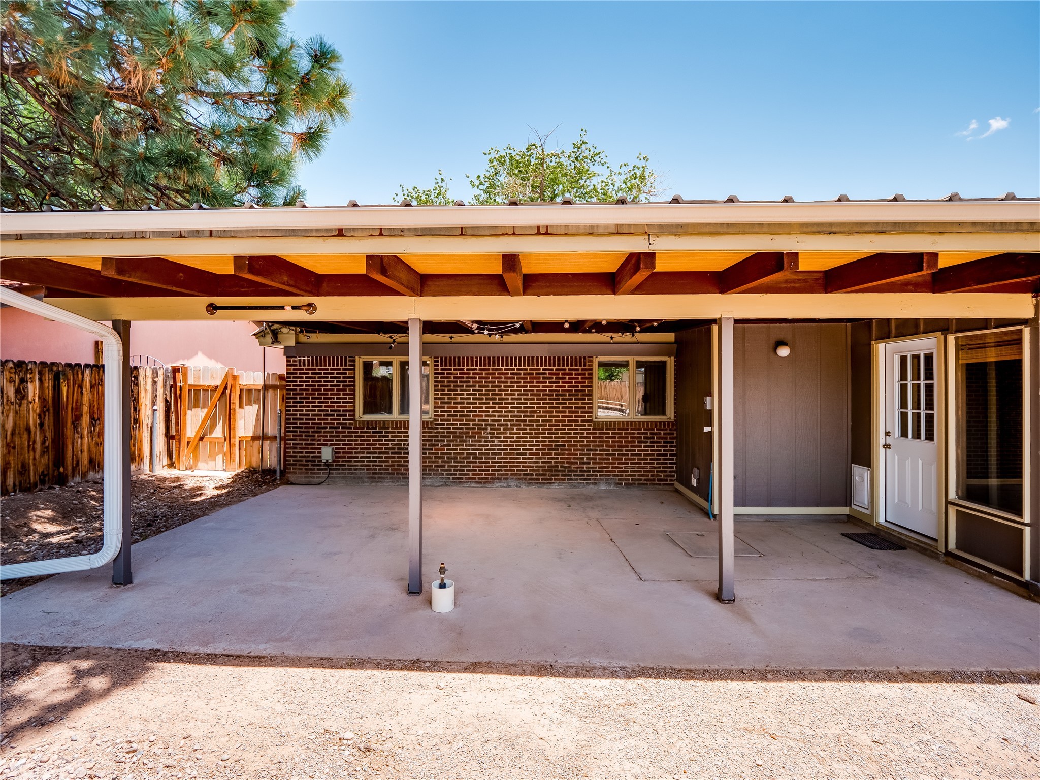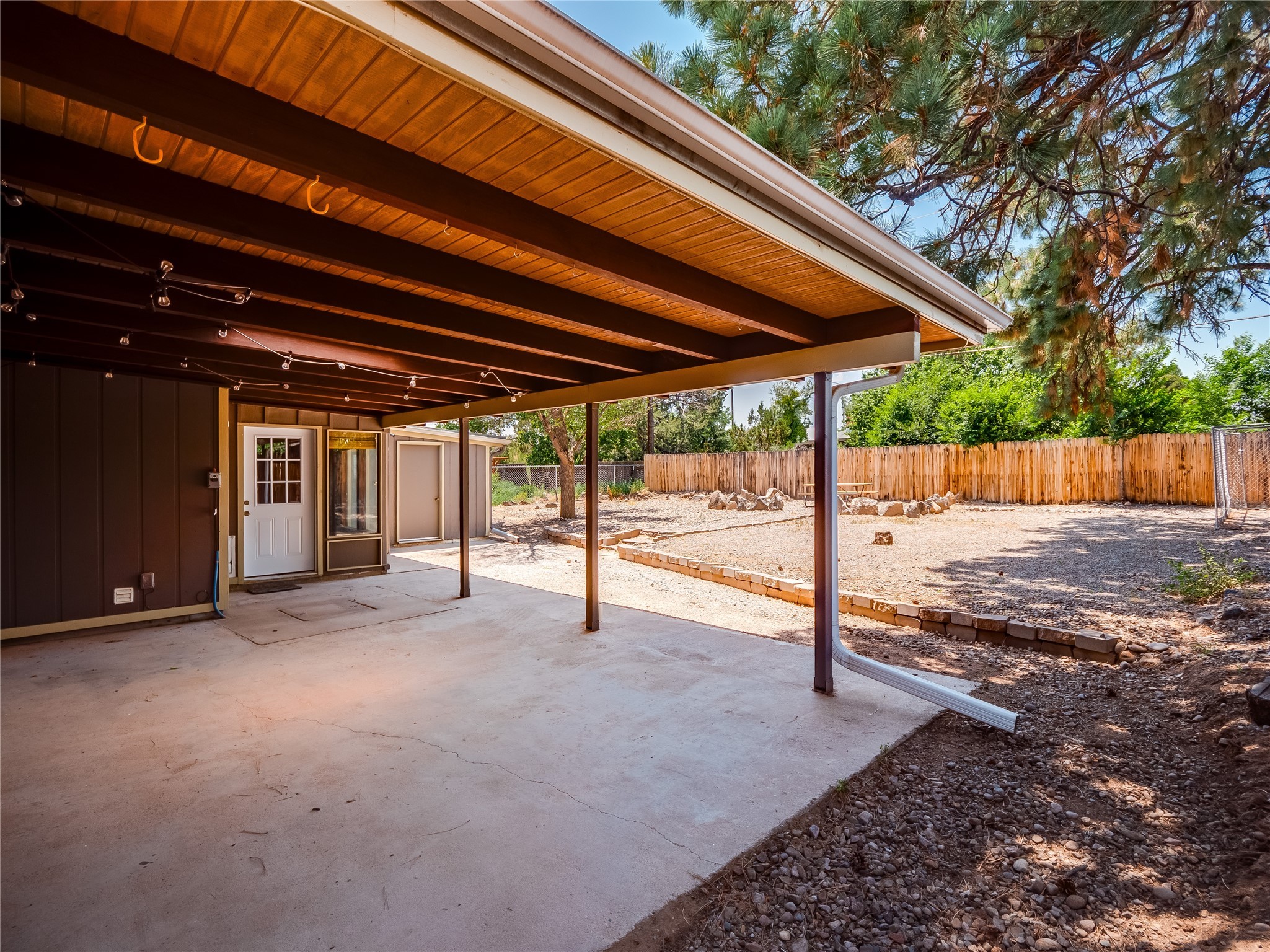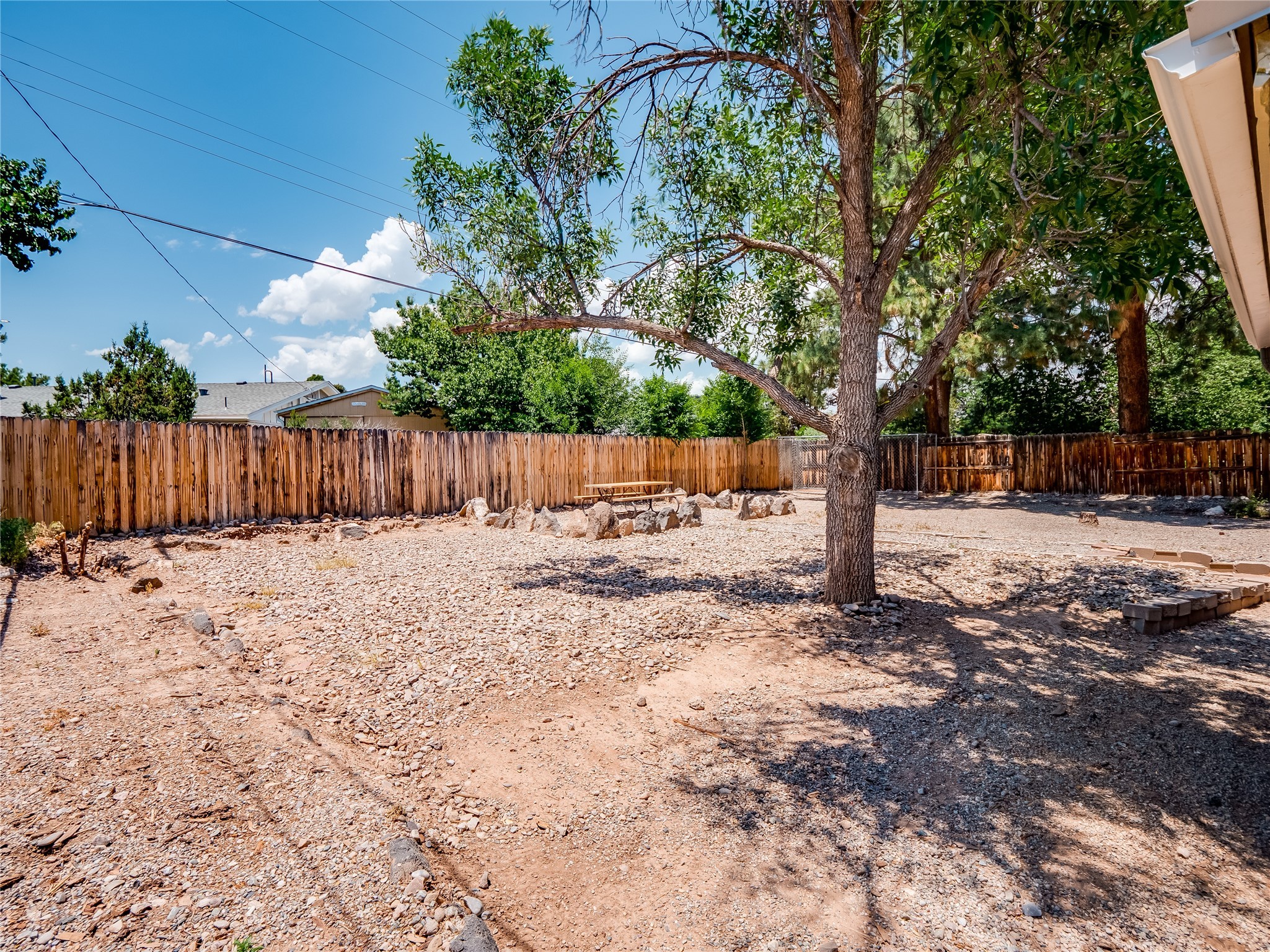 Welcome to this beautifully updated single-story home in White Rock, full of character and charm. Nestled under a mature shade tree, the low-maintenance front yard offers a warm and inviting curb appeal. Step inside through the front entrance and into the open-concept living room featuring laminate wood floors and a large front-facing picture window that fills the space with natural light. The adjoining dining area leads into the galley-style kitchen, which offers an abundance of wood cabinetry, extensive counter space, and stainless steel appliances--ideal for any home chef. A convenient pass-through window opens into the spacious family room, creating great flow for entertaining and daily living. The family room is the heart of the home, boasting a wood-beamed ceiling with a skylight, a beautiful brick accent wall, and a cozy stone wood-burning fireplace. This room also includes access to the backyard and a large covered patio, plus a laundry room discreetly tucked away for added functionality. Down the hallway are two comfortable guest bedrooms, both with plush carpeting and walk-in closets. The nearby guest bathroom includes a single sink vanity, a tiled shower/tub combo, and a skylight that brings in soft natural light. The generous primary en-suite also features carpet flooring, a large walk-in closet, and a stunningly renovated modern bathroom complete with a tiled walk-in shower with ceiling showerhead and sleek single sink vanity--a true private retreat. The expansive backyard is a xeriscaped blank canvas, ready for your dream outdoor entertainment space. A large covered deck provides the perfect shady spot to lounge or host outdoor dinner parties. Two attached storage rooms offer ample space for garden tools and seasonal items. Located near shopping, restaurants, parks, and trails, this home offers a perfect balance of comfort, convenience, and style. Don't miss your chance to tour this wonderful property today!