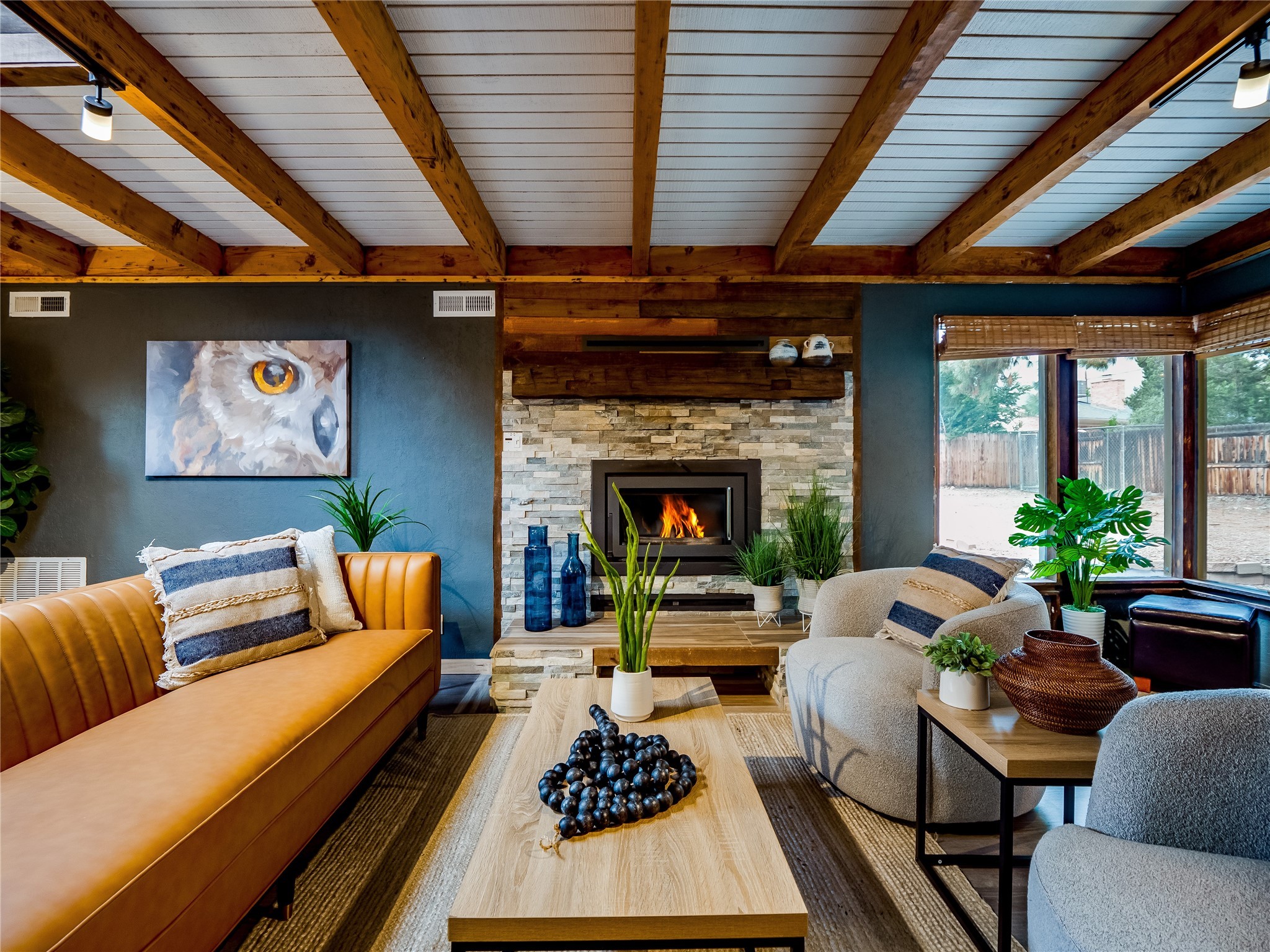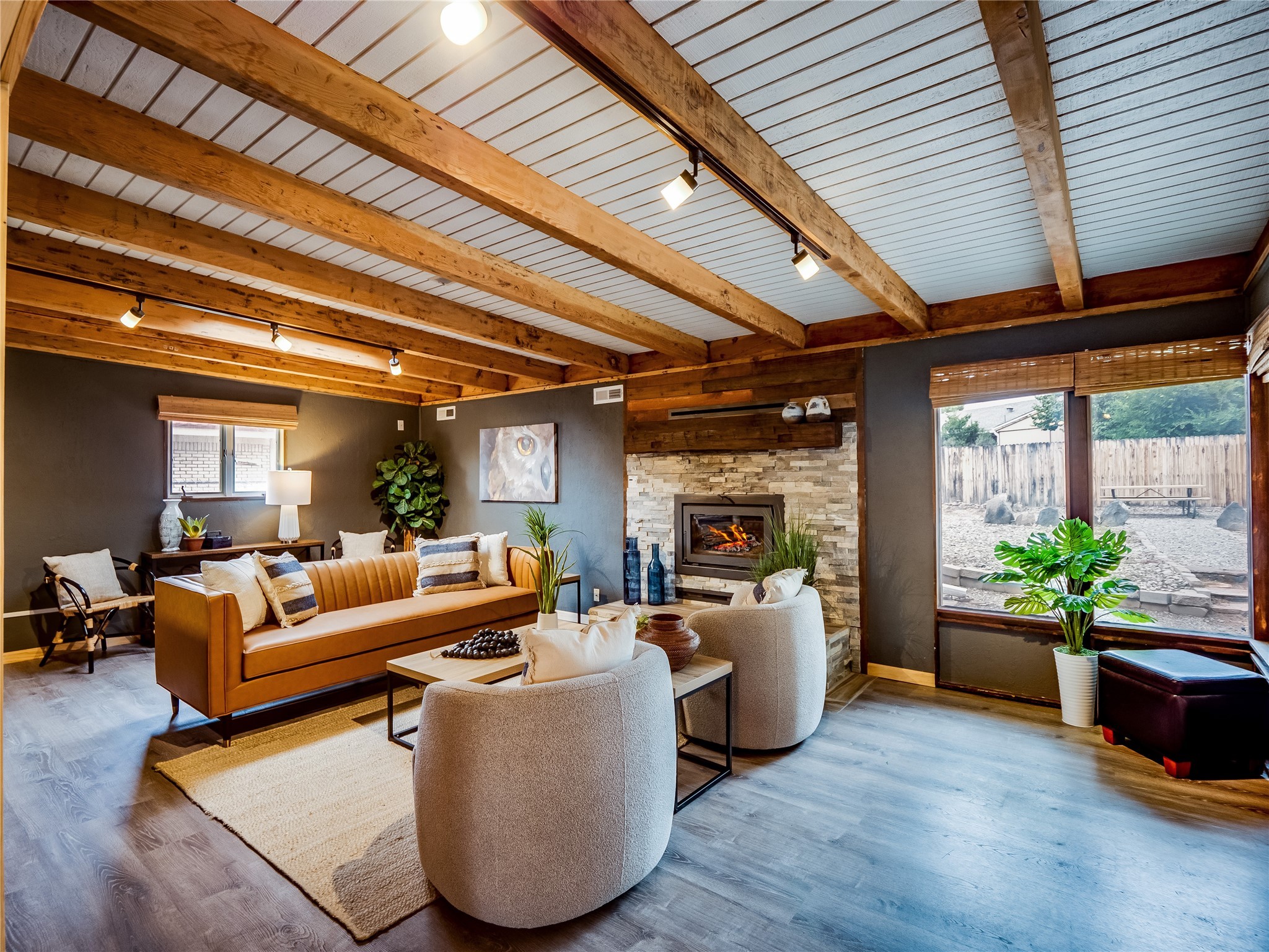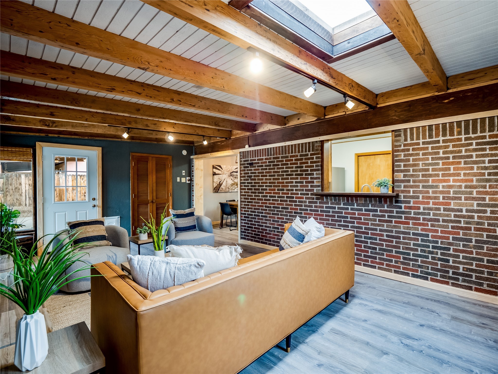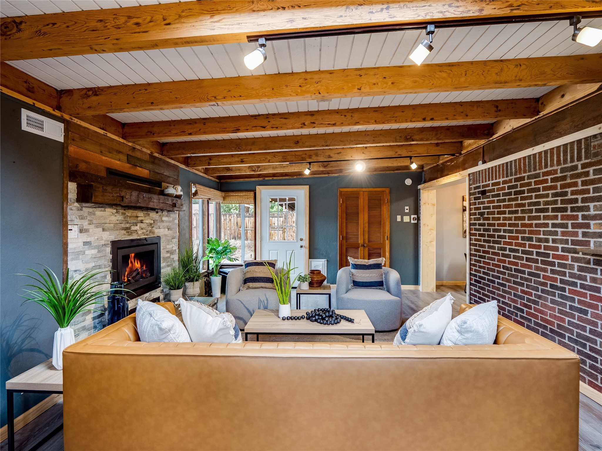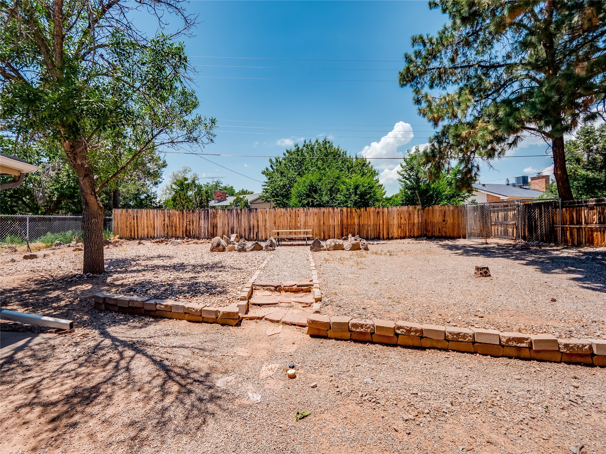 Welcome to this beautifully updated single-story home in White Rock, full of character and charm. Nestled under a mature shade tree, the low-maintenance front yard offers a warm and inviting curb appeal. Step inside through the front entrance and into the open-concept living room featuring laminate wood floors and a large front-facing picture window that fills the space with natural light. The adjoining dining area leads into the galley-style kitchen, which offers an abundance of wood cabinetry, extensive counter space, and stainless steel appliances--ideal for any home chef. A convenient pass-through window opens into the spacious family room, creating great flow for entertaining and daily living. The family room is the heart of the home, boasting a wood-beamed ceiling with a skylight, a beautiful brick accent wall, and a cozy stone wood-burning fireplace. This room also includes access to the backyard and a large covered patio, plus a laundry room discreetly tucked away for added functionality. Down the hallway are two comfortable guest bedrooms, both with plush carpeting and walk-in closets. The nearby guest bathroom includes a single sink vanity, a tiled shower/tub combo, and a skylight that brings in soft natural light. The generous primary en-suite also features carpet flooring, a large walk-in closet, and a stunningly renovated modern bathroom complete with a tiled walk-in shower with ceiling showerhead and sleek single sink vanity--a true private retreat. The expansive backyard is a xeriscaped blank canvas, ready for your dream outdoor entertainment space. A large covered deck provides the perfect shady spot to lounge or host outdoor dinner parties. Two attached storage rooms offer ample space for garden tools and seasonal items. Located near shopping, restaurants, parks, and trails, this home offers a perfect balance of comfort, convenience, and style. Don't miss your chance to tour this wonderful property today!