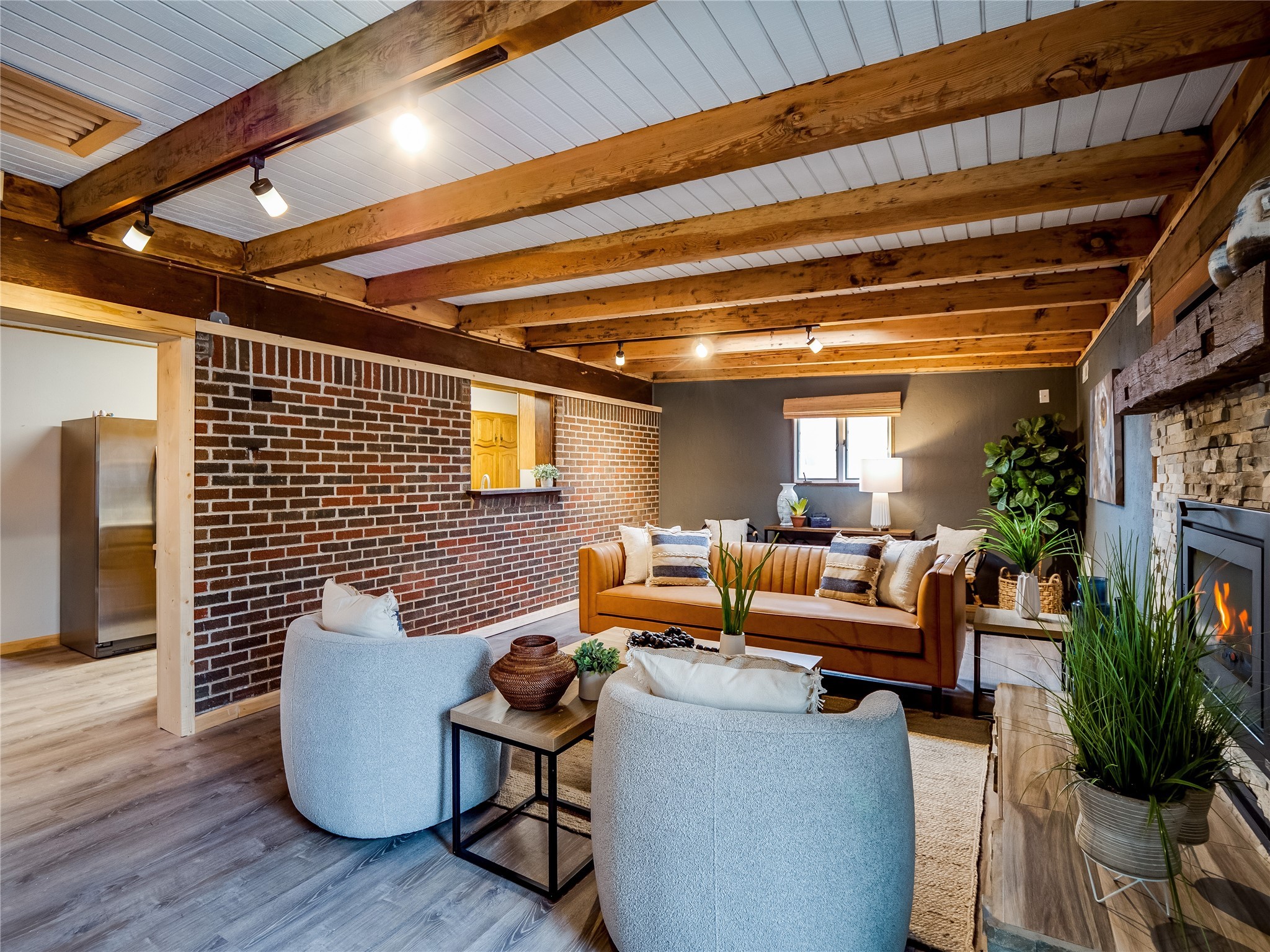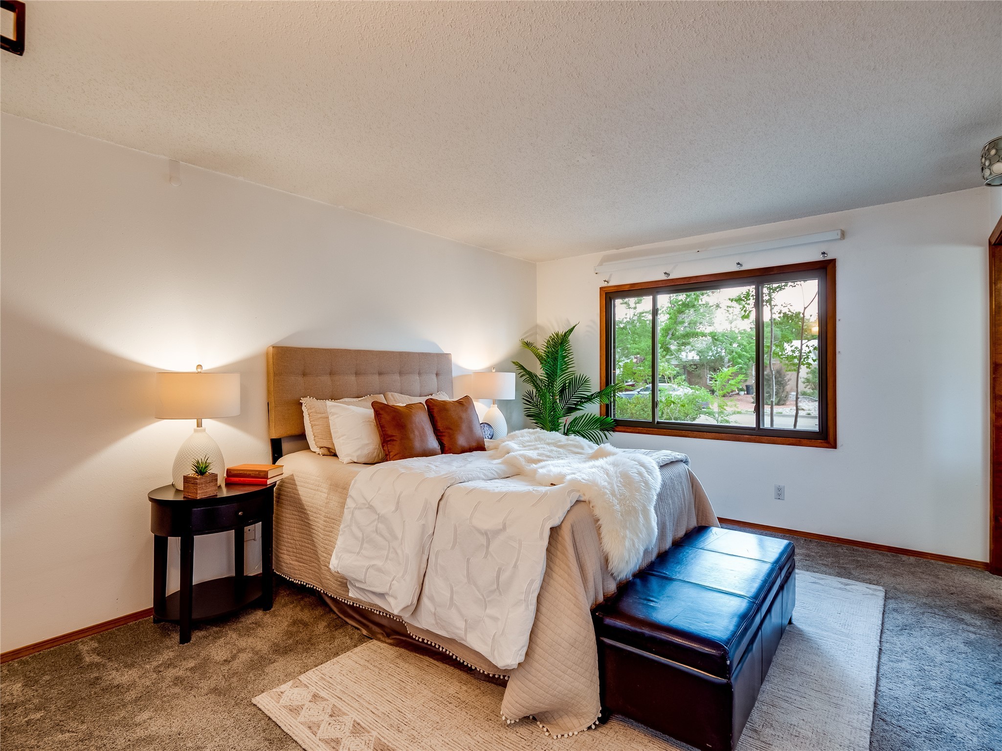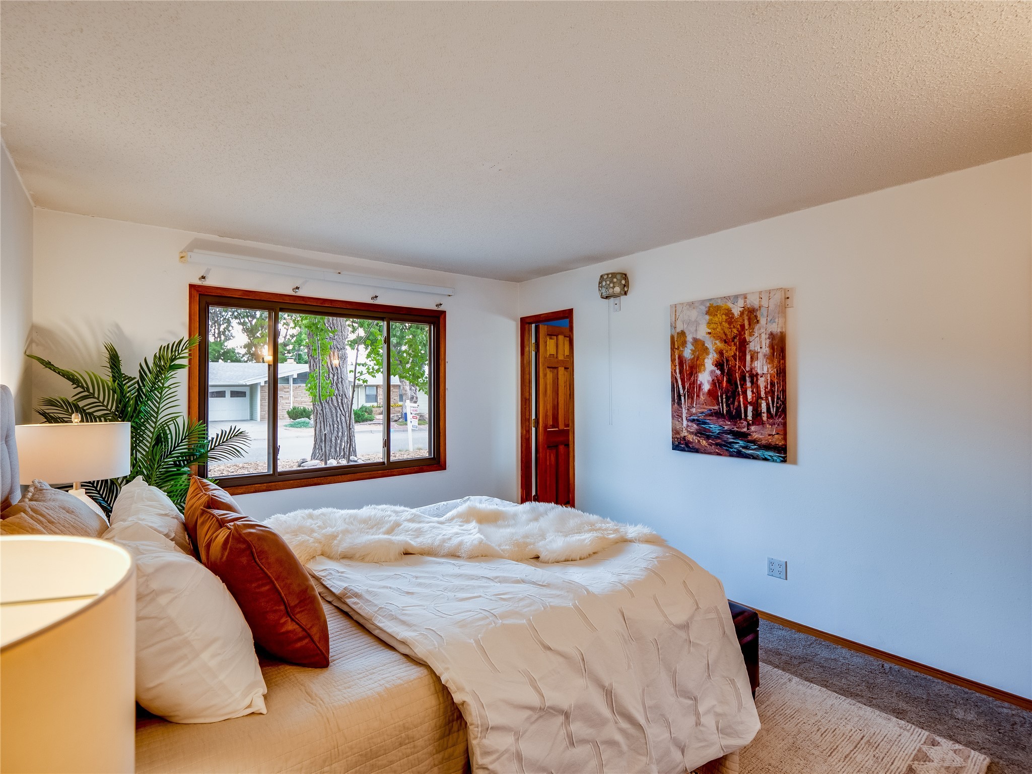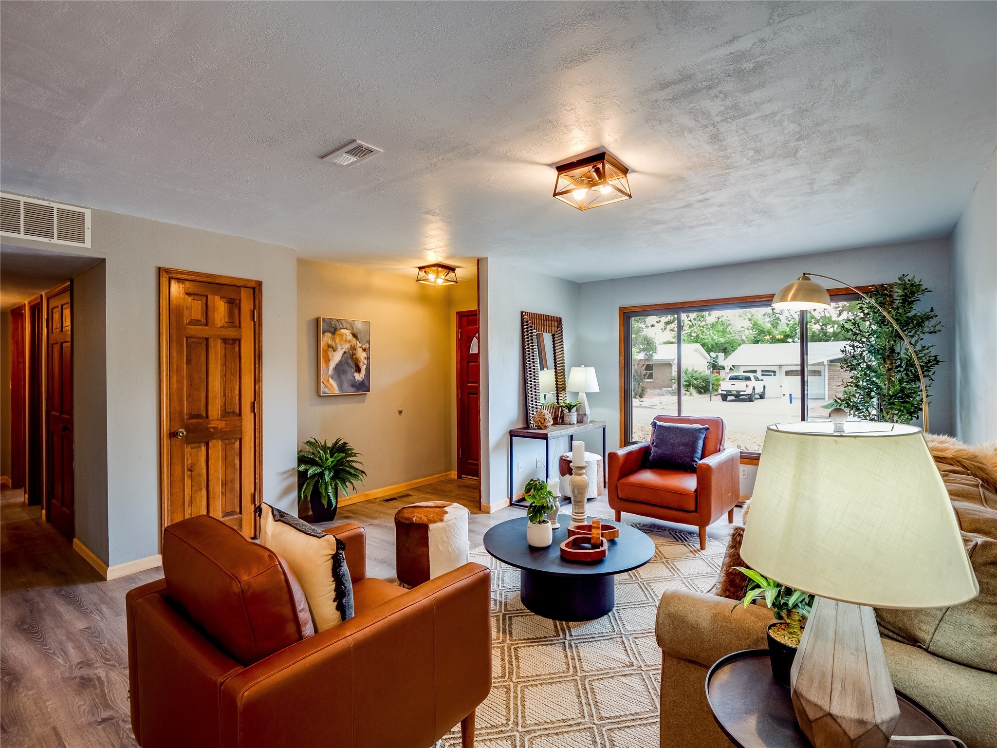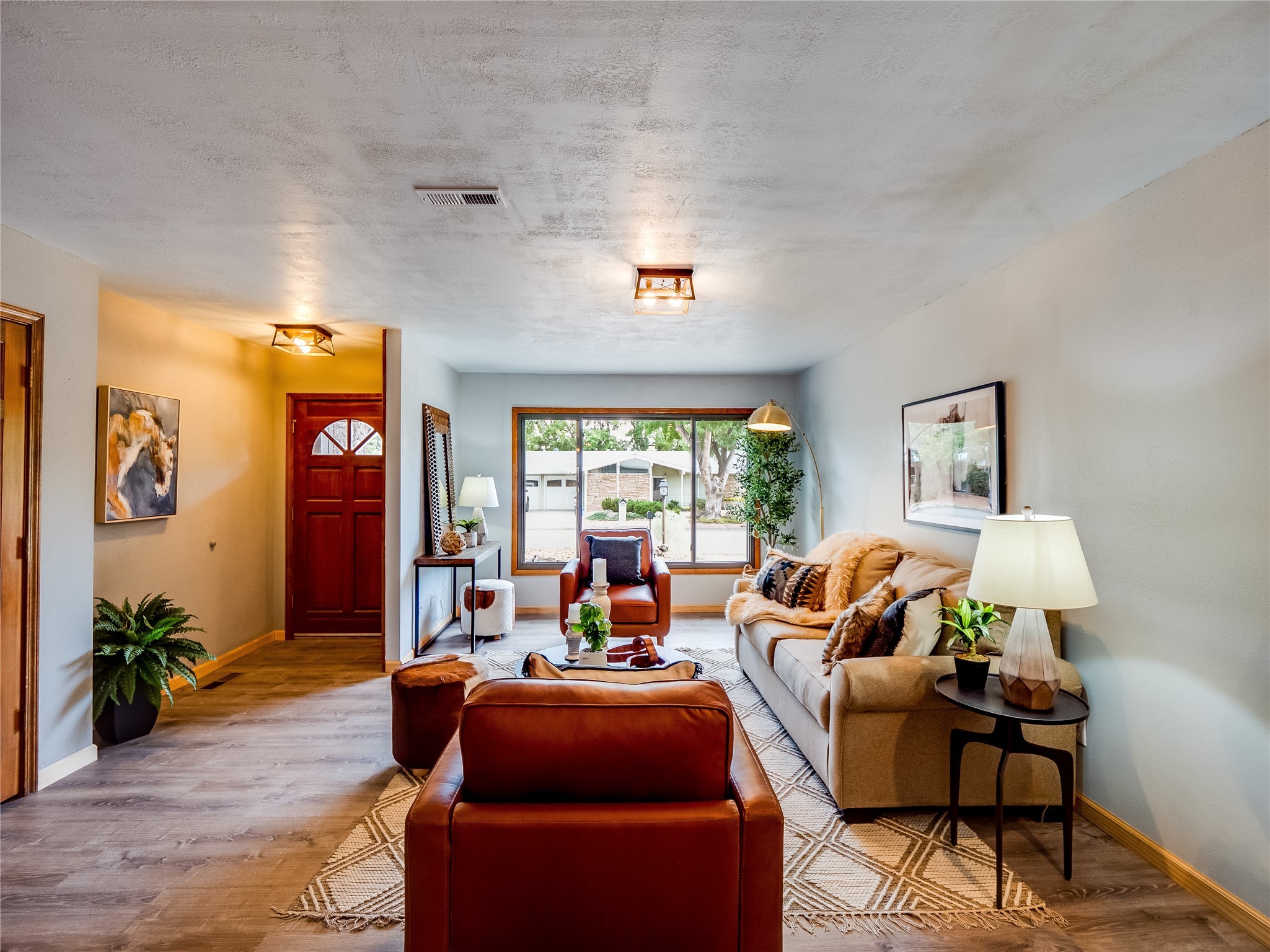 Welcome to this beautifully updated single-story home in White Rock, full of character and charm. Nestled under a mature shade tree, the low-maintenance front yard offers a warm and inviting curb appeal. Step inside through the front entrance and into the open-concept living room featuring laminate wood floors and a large front-facing picture window that fills the space with natural light. The adjoining dining area leads into the galley-style kitchen, which offers an abundance of wood cabinetry, extensive counter space, and stainless steel appliances--ideal for any home chef. A convenient pass-through window opens into the spacious family room, creating great flow for entertaining and daily living. The family room is the heart of the home, boasting a wood-beamed ceiling with a skylight, a beautiful brick accent wall, and a cozy stone wood-burning fireplace. This room also includes access to the backyard and a large covered patio, plus a laundry room discreetly tucked away for added functionality. Down the hallway are two comfortable guest bedrooms, both with plush carpeting and walk-in closets. The nearby guest bathroom includes a single sink vanity, a tiled shower/tub combo, and a skylight that brings in soft natural light. The generous primary en-suite also features carpet flooring, a large walk-in closet, and a stunningly renovated modern bathroom complete with a tiled walk-in shower with ceiling showerhead and sleek single sink vanity--a true private retreat. The expansive backyard is a xeriscaped blank canvas, ready for your dream outdoor entertainment space. A large covered deck provides the perfect shady spot to lounge or host outdoor dinner parties. Two attached storage rooms offer ample space for garden tools and seasonal items. Located near shopping, restaurants, parks, and trails, this home offers a perfect balance of comfort, convenience, and style. Don't miss your chance to tour this wonderful property today!