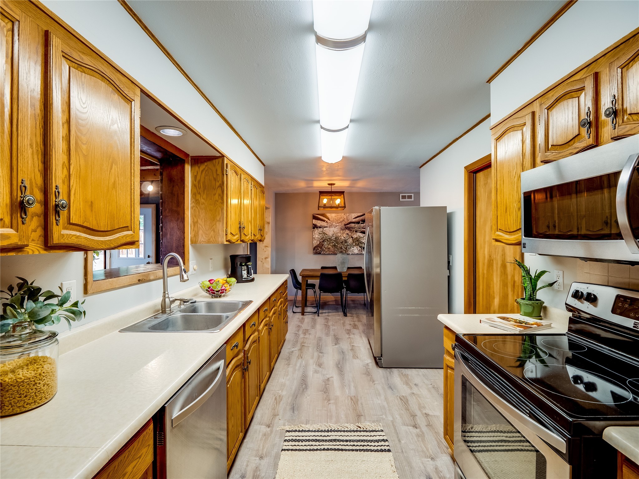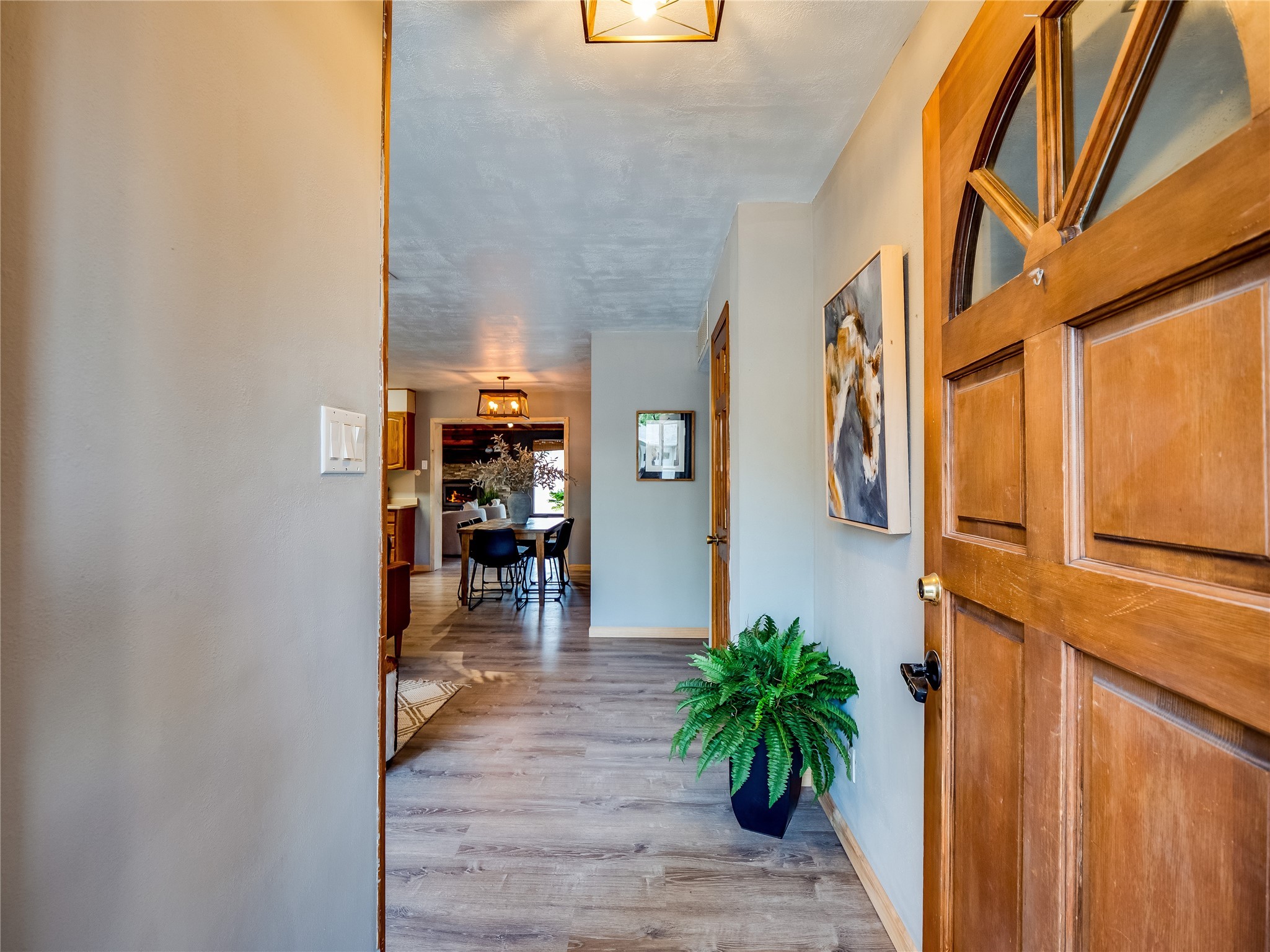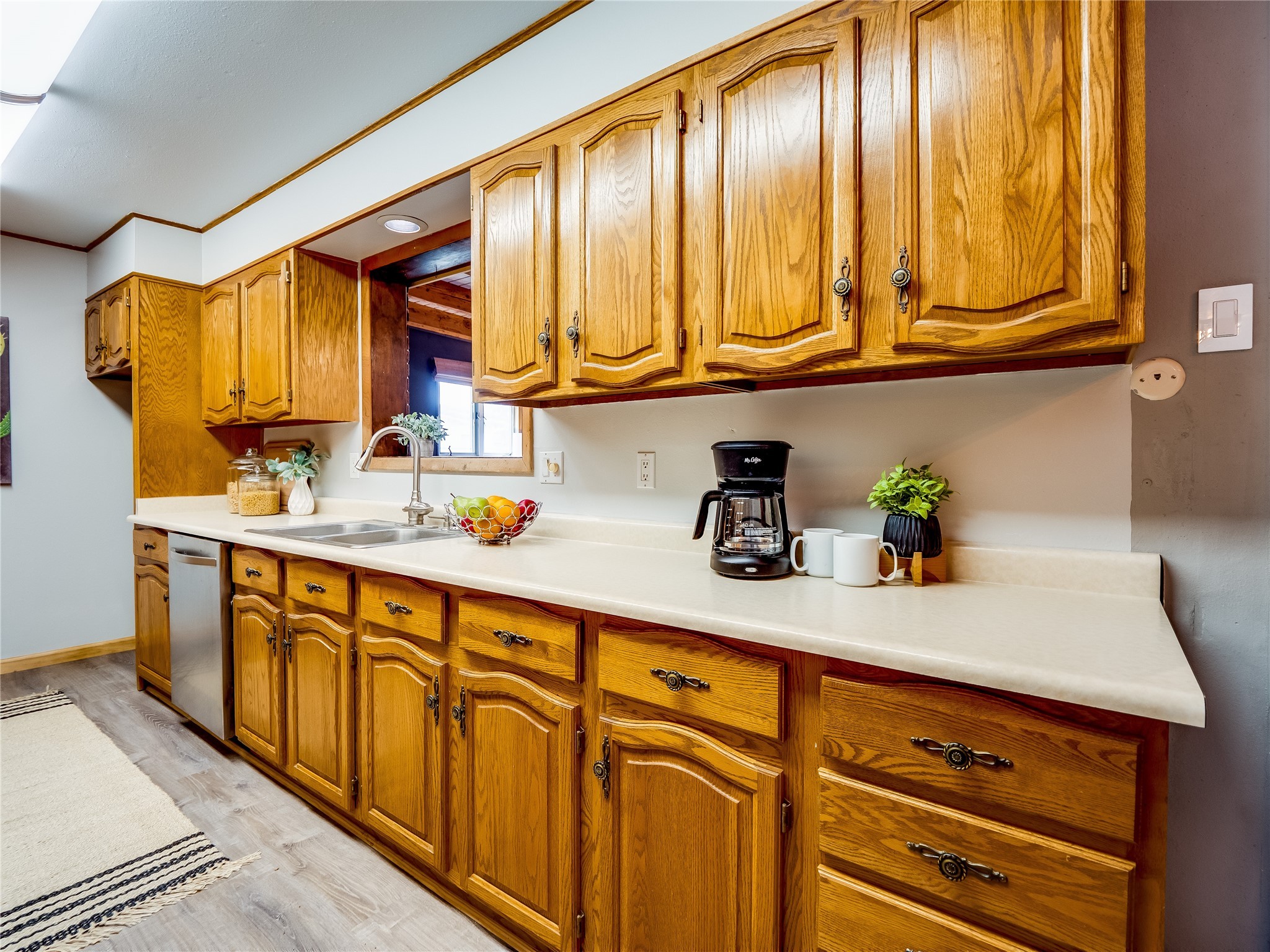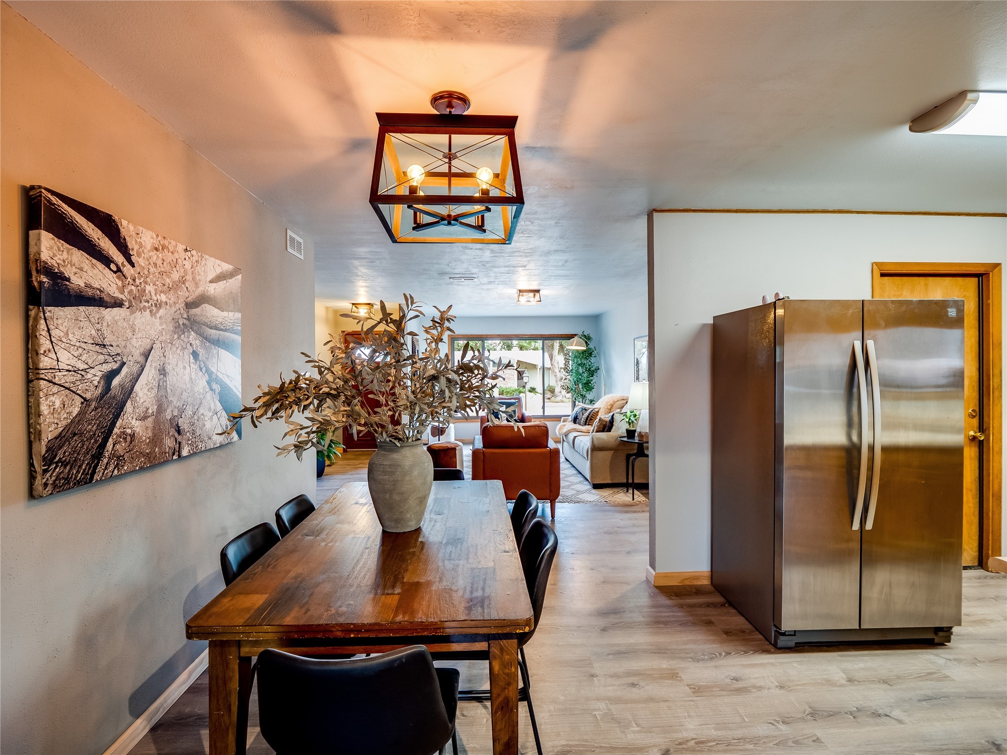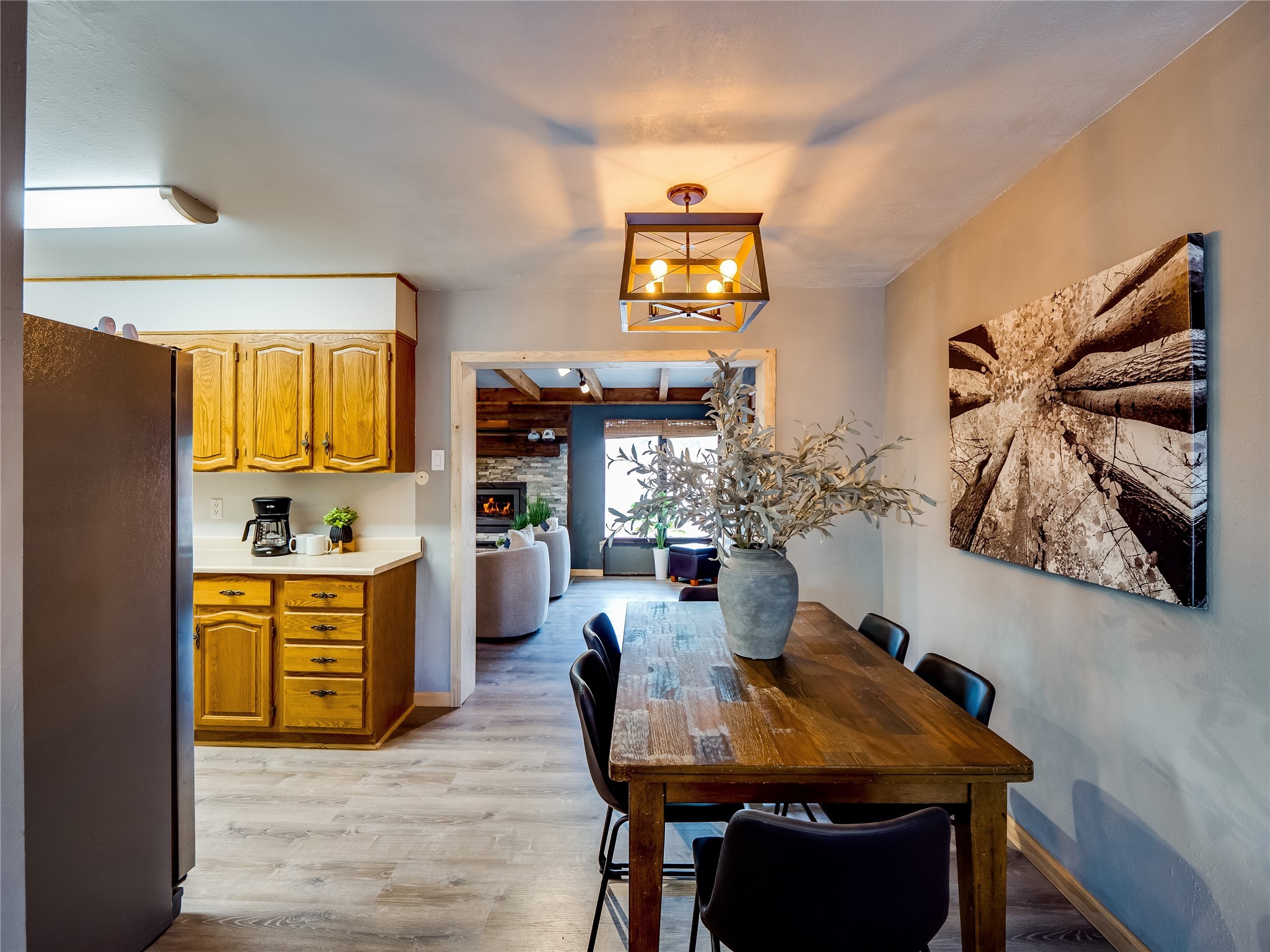 Welcome to this beautifully updated single-story home in White Rock, full of character and charm. Nestled under a mature shade tree, the low-maintenance front yard offers a warm and inviting curb appeal. Step inside through the front entrance and into the open-concept living room featuring laminate wood floors and a large front-facing picture window that fills the space with natural light. The adjoining dining area leads into the galley-style kitchen, which offers an abundance of wood cabinetry, extensive counter space, and stainless steel appliances--ideal for any home chef. A convenient pass-through window opens into the spacious family room, creating great flow for entertaining and daily living. The family room is the heart of the home, boasting a wood-beamed ceiling with a skylight, a beautiful brick accent wall, and a cozy stone wood-burning fireplace. This room also includes access to the backyard and a large covered patio, plus a laundry room discreetly tucked away for added functionality. Down the hallway are two comfortable guest bedrooms, both with plush carpeting and walk-in closets. The nearby guest bathroom includes a single sink vanity, a tiled shower/tub combo, and a skylight that brings in soft natural light. The generous primary en-suite also features carpet flooring, a large walk-in closet, and a stunningly renovated modern bathroom complete with a tiled walk-in shower with ceiling showerhead and sleek single sink vanity--a true private retreat. The expansive backyard is a xeriscaped blank canvas, ready for your dream outdoor entertainment space. A large covered deck provides the perfect shady spot to lounge or host outdoor dinner parties. Two attached storage rooms offer ample space for garden tools and seasonal items. Located near shopping, restaurants, parks, and trails, this home offers a perfect balance of comfort, convenience, and style. Don't miss your chance to tour this wonderful property today!