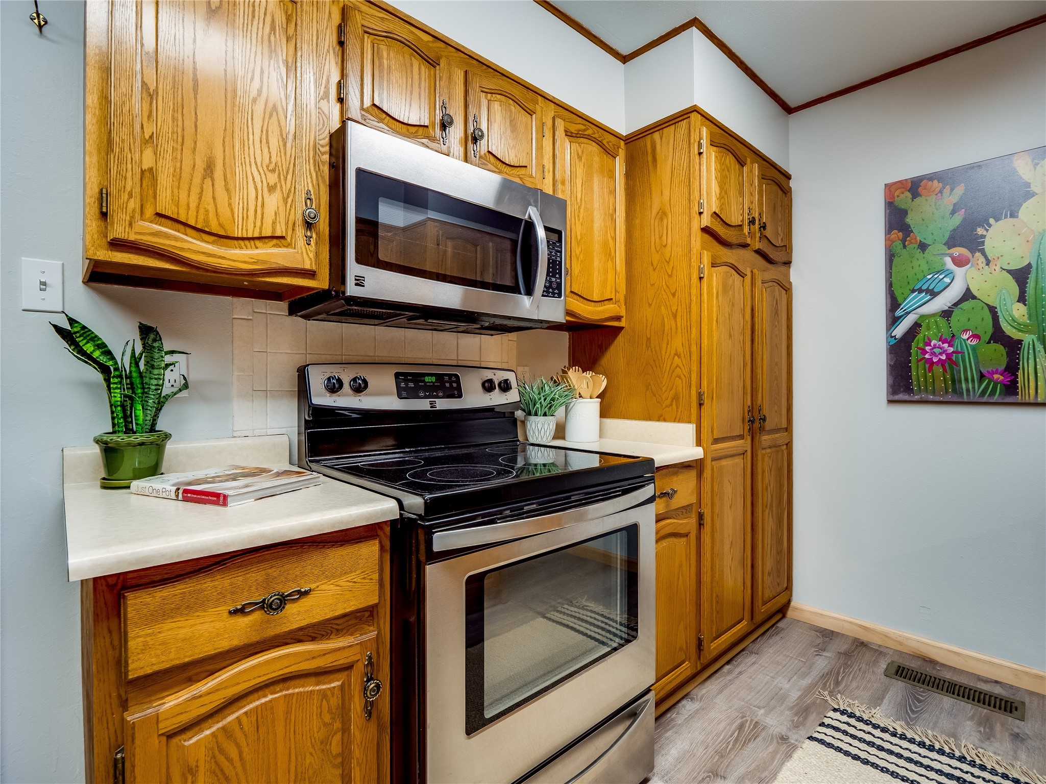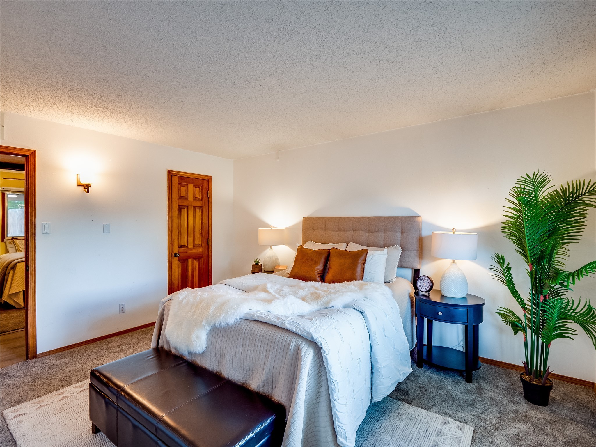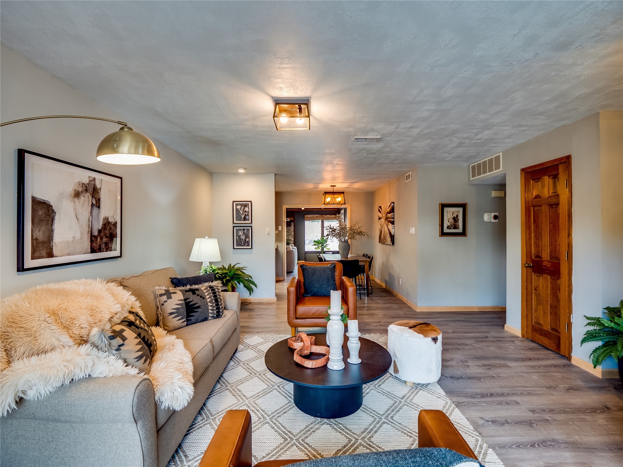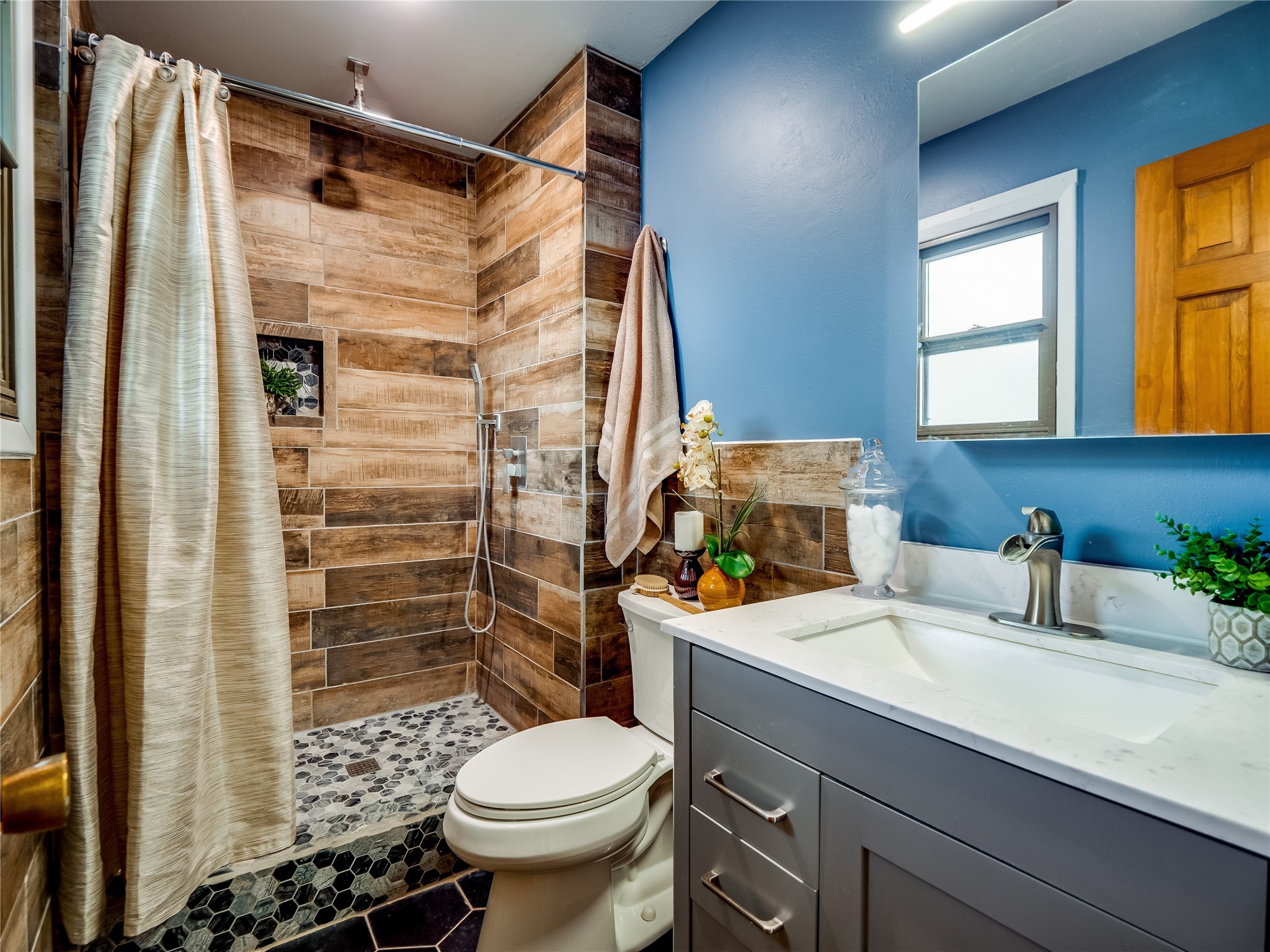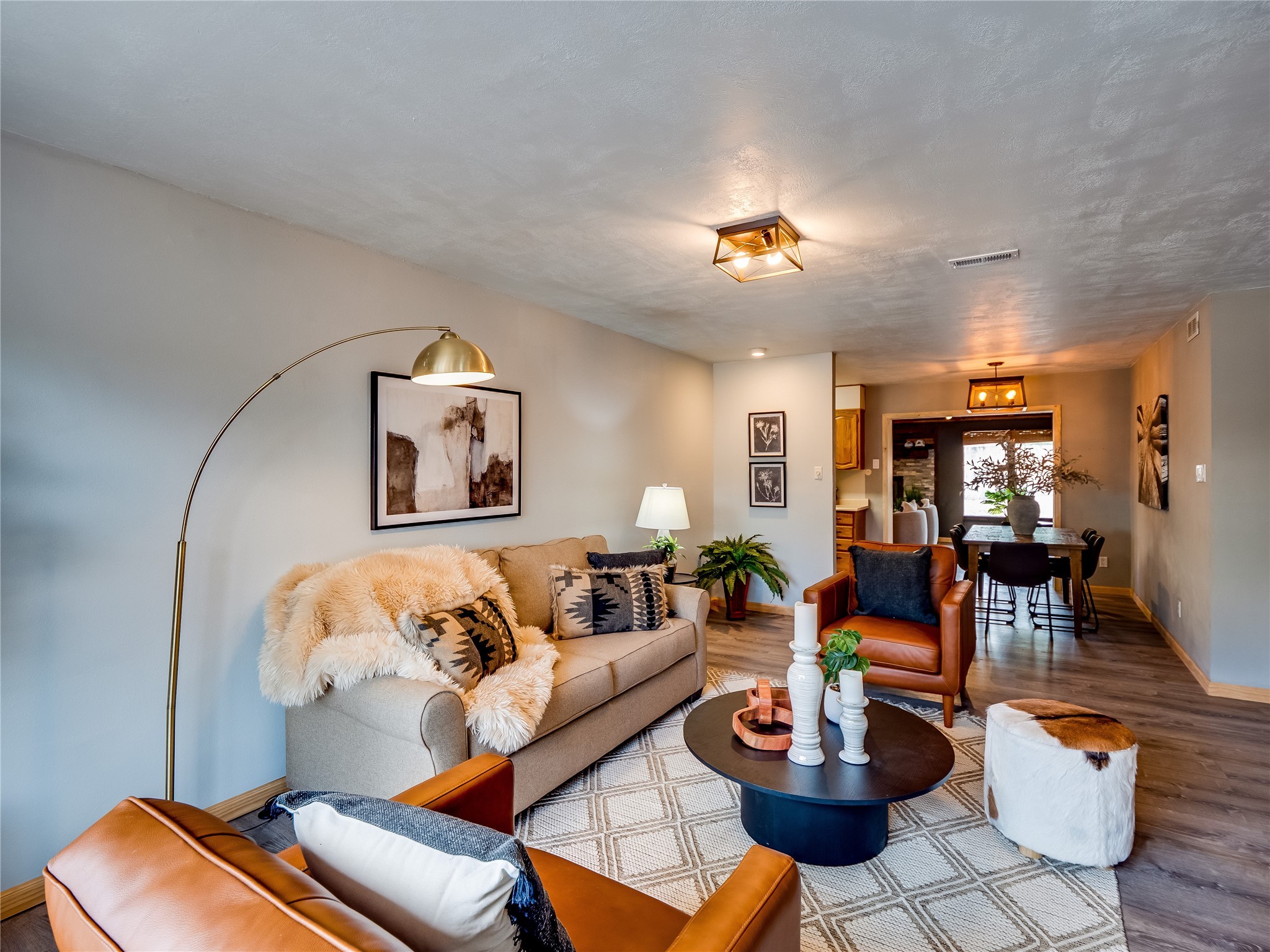 Welcome to this beautifully updated single-story home in White Rock, full of character and charm. Nestled under a mature shade tree, the low-maintenance front yard offers a warm and inviting curb appeal. Step inside through the front entrance and into the open-concept living room featuring laminate wood floors and a large front-facing picture window that fills the space with natural light. The adjoining dining area leads into the galley-style kitchen, which offers an abundance of wood cabinetry, extensive counter space, and stainless steel appliances--ideal for any home chef. A convenient pass-through window opens into the spacious family room, creating great flow for entertaining and daily living. The family room is the heart of the home, boasting a wood-beamed ceiling with a skylight, a beautiful brick accent wall, and a cozy stone wood-burning fireplace. This room also includes access to the backyard and a large covered patio, plus a laundry room discreetly tucked away for added functionality. Down the hallway are two comfortable guest bedrooms, both with plush carpeting and walk-in closets. The nearby guest bathroom includes a single sink vanity, a tiled shower/tub combo, and a skylight that brings in soft natural light. The generous primary en-suite also features carpet flooring, a large walk-in closet, and a stunningly renovated modern bathroom complete with a tiled walk-in shower with ceiling showerhead and sleek single sink vanity--a true private retreat. The expansive backyard is a xeriscaped blank canvas, ready for your dream outdoor entertainment space. A large covered deck provides the perfect shady spot to lounge or host outdoor dinner parties. Two attached storage rooms offer ample space for garden tools and seasonal items. Located near shopping, restaurants, parks, and trails, this home offers a perfect balance of comfort, convenience, and style. Don't miss your chance to tour this wonderful property today!