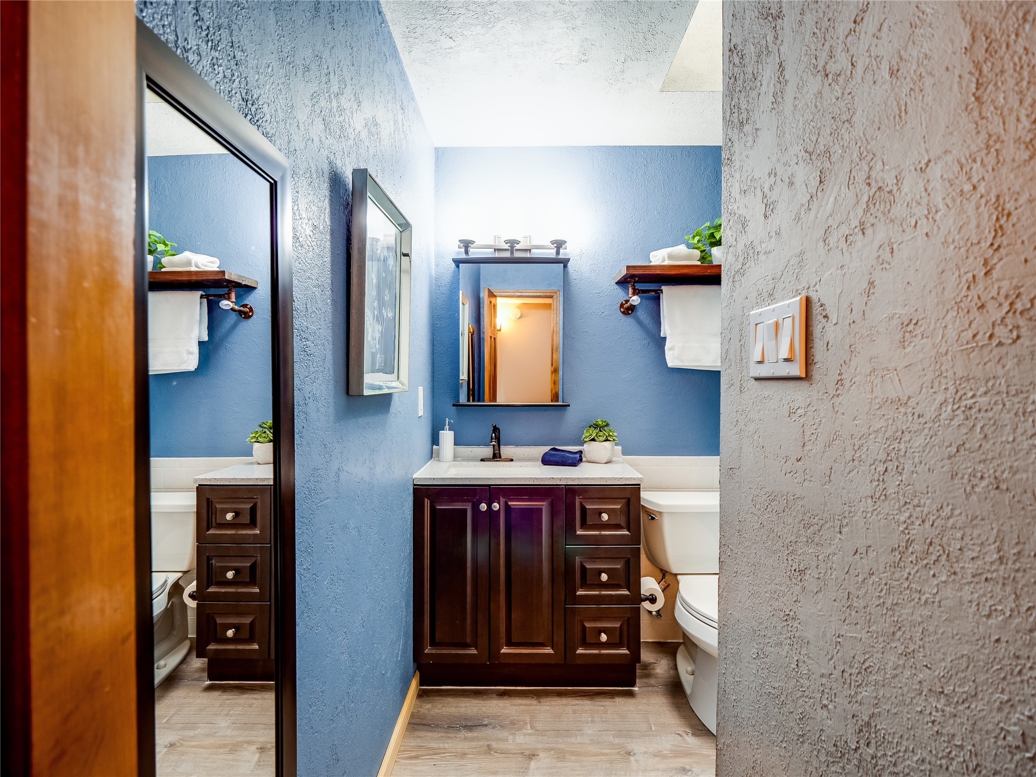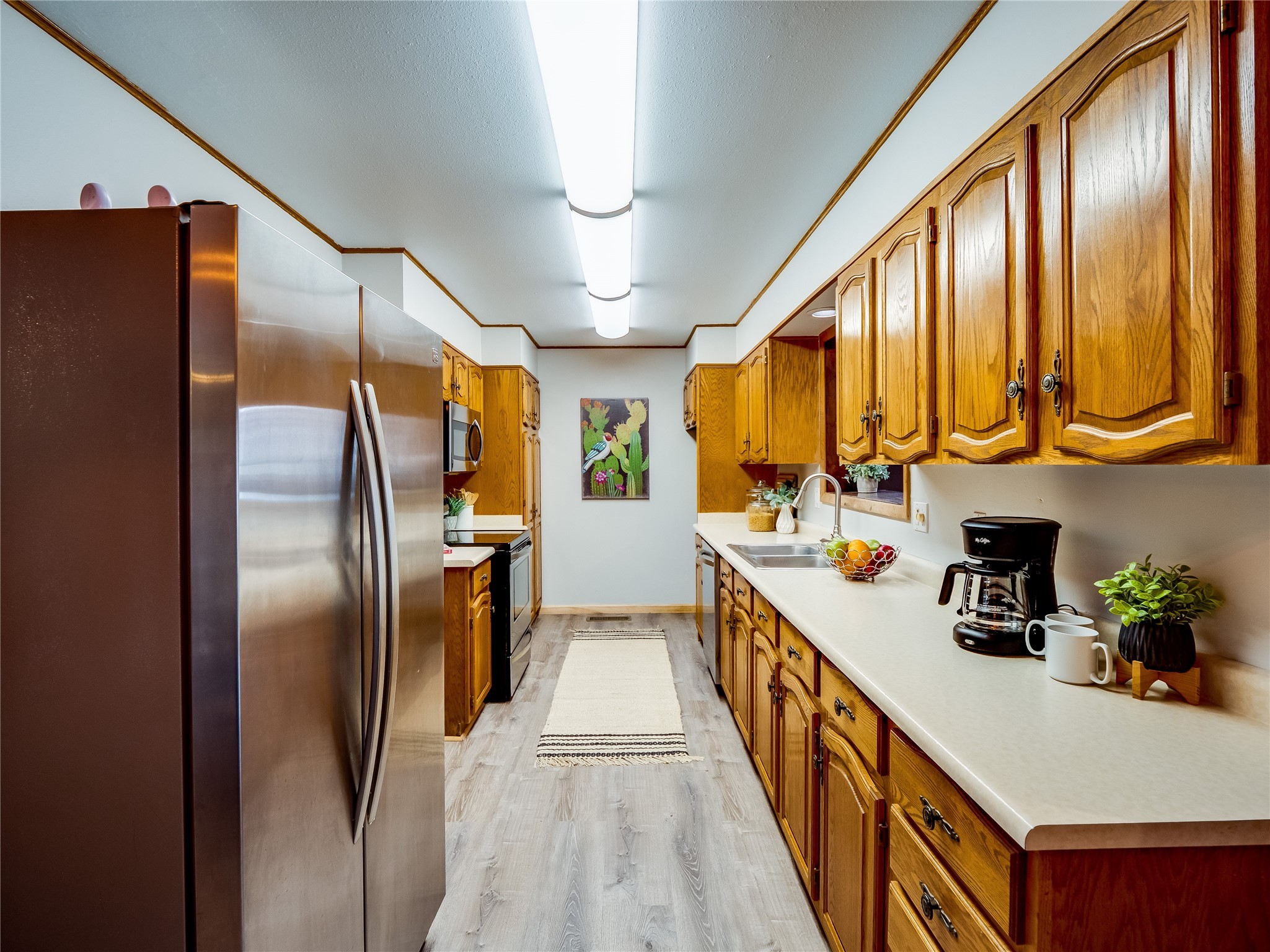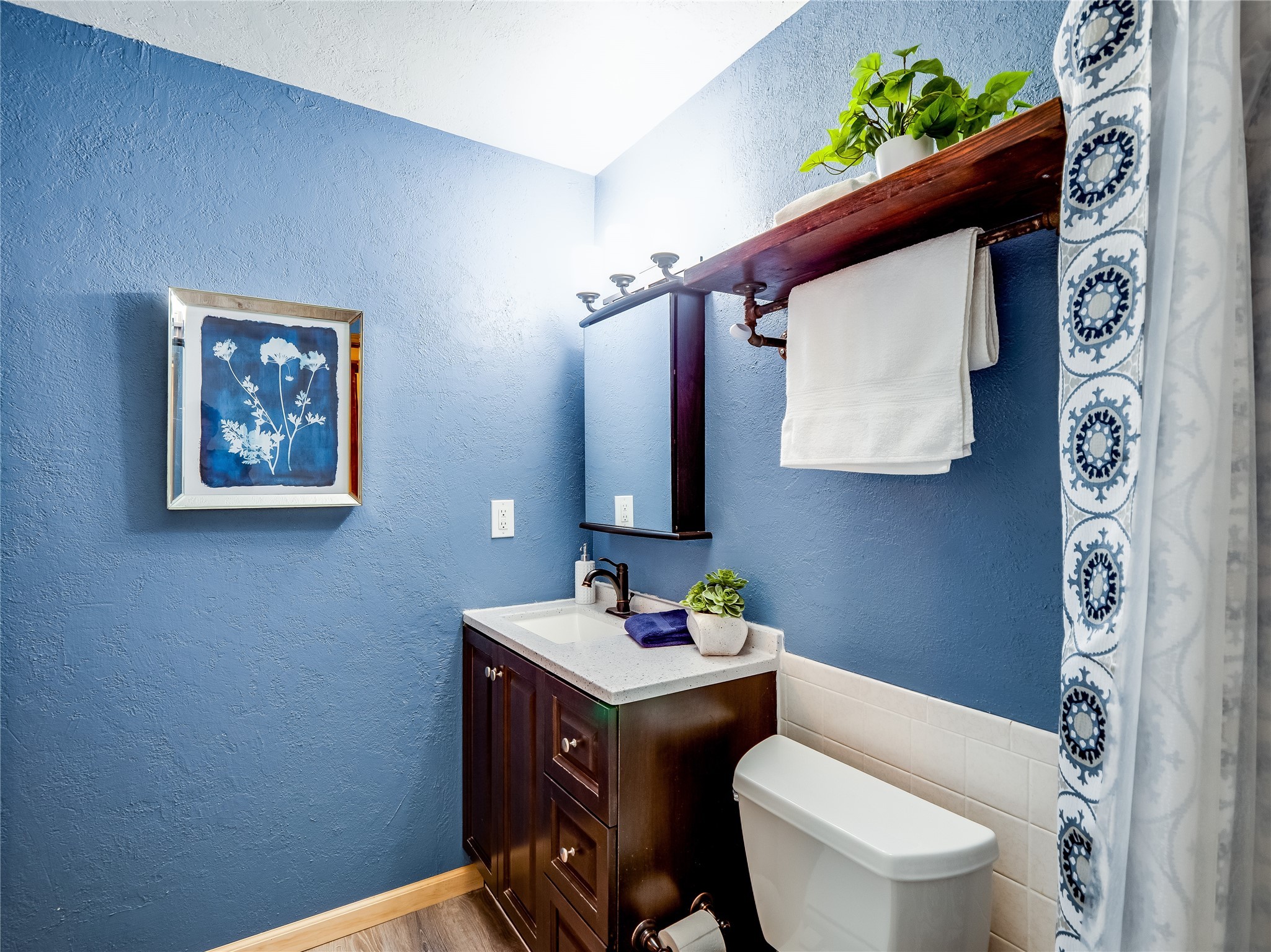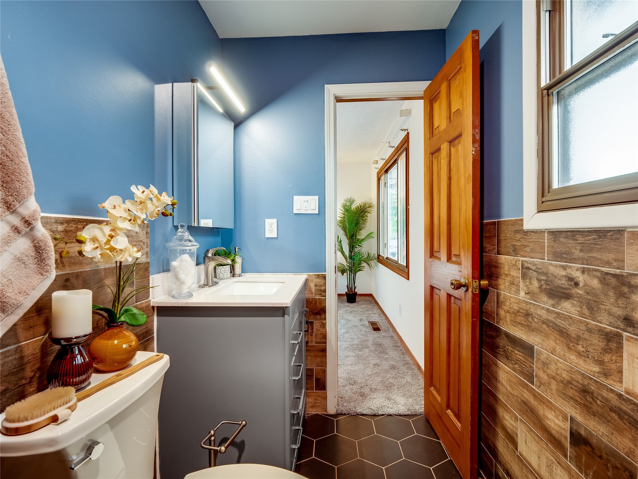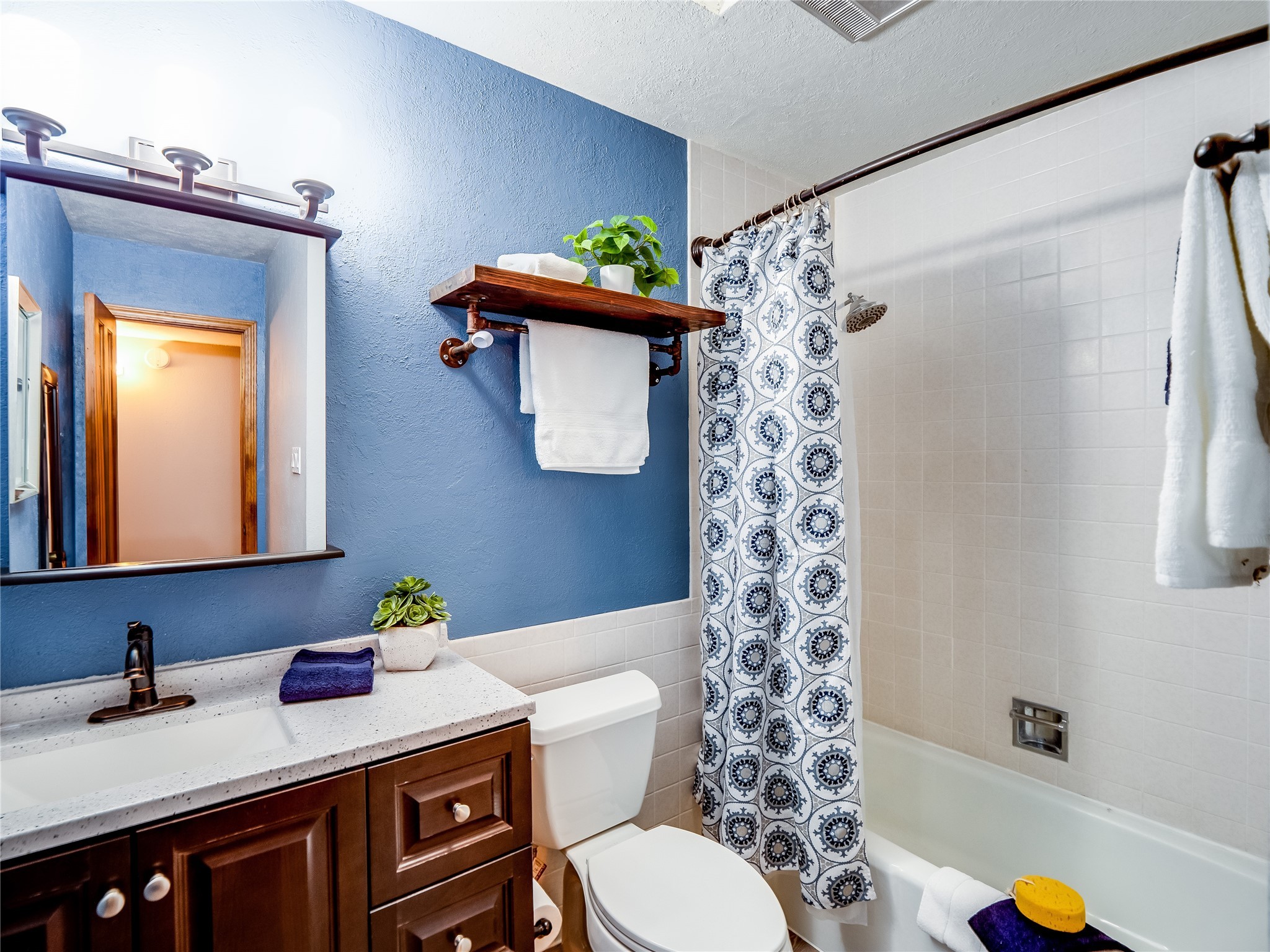 Welcome to this beautifully updated single-story home in White Rock, full of character and charm. Nestled under a mature shade tree, the low-maintenance front yard offers a warm and inviting curb appeal. Step inside through the front entrance and into the open-concept living room featuring laminate wood floors and a large front-facing picture window that fills the space with natural light. The adjoining dining area leads into the galley-style kitchen, which offers an abundance of wood cabinetry, extensive counter space, and stainless steel appliances--ideal for any home chef. A convenient pass-through window opens into the spacious family room, creating great flow for entertaining and daily living. The family room is the heart of the home, boasting a wood-beamed ceiling with a skylight, a beautiful brick accent wall, and a cozy stone wood-burning fireplace. This room also includes access to the backyard and a large covered patio, plus a laundry room discreetly tucked away for added functionality. Down the hallway are two comfortable guest bedrooms, both with plush carpeting and walk-in closets. The nearby guest bathroom includes a single sink vanity, a tiled shower/tub combo, and a skylight that brings in soft natural light. The generous primary en-suite also features carpet flooring, a large walk-in closet, and a stunningly renovated modern bathroom complete with a tiled walk-in shower with ceiling showerhead and sleek single sink vanity--a true private retreat. The expansive backyard is a xeriscaped blank canvas, ready for your dream outdoor entertainment space. A large covered deck provides the perfect shady spot to lounge or host outdoor dinner parties. Two attached storage rooms offer ample space for garden tools and seasonal items. Located near shopping, restaurants, parks, and trails, this home offers a perfect balance of comfort, convenience, and style. Don't miss your chance to tour this wonderful property today!