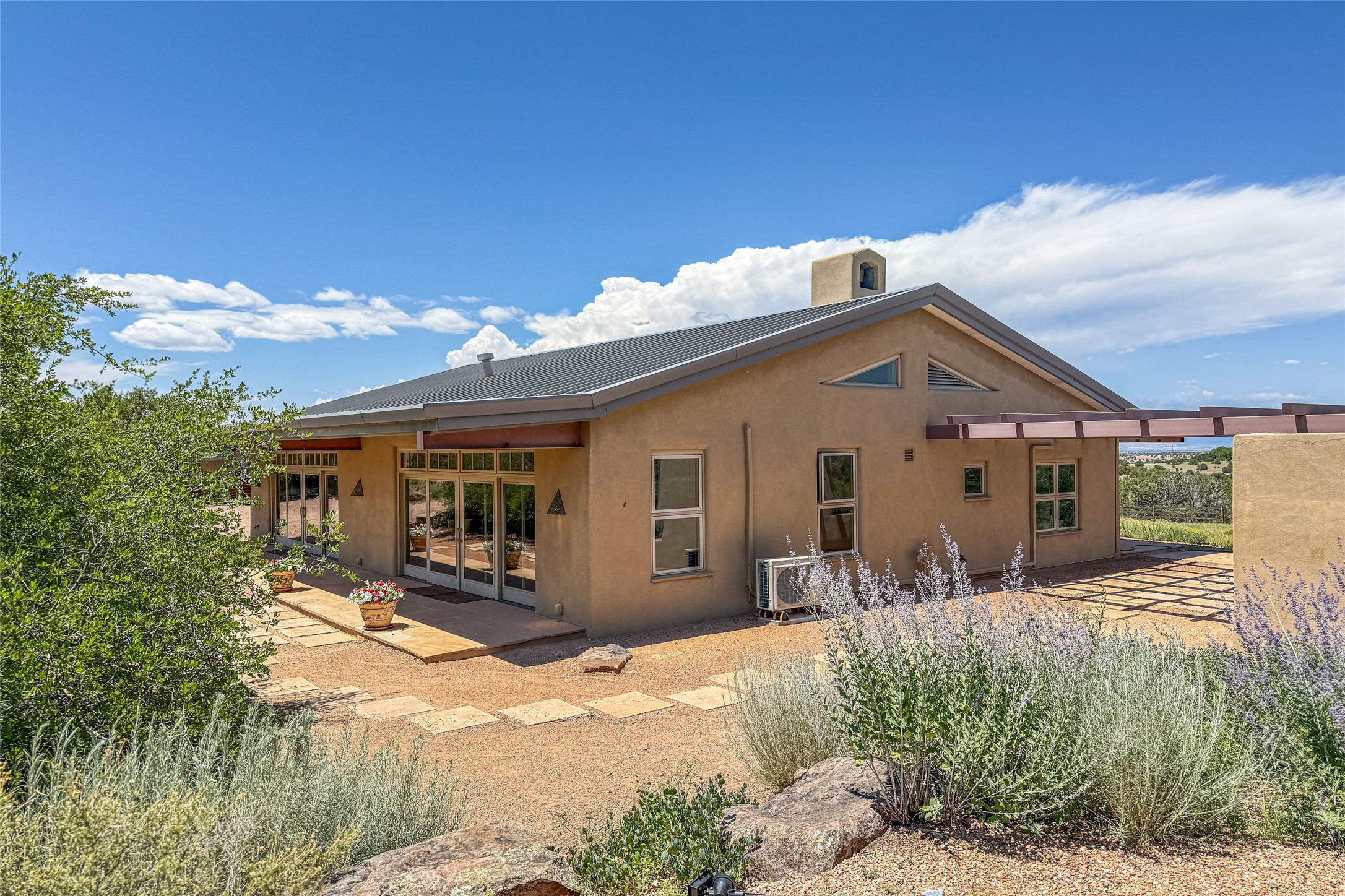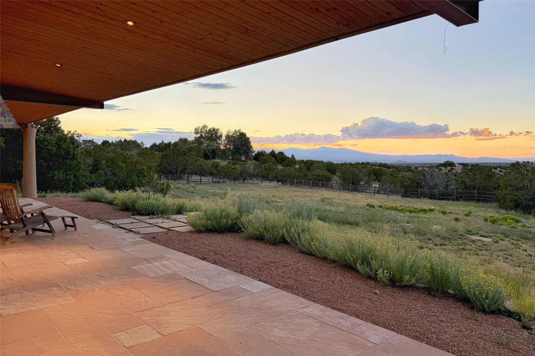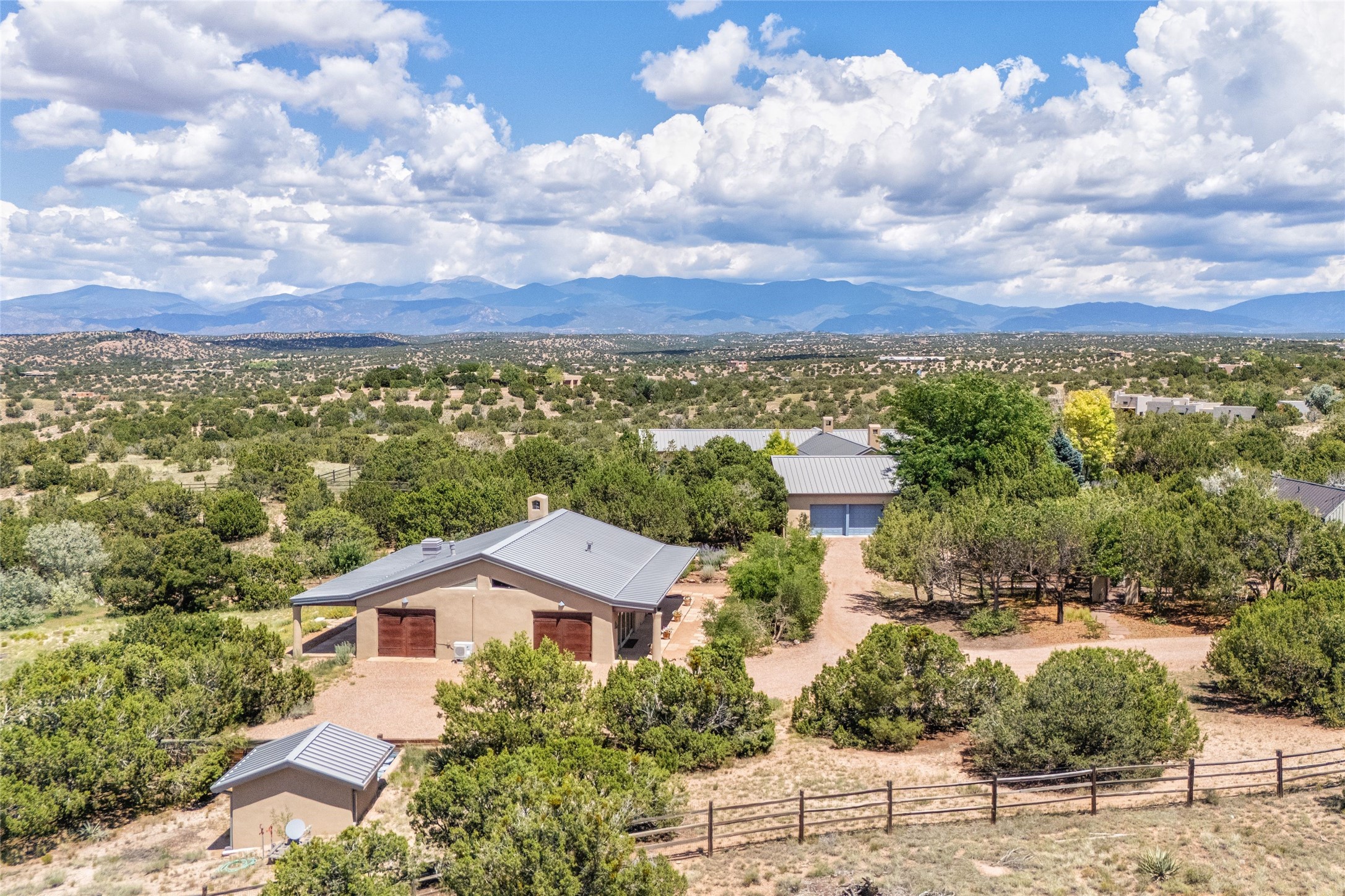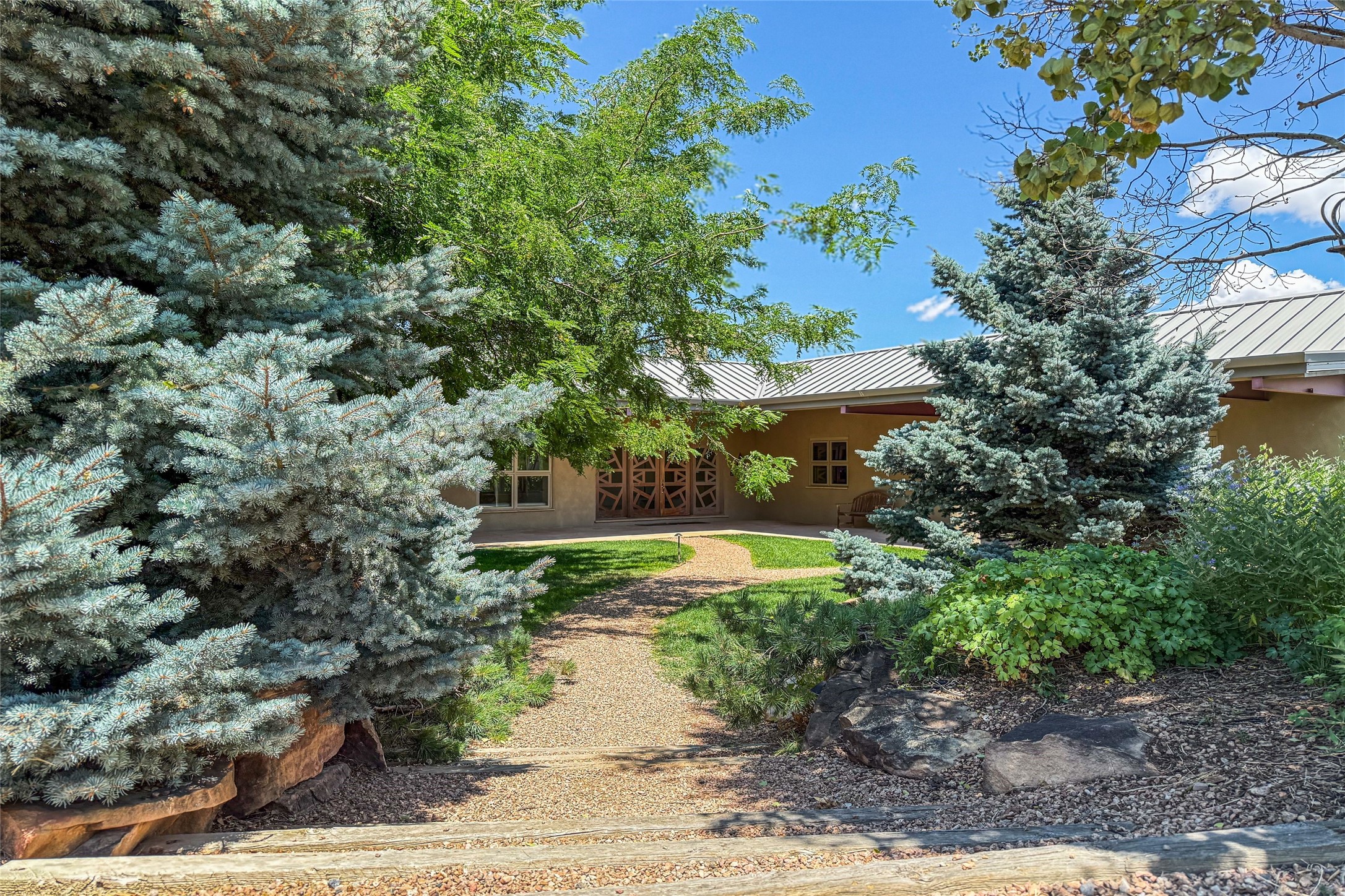 This serene La Tierra Nueva compound, with three distinct residences totaling 7,341 sq. feet of living space. Designed by renowned architect, Lila DeWindt, this lush oasis boasts mature landscaping in a serene, country-like setting with Sangre and Jemez mountain views, 11.85 acres, and vegetable and perennial gardens. The 3,982 sq. foot single level main residence features a blend of timeless Northern NM and modern design, a dramatic high-pitched roof, double-sided stone fireplace, copious natural light, andlarge windows that capture breathtaking Sangre views. With two sitting rooms, a media room and bedrooms that boast mountain views, this residence is truly stunning. Sitting in a bay window, the primary suite's tub overlooks a flower garden. An open-concept kitchen is centered around a large island, perfect for hosting.The home enjoys a portal and multiple patio spaces. The charming 1,334 sq. foot, two bedroom guest house includes a full kitchen, Saltillo tile flooring, a wood-burning stove, large windows, and wrap-around porch. The impressive 2,025 sq footmodern 1-bedroom studio has an open living/dining/kitchen area, and portal. The adult rec-room, with built-in bar, is ideal as live/work space, artist studio/music room, car enthusiast or convert to a barn. Perfect for large gatherings and relaxing with sunset Jemez views. Beneath the studio, lays a remarkable walk-in wine cellar for approx. 5000 bottles with wine tasting area. The property also includes a generous fenced dog area and room for horses.A truly peaceful, secluded atmosphere just 18 minutes from the heart of Santa Fe or the airport, and 8 minutes to The Club at Las Campanas. La Tierra Nueva is a coveted, gated, equestrian-friendly community with access to over 60,000 acres BLM land, and tennis/pickleball court. Ideal for multigenerational living, a large family, or patron of the arts, 7 Goodnight Trail West is a true hidden gem.