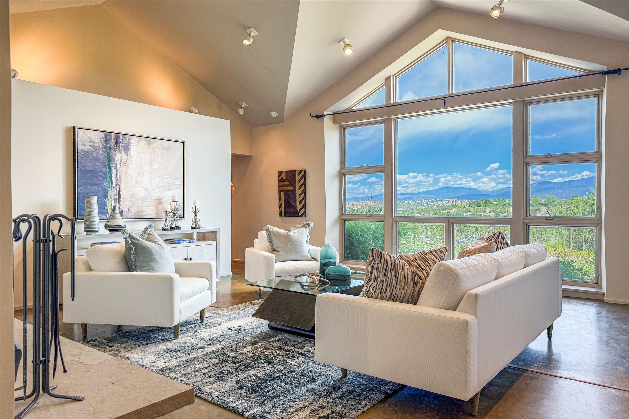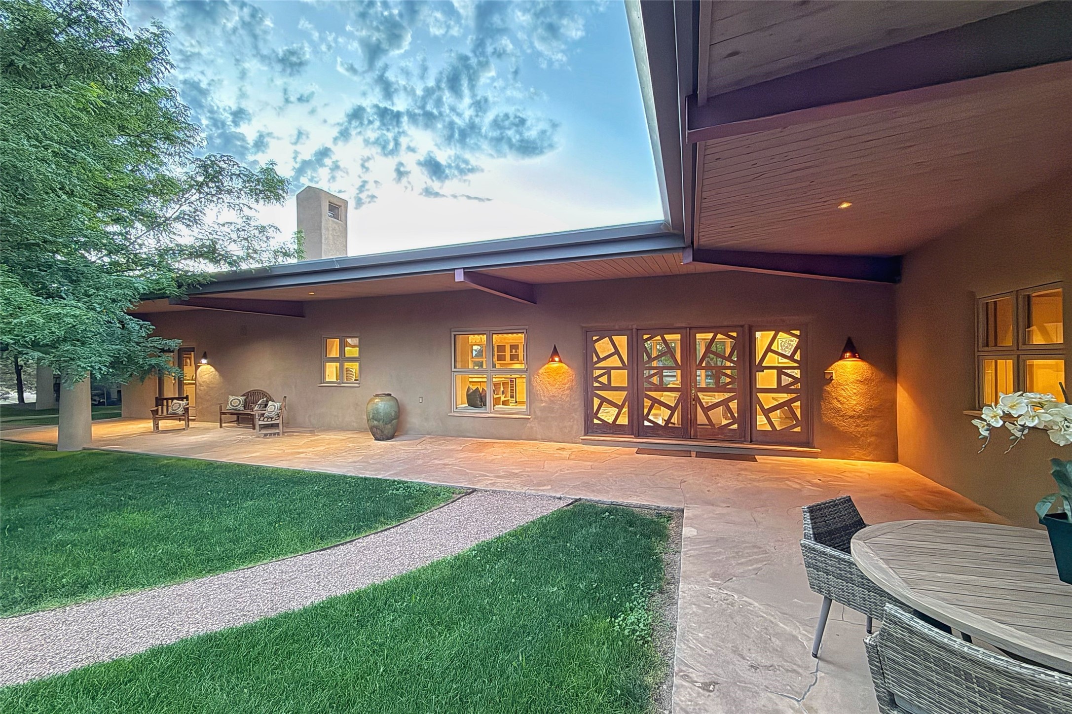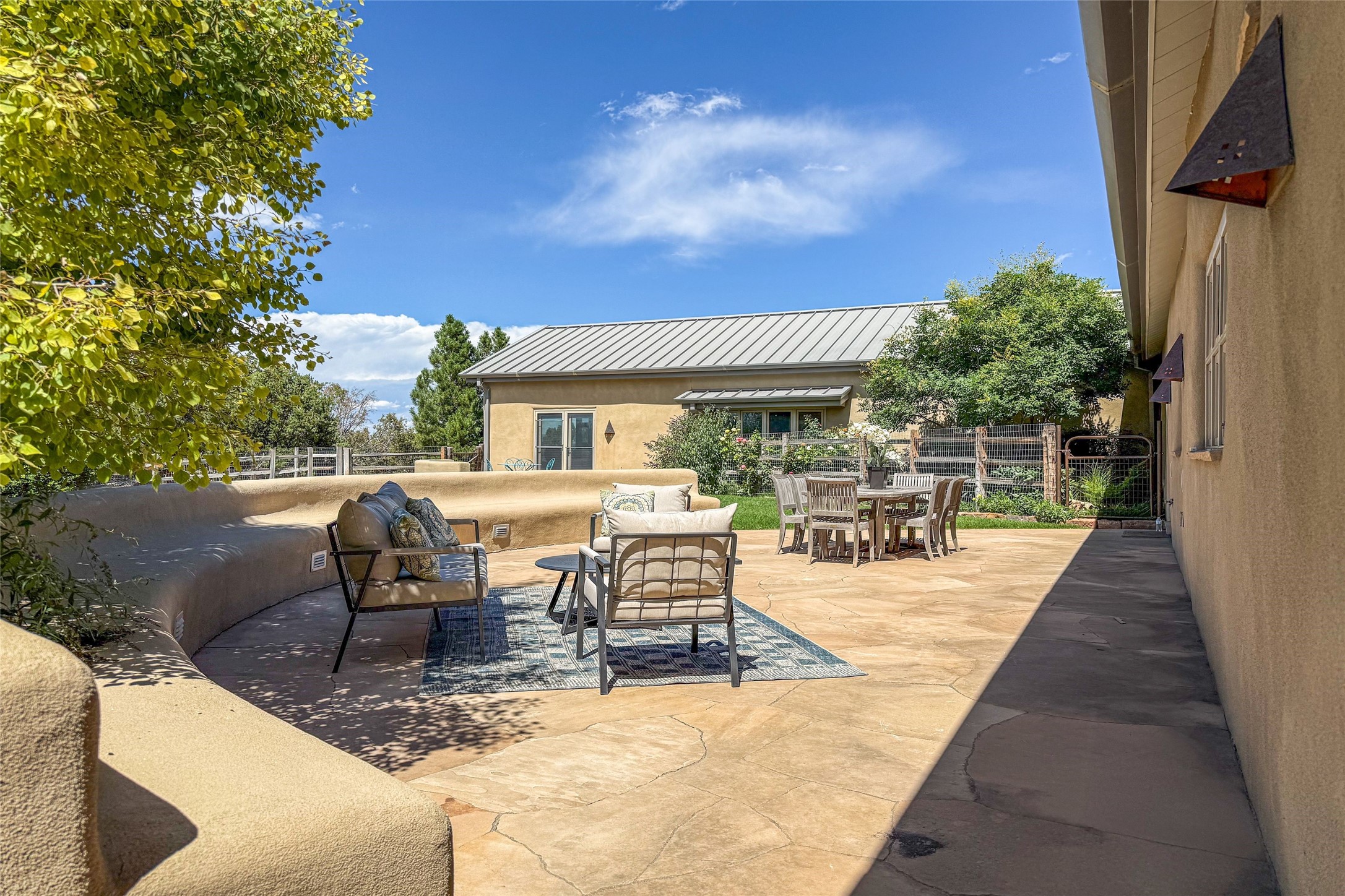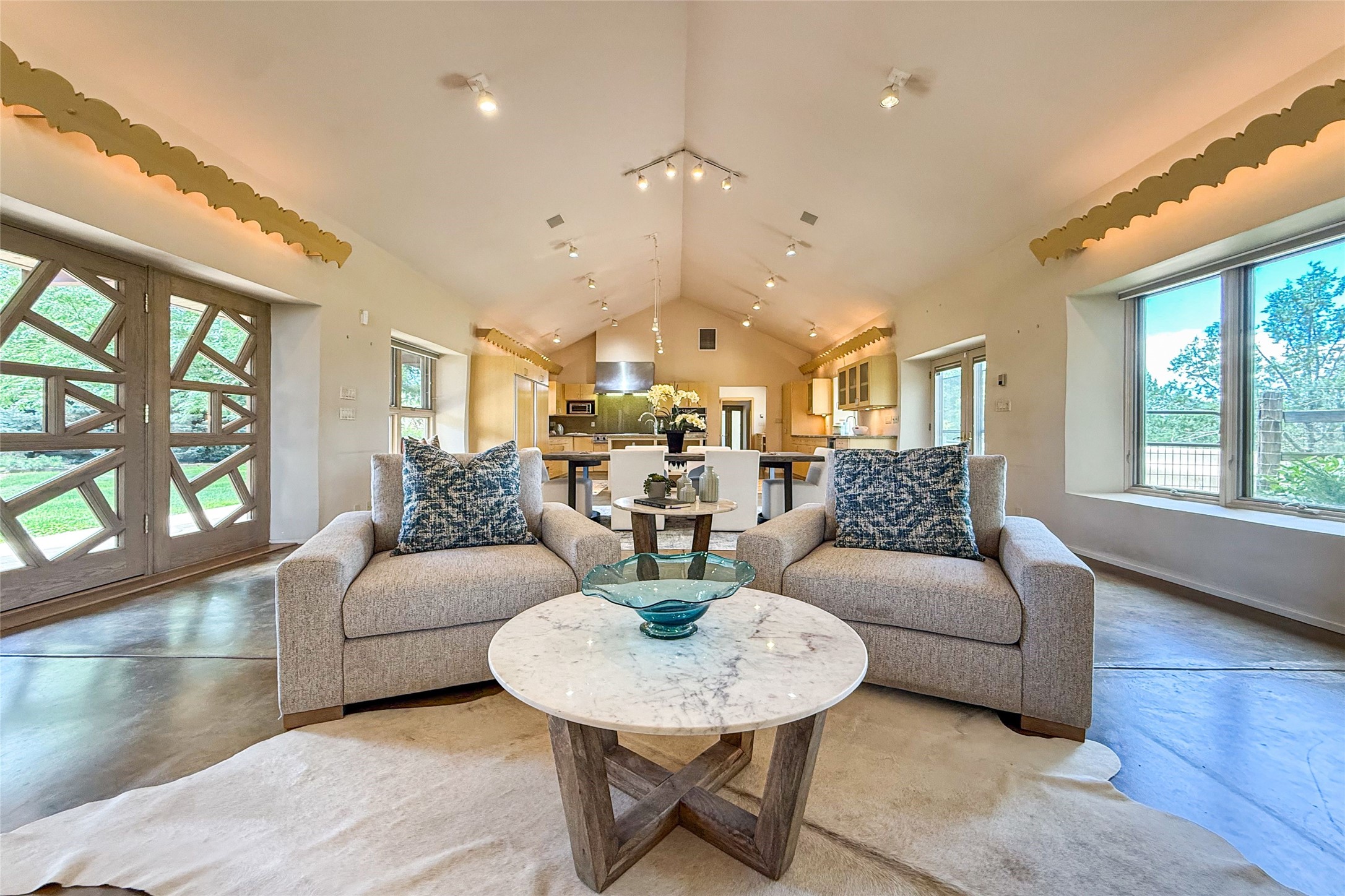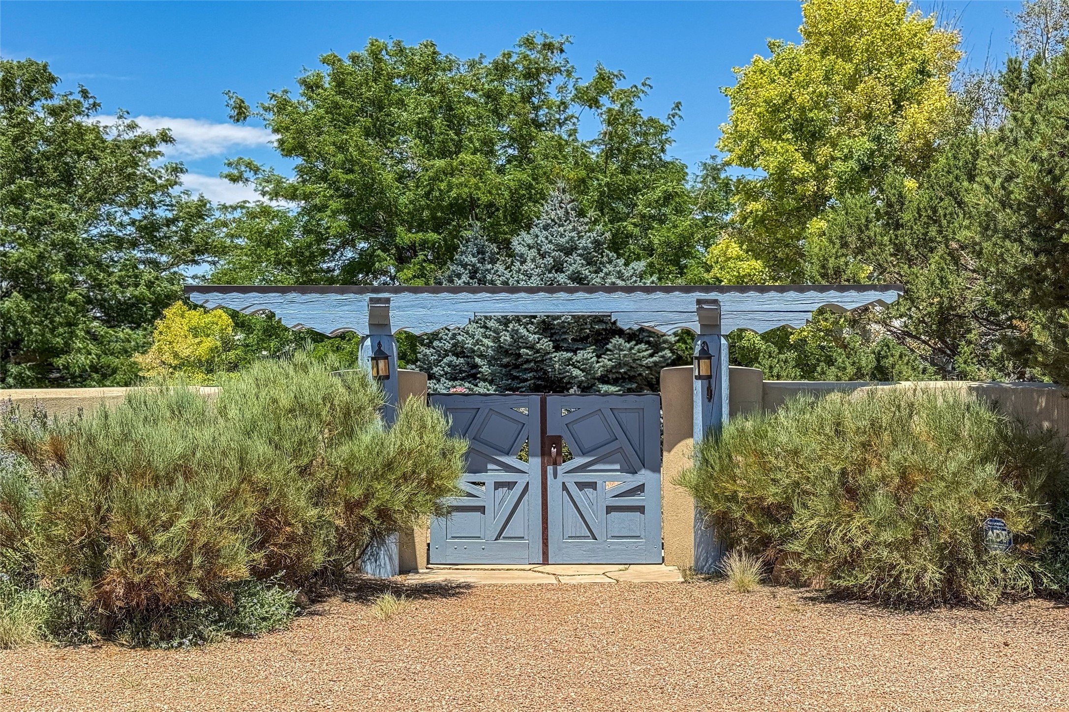 This serene La Tierra Nueva compound, with three distinct residences totaling 7,341 sq. feet of living space. Designed by renowned architect, Lila DeWindt, this lush oasis boasts mature landscaping in a serene, country-like setting with Sangre and Jemez mountain views, 11.85 acres, and vegetable and perennial gardens. The 3,982 sq. foot single level main residence features a blend of timeless Northern NM and modern design, a dramatic high-pitched roof, double-sided stone fireplace, copious natural light, andlarge windows that capture breathtaking Sangre views. With two sitting rooms, a media room and bedrooms that boast mountain views, this residence is truly stunning. Sitting in a bay window, the primary suite's tub overlooks a flower garden. An open-concept kitchen is centered around a large island, perfect for hosting.The home enjoys a portal and multiple patio spaces. The charming 1,334 sq. foot, two bedroom guest house includes a full kitchen, Saltillo tile flooring, a wood-burning stove, large windows, and wrap-around porch. The impressive 2,025 sq footmodern 1-bedroom studio has an open living/dining/kitchen area, and portal. The adult rec-room, with built-in bar, is ideal as live/work space, artist studio/music room, car enthusiast or convert to a barn. Perfect for large gatherings and relaxing with sunset Jemez views. Beneath the studio, lays a remarkable walk-in wine cellar for approx. 5000 bottles with wine tasting area. The property also includes a generous fenced dog area and room for horses.A truly peaceful, secluded atmosphere just 18 minutes from the heart of Santa Fe or the airport, and 8 minutes to The Club at Las Campanas. La Tierra Nueva is a coveted, gated, equestrian-friendly community with access to over 60,000 acres BLM land, and tennis/pickleball court. Ideal for multigenerational living, a large family, or patron of the arts, 7 Goodnight Trail West is a true hidden gem.