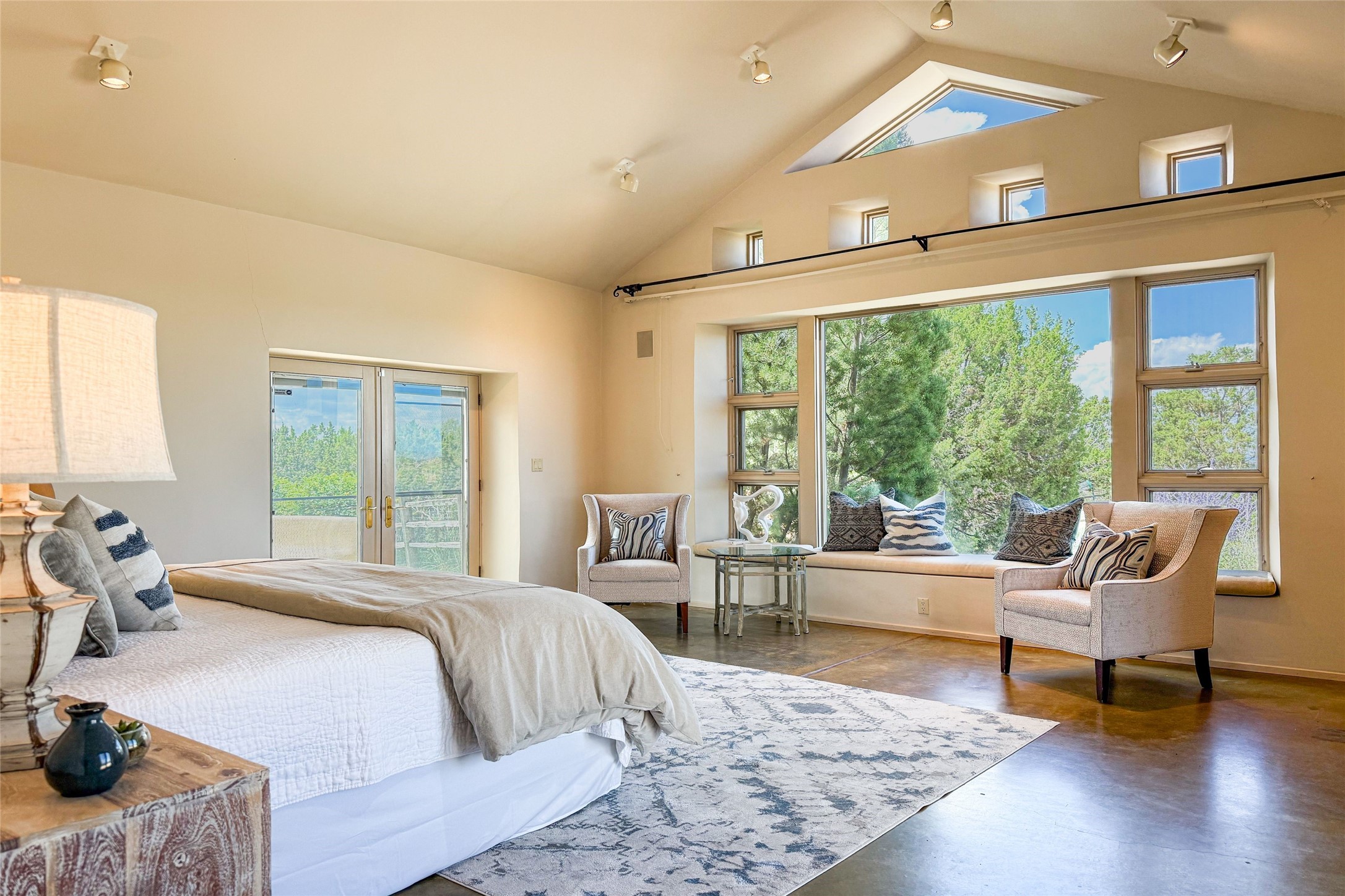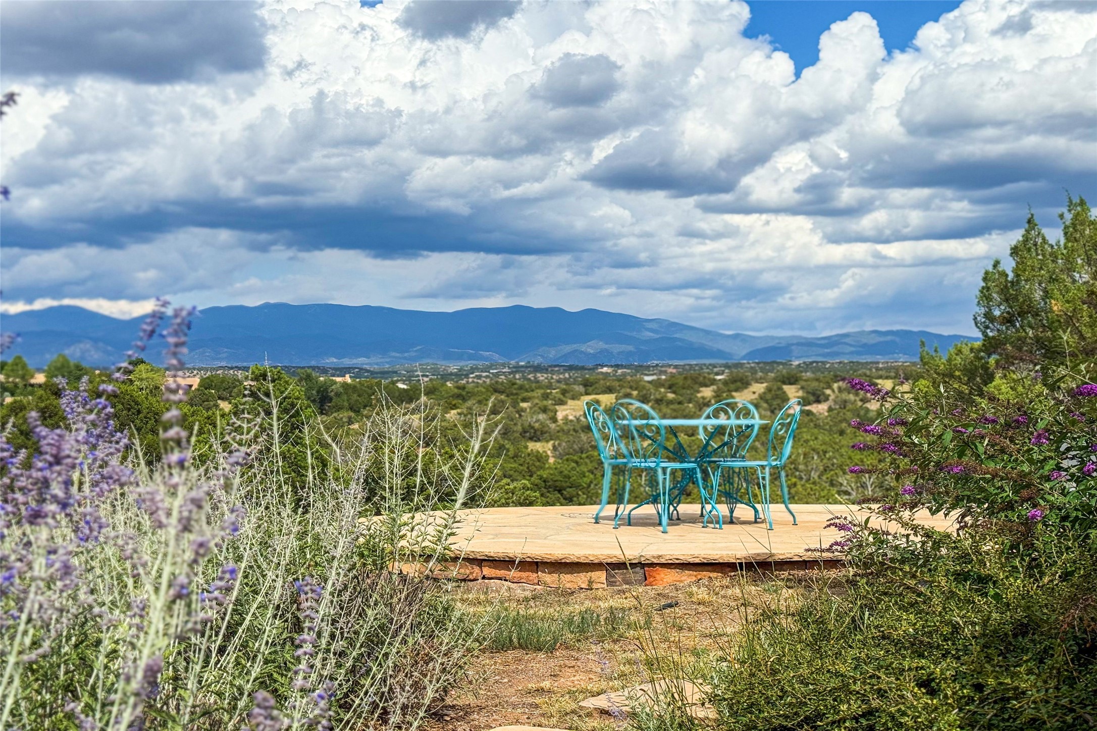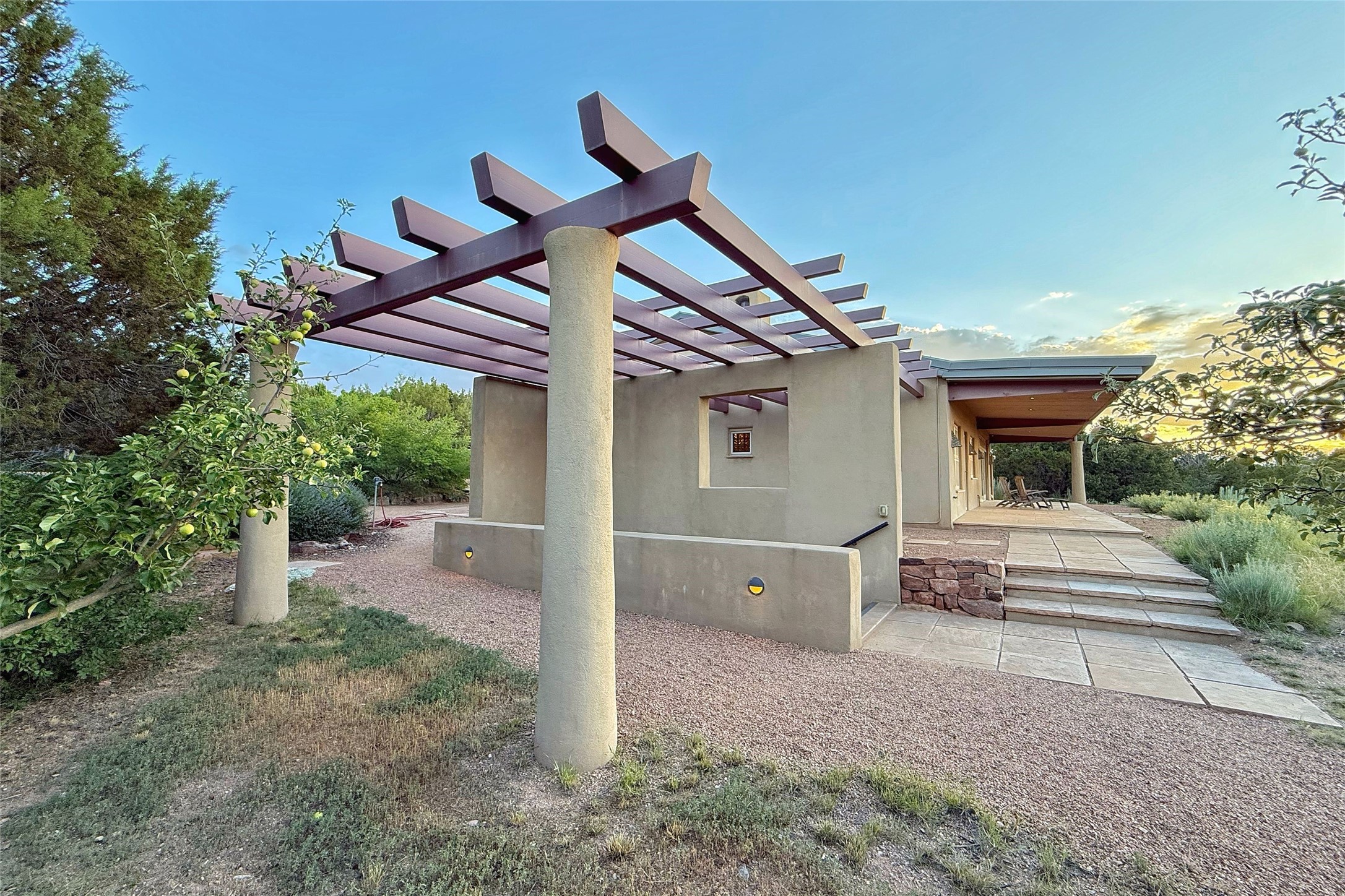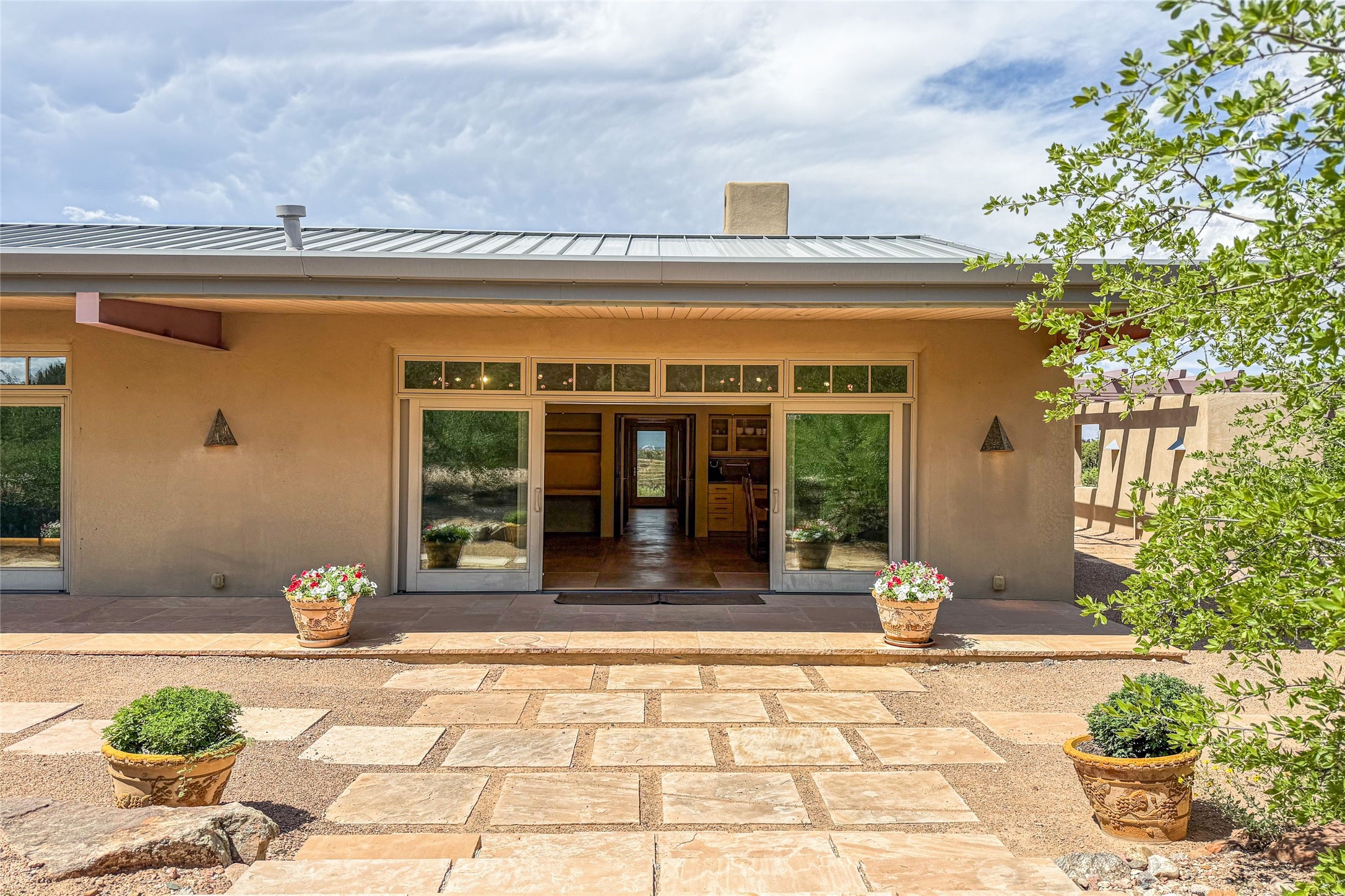 This serene La Tierra Nueva compound, with three distinct residences totaling 7,341 sq. feet of living space. Designed by renowned architect, Lila DeWindt, this lush oasis boasts mature landscaping in a serene, country-like setting with Sangre and Jemez mountain views, 11.85 acres, and vegetable and perennial gardens. The 3,982 sq. foot single level main residence features a blend of timeless Northern NM and modern design, a dramatic high-pitched roof, double-sided stone fireplace, copious natural light, andlarge windows that capture breathtaking Sangre views. With two sitting rooms, a media room and bedrooms that boast mountain views, this residence is truly stunning. Sitting in a bay window, the primary suite's tub overlooks a flower garden. An open-concept kitchen is centered around a large island, perfect for hosting.The home enjoys a portal and multiple patio spaces. The charming 1,334 sq. foot, two bedroom guest house includes a full kitchen, Saltillo tile flooring, a wood-burning stove, large windows, and wrap-around porch. The impressive 2,025 sq footmodern 1-bedroom studio has an open living/dining/kitchen area, and portal. The adult rec-room, with built-in bar, is ideal as live/work space, artist studio/music room, car enthusiast or convert to a barn. Perfect for large gatherings and relaxing with sunset Jemez views. Beneath the studio, lays a remarkable walk-in wine cellar for approx. 5000 bottles with wine tasting area. The property also includes a generous fenced dog area and room for horses.A truly peaceful, secluded atmosphere just 18 minutes from the heart of Santa Fe or the airport, and 8 minutes to The Club at Las Campanas. La Tierra Nueva is a coveted, gated, equestrian-friendly community with access to over 60,000 acres BLM land, and tennis/pickleball court. Ideal for multigenerational living, a large family, or patron of the arts, 7 Goodnight Trail West is a true hidden gem.