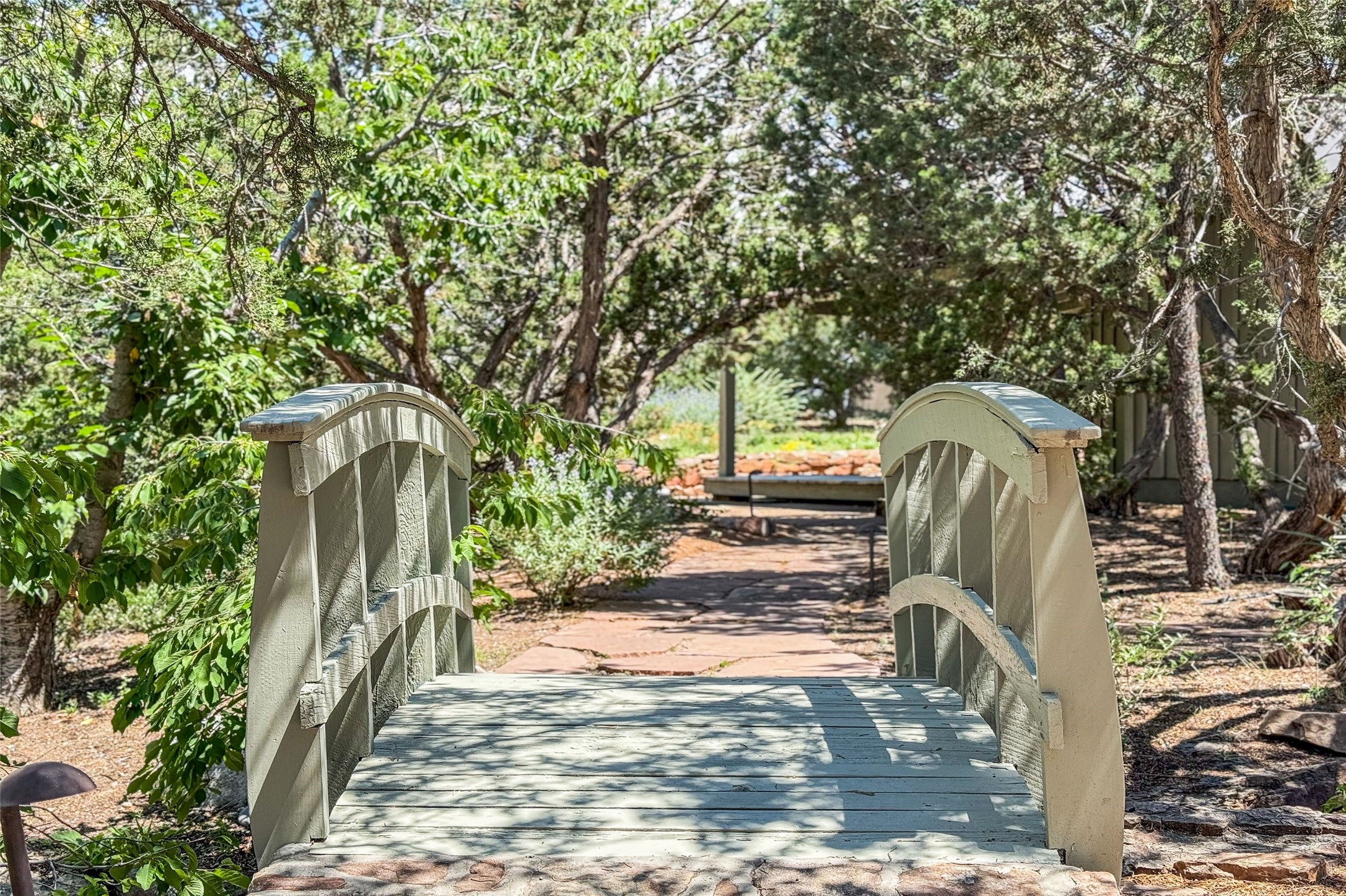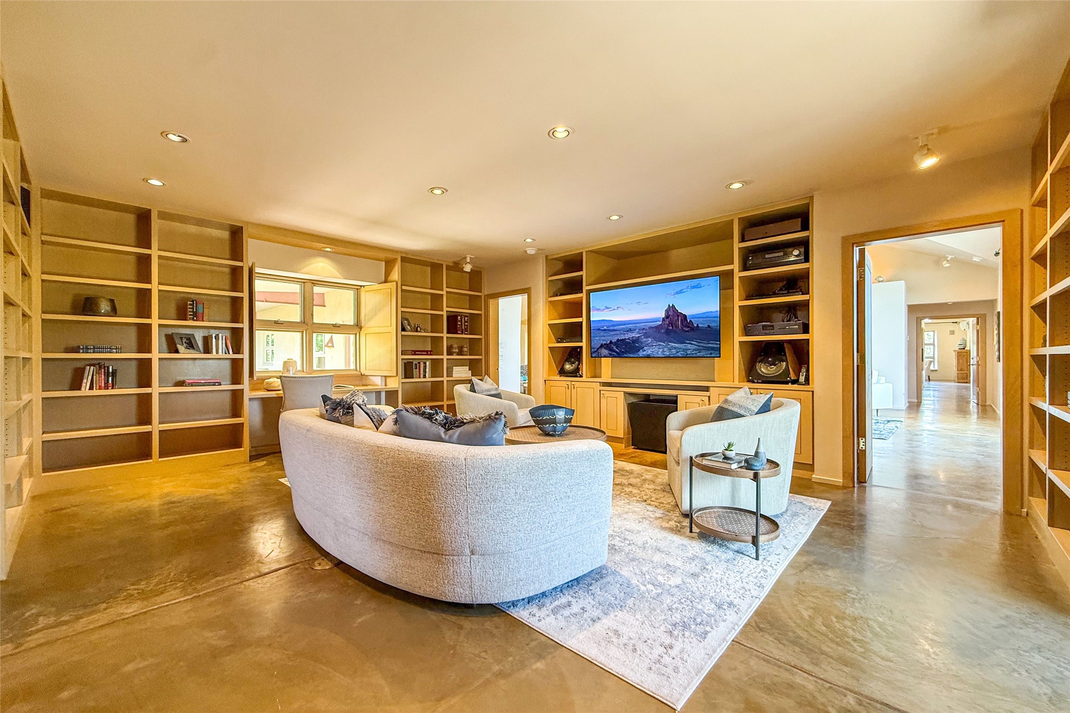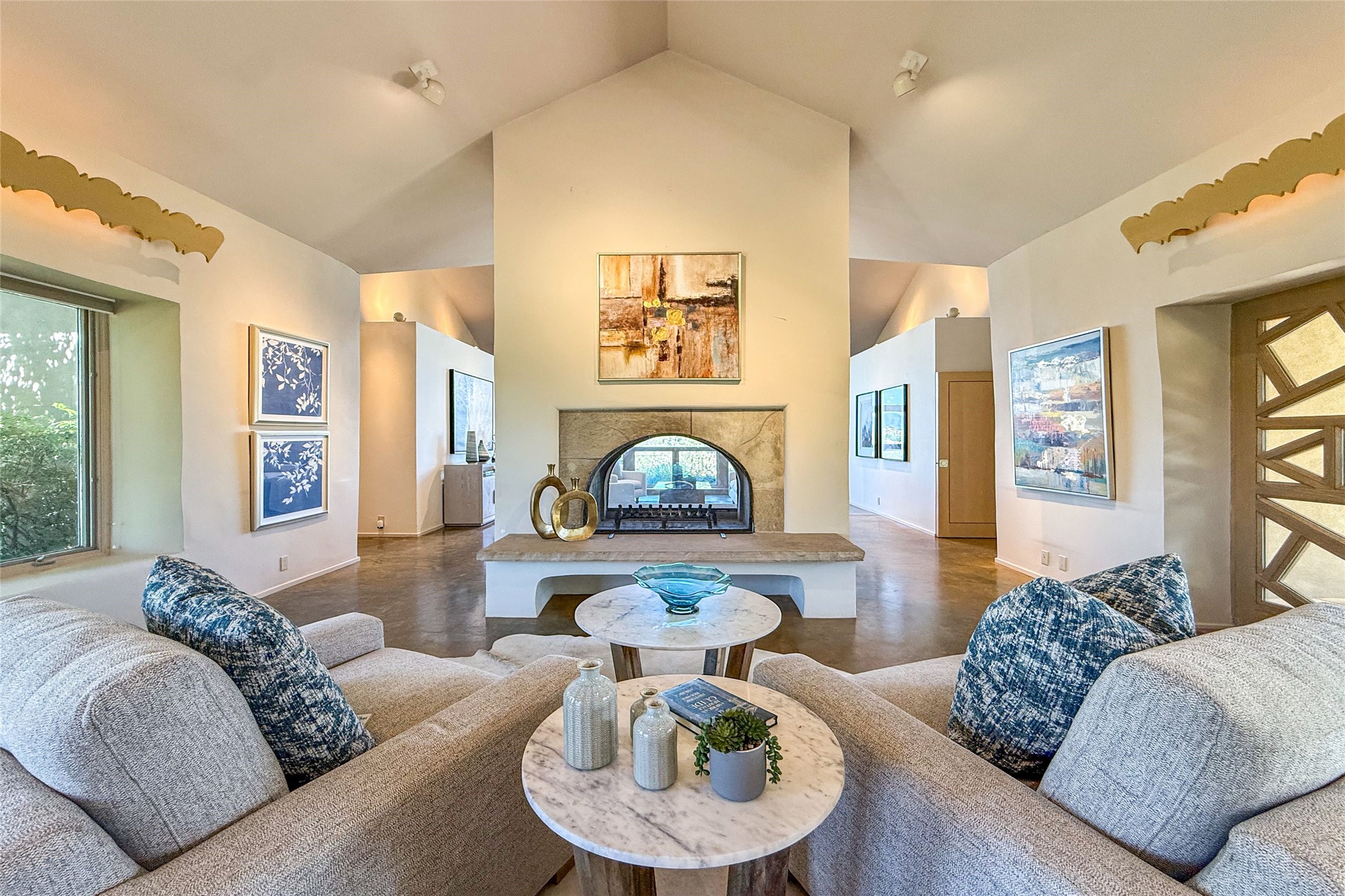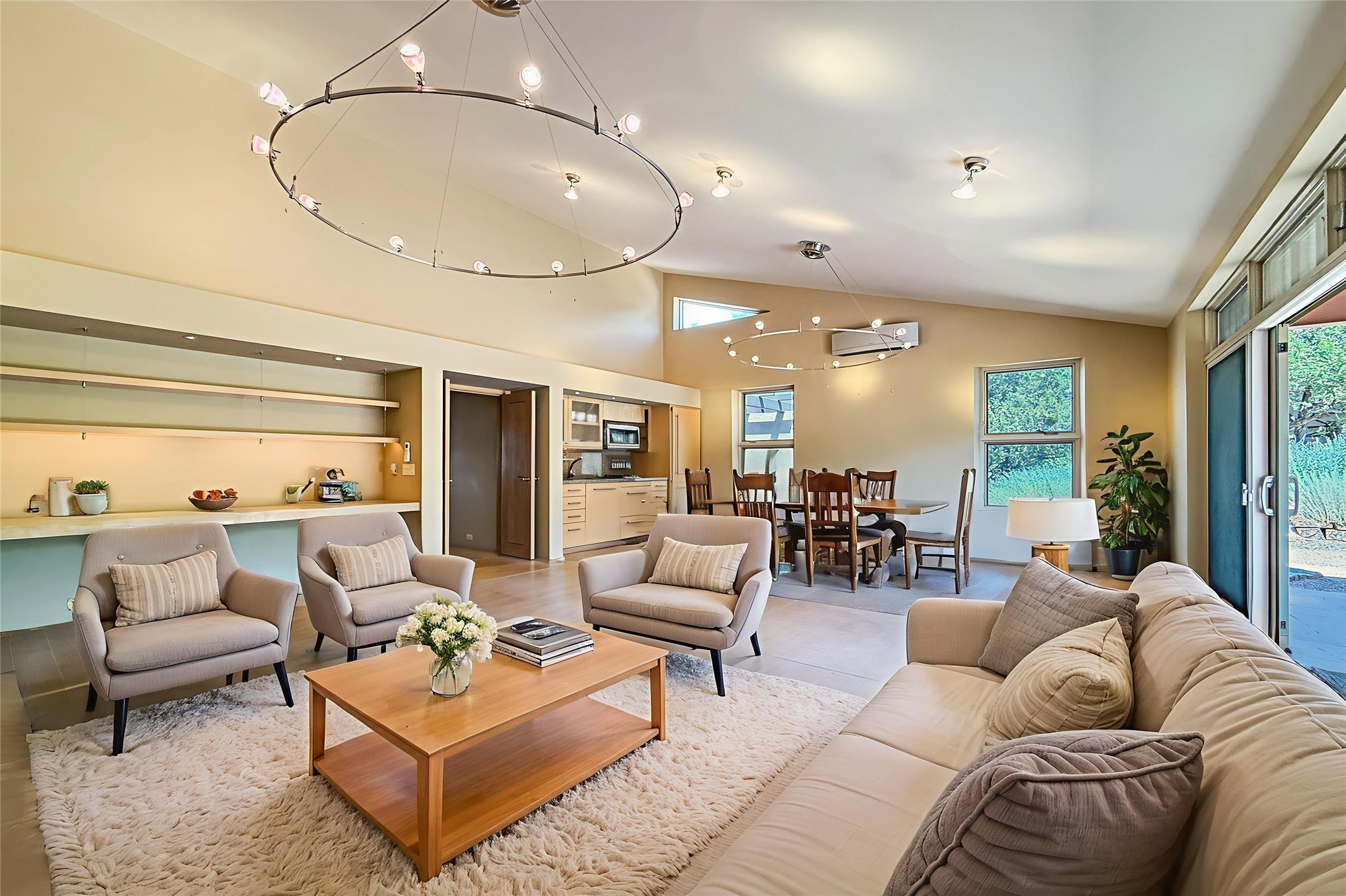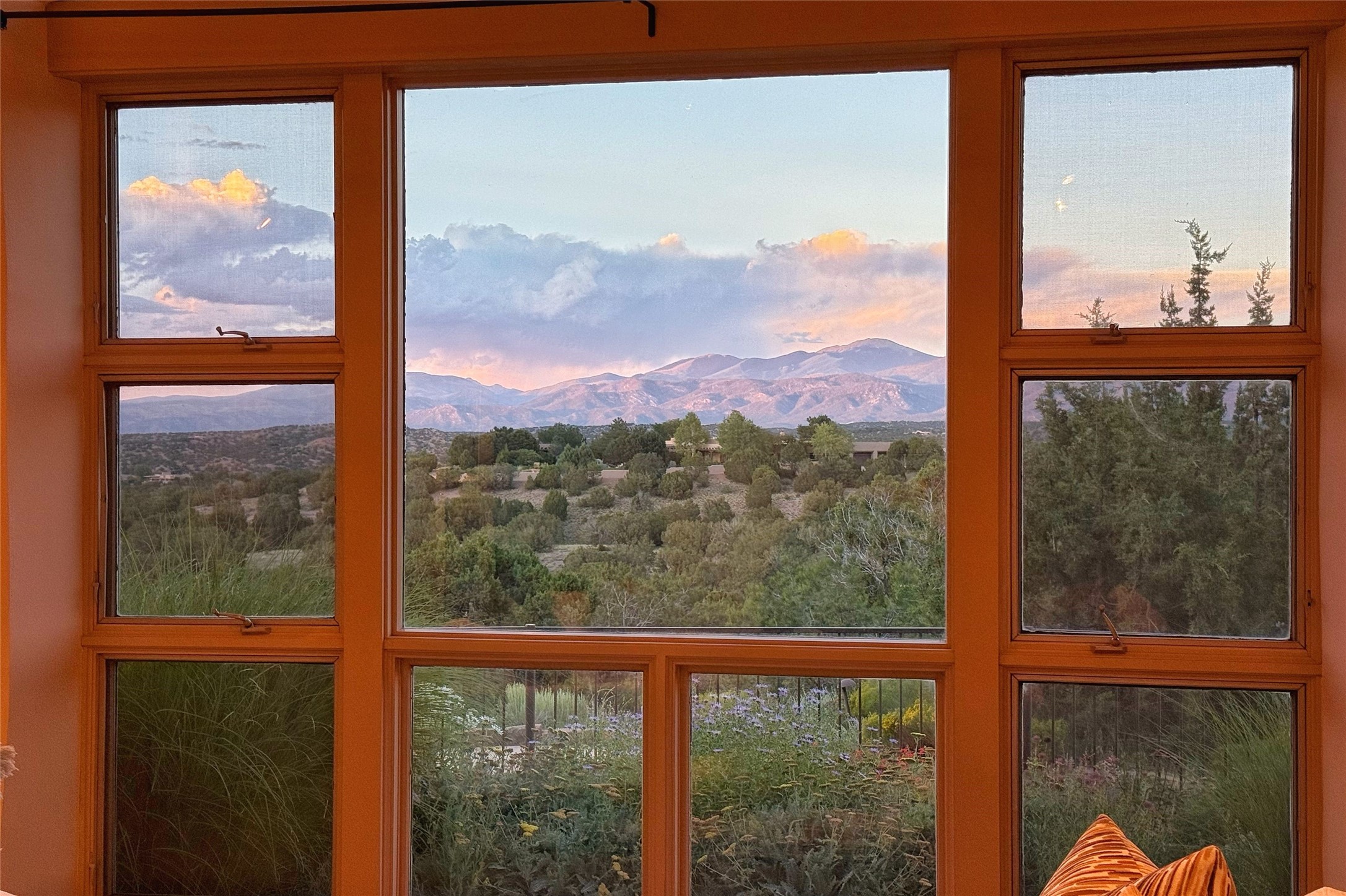 This serene La Tierra Nueva compound, with three distinct residences totaling 7,341 sq. feet of living space. Designed by renowned architect, Lila DeWindt, this lush oasis boasts mature landscaping in a serene, country-like setting with Sangre and Jemez mountain views, 11.85 acres, and vegetable and perennial gardens. The 3,982 sq. foot single level main residence features a blend of timeless Northern NM and modern design, a dramatic high-pitched roof, double-sided stone fireplace, copious natural light, andlarge windows that capture breathtaking Sangre views. With two sitting rooms, a media room and bedrooms that boast mountain views, this residence is truly stunning. Sitting in a bay window, the primary suite's tub overlooks a flower garden. An open-concept kitchen is centered around a large island, perfect for hosting.The home enjoys a portal and multiple patio spaces. The charming 1,334 sq. foot, two bedroom guest house includes a full kitchen, Saltillo tile flooring, a wood-burning stove, large windows, and wrap-around porch. The impressive 2,025 sq footmodern 1-bedroom studio has an open living/dining/kitchen area, and portal. The adult rec-room, with built-in bar, is ideal as live/work space, artist studio/music room, car enthusiast or convert to a barn. Perfect for large gatherings and relaxing with sunset Jemez views. Beneath the studio, lays a remarkable walk-in wine cellar for approx. 5000 bottles with wine tasting area. The property also includes a generous fenced dog area and room for horses.A truly peaceful, secluded atmosphere just 18 minutes from the heart of Santa Fe or the airport, and 8 minutes to The Club at Las Campanas. La Tierra Nueva is a coveted, gated, equestrian-friendly community with access to over 60,000 acres BLM land, and tennis/pickleball court. Ideal for multigenerational living, a large family, or patron of the arts, 7 Goodnight Trail West is a true hidden gem.