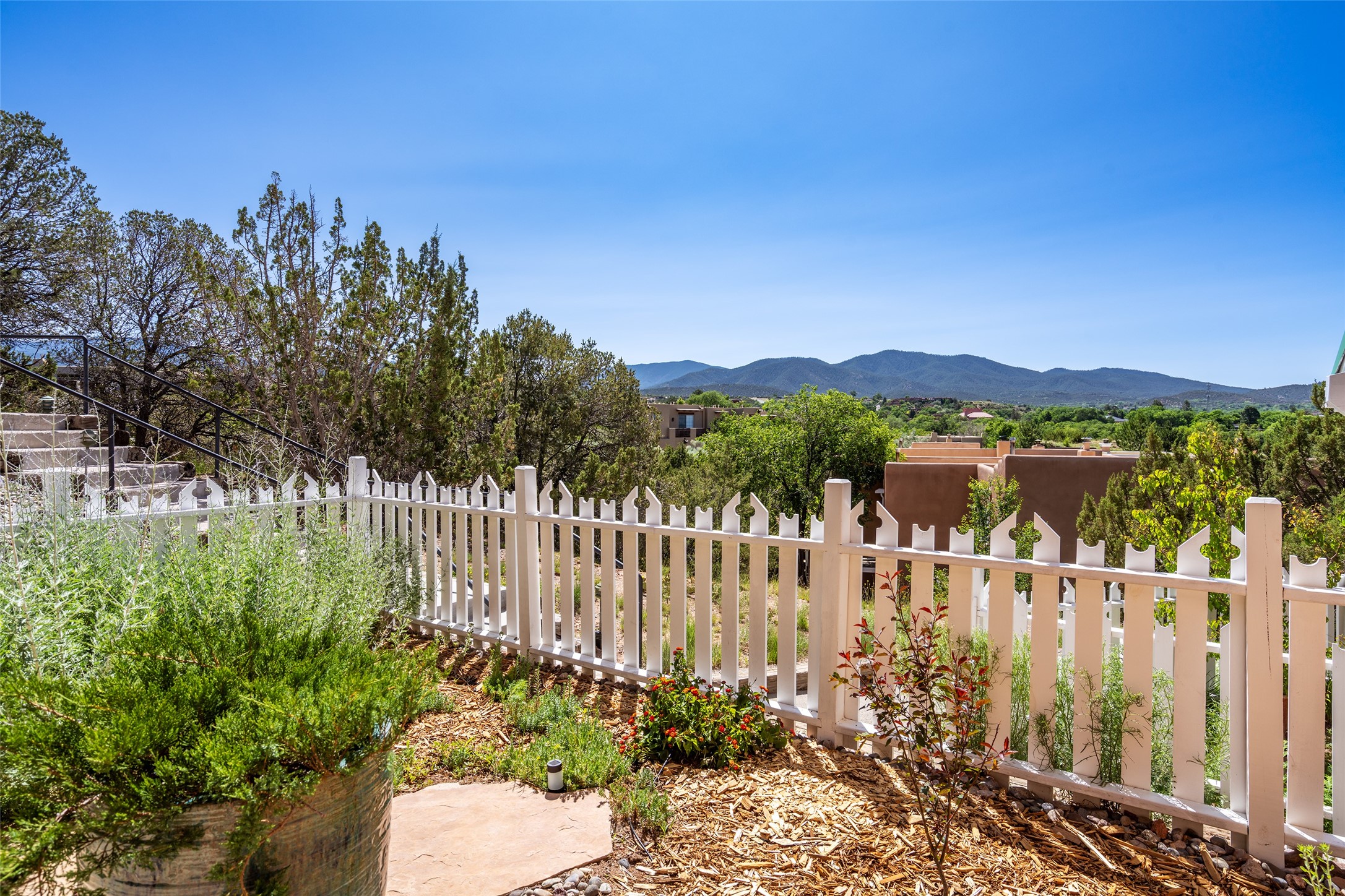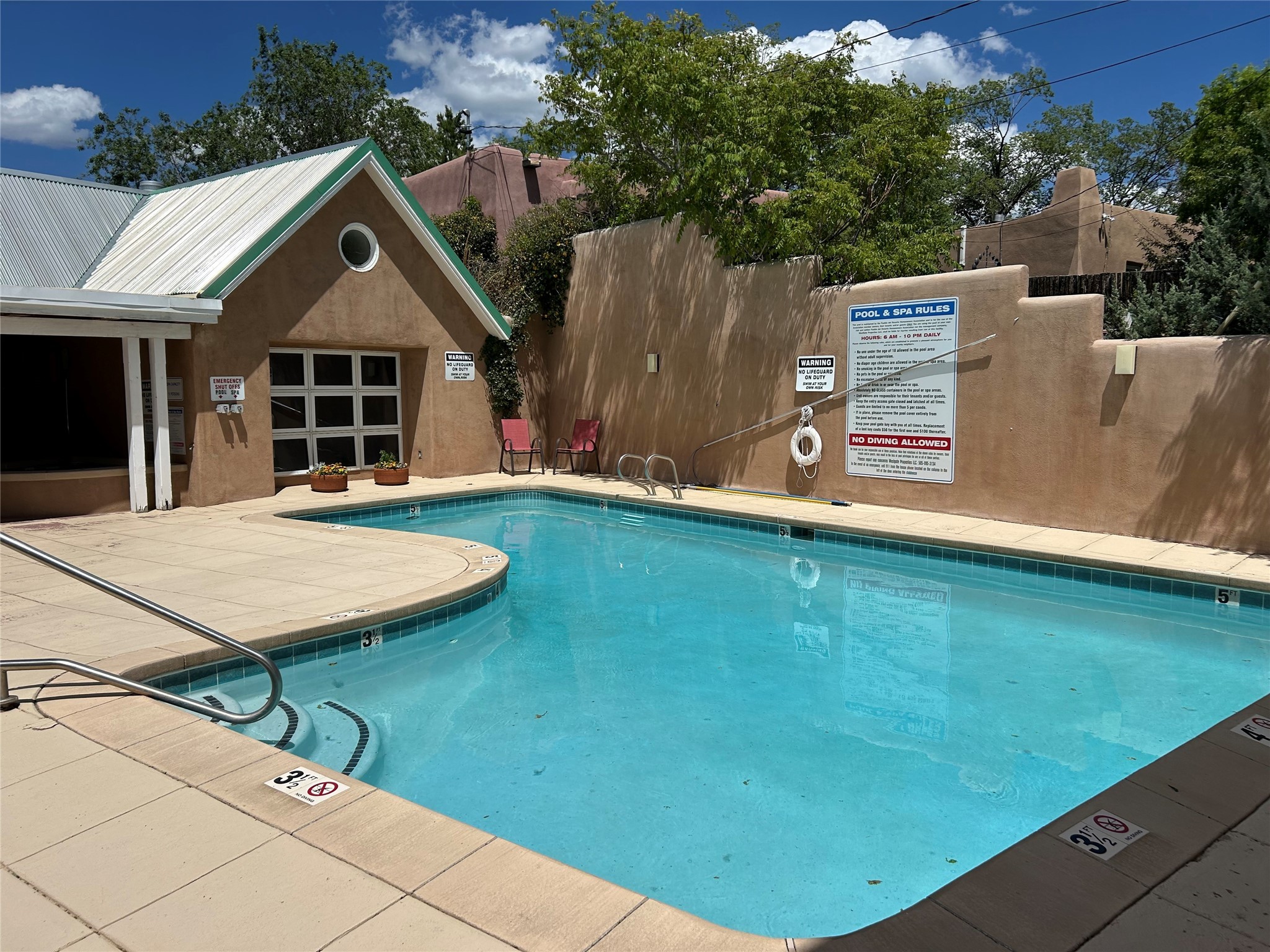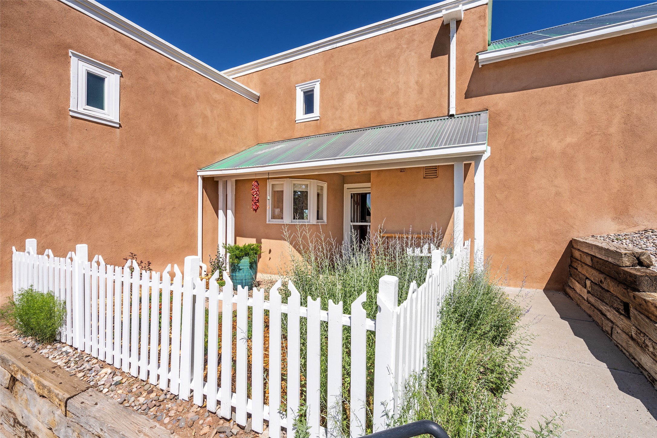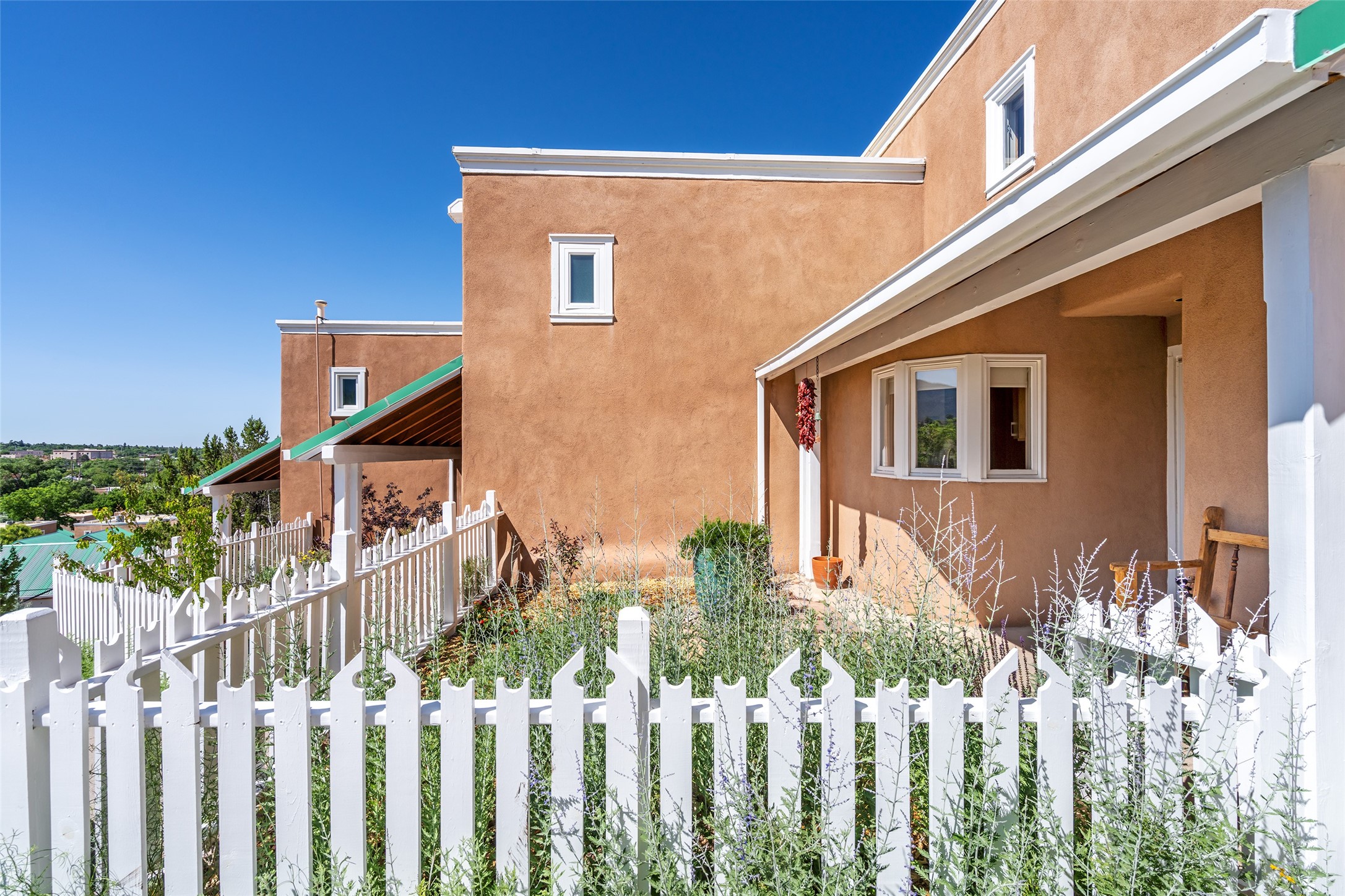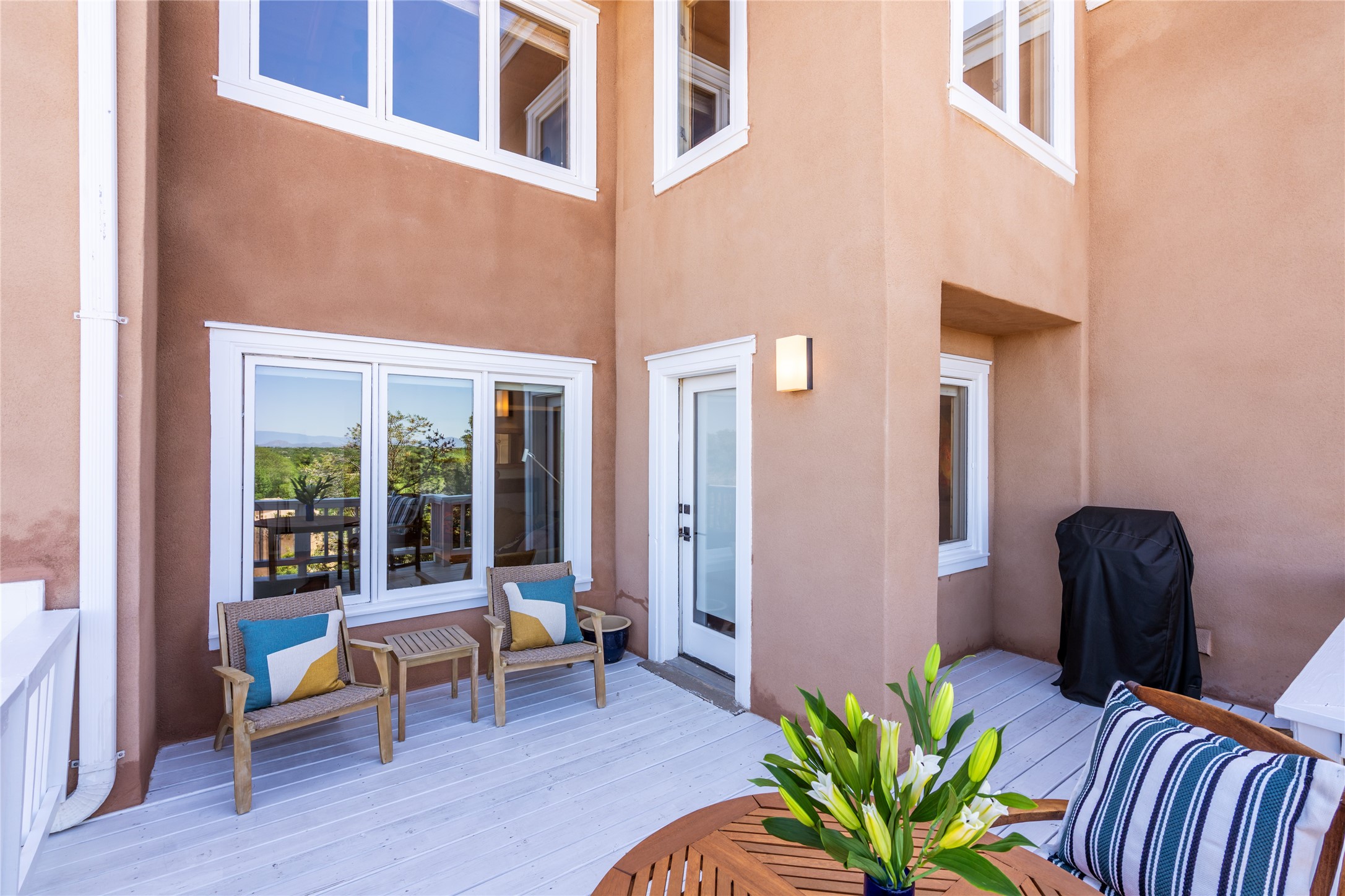 Wonderful VIEWS from this Pueblo de Rosario condo near the Santa Fe Plaza. This two story, two bedroom; 2 1/2 bath condo was remodeled with a fresh look about 10 years ago. Brand new membrane roof in April 2025. Engineered wood flooring, walnut kitchen cabinets, and newer interior pine doors. Stainless Bosch kitchen appliances with a Liebherr refrigerator and quartz countertops. Full bathroom upstairs features teak cabinets and marble. Primary bathroom has hickory cabintets, granite counter tops and travertine flooring. Half bath downstairs has a stone sink, venetian plaster walls, glass mosaic tile and travertine flooring. Stackable washer/dryer upstairs. One kiva fireplace in the living area. Lovely front area with views of the Cathedral and an outdoor deck off the dining area to enjoy the big Sandia - western views. Detached one car garage with cabinet storage. Community pool to enjoy the Santa Fe summers and a year around community hot tub. This unit is perfect for a "lock and leave" situation. Wonderful location and just less than one mile to the Santa Fe Plaza, restaurants, shops, galleries and an easy drive to the Santa Fe Ski Basin.