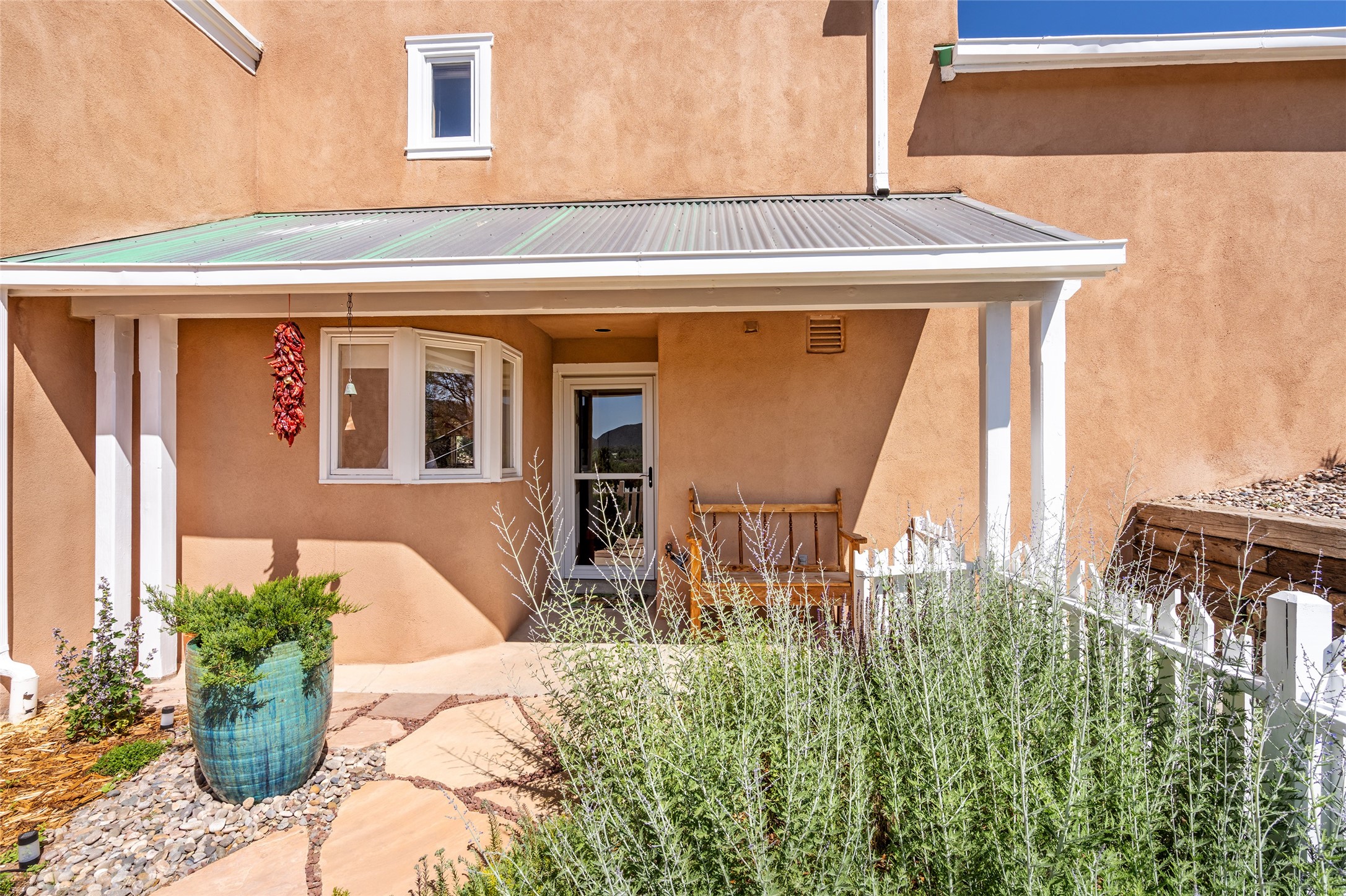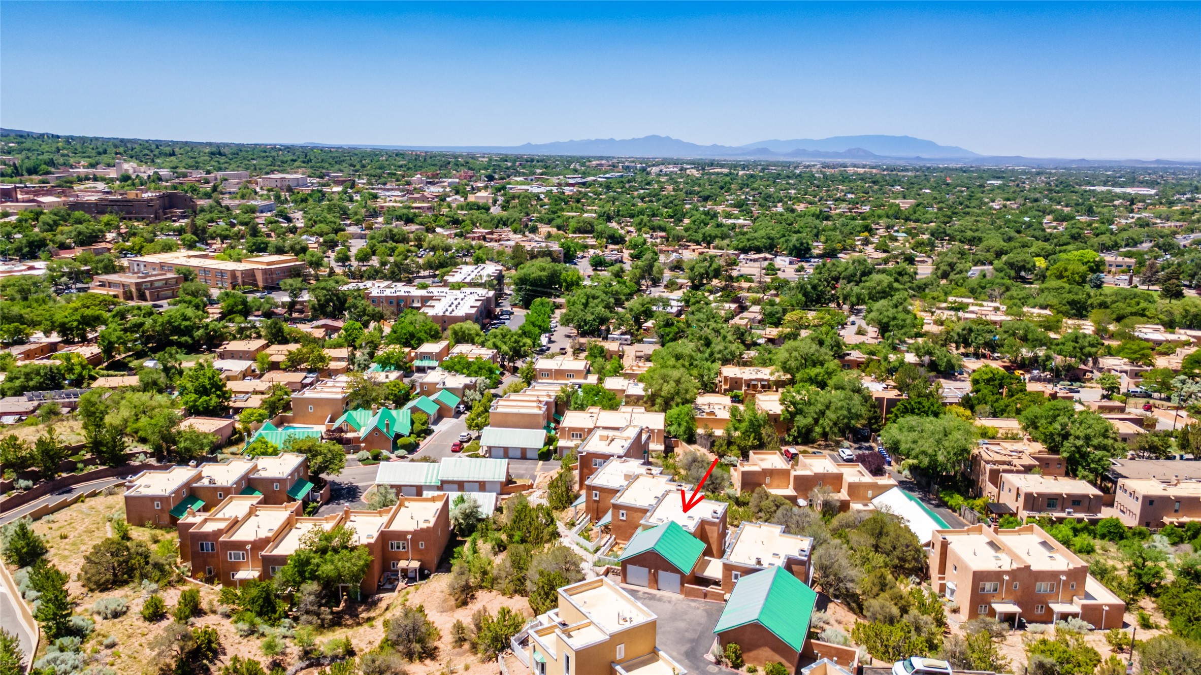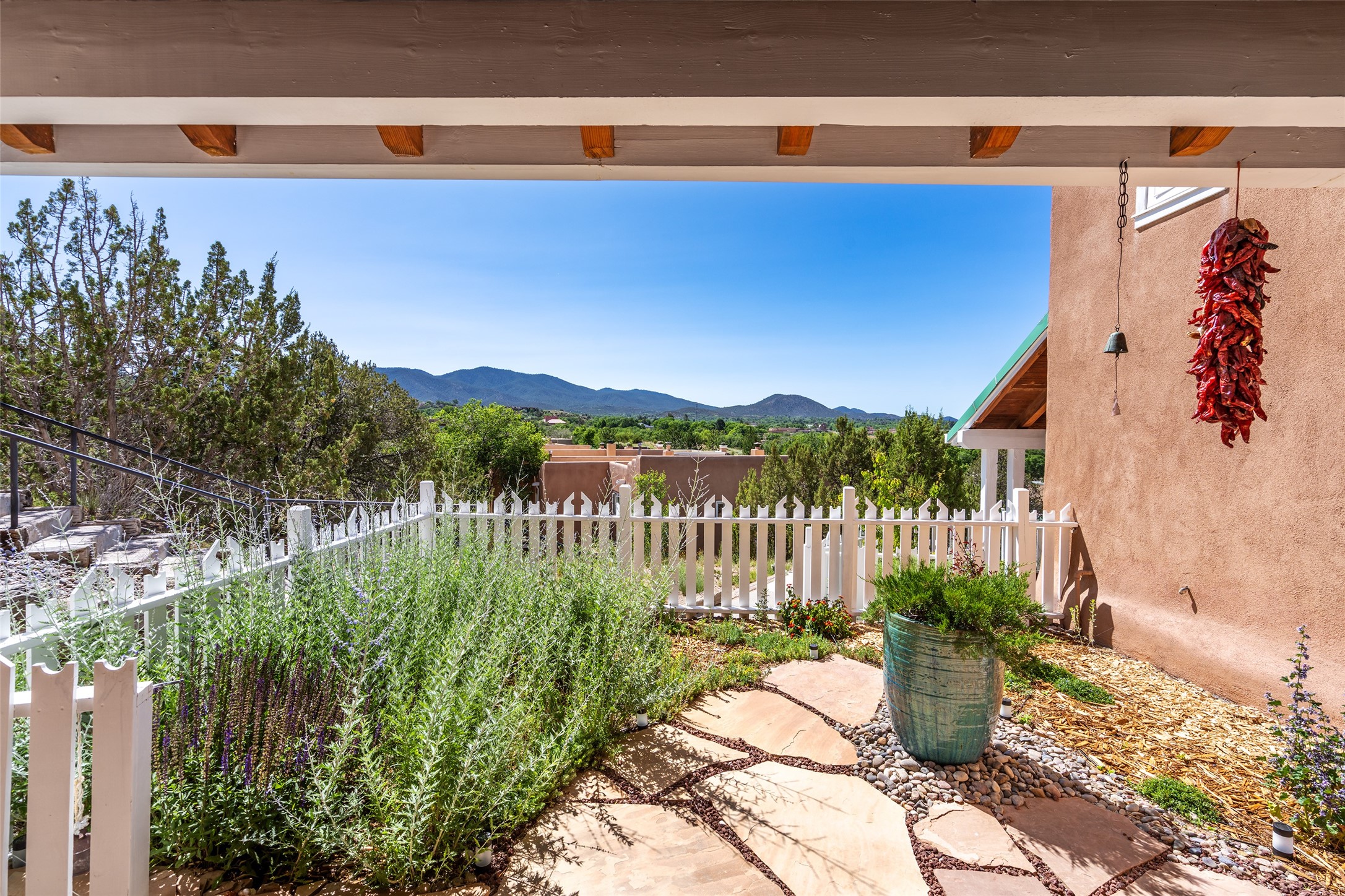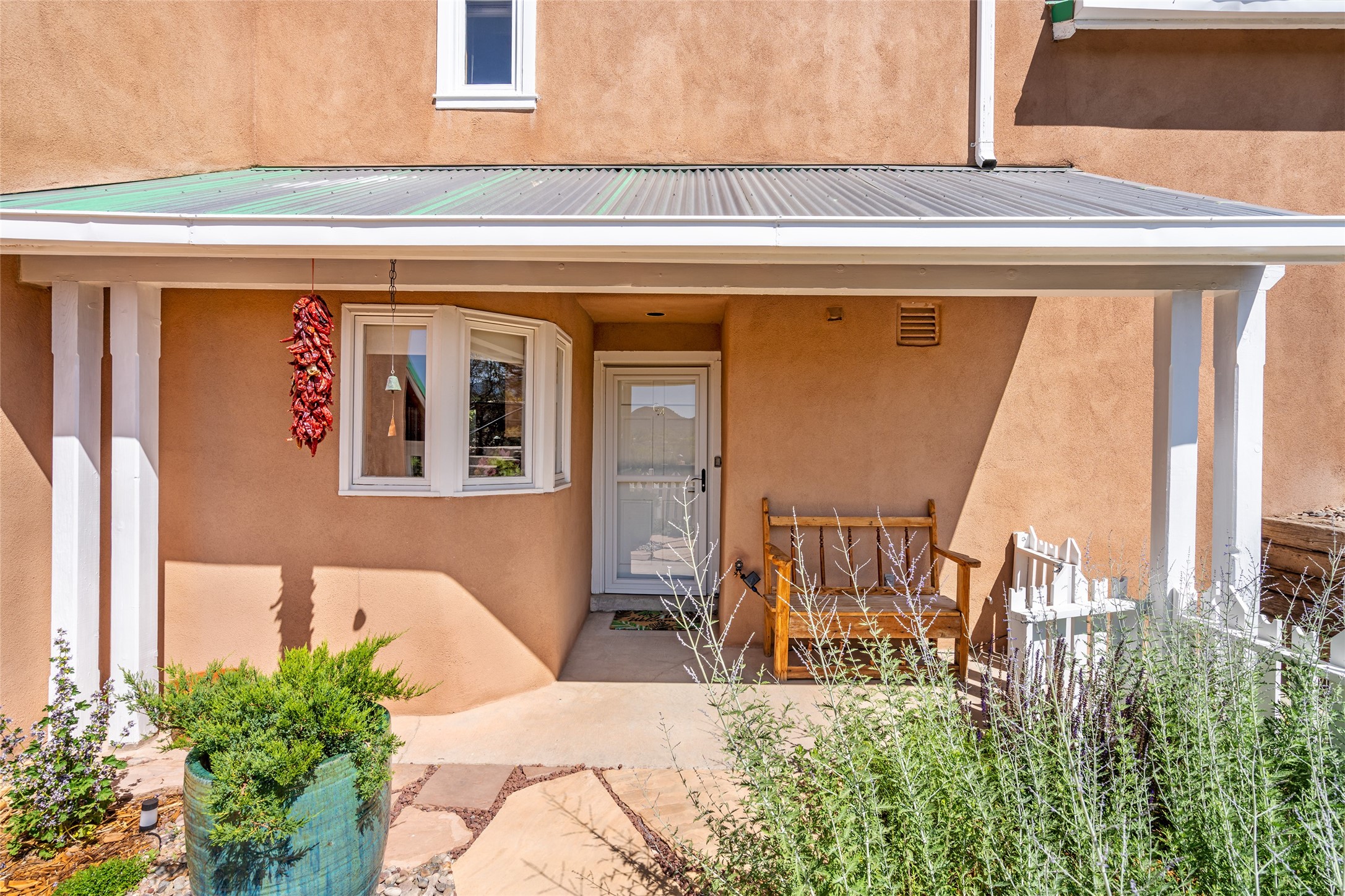 Wonderful VIEWS from this Pueblo de Rosario condo near the Santa Fe Plaza. This two story, two bedroom; 2 1/2 bath condo was remodeled with a fresh look about 10 years ago. Brand new membrane roof in April 2025. Engineered wood flooring, walnut kitchen cabinets, and newer interior pine doors. Stainless Bosch kitchen appliances with a Liebherr refrigerator and quartz countertops. Full bathroom upstairs features teak cabinets and marble. Primary bathroom has hickory cabintets, granite counter tops and travertine flooring. Half bath downstairs has a stone sink, venetian plaster walls, glass mosaic tile and travertine flooring. Stackable washer/dryer upstairs. One kiva fireplace in the living area. Lovely front area with views of the Cathedral and an outdoor deck off the dining area to enjoy the big Sandia - western views. Detached one car garage with cabinet storage. Community pool to enjoy the Santa Fe summers and a year around community hot tub. This unit is perfect for a "lock and leave" situation. Wonderful location and just less than one mile to the Santa Fe Plaza, restaurants, shops, galleries and an easy drive to the Santa Fe Ski Basin.