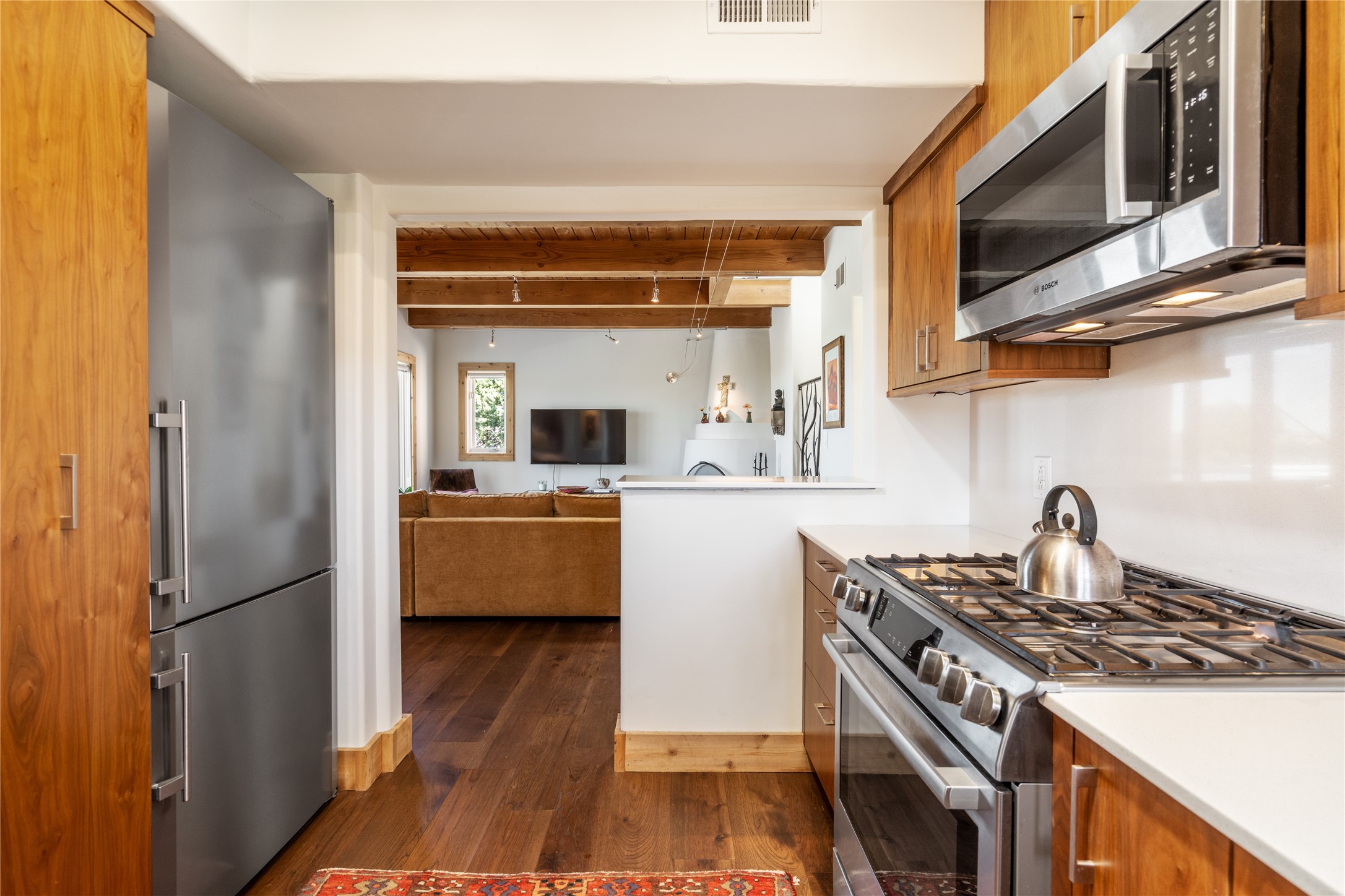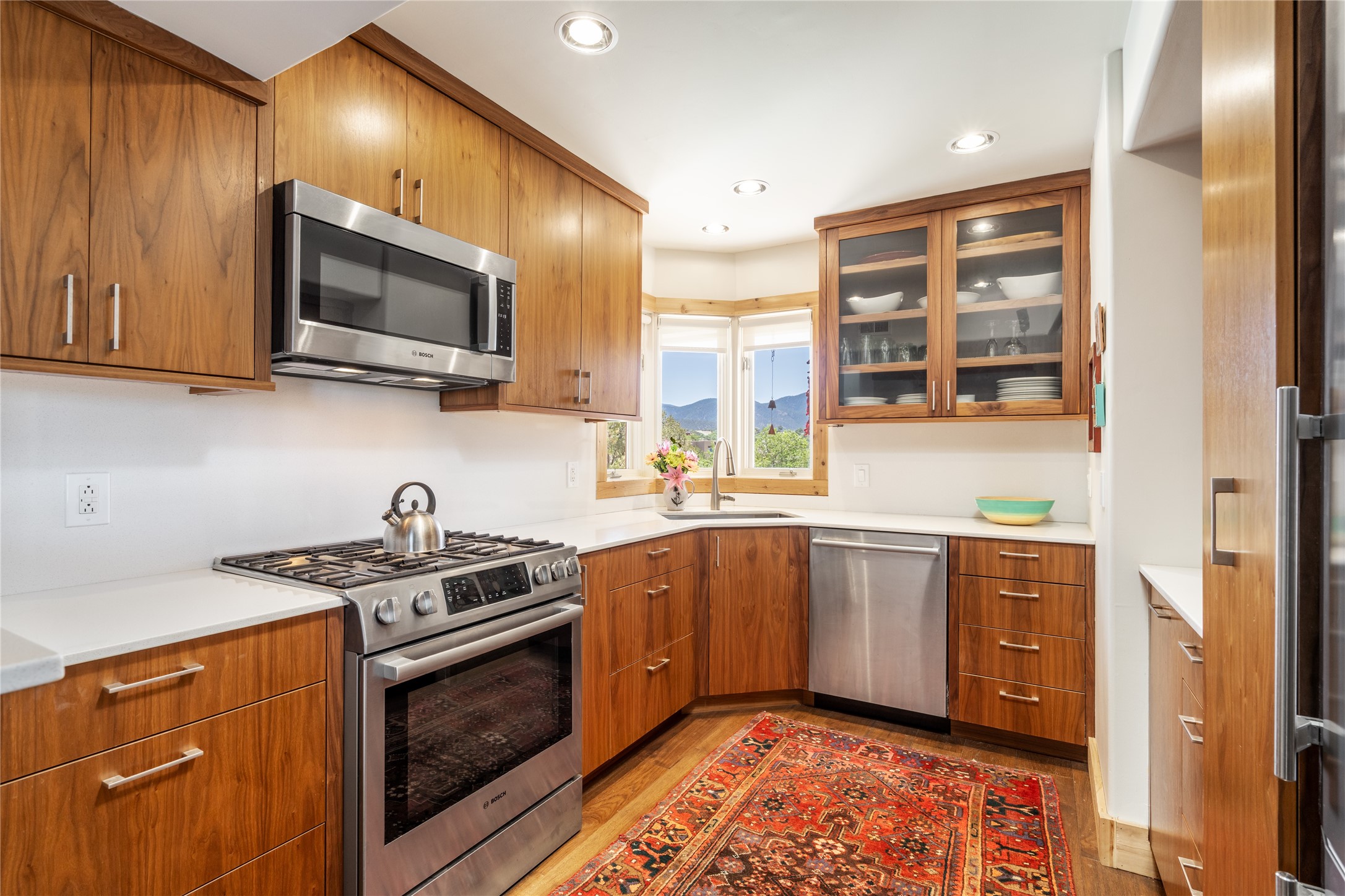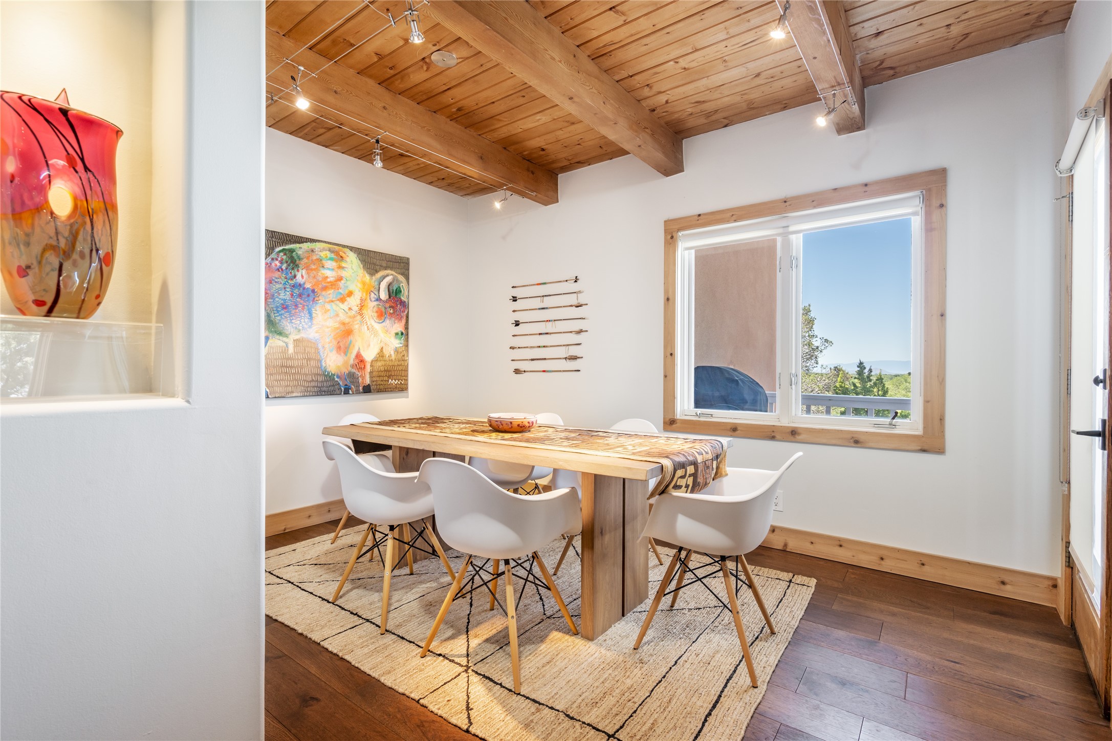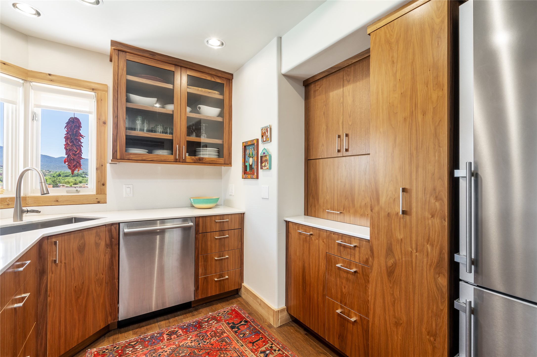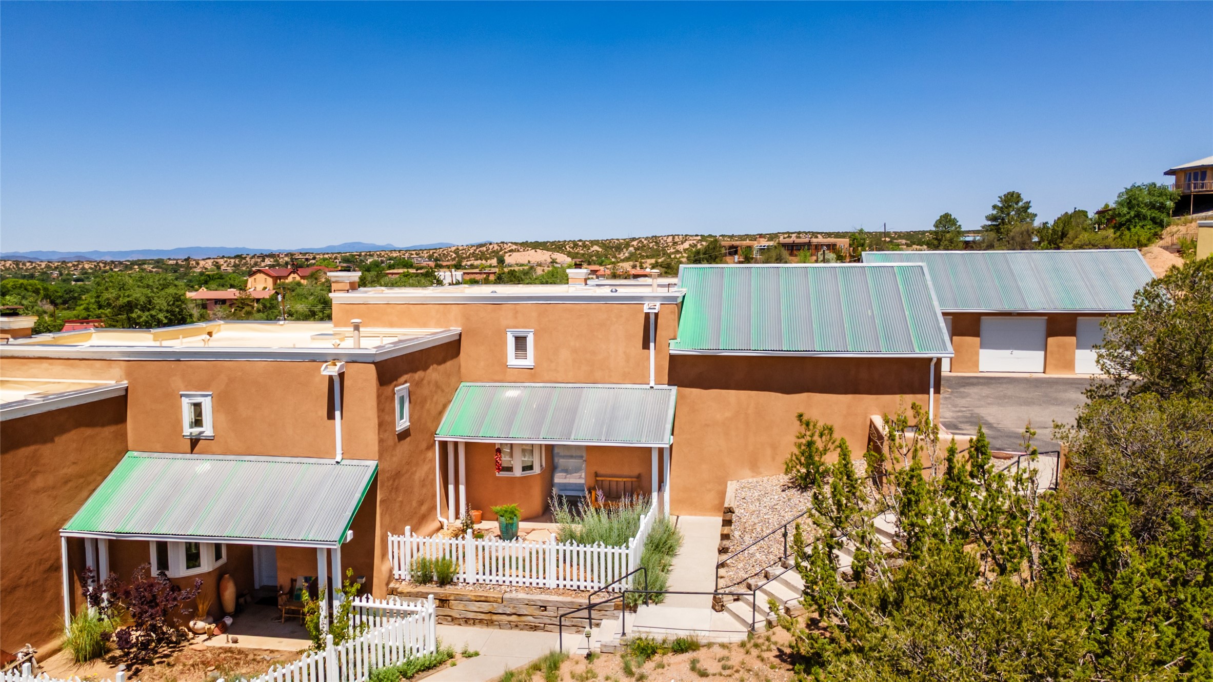 Wonderful VIEWS from this Pueblo de Rosario condo near the Santa Fe Plaza. This two story, two bedroom; 2 1/2 bath condo was remodeled with a fresh look about 10 years ago. Brand new membrane roof in April 2025. Engineered wood flooring, walnut kitchen cabinets, and newer interior pine doors. Stainless Bosch kitchen appliances with a Liebherr refrigerator and quartz countertops. Full bathroom upstairs features teak cabinets and marble. Primary bathroom has hickory cabintets, granite counter tops and travertine flooring. Half bath downstairs has a stone sink, venetian plaster walls, glass mosaic tile and travertine flooring. Stackable washer/dryer upstairs. One kiva fireplace in the living area. Lovely front area with views of the Cathedral and an outdoor deck off the dining area to enjoy the big Sandia - western views. Detached one car garage with cabinet storage. Community pool to enjoy the Santa Fe summers and a year around community hot tub. This unit is perfect for a "lock and leave" situation. Wonderful location and just less than one mile to the Santa Fe Plaza, restaurants, shops, galleries and an easy drive to the Santa Fe Ski Basin.