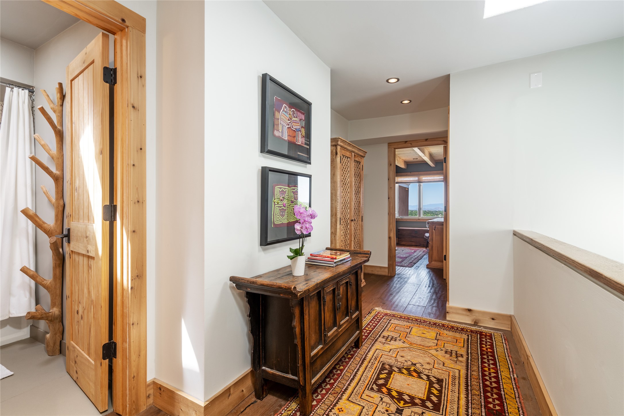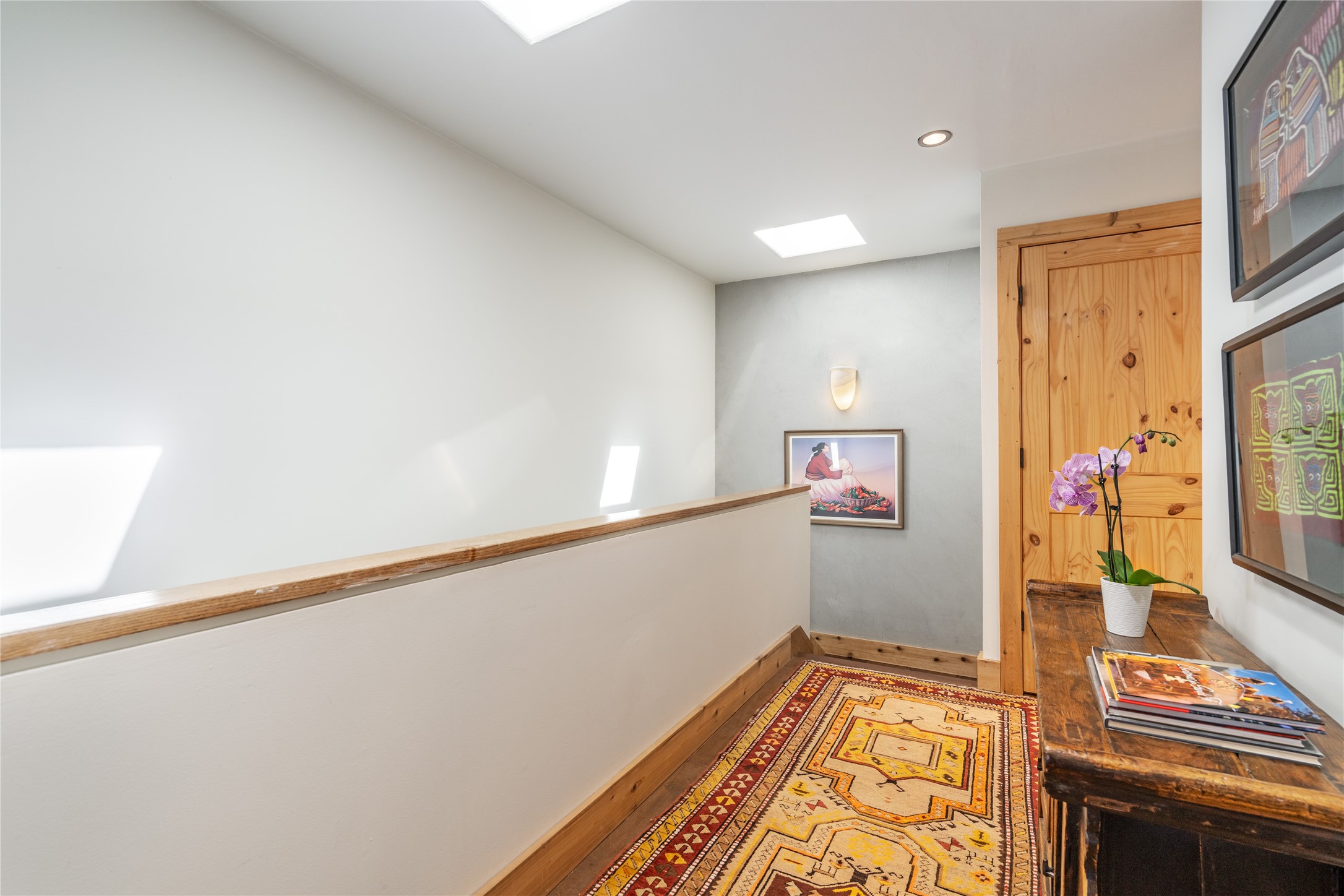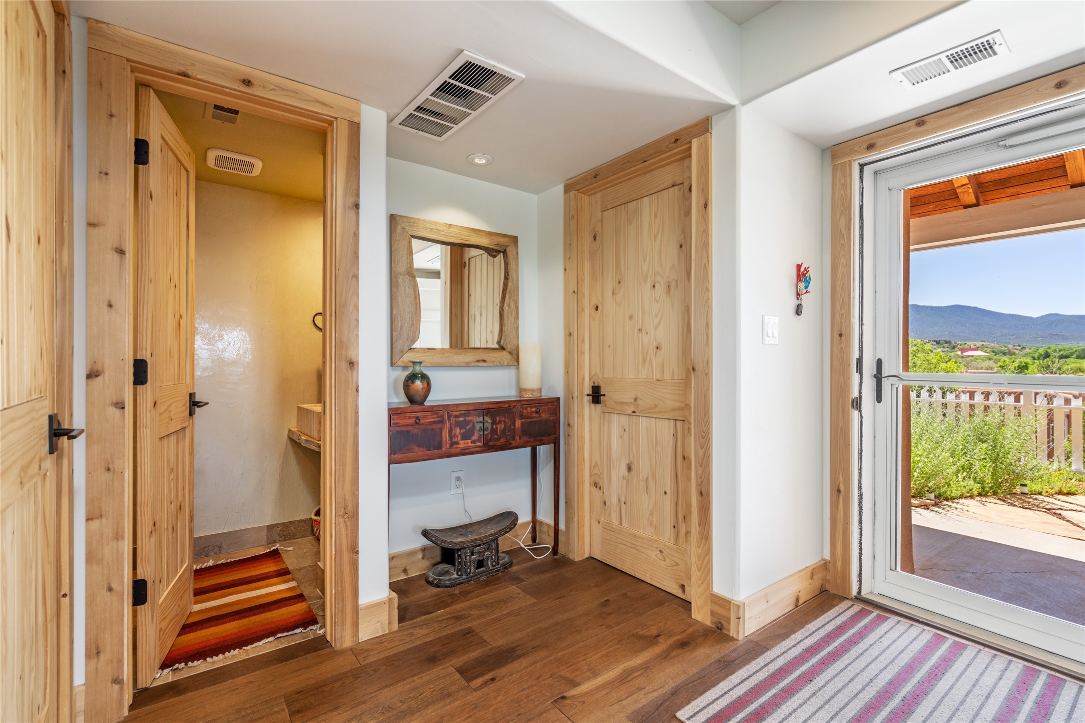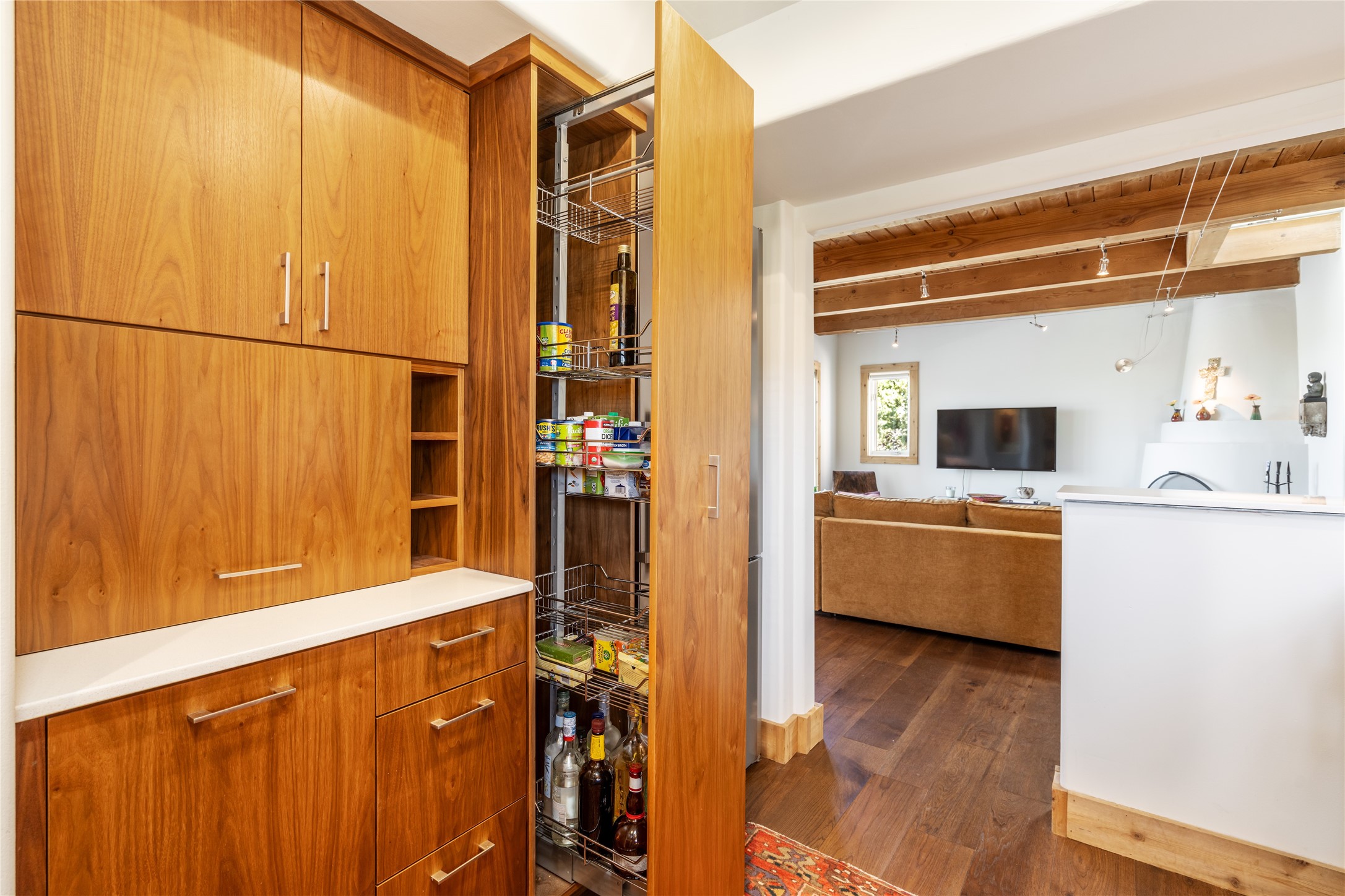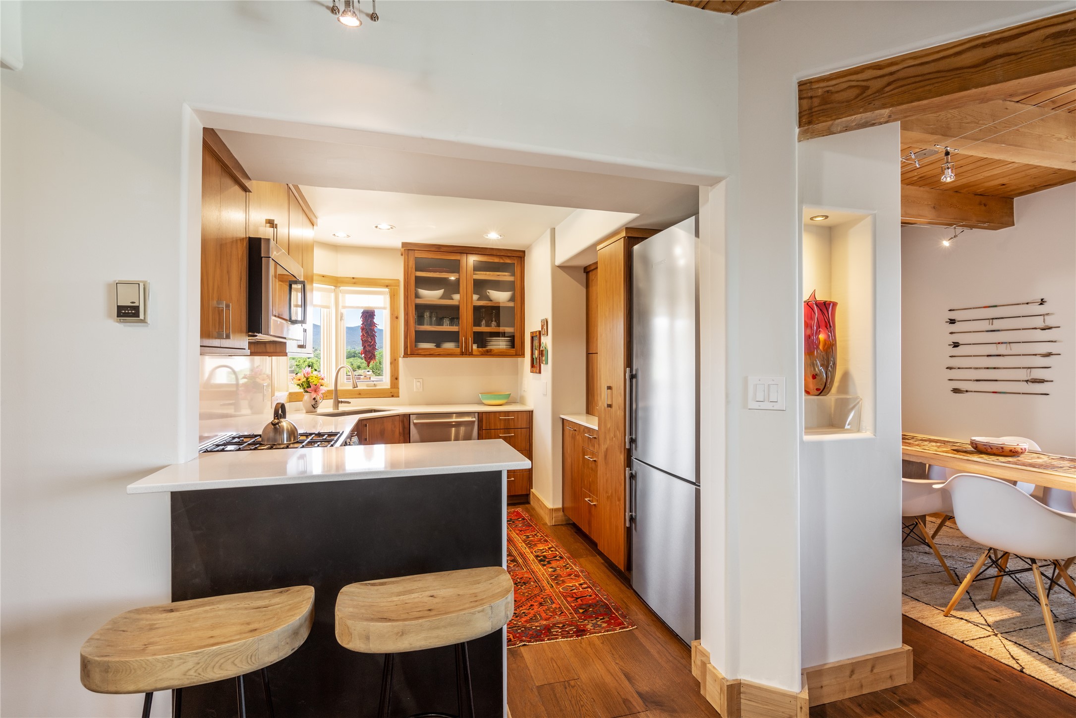 Wonderful VIEWS from this Pueblo de Rosario condo near the Santa Fe Plaza. This two story, two bedroom; 2 1/2 bath condo was remodeled with a fresh look about 10 years ago. Brand new membrane roof in April 2025. Engineered wood flooring, walnut kitchen cabinets, and newer interior pine doors. Stainless Bosch kitchen appliances with a Liebherr refrigerator and quartz countertops. Full bathroom upstairs features teak cabinets and marble. Primary bathroom has hickory cabintets, granite counter tops and travertine flooring. Half bath downstairs has a stone sink, venetian plaster walls, glass mosaic tile and travertine flooring. Stackable washer/dryer upstairs. One kiva fireplace in the living area. Lovely front area with views of the Cathedral and an outdoor deck off the dining area to enjoy the big Sandia - western views. Detached one car garage with cabinet storage. Community pool to enjoy the Santa Fe summers and a year around community hot tub. This unit is perfect for a "lock and leave" situation. Wonderful location and just less than one mile to the Santa Fe Plaza, restaurants, shops, galleries and an easy drive to the Santa Fe Ski Basin.