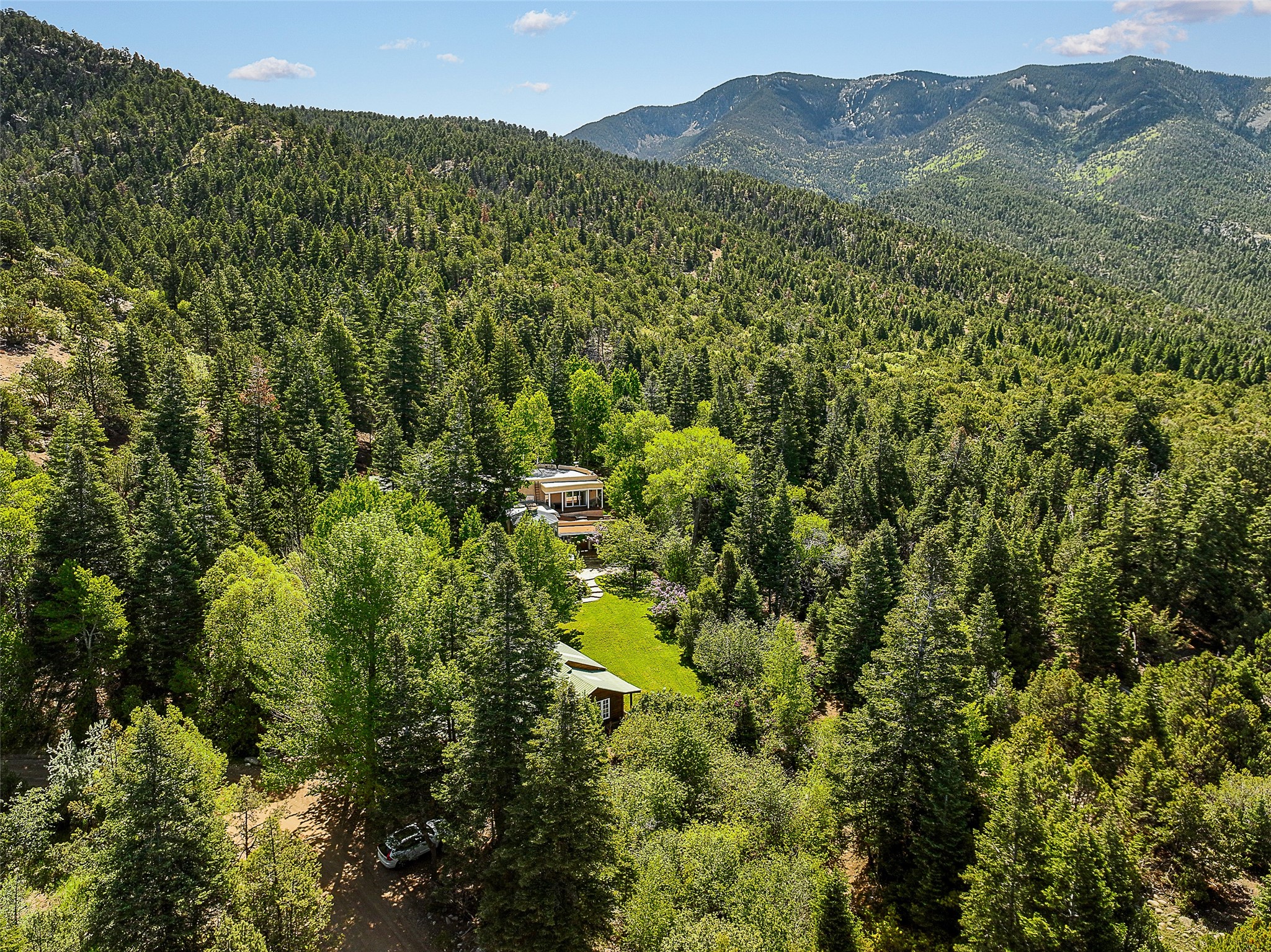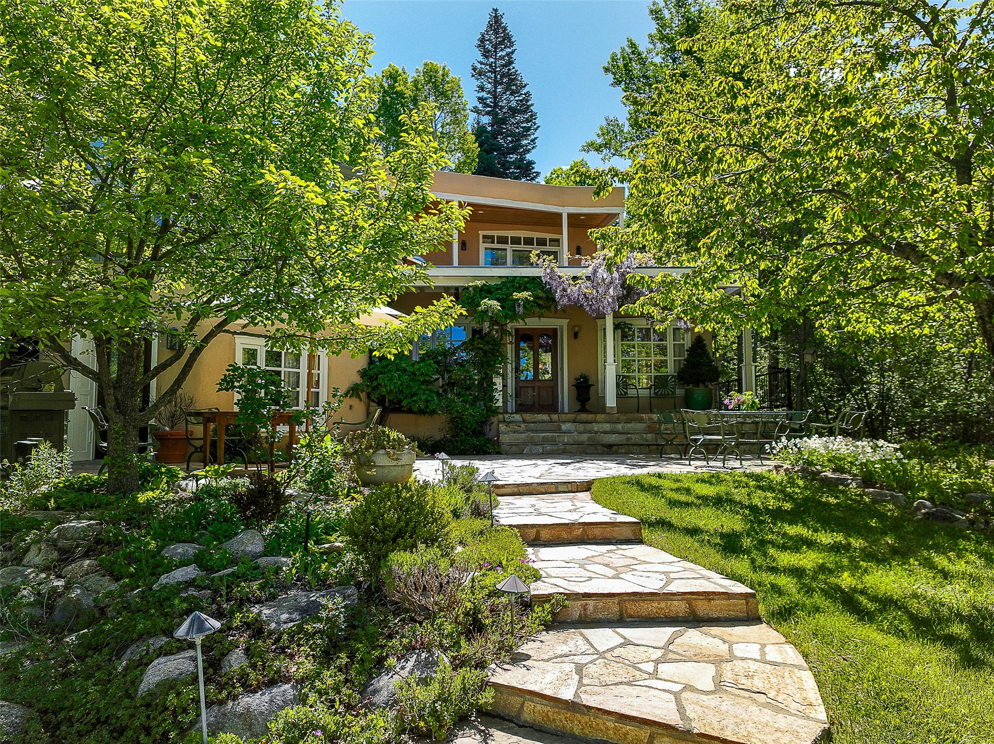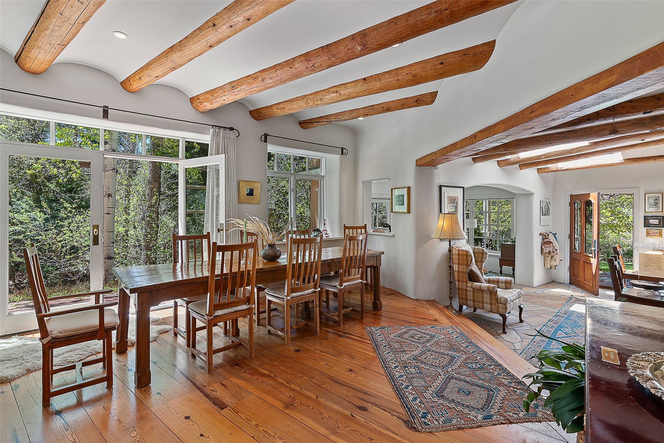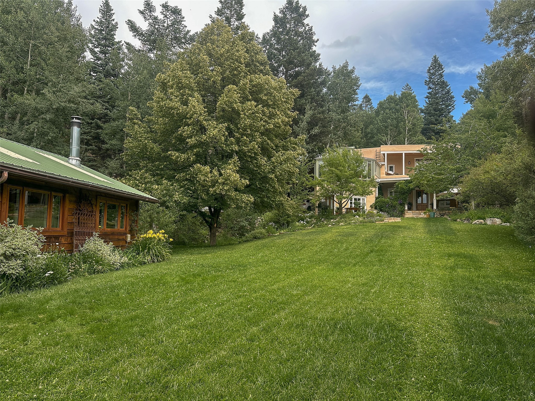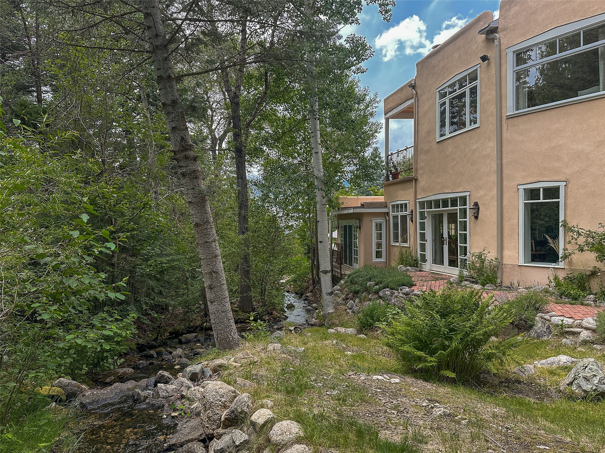 Comfortably tucked beneath the towering El Salto Mountain, sits this special 5.25 acre estate alongside the Arroyo Seco stream. This green oasis is defined by water, tall trees, birdsong and woodland gardens, by clear light, forever views and cool, starry nights. From its origins in the early 1970's, generously expanded over several decades, the home is built in harmony with the land. Each level flows naturally from the last, echoing the cascading waters just outside, with terraces, nooks, and rooms unfolding like the curves of the Creek itself. Both informal and refined, the house feels completely welcoming and comfortable. Gorgeous Idaho quartzite flagstone moves seamlessly from the broad front portal draped with Wisteria into the kitchen. The principal living space has a dreamy kitchen with a fantastic 1954 red enamel Chambers stove, a wonderful creek-side sitting area, a living room with wide plank reclaimed heart pine floors, a dry-stack stone fireplace, a library nook, a dining area, and three sets of French doors leading out onto a wrap-around patio that follows the banks of the winding creek. Salvaged and repurposed cypress shutters from New Orleans became beautiful wainscot paneling and doors. The home is anchored by a spectacular second story glass sunroom, made and installed by Pennsylvania Mennonite and Amish craftsmen from Renaissance Conservatories. The magical room with a warm quartzite floor is bathed in natural light that invites the outdoors in- perfect for morning coffee, quiet reflection, reading, writing, or entertaining under the stars. From here, a short rise of stairs leads to a landing off of which radiate two large, private suites. The western facing suite has a cozy sitting area with a large fireplace and a patio overlooking the stream and endless views to the Rio Grande Gorge and beyond. The corresponding suite is bathed in beautiful natural light from the large windows, vaulted ceilings and skylights. It feels like a cozy nest tucked into the treed canopy surrounding it. The third bedroom suite is can be accessed from the main living level or via a private door from the gardens. A delightful guesthouse with a complete kitchen sits at the base of a grassy lawn. Under the same roof, yet with it's own entrances from the lawn or garage is an additional light-filled room currently used as a home gym/office, and has a half bathroom. Versatile spaces amongst a verdant landscape. The stream brings the music of water to your daily rhythms. In the evening a cool breeze comes down the creek, and with it the gift of sleeping under a light blanket...windows wide open, stream trickling along. Natural springs feed native plants and perennials that bloom spring and summer. Golden Aspens shimmer and quake in the fall. Over 60 varieties of flowering trees, shrub sand perennials make for a true botanical delight. This is northern New Mexico at its most magical. Simply stroll out the door to hike and bike. No bike racks and drives to a trailhead necessary. Contiguous with quiet Taos Pueblo lands. Hiking trails lead to the El Salto waterfall and Carson National Forest. It's an easy 12 mile/20 minute drive to Taos Ski Valley. The location is secluded, yet sneaky-convenient. Meticulously maintained by one Owner for over 50 years, this is the first opportunity for another lucky soul to call this Home. This one-of-a-kind mountain sanctuary blends privacy, luxury and natural beauty in a way that simply can't be replicated. It is a truly special spot- Private Luxury at the Edge of Wild.