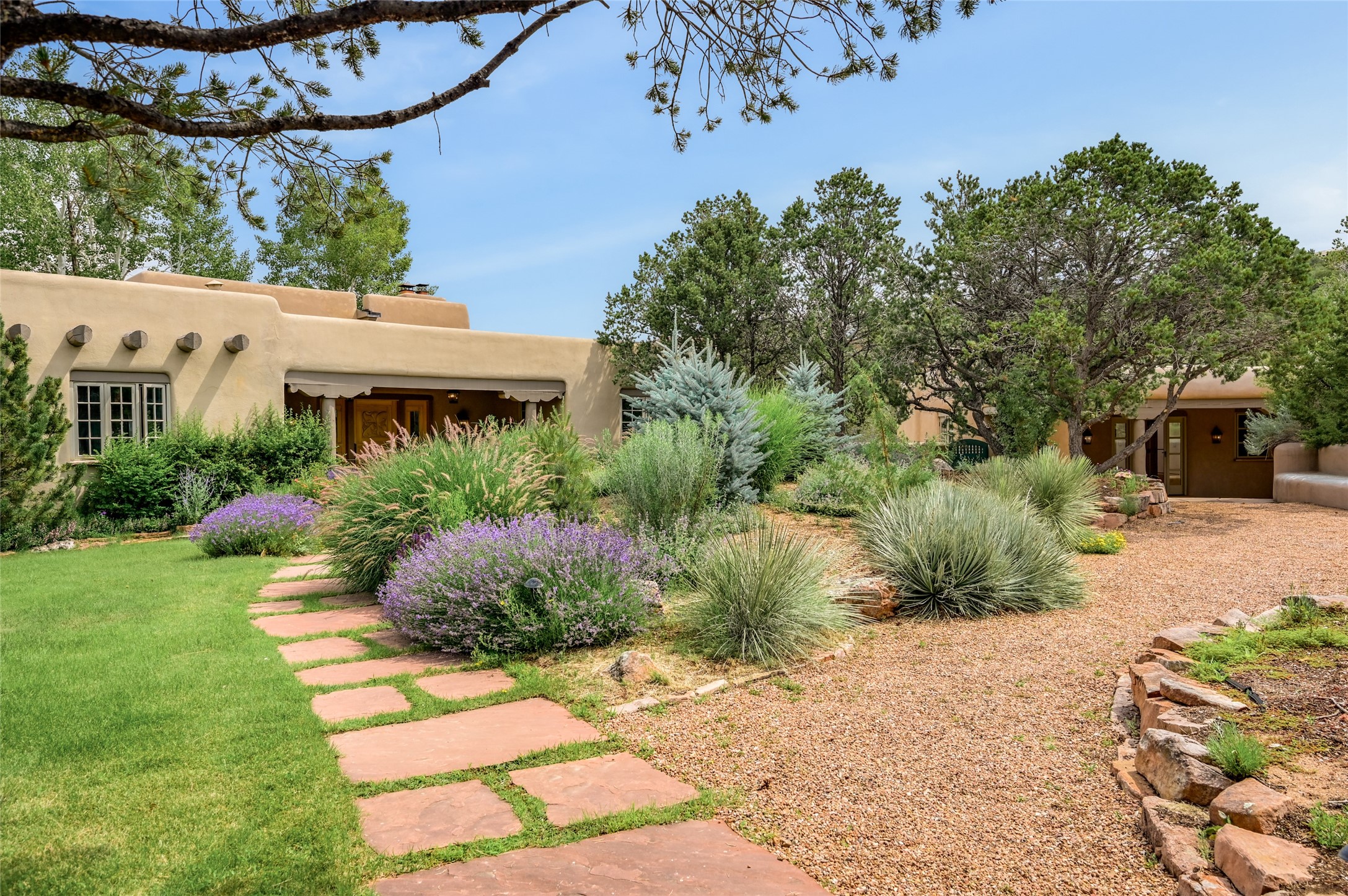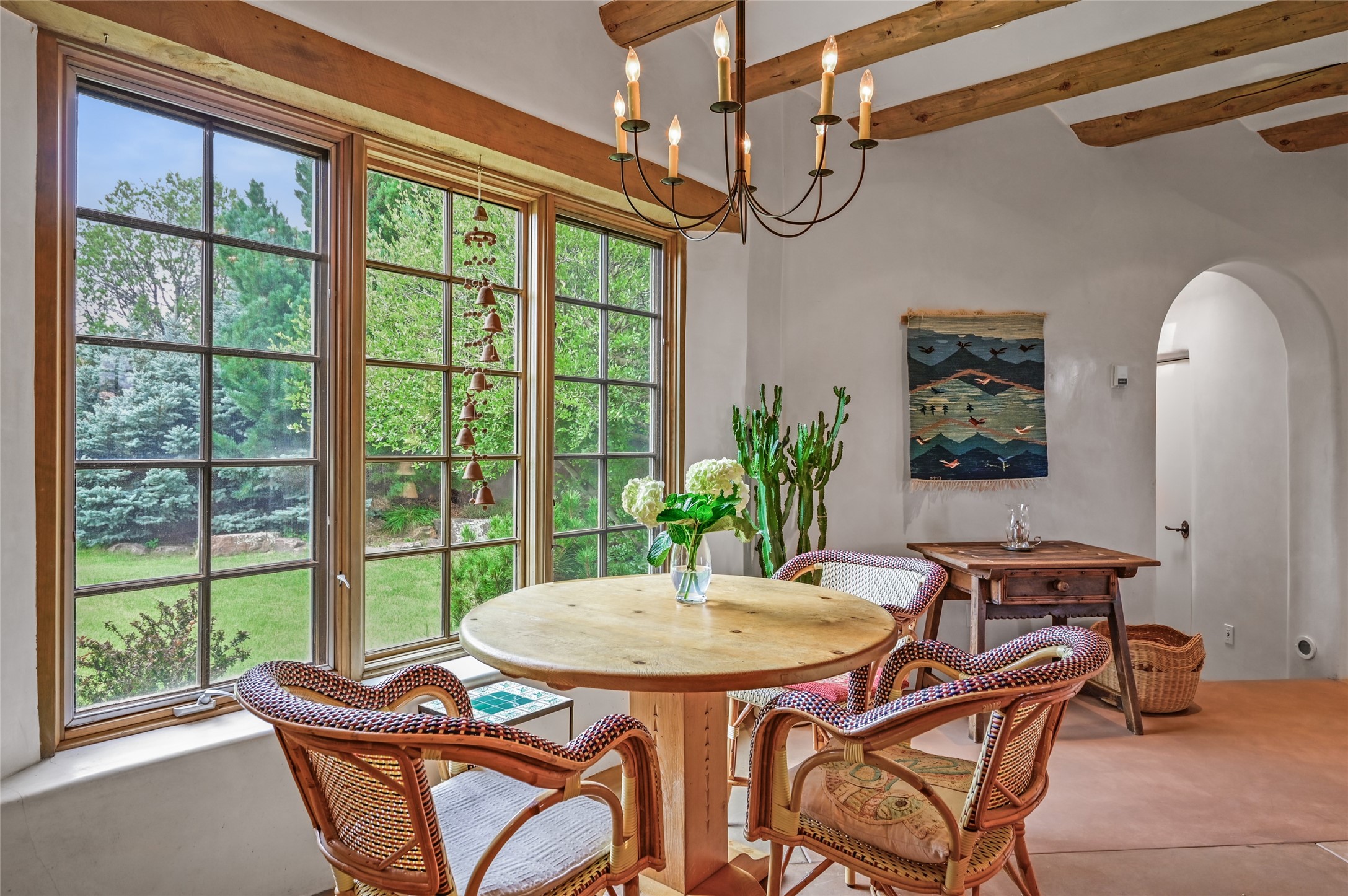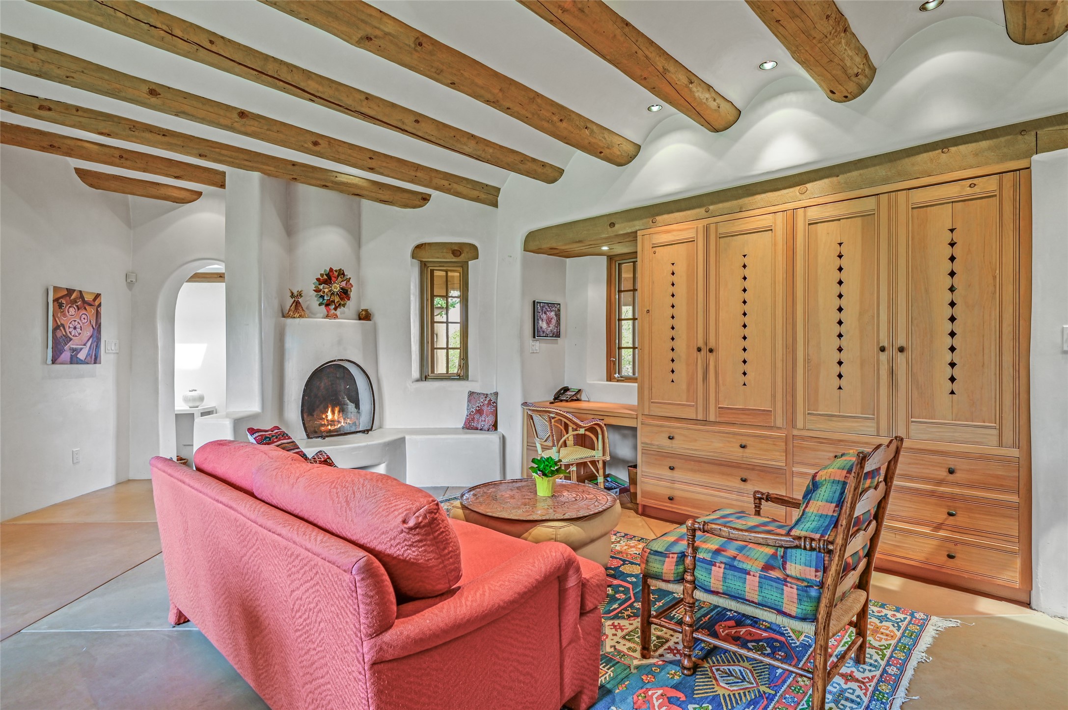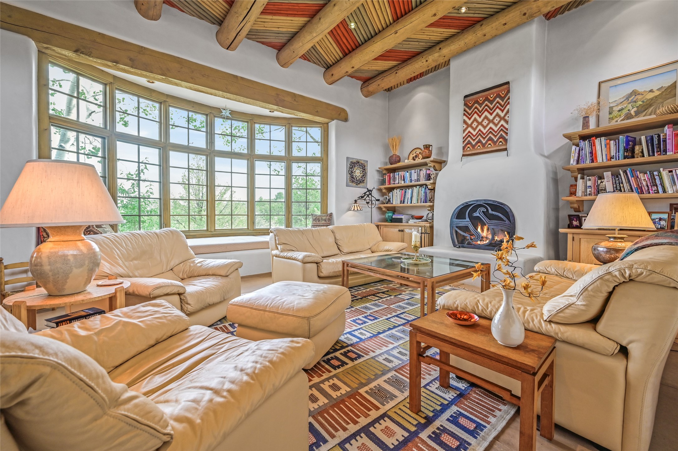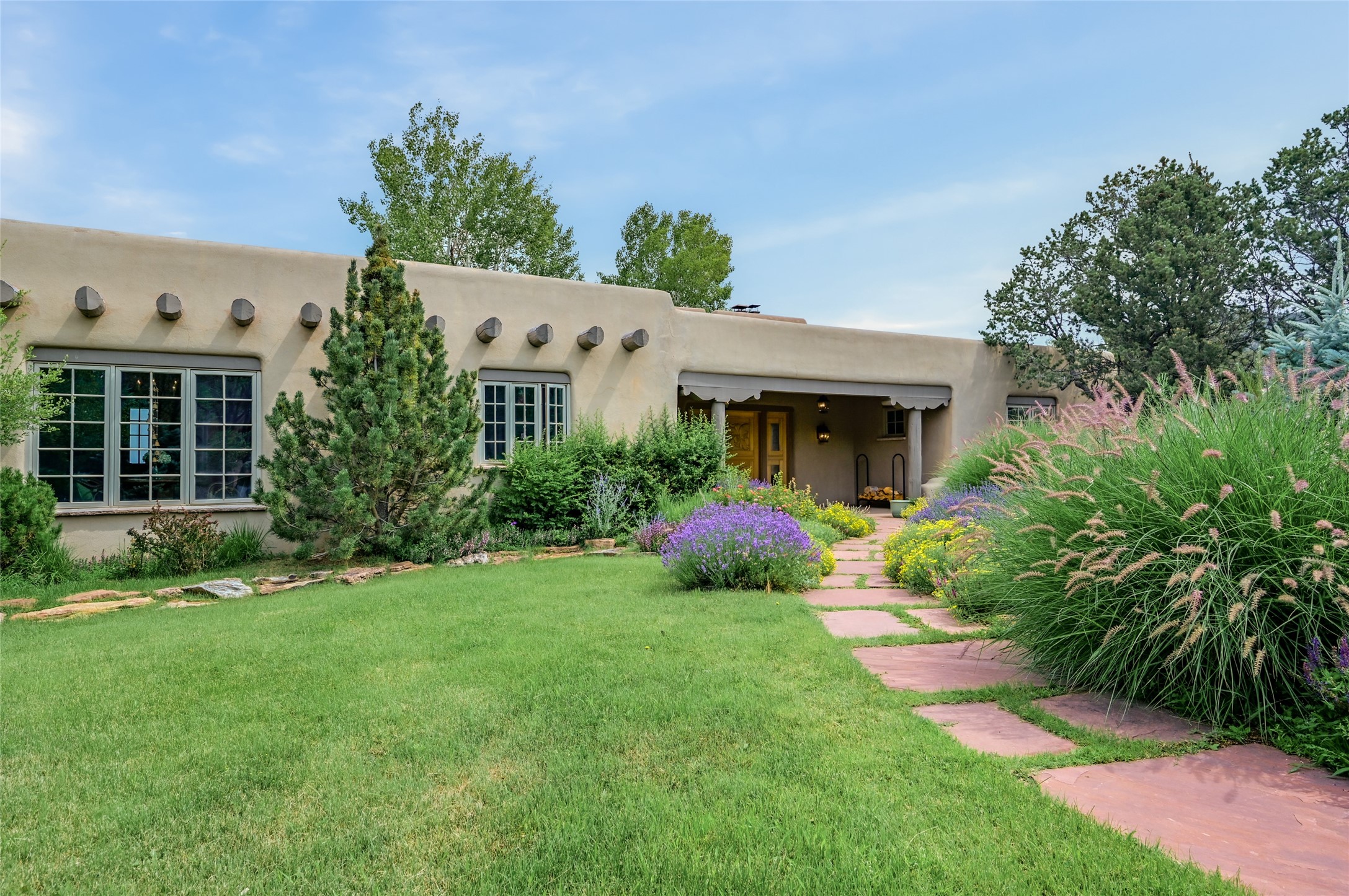 Nestled on a full acre in Santa Fe's sought-after Eastside, this beautifully maintained single-level adobe home--with a detached guest house--offers approximately 4,500 square feet of flexible living space, timeless design, and sweeping views. Built in 1995 by McDowell Builders with architect Lila DeWindt, the main residence features classic Santa Fe elements throughout: painted ceilings with vigas, kiva fireplaces, and a natural flow between indoor and outdoor living areas. The spacious primary suite is a true retreat, complete with a sitting area, private patio, and dual bathrooms for ultimate comfort and privacy.The heart of the home centers around a sunlit living room with northeast-facing mountain views, opening gracefully into a formal dining room that extends to the rear portal--perfect for entertaining or quiet evenings under the stars. The well-appointed kitchen and great room includes a cozy breakfast nook, kiva fireplace, TV viewing area, and abundant storage.A versatile office or flex room, a laundry room and a half bath for guests completes one area of the home, while a privately situated bedroom with full bath provides additional comfort and privacy for an additional family member or out-of-town guest.The detached guest house is ideal for visitors, work, or creative pursuits. It includes its own entrance, a welcoming entry portal, a private bedroom, full bathroom, kitchenette, and a richly appointed library or sitting room.This is a rare opportunity to own a spacious and flexible home in one of Santa Fe's most desirable neighborhoods--offering classic architecture, serene surroundings, and room to make it your own.