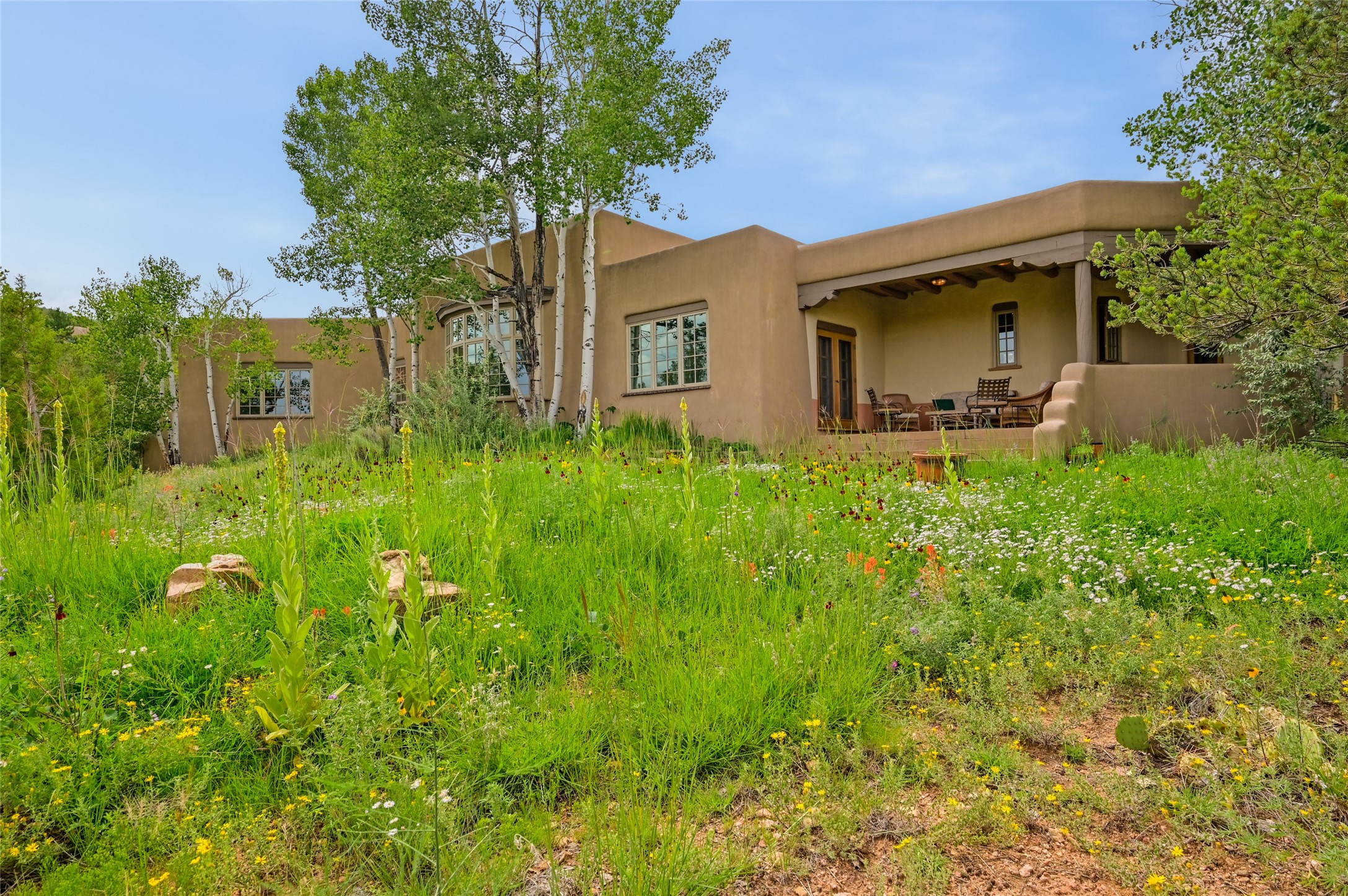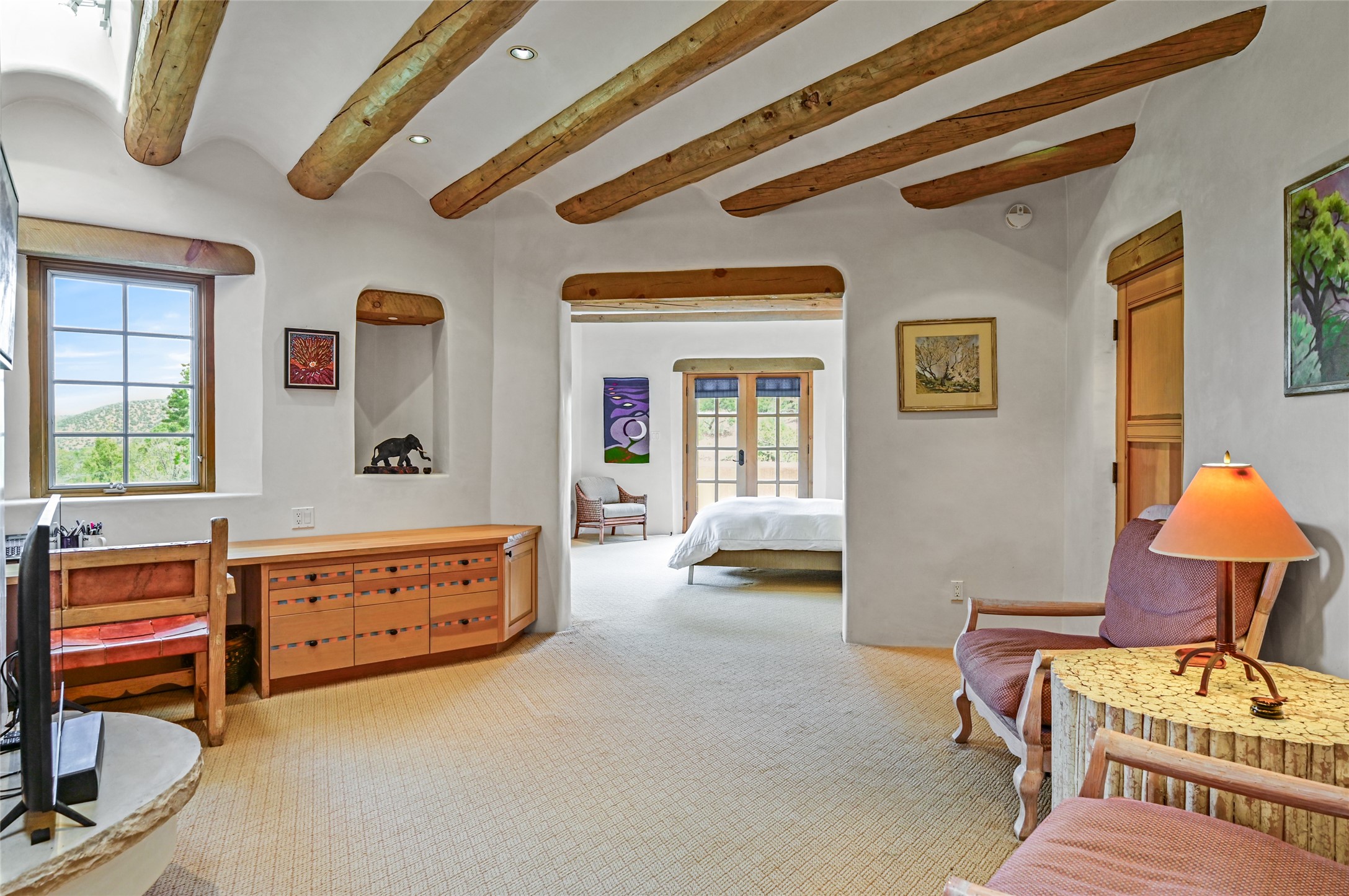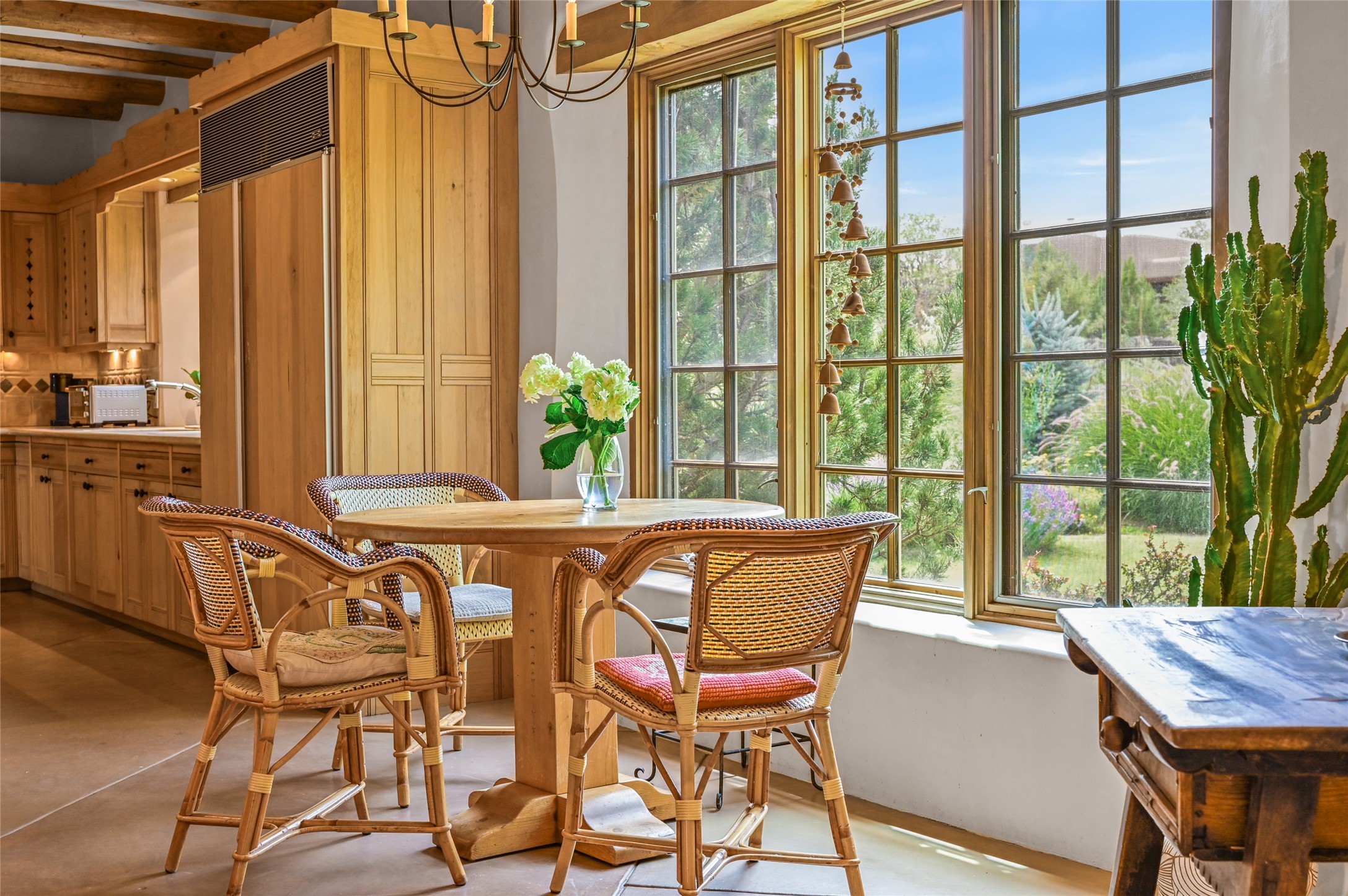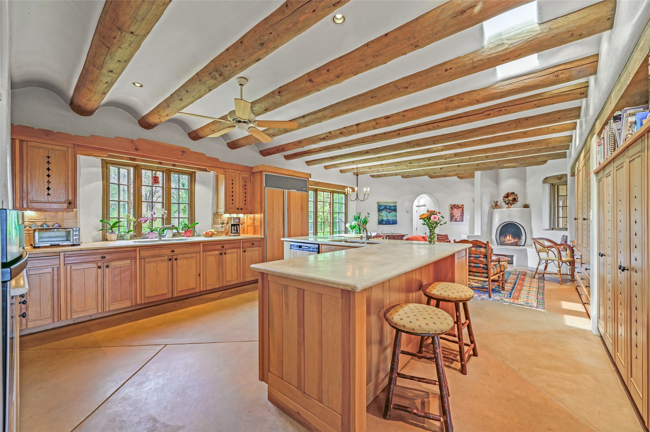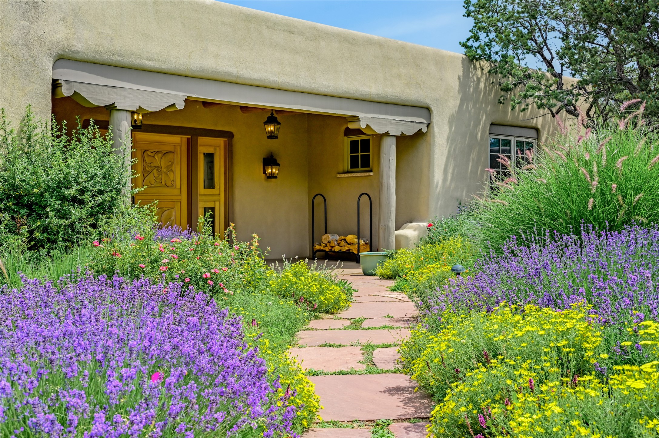 Nestled on a full acre in Santa Fe's sought-after Eastside, this beautifully maintained single-level adobe home--with a detached guest house--offers approximately 4,500 square feet of flexible living space, timeless design, and sweeping views. Built in 1995 by McDowell Builders with architect Lila DeWindt, the main residence features classic Santa Fe elements throughout: painted ceilings with vigas, kiva fireplaces, and a natural flow between indoor and outdoor living areas. The spacious primary suite is a true retreat, complete with a sitting area, private patio, and dual bathrooms for ultimate comfort and privacy.The heart of the home centers around a sunlit living room with northeast-facing mountain views, opening gracefully into a formal dining room that extends to the rear portal--perfect for entertaining or quiet evenings under the stars. The well-appointed kitchen and great room includes a cozy breakfast nook, kiva fireplace, TV viewing area, and abundant storage.A versatile office or flex room, a laundry room and a half bath for guests completes one area of the home, while a privately situated bedroom with full bath provides additional comfort and privacy for an additional family member or out-of-town guest.The detached guest house is ideal for visitors, work, or creative pursuits. It includes its own entrance, a welcoming entry portal, a private bedroom, full bathroom, kitchenette, and a richly appointed library or sitting room.This is a rare opportunity to own a spacious and flexible home in one of Santa Fe's most desirable neighborhoods--offering classic architecture, serene surroundings, and room to make it your own.