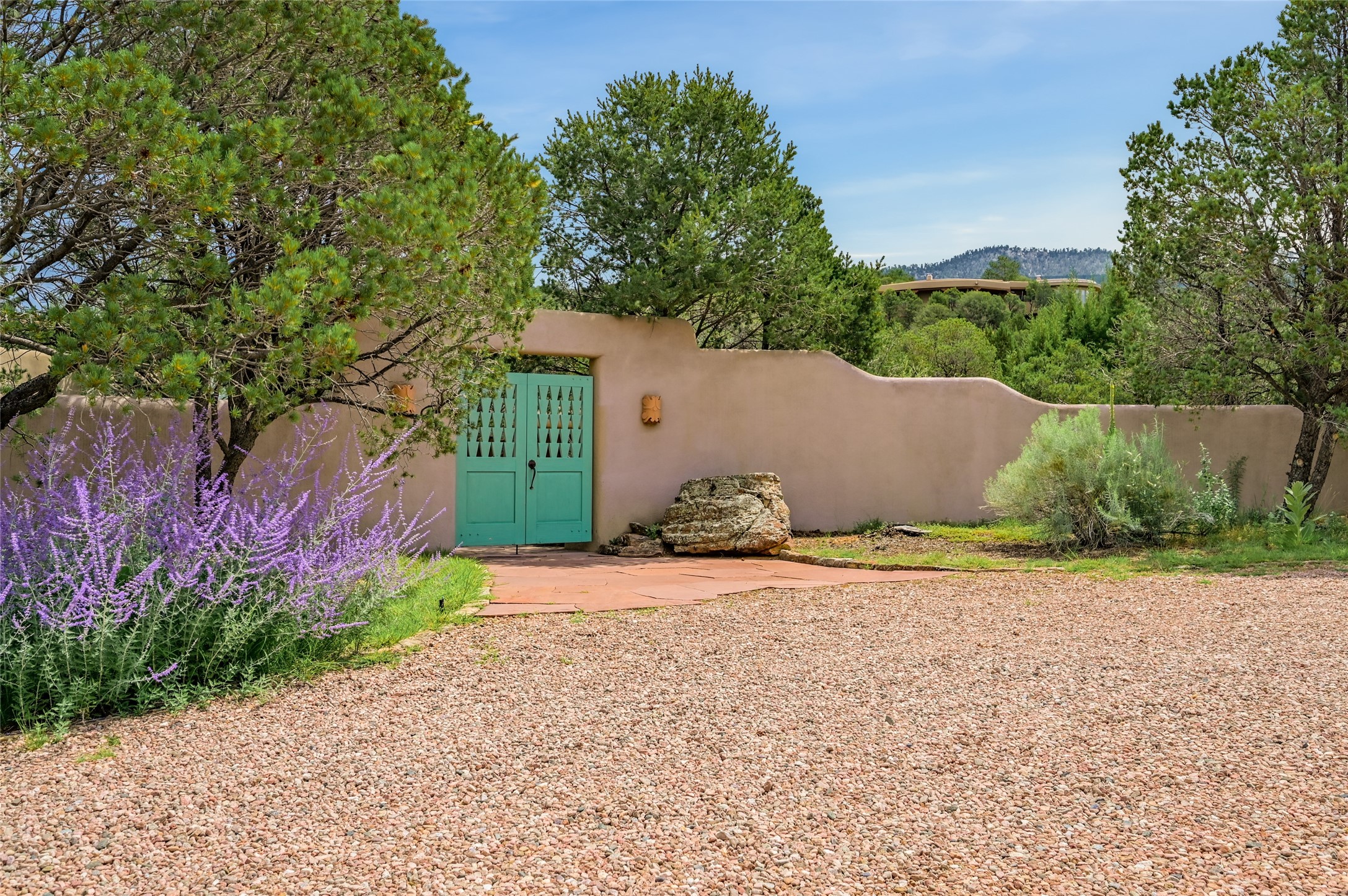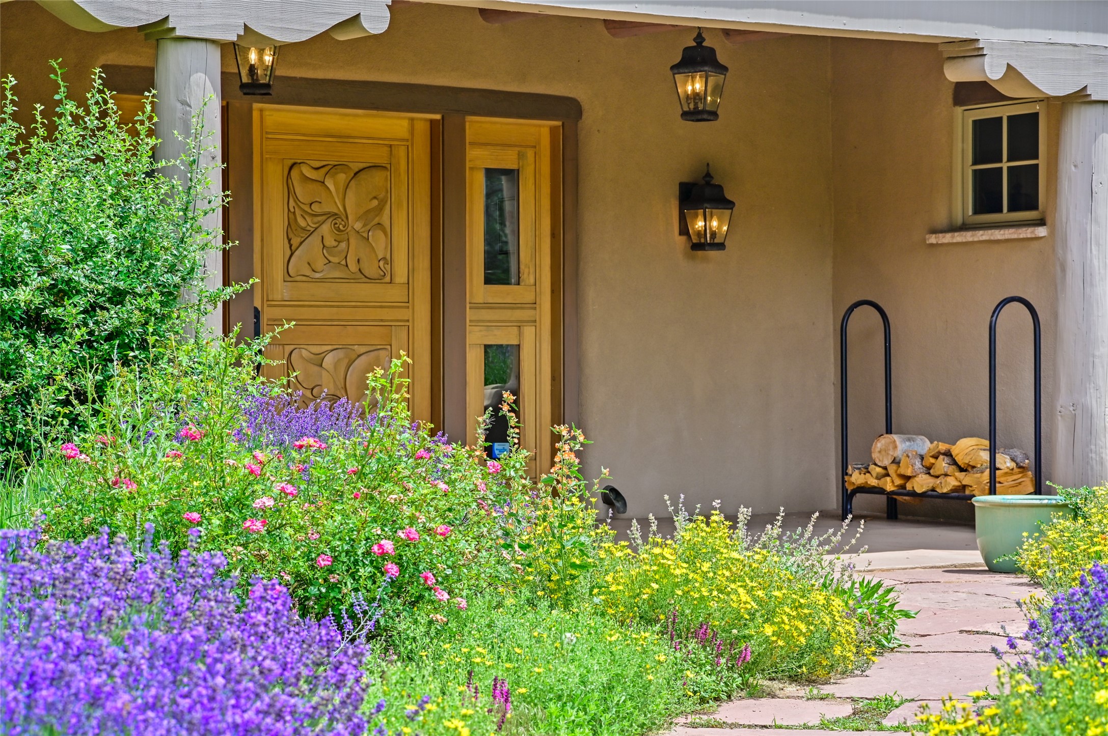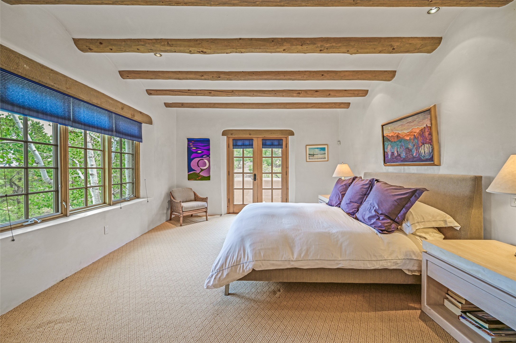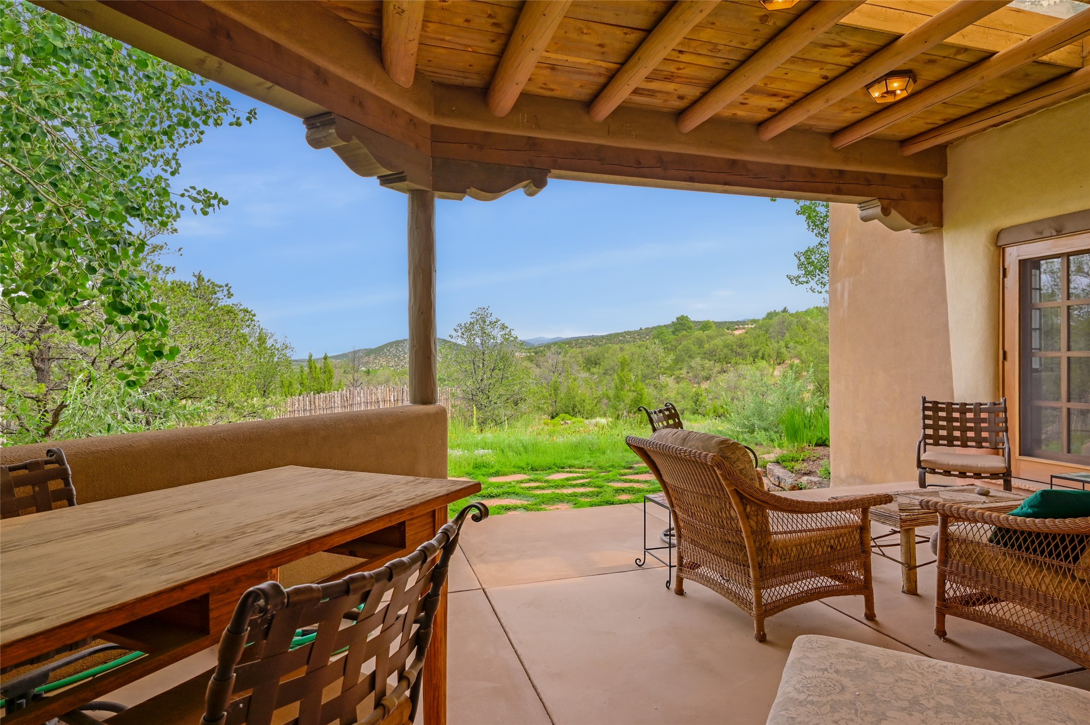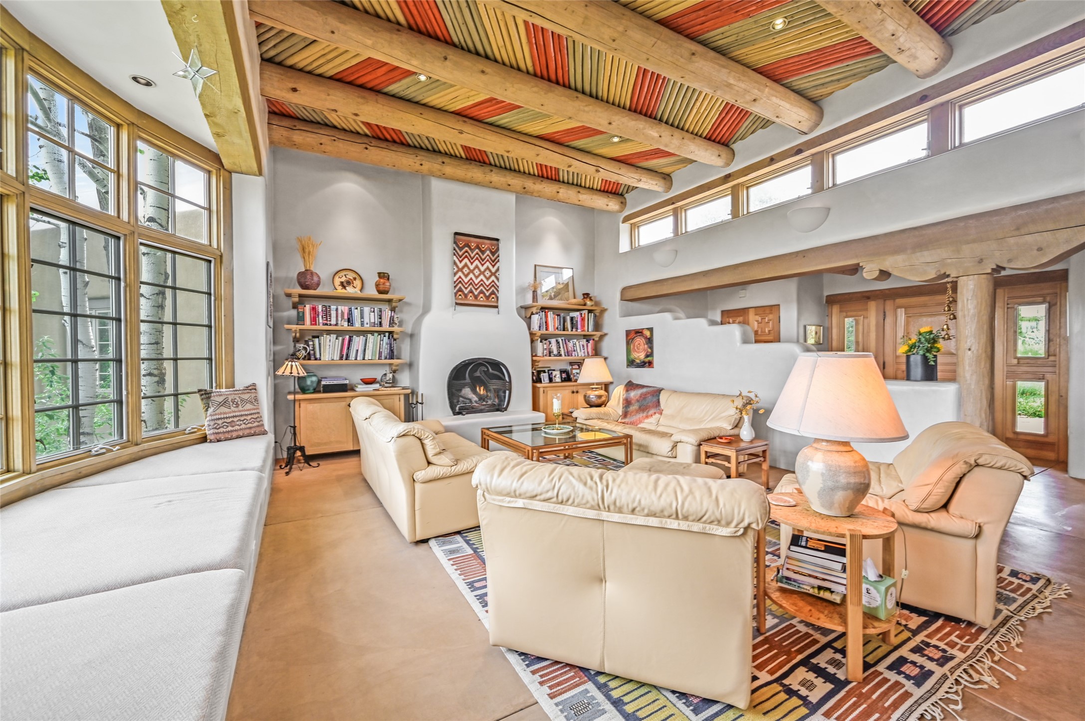 Nestled on a full acre in Santa Fe's sought-after Eastside, this beautifully maintained single-level adobe home--with a detached guest house--offers approximately 4,500 square feet of flexible living space, timeless design, and sweeping views. Built in 1995 by McDowell Builders with architect Lila DeWindt, the main residence features classic Santa Fe elements throughout: painted ceilings with vigas, kiva fireplaces, and a natural flow between indoor and outdoor living areas. The spacious primary suite is a true retreat, complete with a sitting area, private patio, and dual bathrooms for ultimate comfort and privacy.The heart of the home centers around a sunlit living room with northeast-facing mountain views, opening gracefully into a formal dining room that extends to the rear portal--perfect for entertaining or quiet evenings under the stars. The well-appointed kitchen and great room includes a cozy breakfast nook, kiva fireplace, TV viewing area, and abundant storage.A versatile office or flex room, a laundry room and a half bath for guests completes one area of the home, while a privately situated bedroom with full bath provides additional comfort and privacy for an additional family member or out-of-town guest.The detached guest house is ideal for visitors, work, or creative pursuits. It includes its own entrance, a welcoming entry portal, a private bedroom, full bathroom, kitchenette, and a richly appointed library or sitting room.This is a rare opportunity to own a spacious and flexible home in one of Santa Fe's most desirable neighborhoods--offering classic architecture, serene surroundings, and room to make it your own.