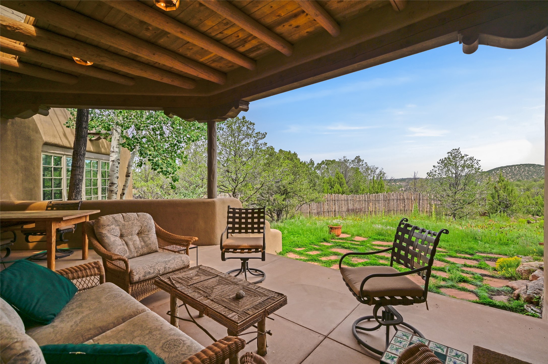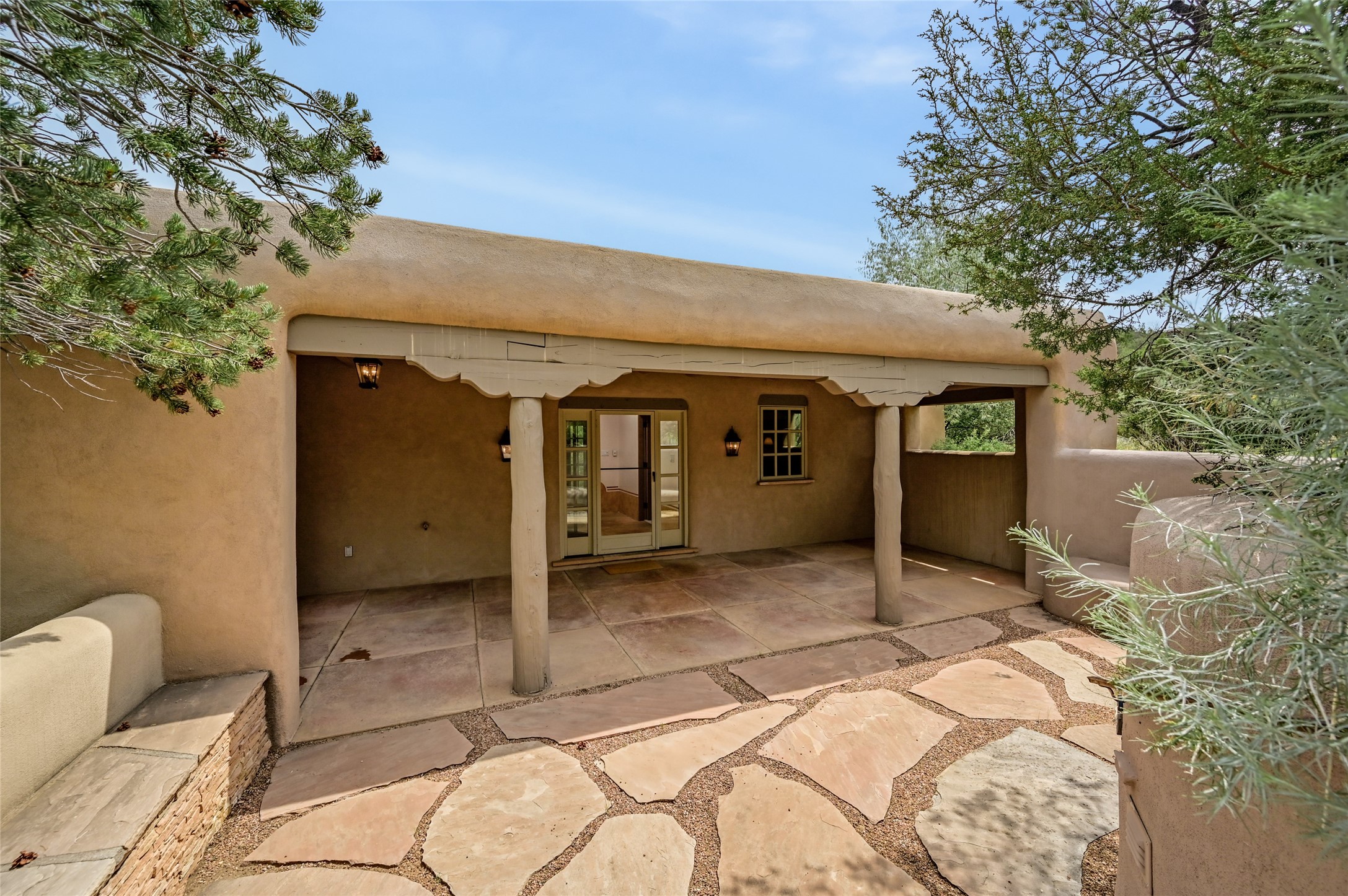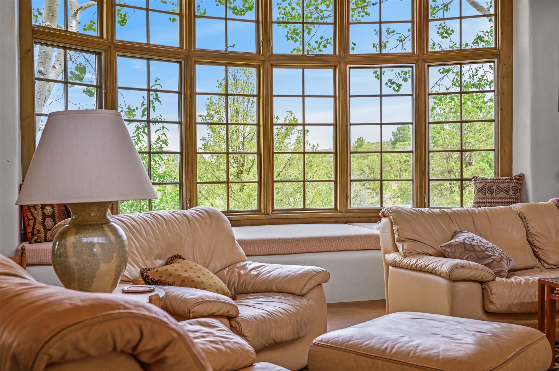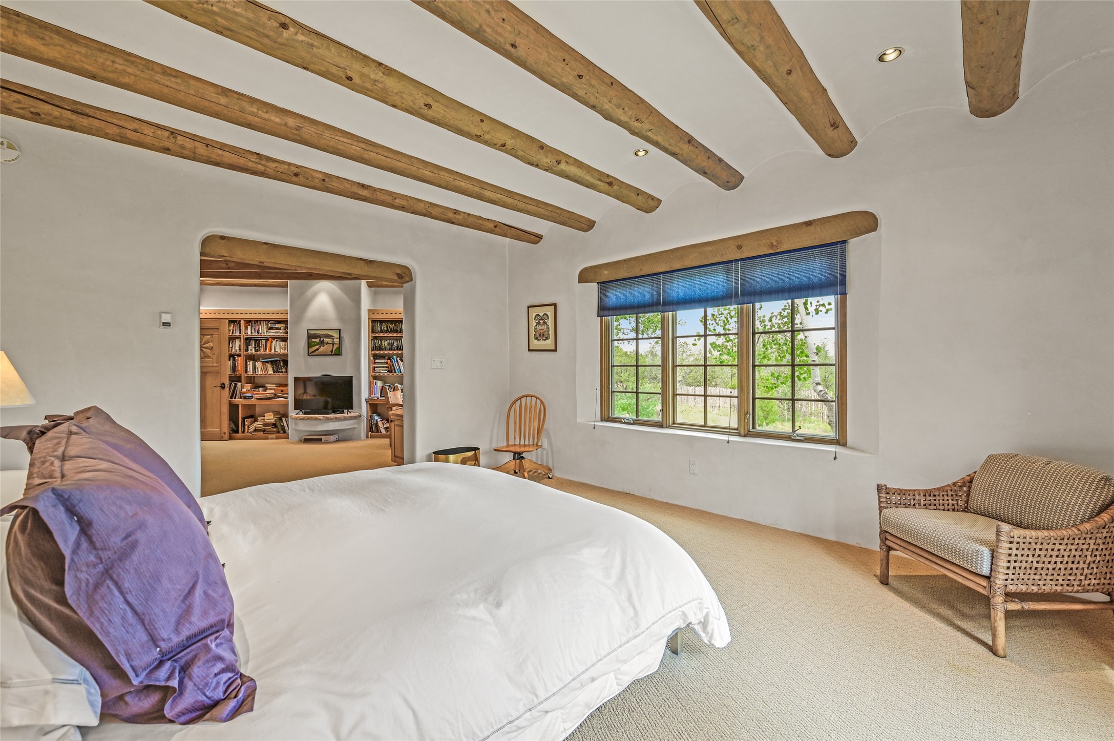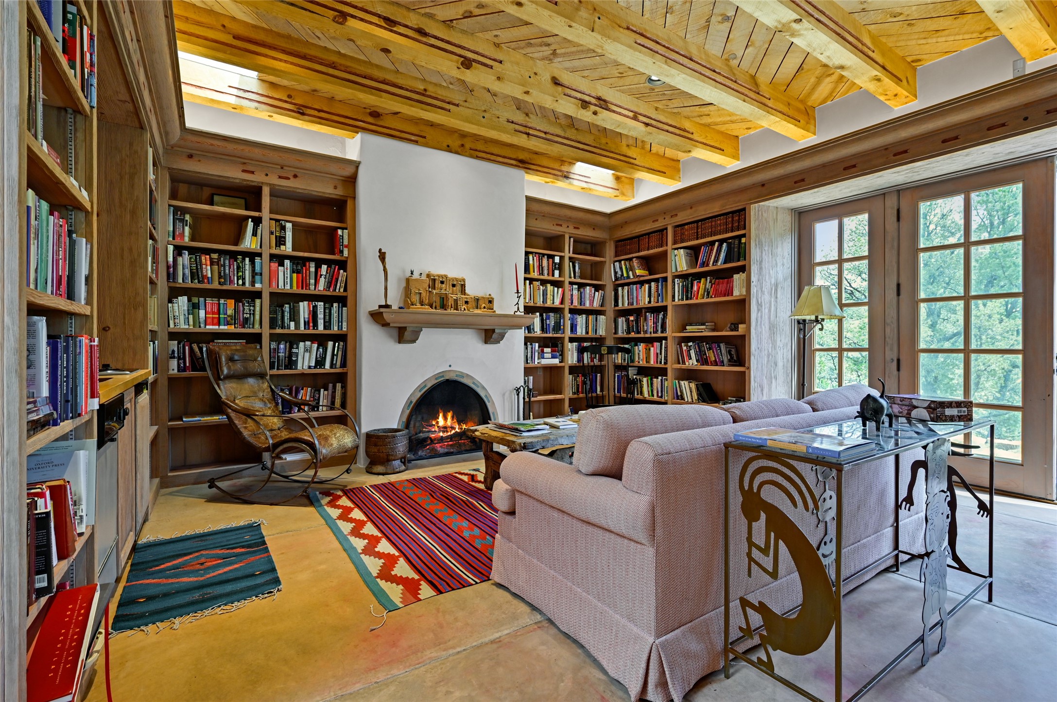 Nestled on a full acre in Santa Fe's sought-after Eastside, this beautifully maintained single-level adobe home--with a detached guest house--offers approximately 4,500 square feet of flexible living space, timeless design, and sweeping views. Built in 1995 by McDowell Builders with architect Lila DeWindt, the main residence features classic Santa Fe elements throughout: painted ceilings with vigas, kiva fireplaces, and a natural flow between indoor and outdoor living areas. The spacious primary suite is a true retreat, complete with a sitting area, private patio, and dual bathrooms for ultimate comfort and privacy.The heart of the home centers around a sunlit living room with northeast-facing mountain views, opening gracefully into a formal dining room that extends to the rear portal--perfect for entertaining or quiet evenings under the stars. The well-appointed kitchen and great room includes a cozy breakfast nook, kiva fireplace, TV viewing area, and abundant storage.A versatile office or flex room, a laundry room and a half bath for guests completes one area of the home, while a privately situated bedroom with full bath provides additional comfort and privacy for an additional family member or out-of-town guest.The detached guest house is ideal for visitors, work, or creative pursuits. It includes its own entrance, a welcoming entry portal, a private bedroom, full bathroom, kitchenette, and a richly appointed library or sitting room.This is a rare opportunity to own a spacious and flexible home in one of Santa Fe's most desirable neighborhoods--offering classic architecture, serene surroundings, and room to make it your own.