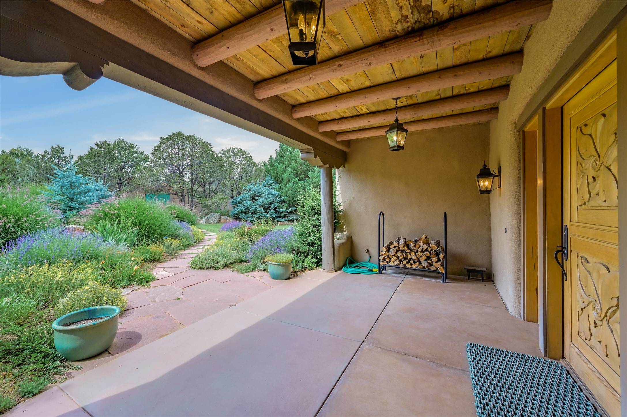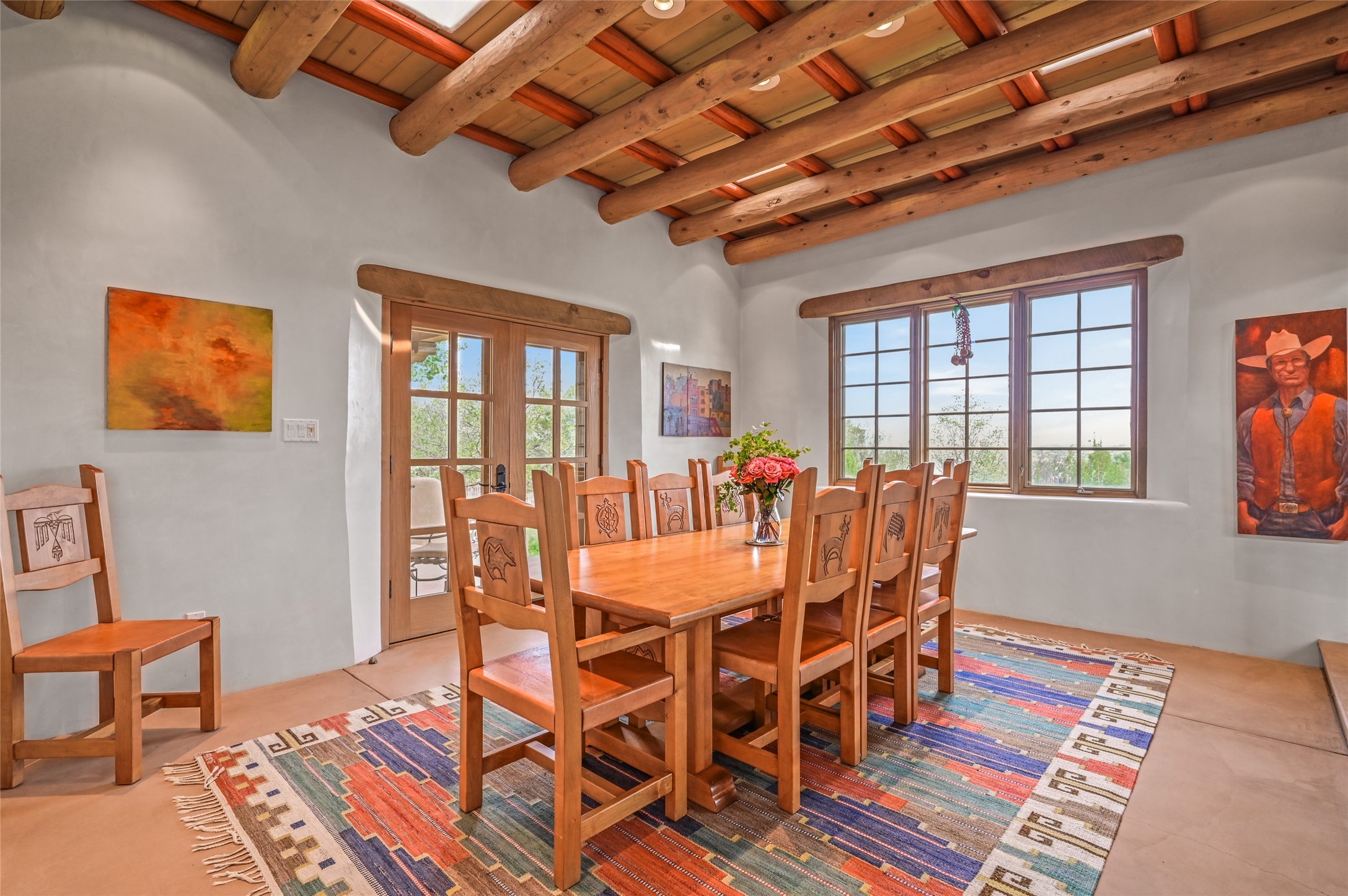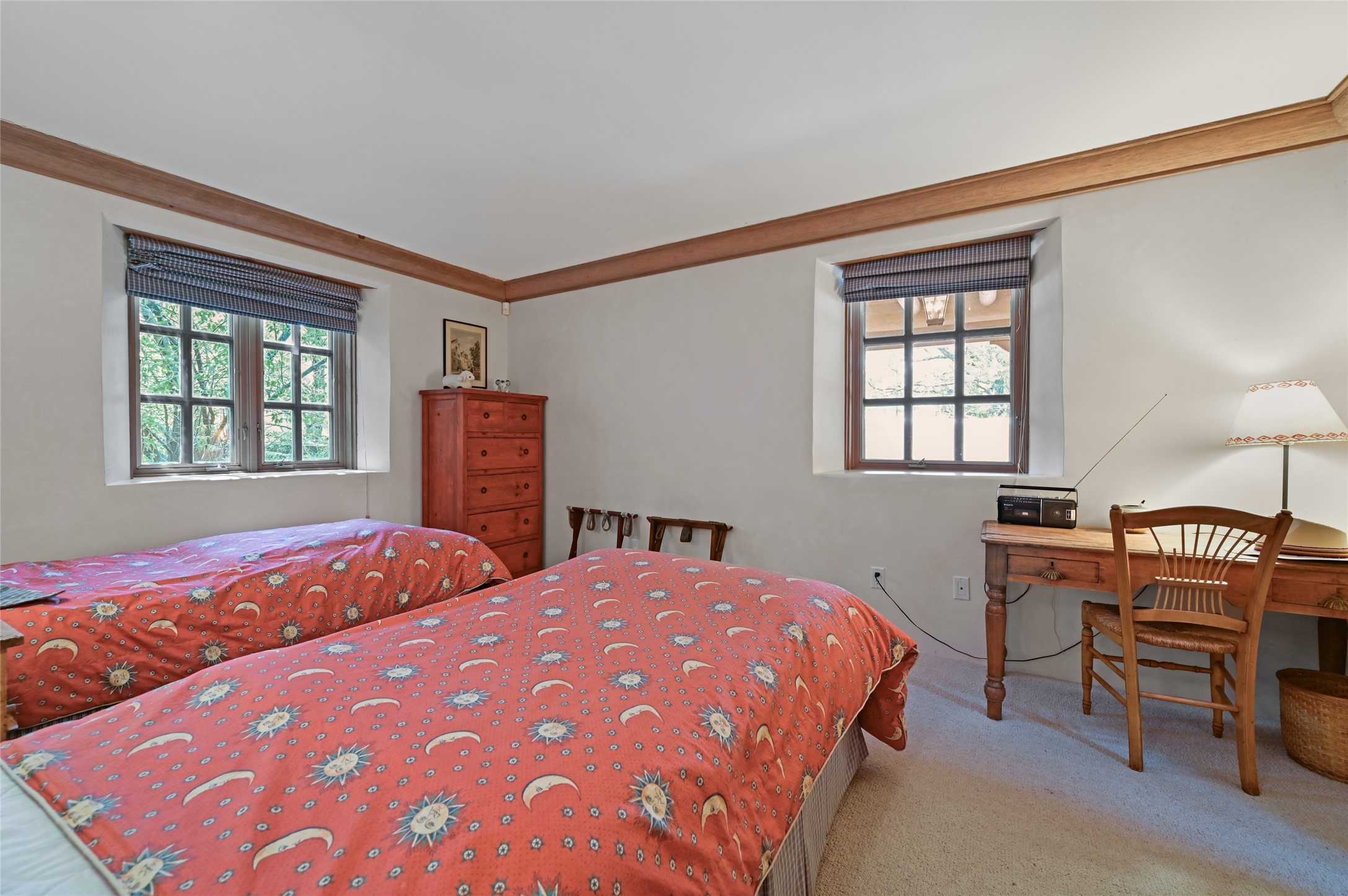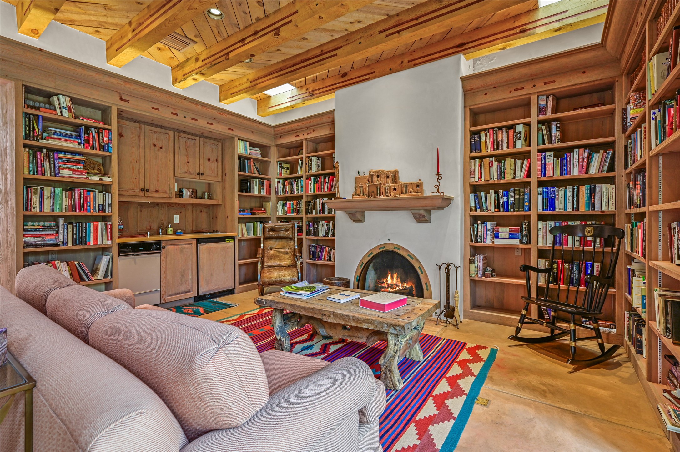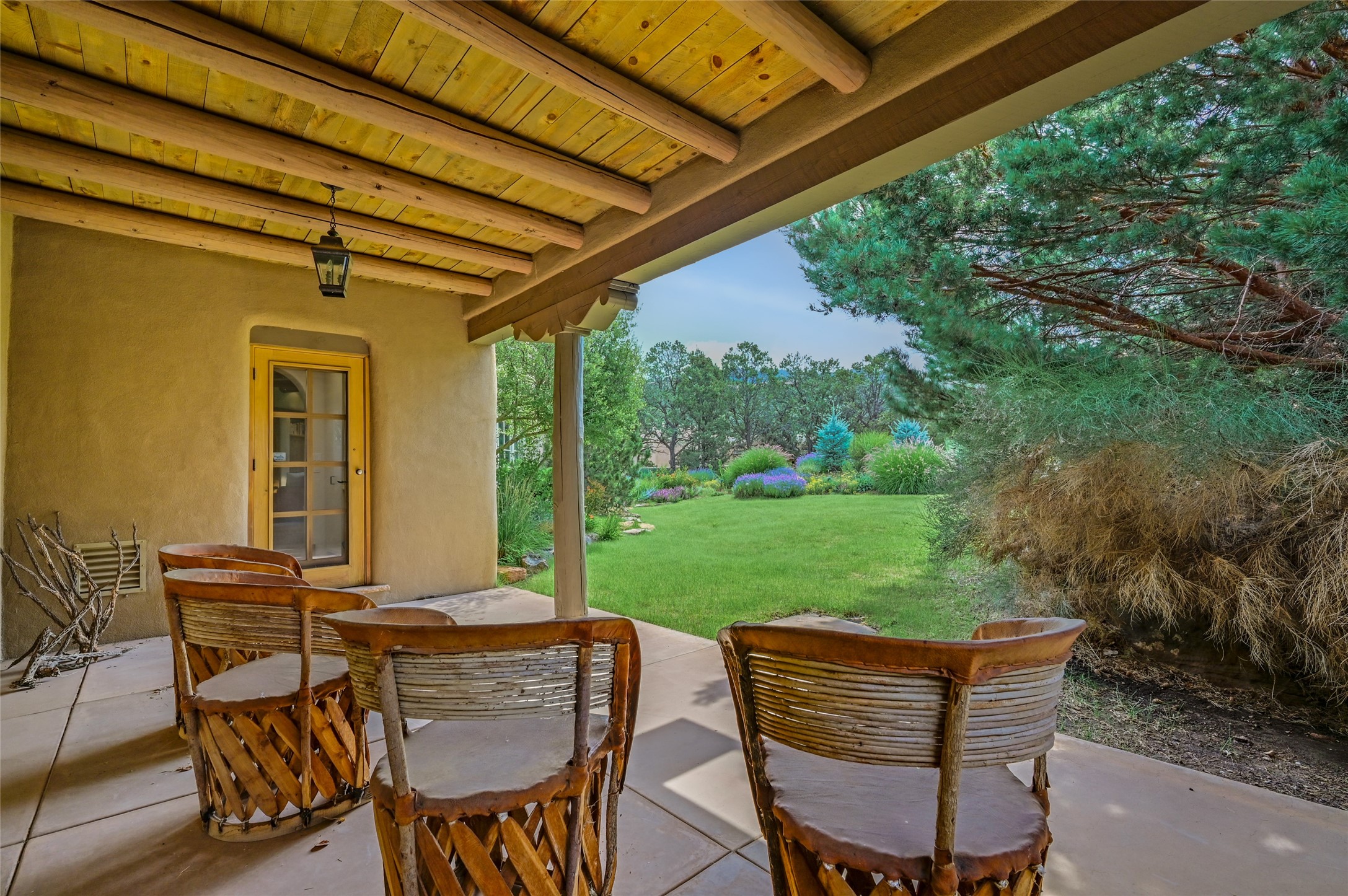 Nestled on a full acre in Santa Fe's sought-after Eastside, this beautifully maintained single-level adobe home--with a detached guest house--offers approximately 4,500 square feet of flexible living space, timeless design, and sweeping views. Built in 1995 by McDowell Builders with architect Lila DeWindt, the main residence features classic Santa Fe elements throughout: painted ceilings with vigas, kiva fireplaces, and a natural flow between indoor and outdoor living areas. The spacious primary suite is a true retreat, complete with a sitting area, private patio, and dual bathrooms for ultimate comfort and privacy.The heart of the home centers around a sunlit living room with northeast-facing mountain views, opening gracefully into a formal dining room that extends to the rear portal--perfect for entertaining or quiet evenings under the stars. The well-appointed kitchen and great room includes a cozy breakfast nook, kiva fireplace, TV viewing area, and abundant storage.A versatile office or flex room, a laundry room and a half bath for guests completes one area of the home, while a privately situated bedroom with full bath provides additional comfort and privacy for an additional family member or out-of-town guest.The detached guest house is ideal for visitors, work, or creative pursuits. It includes its own entrance, a welcoming entry portal, a private bedroom, full bathroom, kitchenette, and a richly appointed library or sitting room.This is a rare opportunity to own a spacious and flexible home in one of Santa Fe's most desirable neighborhoods--offering classic architecture, serene surroundings, and room to make it your own.