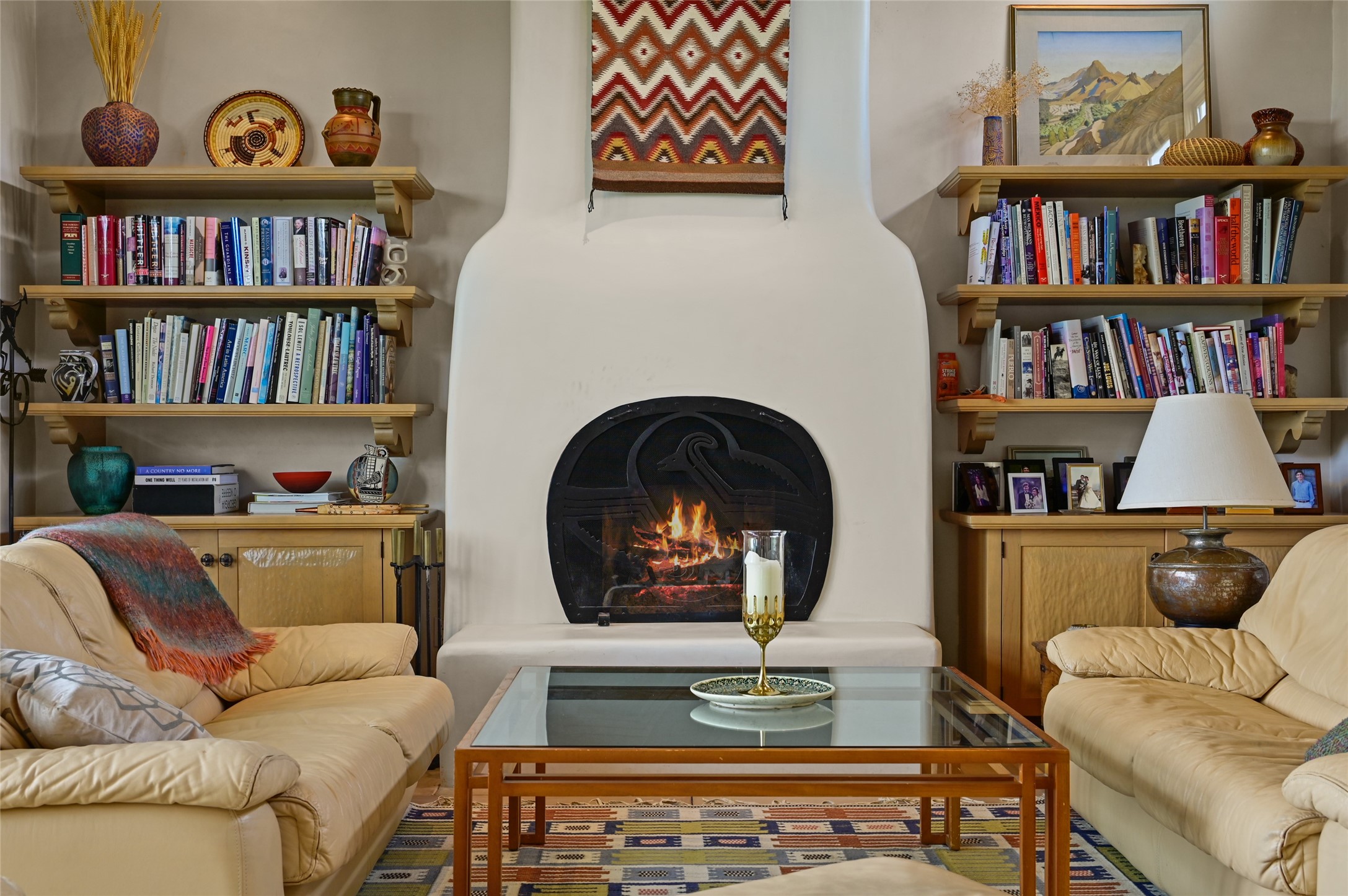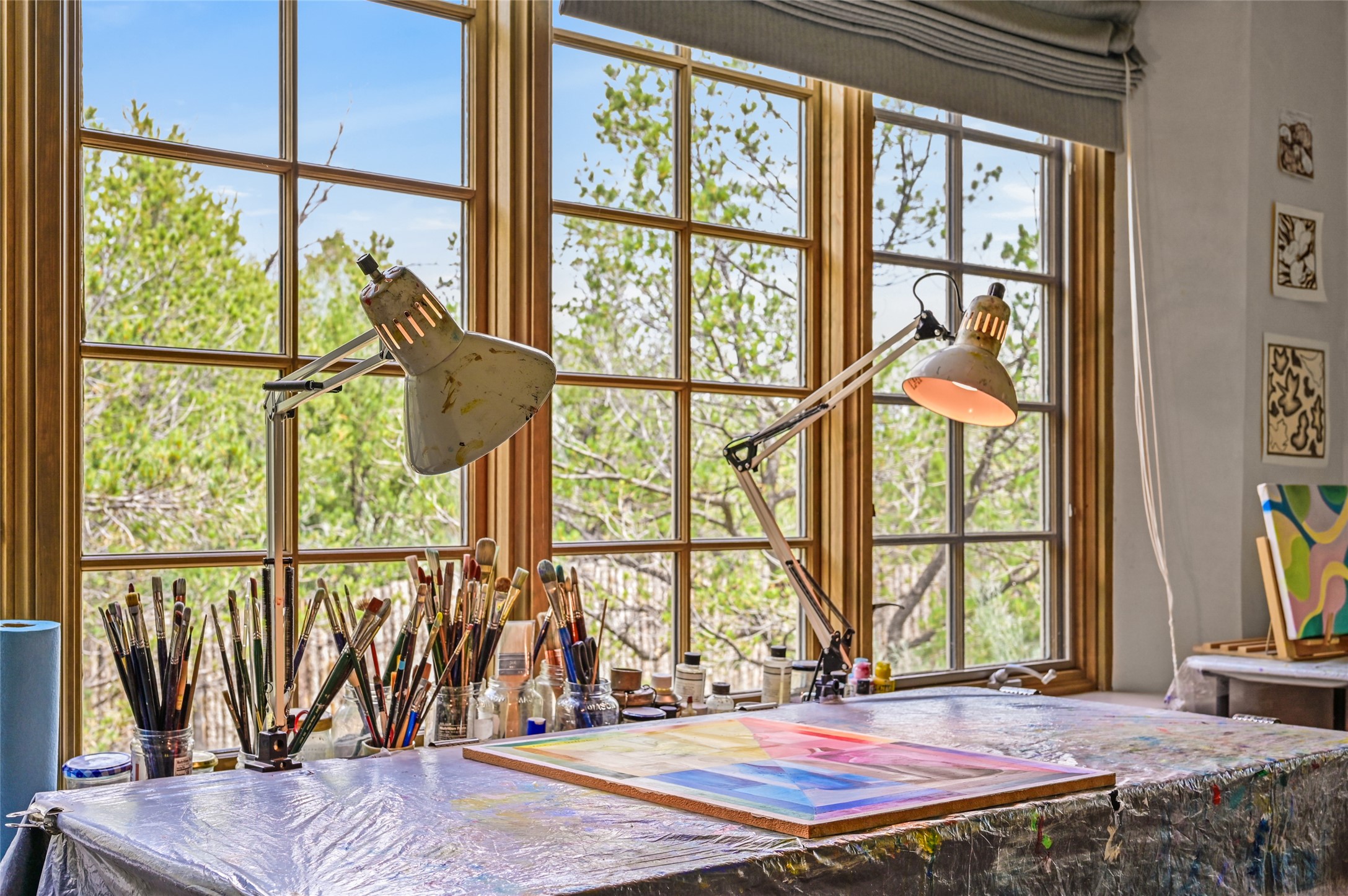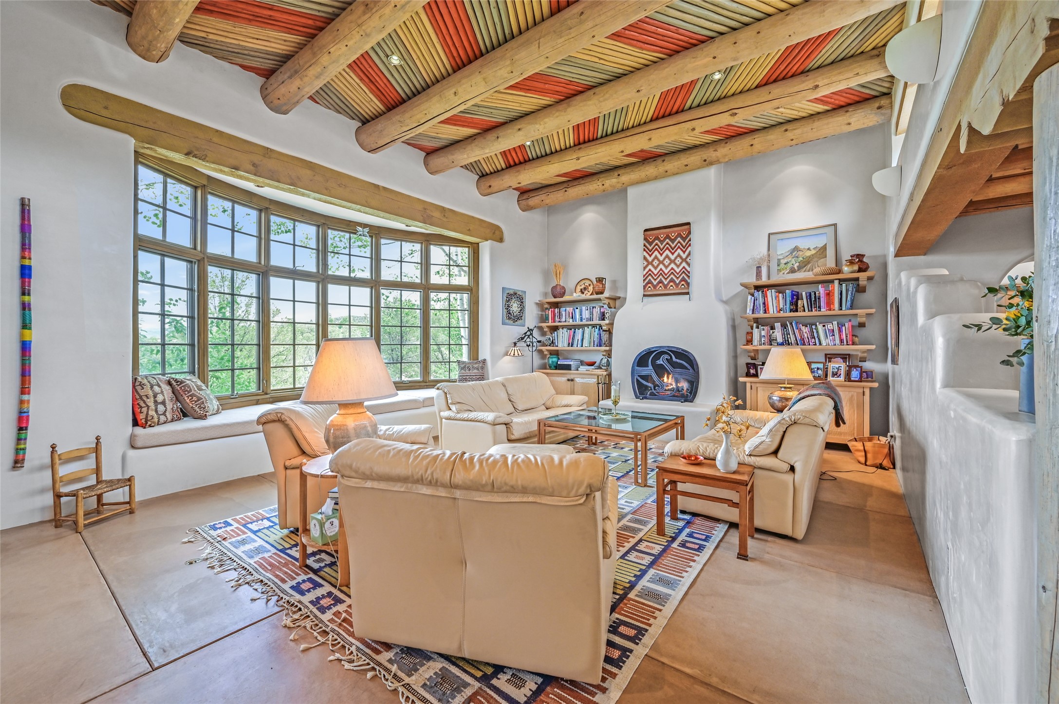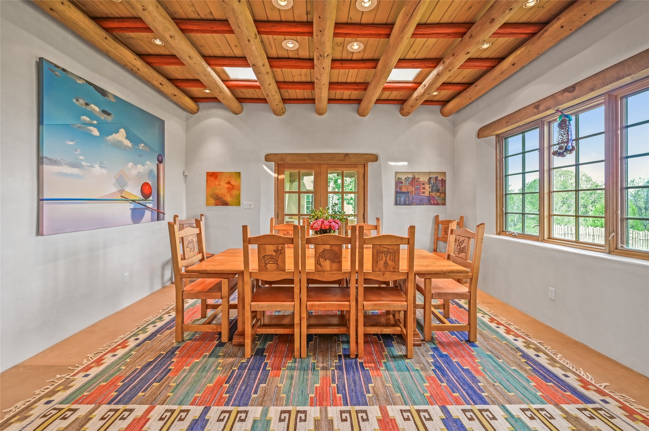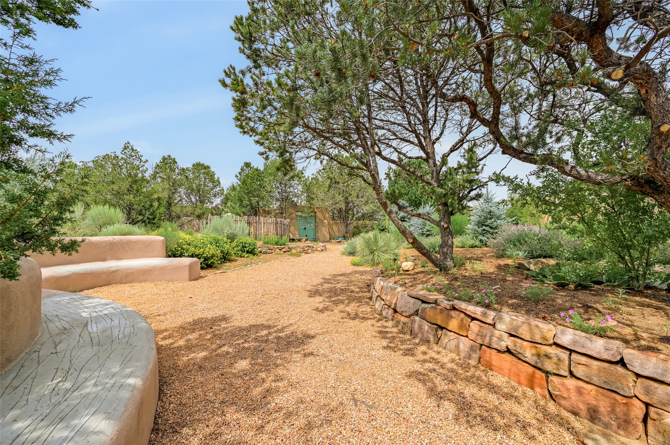 Nestled on a full acre in Santa Fe's sought-after Eastside, this beautifully maintained single-level adobe home--with a detached guest house--offers approximately 4,500 square feet of flexible living space, timeless design, and sweeping views. Built in 1995 by McDowell Builders with architect Lila DeWindt, the main residence features classic Santa Fe elements throughout: painted ceilings with vigas, kiva fireplaces, and a natural flow between indoor and outdoor living areas. The spacious primary suite is a true retreat, complete with a sitting area, private patio, and dual bathrooms for ultimate comfort and privacy.The heart of the home centers around a sunlit living room with northeast-facing mountain views, opening gracefully into a formal dining room that extends to the rear portal--perfect for entertaining or quiet evenings under the stars. The well-appointed kitchen and great room includes a cozy breakfast nook, kiva fireplace, TV viewing area, and abundant storage.A versatile office or flex room, a laundry room and a half bath for guests completes one area of the home, while a privately situated bedroom with full bath provides additional comfort and privacy for an additional family member or out-of-town guest.The detached guest house is ideal for visitors, work, or creative pursuits. It includes its own entrance, a welcoming entry portal, a private bedroom, full bathroom, kitchenette, and a richly appointed library or sitting room.This is a rare opportunity to own a spacious and flexible home in one of Santa Fe's most desirable neighborhoods--offering classic architecture, serene surroundings, and room to make it your own.